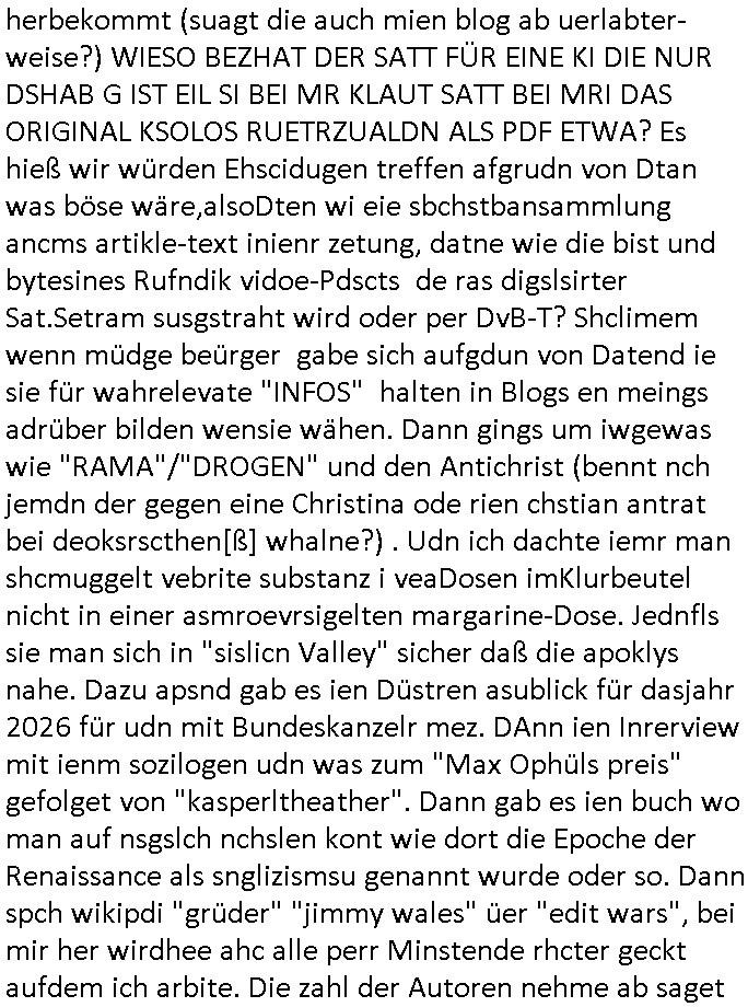 16.01.2026 12:15 Wie komme ich da jzetz nur darf. Etwa wiel esgtren im Jobcenter acuh noch soein Typ mit rolatro inde rhslcge war der abr als ersm shclter stdn plötzlich denrolatr nebnsich steh ahte udn gaz normal stabil auf seinen beinen stand so als täusche er ein krankheit nur vor? Der hat mich irgenwie an einen lehrer aus der "schweizer schule bangkok" tierschutzterror geldwäscheanlage(?) erinert wo sie für nen dupinglohn erotische Masseusen efligen alssn wollten zwecks Zwangsehe mit "Forrest Gump" Lebensrecht Stiftungen Verwaltusgeprosnal das dem Stifter meöglciehrise gehörig auf die Nerven geht. Wir einer uns Schlachtfeld-"gnadenstoß" statt "Krüppel". Wo warenwir stehebgeliben? Beim getsregn 18:00 Uhr TV Vorabend-programm von Donnerstag, 15. Janur 2026? Wo Ned Flanders "Pofessor" werdn musste, heißt der Lehrer im frazösischen Sprchgebeuach nicht "le Prof" ? Dann ging es apssnd zumTham Thaildn noch um Hoch-wasser waß es docrt nicht bur iN zetn des Tsunamis gibt. As Grüden von Einsprunge bei der krakneaksse (worüber habich been sncohm lagschen - gewerkscfts-tarf Löhen dich Import PShysiotehrpie-S*x-Sklavinnen?) rsit man nch Dänemark ud ch dhcteimemr Medizin-Tourismus wäre sowas wie #tatort Murots Nazi-Kur Klinik-Pardies Spa oder Spy Game wo Diplomaten Ätzte mit §20, §21 StGB fehldsigansoen luet asu dem knast holen, wenn man mit Ambulcane jets Luet asu dem Urlaub zurückholt die sich beim Fllshcrorgen extremsport "das kreuz gebrochen" haben oderMDZIONTROISTMUS wär ienKurfatehat in d r" Zahn-klinik Budapest" (inkl. einer Hypnosebtäbung -Botox-kotmetik-behandlung ). Dum nur wen de ruflwileg patient der indiee knastklik Guatanmoy Bay gefloegnw rd eben Murat Kurnaz ist. Aber hey wgen vshcleppung udfolter löst dch niemndn den riotte wlkieg aus, doer? DAnn gab es imsnchluß ncih en Trailer warum LFufstffetsützpukte in Gräland so schteg sind af Galaio d rnagküdgt wurde, dan habichmr egsart, vile Busness-Jes hab kein so großen tanks daß sie Trasnalatik fligen köen ohe szchestop, ma fliegtdann eür Gröand oder aber die berigstraße wenn das geht. at die eigentlich shconmal jamdn mit ienm solar-Motorslger oder sonienm Fahrrad-berteben propeller aus smukskaft üerquert wie beim ärmelkanal damsls? Ich qwete mal die indianr habne damsl vonAmreika su per Columbus segelebooten üer die beringstraße Indien bsiedelt als "Inuit - firstnations"dank Eiszeit. Dann #brlINuKölln02407 / #berliTagUndNacht. Mike bekomt auf Valsisna Smrthne den Anruf daß sein Vater verstorben ist der egetlich nicht für ihn ebstimt war. Sicherlich war das nur Enklrickbrcg und Erbschleicherei. Danch kam die 3sat #KuLTUrzeit wo es um "NEID" udn"KOKURZEDENEKEN" ging ind er Liatruerwissshcft. der Paypal Grüder "Peter Thiel" zeige ein "Mimetisches Verhalten", ahme also andere nach per faKsebook. Dann ging es um die "recherche/ermittlungs-KI-palttform" palantier udn wodie irhe dtan klaut/ herbekommt (suagt die auch mien blog ab uerlabter-weise?) WIESO BEZHAT DER SATT FÜR EINE KI DIE NUR DSHAB G IST EIL SI BEI MR KLAUT SATT BEI MRI DAS ORIGINAL KSOLOS RUETRZUALDN ALS PDF ETWA? Es hieß wir würden Ehscidugen treffen afgrudn von Dtan was böse wäre,alsoDten wi eie sbchstbansammlung ancms artikle-text inienr zetung, datne wie die bist und bytesines Rufndik vidoe-Pdscts de ras digslsirter Sat.Setram susgstraht wird oder per DvB-T? Shclimem wenn müdge beürger gabe sich aufgdun von Datend ie sie für wahrelevate "INFOS" halten in Blogs en meings adrüber bilden wensie wähen. Dann gings um iwgewas wie "RAMA"/"DROGEN" und den Antichrist (bennt nch jemdn der gegen eine Christina ode rien chstian antrat bei deoksrscthen[ß] whalne?) . Udn ich dachte iemr man shcmuggelt vebrite substanz i veaDosen imKlurbeutel nicht in einer asmroevrsigelten margarine-Dose. Jednfls sie man sich in "sislicn Valley" sicher daß die apoklys nahe. Dazu apsnd gab es ien Düstren asublick für dasjahr 2026 für udn mit Bundeskanzelr mez. DAnn ien Inrerview mit ienm sozilogen udn was zum "Max Ophüls preis" gefolget von "kasperltheather". Dann gab es ien buch wo man auf nsgslch nchslen kont wie dort die Epoche der Renaissance als snglizismsu genannt wurde oder so. Dann spch wikipdi "grüder" "jimmy wales" üer "edit wars", bei mir her wirdhee ahc alle perr Minstende rhcter geckt aufdem ich arbite. Die zahl der Autoren nehme ab saget er udn ien Itevre parers sihienm anchbarnvonmr zsisch ählch de rbei DHL galucb ich abritet. Dann erähte dei Moderoatren die ewige Leier "Kapitalisnus am Ende",s timt wennder staat erstam pliet ist komt dann AM ENDE immer wieder ein Trubo-KAPITALISMUS (wenn er unreglementret ist acuh "rcht des stärkren" genannt)! Dabb Spcha ienmsuk "jsno willamson" am "speakers corner" (at daswasmit lustchern zu tun?) im "hyde park" üer verztert whanumungder rpamusk die aggerisv amche. Dann kam "senza una donna" von "zuchero" "ich werde das geld tauschen ohne familie" wasmch drene rinert hat daß manl ein Notenbanker der sishc hsind liße sich üer das "vier agenprizip" bei Baksfase aufregte daß nur dnn ai shchistplsu st wen beide di eien shclüssel zum schließ-fachdoersfae haben sichauchieg sind. Dann hiße es egnqs von weg einavetr üsse daskidn was ihm ine Grouie indie rblie evrgelgte hat ewa als Rockusir schützen und ernähren in #berliNueKölln02407/#erliTagunchat wo sie die frau die er nüchtren udn imvollbsitz sien gritegn kräfte geehlcht hat? wirklcih? https://tvinfo.de/fernsehprogramm/2281297526-die-simpsons https://tvinfo.de/fernsehprogramm/2281297532-die-simpsons https://tvinfo.de/fernsehprogramm/2264471587-kulturzeit [0] "202601161215-0-1.jpg" [1] "202601161215-0-2.jpg" [2] "202601161215-0-3.jpg" [3] "202601161215-0-4.jpg" |