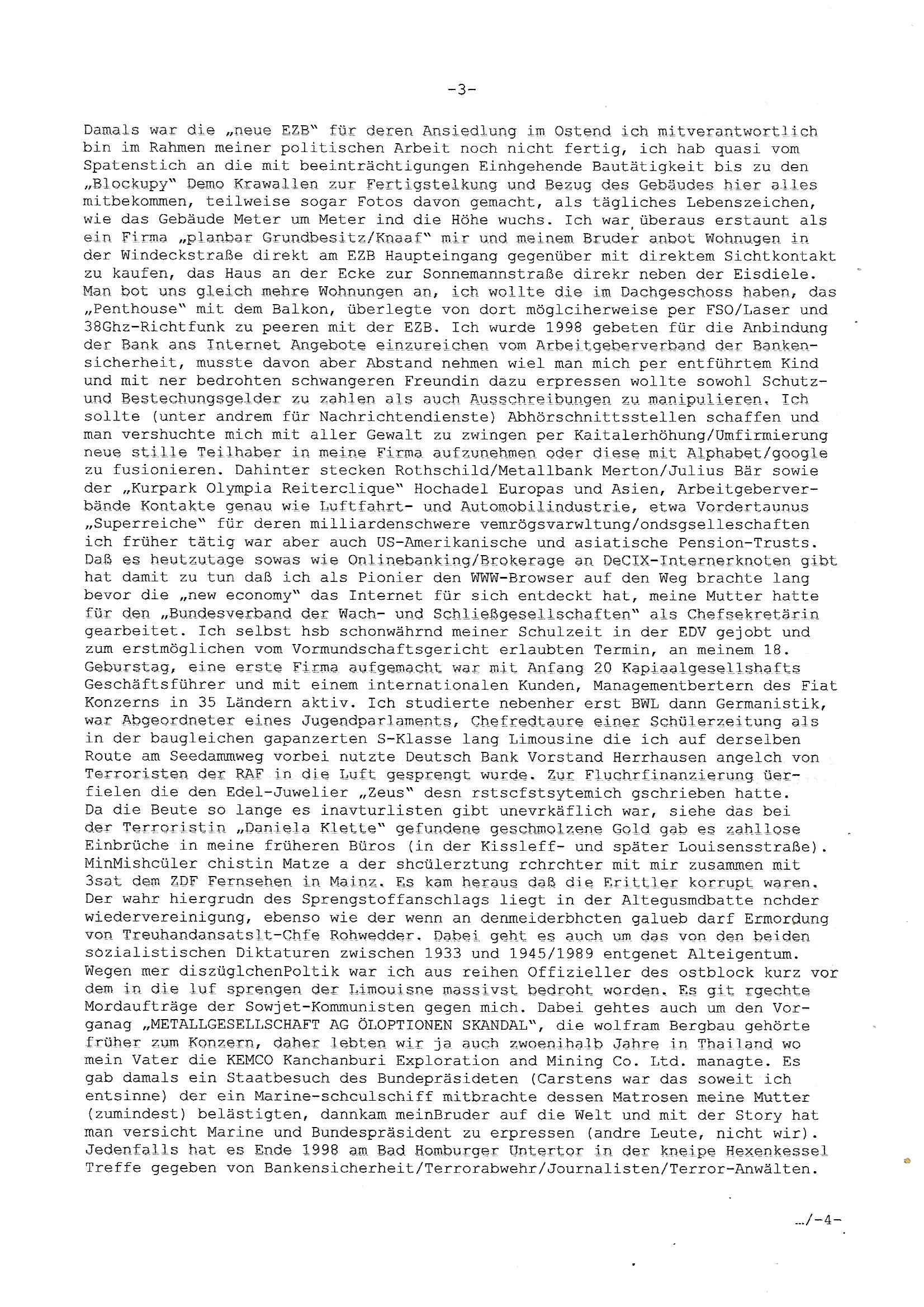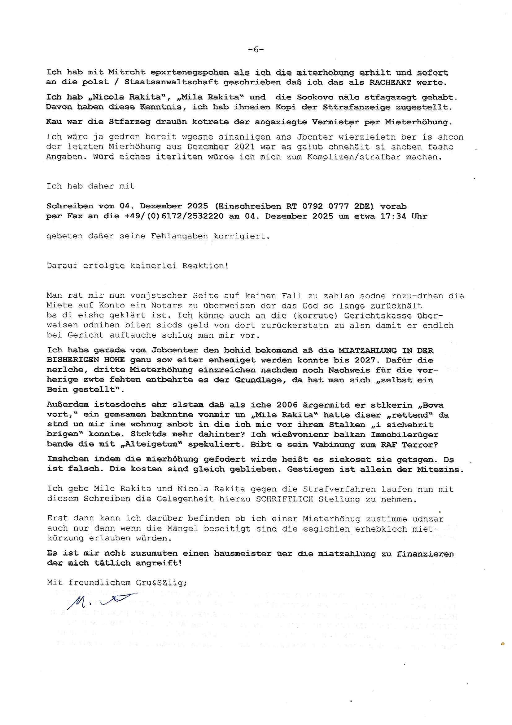 18.01.2026 18:30 Beweismittelvernichtung / Sicherung nach Solarstromanlagen-zählerstandsmanipulation, Erpressungen/lebensgefährliche Brände nach unsachgemäßer Wartung von Heizung / Aufzug tätlicher Angriffe deines Hausmeisters Coskovic auf mich siehe Video vom 06. November 2025 auf http://tiktok.maximilian.baehring.at Bin inzwischen nach Blutverlusten / Medikamentenvergiftung nach Polizei-brutalistätsexzessen (es gab Razzien gegen 17 Beamte) Rechrschteibinvalide trotz früheren Germanistik-Studiums. Maximilian Baehring Hoelderlinstrasse 4 D-60316 Frankfurt/M vorab per Fax: +49/(0)6172/2532220 Mile Rakita Kälberstücksweg 34 D-61350 Bad Homburg v.d. Höhe Frankfurt/M., den 18. Januar 2026 Mein Schreiben vom 04. Dezember 2025 (Einschreiben RT 0792 0777 2DE) vorab per Fax an die +49/(0)6172/2532220 am 04. Dezember 2025 um etwa 17:34 Uhr Ihr Schreiben hier soeben 04. Dezember 2025 ca. 14:15 Uhr eingegangen per Einschreiben Einwurf mit Post-Aufkleber Absendedatum des 28. November 2025 tragend mit Brief, insgesamt 3 Blatt je nur vorderseitig bedruckt, davon 2 Seiten Schreiben datiert auf den 27. November 2025 und 1 Rückantwort-Bogen Mein Schreiben vom 07. November 2025( Einschrieben RT 1019 3610 0DE vorab per Fax an die +49/(0)6172/2532220 am 07. November 2024, ca. 05:59 Uhr) Einschreiben RT 1019 3609 5DE vom 07. November 2025 an das LKA in Wiesbaden vorab per Fax an die +49/(0)611/327669122 am 06. November 2025 um 13:49 Uhr Onlinewache Strafanzeige Az.:2025-1106-1336-8161 Polizei Frankfurt 1257611/2025 „Whatsapp“ Nachrichten mit +49/(0)177/7777393, 13. Oktober 2025, 13:07–13:16 Uhr Mein Schreiben vom 05. Februar 2024( Einschrieben RR 9333 4210 4DE vorab per Fax an die +49/(0)6172/2532220 am 05. Februar 2024, ca 16:31 Uhr) An die Scheibe des im Hof parkendem schrzem Mercedes Gelädnewagen HG XX 9500 am 25. Mai 2022 nagebrchtes Schreiben sowei Mile Kovac persönlich mitgeteilt Mein Schreiben vom 23. März 2022( Einschrieben RR 9714 1735 5DE vorab per Fax an die +49/(0)6172/2532220 am 23. März 2022, ca 10:05 Uhr) Mein Schreiben vom 27. Februar 2022( Einschrieben RR 7963 6591 4DE vorab per Fax an die +49/(0)6172/2532220 am 27. Februar 2022, ca 11:23 Uhr) Mein Schreiben vom 20. Februar 2022( Einschrieben RR 7963 6517 1DE vorab per Fax an die +49/(0)6172/2532220 am 20. Februar 2022, ca 10:33 Uhr) Vermisstenanzeige vom 15. Februar 2022( Einschrieben RR 9215 9557 9DE vorab per Fax an die +49/(0)6172/120-189 am 15. Februar 2022, ca 12:09 Uhr und in Kopie per Fax an die +49/(0)6172/2532220 am 15. Februar, ca 12:13 Uhr) Schreiben an Nicola Rakita vom 31. Januar 2022( Einschrieben RR 7963 6224 6DE vorab per Fax an die +49/(0)6172/2532220 am 31. Januar 2022, ca 08:40 Uhr) Mein Schreiben vom 22. Januar 2022( Einschrieben RR 7963 6117 0DE vorab per Fax an die +49/(0)6172/2532220 am 12. Januar 2022, ca 17:58 Uhr) Telefonat von der +49/(0)174/3639226 auf die +49/(0)177/7777393 am 19. Januar 2022 von ca. 13:20 Uhr bis ca. 13:25 Uhr (Dauer 04:50 min) Mein Schreiben vom 14. Januar 2022( Einschrieben RR 9215 8587 7DE vorab per Fax an die +49/(0)6172/2532220 am 14. Jnauar 2022, ca 16:11 Uhr) Mein Schreiben vom 30. Dezember 2021( Einschrieben RR 9215 8099 9DE vorab per Fax an die +49/(0)6172/2532220 am 30. Dezember 2021, ca 11:58 Uhr) Mein Schreiben vom 10. Dezember 2021( Einschrieben RR 7963 5489 9DE vorab per Fax an die +49/(0)6172/2532220 am 10. Dezember 2021, ca 17:12 Uhr) Ihr Schreiben vom 08. hier eingegangen am 10. Dezemebr 2021 wegen eienr Mieterhöhung für meine Wohnung Hölderlinstraße 4, 60136 Frankfurt am Main Mile (Rakita), Herr Nicola Rakita, Mile Kovac, Familie Rakita! b.(itte) w.(enden) Am 04. Dezember 2025 habe ich im umseitigen Betreff zuerst aufgelistetes Antwort -Schreiben auf ihren Brief datiert auf den 28. November 2025 versendet und zwar vorab per Telefax, per Deutsch Post Einschreibebrief, per E-Mail / Blog-Internet und als PDF ausgehende „Whatsapp“ Messenger Nachricht an die +49/(0)177/7777393 [eingehende Nachrichten sind für den „Whatsapp“ Dienst sind bei mir aus formal- juristischen Gründen blockiert, genau wie Nachrichten andrer Messaging-Dienste]. In ihrem Brief vom 28. November 2026 erbitten sie meine Stellungnahme/Zustimmung für eine neue monatliche Zusatzzahlung, von Ihnen „Mietanpassung“ genannt. Dabei führen sie an daß die angestrebte Miete ortsüblich sei und die Kosten gestiegen. Um ostüblche Vergleichsmieten zu belegen führen sie drei andere Mietvertrags-Verhältnisse hier im Hause – alles Verträge mit Ihnen als dem Vermieter – auf von, wie sie behaupten, vergleichbaren Wohnungen. Ich stell hierzu folgend fest: Die anderen Wohnungen hier haben (anders als mein Dachgeschoss Appartement) oft-mals einen Balkon, keinerlei die qm-Zahl der Wohnfläche mindernden Dachschrägen und zudem eine Zustiegsmöglichkeit zum Fahrstuhl / Aufzug die „ebenerdig“ ohne zusätzliche Treppen zu steigen wie in meiner Etage erreicht werden kann. Man hat dort zudem überwiegende ein Tageslicht-Fenster in einer richtigen Küche anstatt wie bei mir nur eine extrem enge Kochniesche in die keine Stanrdgröße Einbau-geräte passen. Die Bäder in den anderen Wohnungen sind Wannenbäder und von der Fläche her vile üppiger bemessen, dort ist platz für Waschmaschinen, ich aber habe lediglich ein extrem eng bemessenes Duschbad, derart eng das am Heizkörper nicht mal ein richtiger Thermostat verbaut werden konnte. Von vergleichbar kann also nicht im geringsten die Rede sein. Die Mietsteigerung die sie begehren ist seit ich die Wohnung Mai 2006 anmietete (damals war hier noch überall Baustelle, ich mußte daher damals oft bei meiner damaligen Lebensgefährtin Manuela Nowatius, Edith-Stein-Straße, Heusenstamm das Bad in Anspruch nehmen und übernachten) die inzwischen Dritte, die erste Miet-erhöhung kam versteckt per Einbau einer Photovoltaikanlage als der vorher im Pauschal/Komplett-Mietpreis (Sie vermieteten die Appartemens als all-inclusive Rundum Sorglos Paket