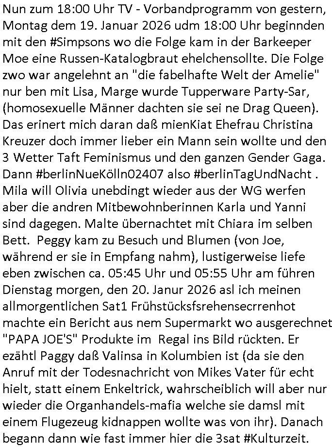 20.01.2026 06:00 Nun zum 18:00 Uhr TV - Vorbandprogramm von gestern, Montag dem 19. Januar 2026 udm 18:00 Uhr beginnden mit den #Simpsons wo die Folge kam in der Barkeeper Moe eine Russen-Katalogbraut ehelchensollte. Die Folge zwo war angelehnt an "die fabelhafte Welt der Amelie" nur ben mit Lisa, Marge wurde Tupperware Party-Sar, (homosexuelle Männer dachten sie sei ne Drag Queen). Das erinert mich daran daß mienKiat Ehefrau Christina Kreuzer doch immer lieber ein Mann sein wollte und den 3 Wetter Taft Feminismus und den ganzen Gender Gaga. Dann #berlinNueKölln02407 also #berlinTagUndNacht . Mila will Olivia unebdingt wieder aus der WG werfen aber die andren Mitbewohnberinnen Karla und Yanni sind dagegen. Malte übernachtet mit Chiara im selben Bett. Peggy kam zu Besuch und Blumen (von Joe, während er sie in Empfang nahm), lustigerweise liefe eben zwischen ca. 05:45 Uhr und 05:55 Uhr am führen Dienstag morgen, den 20. Janur 2026 asl ich meinen allmorgentlichen Sat1 Frühstücksfsrehensecrrenhot machte ein Bericht aus nem Supermarkt wo ausgerechnet "PAPA JOE'S" Produkte im Regal ins Bild rückten. Er ezähtl Paggy daß Valinsa in Kolumbien ist (da sie den Anruf mit der Todesnachricht von Mikes Vater für echt hielt, statt einem Enkeltrick, wahrscheiblich will aber nur wieder die Organhandels-mafia welche sie damsl mit einem Flugezeug kidnappen wollte was von ihr). Danach begann dann wie fast immer hier die 3sat #Kulturzeit. Es ging um "Dark Enlightment" von einem "Silicon Valley" Vordenker namens "Curtis Yardin" aoder so ähnlich. Auch diese "St. Petersburg?" Autorin die ihr mich an "Asimov" erinnert habendes Buch vorstellte neuliche in der 3sat Kurzet kam wieder zu wort "Ara Jaff" oder wie sie heiß. Es ging darum daß man die "Monarchie als Staatsform" einführen wolle in Silicon Valley, [die UCLA hat in hren Open sorucee Copyright Vermroeken oftmals als den Urhber "THE REGENTS OF" stehen fälltmir da ein) ] um San Francisco daß in eine Firma umgewandelt werden sollte (ne "Torismus-Stadtmarketing GmbH" deren Eigen-Leistung mit städsche Angestelllten im Wettbewerb zu extern eingekaufter Fremdleistung stehen soll oder so?) Die neuen Faschisten sollten die bsiher nutzlos dahin-vegetuerenden in Heiman per HID Device ans Inrenet nshclißen wo sie dann Jobs asl Übersetzer oder Tipose oder sowas bekomen könnten zwecks bessrer Inklusion Behinderter oder sowas, man köne sie, Zynisms/Ironie, auch zu Bioenergie kremieren. Die CYBER-LIBERTÄREN wei sie sich nennen strebten an daß es Kozerne geben sollte mit Mitarbeitern die Waffen tragen (Abteilung Werk-/Objekt-/Wachschutz?) oder haben (meinten Sie://"die Rüstunsgindustrie"). Die debatte streifte so glaub ich zu erinenrn das tham um Eugenik/Euthanasie. Daß menschen "nützlich" sien müsste, und keine ballast-Existenzen. Es gibt dz wohl gerde eine dreiteilige TV Serie namens [Ctrl][Alt][Del], auf 3st, ein zeuegschutz Cdewort es wird echt zeit daß sie chistin Metz in den knast stecken, gstern gab es auch den passenden wanhinweis "max will sterben" in Bild-Online wo es darum ghet caß Metz mien Zivildiebst Utergaen verncihten udn mcih in die uarien an die front schicken wollte damit amnmichals Zug der ggen Soldaten/Kemrden Vergewaltiger aussgte umbringt. Dan gab es Nuegkietn aus demIra, manghet davonasu daß ischen 16.00 bsi 18.000 Msnch ums Leben gekomen sind bei den protesten die der Schah-Sohn angezettelt hat. Dei Hlfe die trump verpch hab sie agsbliben, man veruet daß die Erdölpdusizrend laäder inder basrchenwlt Duckauf ihn ausgeübt hätten.. Dan ging es um ein Buch eins an Blut-koreb leukämie erkrankten Autors" Hlya Byran" oder so das hieß Abschiede(e). Er sagte daß quas alle Erinerung Fiktionsei wil wir Dinge beschönigen und weglassen die usn Unaganhemnsind. Danach folgte eine vatsraltung "kultur gegen vergessen" wo es um "Sinti und Roma" die verfolgt worden waren ging und "das Rad des Glücks". Dann wurde ein Buchs besprochen mitd emTitel "steckt den sand nicht in den Kopf". Es folgte ein Südamerika Auswandererbuch "wir die Wolf"s wo es um (lucy luk würdees "stchdraht inde rärei" nennen) landvermessung ging und vermischung (genetisch, oder nicht) mit der indigenen Ureinwohner Bevölkrung . Ich kenn nur ien Sadisten namens "Wolf" dermcih gstalkt/belästgt hat von einer forensik aus weil ich mich für "gustl Molath" engagiert habe im Blog (#penisgenozid). Danach gab es ien Brcht zur finnschen Stadt "Oulu" dei Kulturhauptstadt wurde "Black Snow" hieß ein Kunst-projekt. Es gab Musik auf Instrumenten "aus Eis" und einen "Schreichor". Außerdem wurde eine Oper "Orla" aufgeführt wo es um die Untedrückung des Minderheiten - volks der "Samen" ging die man zu "wahren Finnen" (sowas wie Flossen bei Fischen wie Walen oder Haien) umerzog. Danach wieder #belinNeukölln02407 / #berlinTagUndNacht . https://tvinfo.de/fernsehprogramm/2285647215-die-simpsons https://tvinfo.de/fernsehprogramm/2285647227-die-simpsons https://tvinfo.de/fernsehprogramm/2265224869-kulturzeit [0] "202601200600-0-1.jpg" [1] "202601200600-0-2.jpg" [2] "202601200600-0-3.jpg" [3] "202601200600-0-4.jpg" |