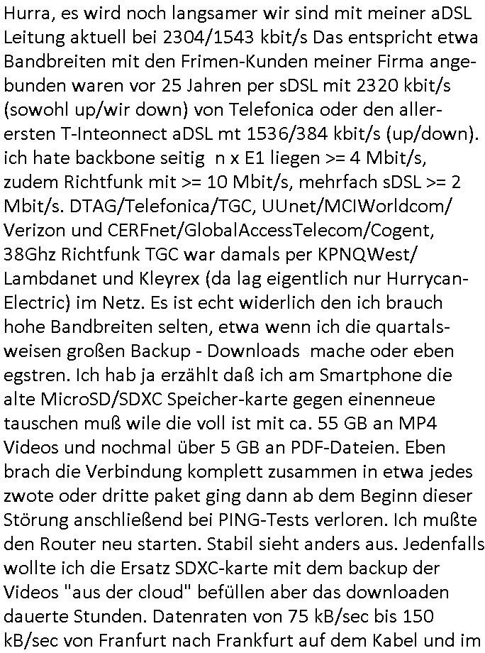 22.01.2026 07:45 Hurra, es wird noch langsamer wir sind mit meiner aDSL Leitung aktuell bei 2304/1543 kbit/s Das entspricht etwa Bandbreiten mit den Frimen-Kunden meiner Firma ange-bunden waren vor 25 Jahren per sDSL mit 2320 kbit/s (sowohl up/wir down) von Telefonica oder den aller-ersten T-Inteonnect aDSL mt 1536/384 kbit/s (up/down). ich hate backbone seitig n x E1 liegen >= 4 Mbit/s, zudem Richtfunk mit >= 10 Mbit/s, mehrfach sDSL >= 2 Mbit/s. DTAG/Telefonica/TGC, UUnet/MCIWorldcom/ Verizon und CERFnet/GlobalAccessTelecom/Cogent, 38Ghz Richtfunk TGC war damals per KPNQWest/ Lambdanet und Kleyrex (da lag eigentlich nur Hurrycan-Electric) im Netz. Es ist echt widerlich den ich brauch hohe Bandbreiten selten, etwa wenn ich die quartals-weisen großen Backup - Downloads mache oder eben egstren. Ich hab ja erzählt daß ich am Smartphone die alte MicroSD/SDXC Speicher-karte gegen einenneue tauschen muß wile die voll ist mit ca. 55 GB an MP4 Videos und nochmal über 5 GB an PDF-Dateien. Eben brach die Verbindung komplett zusammen in etwa jedes zwote oder dritte paket ging dann ab dem Beginn dieser Störung anschließend bei PING-Tests verloren. Ich mußte den Router neu starten. Stabil sieht anders aus. Jedenfalls wollte ich die Ersatz SDXC-karte mit dem backup der Videos "aus der cloud" befüllen aber das downloaden dauerte Stunden. Datenraten von 75 kB/sec bis 150 kB/sec von Franfurt nach Frankfurt auf dem Kabel und im IP-Addressbereoch des DSL-Providers. Das USB-kabel mit dem anders als der Elektronikfachmark im myZeil behautet hat der wie ich erfuhre gerade von starurn auf medimakr umfimiert behatete USB-C fürs Telefon ist ja kaputt, ich musste mir also eine Lösung zusammen-basteln mit WIFI wiel ich nur einen SDXC - Leser hatte (in diesem steckte dann die neue Karte) und die shartes ich per SSH/SFTP/SSH und das Mobil-Telefon uploadete dan stunden-lang per RFC1918 WIFI/WALN Link und die Daten auf deirKarte udn die Zeitstempel mussten dann später per script manuell wieder hergestellt werden (das Original mit den richtigenzetsplen ist noch vorhanden). Von etwa 08:30 Uhr bis etwa 20:30 Uhr dauerte das. Erinnert mich irgendwie an "Stasi & Fy" Mecki der mal was manipleren wollt im Bad Homburger Telefonnetz mit seinen Kollegen mit diese, DATG Kabel TV / Colt Telecom Kartell, damlas als TGC sich an CERFNet "Global Access" anscchen wollte und unerlaunnterweis mein Endpumkte Netz als Transit über drahtgebunden DeCIX Konnektivität zum Interxion (Hanauer-Land 30X) und "Verizon [war das chon zu UUNet MAE Zeiten so]?" Kleyerstraße DeCIX hin nutzen wollte. Hiter dem Kleyrex steckt eine bis auf die Knochen korrupter Odnungsamtsführugszirkeltype (die sitzen dort nämlich, in Nähe der afaik GPS/RAIL ARCOR Fasern) der im Rahemn des Polizei beschaffungsskandals hfftlich mit gebauchte wurde zusammen mit den anderen Millonenbetrügern. Die Sparkasse schafft (Alarmsignal) Teil ihres Online - Bankings ab die dort gehostet wurden. Und wohl daher kracht es gerade allerkräftigst im Netz im Frankfurter Glasfaserring. Udn es gibt auch massiev Preis-stegrungen die plötzlich bei den verbleibenden Anbietern afgrufn werde können weil man quasi Hals über Kopf von bestimmten Rechenzentren/Leitzngs- Konnektvitäts-nabietern weg-zieht. Das ist quasi ien ganz ähliche szenatio wie ich es im Februar/März bis Juni 2003 udn Edne 2004 erlebt habe. Als mein früherer Mitgesell-schafter sich als witschftlich strafbar Untreu eris, anteile ans google Kartell veräußen wollte woeb ich in auf dem Sportpresseball erwischte. Udn da ginges uch um verdeckte bschhung von Polize udn dem Bad homburger "Bundesverband der Wach- und Schließgesellscften" aslo der Banksicherheit, Kidnapping und RAF Terror,d amit hatte Bühnentechnik "Satis & Fy" Mecki (der Ex-Freund der Mutter mienr Tichetr die mich unter Drogen setzte) zu tun. Wo die Schutzgelderpresser wollten daß ich arbeitlose Soldaten / Rcpksar-Bühnenetcnik S*xurtys als EDV Rdchterzms "Wachlute" einstelle. Dies Luet die meine Post stehlen und als DSL/Internte Drückolonnen kartelle mit Fake - Rechnugen Konten leeräumen. Die bande die mch zuscgen wollte ihre illegalen- SCHWARZ-BAUTEN (siehe etwa die Ökostrommfai) zu legalsieren nachträgloch per enführtem Kind/Rfumrod Eprrssungen. https://www.chip.de/news/software/sparkasse-spricht-kuendigung-aus-und-loescht-daten-kunden-muessen-schnell-aktiv-werden_b8e504cd-b07d-419d-96c9-1219e3abf511.html = Kidnapping Eprssung RZ-Shcutgeld/Lizenzenmafia https://www.hessenschau.de/panorama/frankfurter-justizskandal-um-korruption-bewaehrungsstrafe-fuer-it-unternehmer-v2,prozess-korruption-102.html [0] "202601220745-0-1.jpg" [1] "202601220745-0-2.jpg" [2] "202601220745-0-3.jpg" [3] "202601220745-0-4.jpg" |