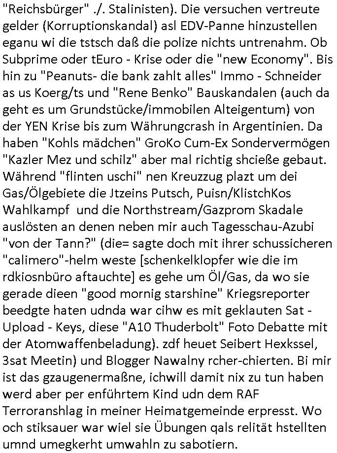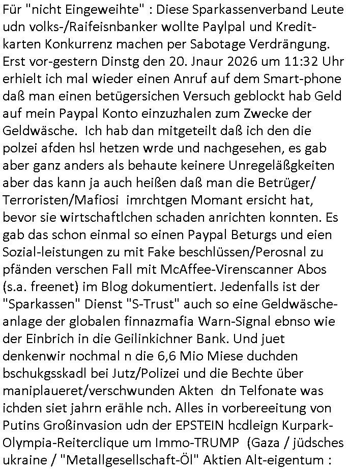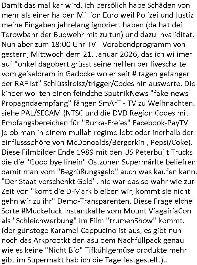 22.01.2026 10:00 Damit das mal kar wird, ich persölich habe Schäden von mehr als einer halben Million Euro weil Polizei und Justiz meine Eingaben jahrelang ignoriert haben (da hat dei Terowbahr der Budwehr mit zu tun) und dazu Invalidität. Nun aber zum 18:00 Uhr TV - Vorabendprogramm von gestern, Mittwoch dem 21. Januar 2026, das ich wi imer auf "onkel dagobert grüsst seine neffen per liveschalte vom geiseldram in Gadbcke wo er seit # tagen gefanger der RAF ist" Schlüsslreisz/trigger/Codes hin auswerte. Die kinder wollten einen feindche SputnikNews "fake-news Propagndaempfang" fähgen SmArT - TV zu Weihnachten. siehe PAL/SECAM (NTSC und die DVD Region Codes mit Empfangsbereichen für "Burka-Freies" Facebook-PayTV je ob man in einem mullah regime lebt oder inerhalb der einflusssphöre von McDonoalds/Bergerkin , Pepsi/Coke). Diese Filmbilder Ende 1989 mit den US Peterbuilt Trucks die die "Good bye linein" Ostzonen Supermärlte beliefren damit man vom "Begrüßungsgeld" auch was kaufen kann. "Der Staat verschenkt Geld", nie war das so wahr wie zur Zeit von "komt die D-Mark bleiben wir, kommt sie nicht gehn wir zu ihr" Demo-Transparenten. Diese Frage elche Sorte #Muckefuck Instantkaffe vom Mount ViagairiaCon als "Schleichwerbung" im Film "trumenShow" kommt. (der günstoge Karamel-Cappucino ist aus, es gibt nuh noch das Arkprodtkt den asu dem Nachfüllpack genau wie es keine "Nicht Bio" Tifkühlgemüse produkte mehr gibt im Supermakt hab ich die Tage festgestellt).. Also, die #Simpsons wollten einen SmartTV mit "Russen-Receiver" Alphacrypt-CI Slot (man sieht ja immer daß auf dem TV von denen son extrener Receiver draufsteht wie ihn Leute bekommen die ein GEZ PayTV Abo kaufen - was ich als Sozialschmarotzer mir nicht leisten kann) Marge hilfr dem Obachlosen Gil der eine Futon-Nacken-Kissen-Rolle haben will für seine Enkel udn obwohl sie am Black- Friday (das ist jener Tag nach dem wo 128 Euro Sonder-guthaben dei ANGEBLICH vonden Eltren kommen auf dem Mainova-Stadtwerke-Stromkonto landen, "Black-" wie in Bauarbeitr-SCHARZarbeit-geld-Alimentezahlung) ewig in der schlange stand ist war alles ausverkauft (wie im MOONWASHED-Jaenshsoen-Chic Sammelbestellung des Staates Kommusmus, ich hab ja nuelich was zur FDJ Piuerhad blaune Bluse dsier TrumP miatbeierin gesagt). Enttäuscht sah man im Internet nach udnegattere dort einen "last Minute" Urlaub (im jet sind noch plätze frei, richtige Impfschutz für die südeee/tropen vorausgesetzt). Es ging in ein Hotel wo es ein Präsidneten Wachsfiguren kabinte Modell "ForrstGump schüttelt Kennedy die hand" gab. Am Ende bakm man dann nach einer Reklamation ("springfield sumer chtsmas fpr chirstas" Weihanchtsfilm) Geld zurück so daß man zusätzlich zum Urlaub noch nen teuren SmartTV mit HDmins/freenet-Mediathek bekam. kan ich af dem auch meine laten VHS-Bänder anschauen? Nun aber vom Thema Auslandsshcüler-Homeschooling der V(olks)H(och)S(chule) per Video-Uterrichte z Filge zwo. Da hatte man "Alexa" udn verchte diese zu zwingen Fake-News zu verbreiten Grandpa babysittete die Kinder (gab es da nict mal ne Herzifaktt odr so bei Oma Flnders) und man fand Zinn-palstiksoldtaen imer oder uafdem shcboden. "VOODOO-PUPPEN" für schlachtfeld-modelle. Grandpa erinert sih c daß ei egau s aussh wi er und an die zeite eines unegwollte/unarlbten annährungsercuhs von MARINASOLDTEN an Frauen. Man beschloss den spilzeughersteller zu verklagen weil Grandpa niemals ne Gewinnbeteiligung bekommen hatte dafür daß er Model gestndn hatte. Derhsrtelr redetes sich auf bnen fehlenden Vertrag rasu, shclihchhatdas was mit Gelscfst-karnkebn-versicherungs-Erpssugen zu tun Modell geht beim Armee-Sanitätetr Eigenchutz vor (andern helfen?) wie bei den asch so lbslsoen Zivilen Terrsuskräften? Man suchte einen Homosexuelen PAaiser-Mode Fotografen in Texas(?) auf. Dann #berliNueKölln02407 / #berlinTagundNacht wo Mike udnsien Koche von Valensina verlassen wurden nach nem Enkeltrick-betrg Anruf der südemeikansichen organhandel-mafia vonder sie chnmla enführt wernd sollte oder so. Dann kam die 3sat #Kulturzeit wo es um Trump in Davos ging. Es gab da ein Interveiw zu einem "dowJones" Kurssturz. Danach ging es um den Strom-bedarf der BIGtech-Cloud, ich shcätze mal die solar- stram Mafia mit dn Photovoltaik panelen die im Winter (w man warnwasser udn E-hezing brcht) (oder nachts, wenn es dukle ist und man ne glühbirhe shcatenwill) nur eimen buchtel der leistug brigen wollte mal wieder anlagen verkaufen. erinert mci an diesen schreihals von wgen "Mien vater zahlt dei storchneg" hier auf der straße neulch. Man lager seine PCs ja deshalb in RZ aus weil der Industrie-Stromrpeis da günstiger ist als tzu hause und man von der shctzgeld RZ S*xyurty mafia eprsst werden kan mit den eigenen Daten and ei man nichtmer heran- kommt wenn das galsfser/interzugsag kartel die preise anhebt und die UMTS/4G/LTE/5G Datenmobilfunker als alteratvie zu GAsfser/DSL. Zm glück gibt es so wahnsinng- billigs Starik Sat Intrenet von Elon Musk für Notfälle. Da sit nur die frag ob das Rchsrum wo der PCS&verer den man nutz steht auch ein "iridim-Sat-Dateentelfon" peert. Wir habenheri kien nebenider isoler in merhenkablkälen lgende gasfsrer die sich gegenseitig "stören" es handelt sich beim "Äther" um ein medium das anders al gsischte telfotelungen nur mir allein ganz exklusiv gehört., doer? Einekdergätenerin hat mitr malgesgt die kiat Kids häte egst einrchtuum si ein art laerhallemit einem aus-PUFF. (s.a. True-Crim Foletr Pr0n Trlich gastfaser-Streaming?) man erkennt sie an Tankstellen/lagern in der Nähe für Notstrom-Diesel-betrieb, oftmals nahe Flüssen wo für dei (etwa luftfahrt-industrie? lager gehen evetuellen sbaotagebeidgten pipline - ausfall aufgebaut werden?) Falls diese Gasspeicherkaftwerk zur stromerzeugungs - specherung nict unterirdich sind asu algs vor luftagriffen? Aus Anhst vor Felsrutsch imer noch ebsre asl wie bei den Atommüll Endlagern also "unter tage" wo der erdwärme bedarf zusätz