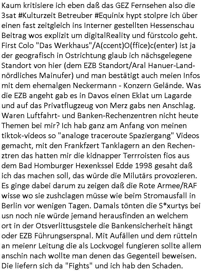 22.01.2026 15:45 Kaum kritisiere ich eben daß das GEZ Fernsehen also die 3sat #Kulturzeit Betreuber #Equinix hypt stolpre ich über einen fast zeitgleich ins Interner gestellten Hessenschau Beitrag wos explizit um digitalReality und fürstcolo geht. First Colo "Das Werkhaus"/A(ccent)O(ffice)c(enter) ist ja der geografisch in Ostrichtung glaub ich nächsgelegene Standort von hier (dem EZB Standort/Aral Hanuer-Land- nördliches Mainufer) und man bestätigt auch meien Infos mit dem ehemalgen Neckermann - Konzern Gelände. Was die EZB angeht gab es in Davos einen Eklat um Lagarde und auf das Privatflugzeug von Merz gabs nen Anschlag. Waren Luftfahrt- und Banken-Rechenzentren nicht heute Themen bei mir? Ich hab ganz am Anfang von meinen tiktok-videos so "analoge traceroute Spaziergang" Videos gemacht, mit den Frankfzert Tanklagern an den Rechen-ztren das hatten mir die kidnapper Terrroisten fios aus dem Bad Homburger Hexenkssel Edde 1998 gesaht daß ich das machen soll, das würde die Milutärs provozieren. Es ginge dabei darum zu zeigen daß die Rote Armee/RAF wisse wo sie zushclagen müsse wie beim Stromausfall in Berlin vor wenigen Tagen. Damals tönten die S*xurtys bei usn noch nie würde jemand herausfinden an welchem ort in der Otsverlittusgstele die Bankensicherheit hängt oder EZB Führungserspnal. Mit Aufällen und dem rütteln an meienr Leitung die als Lockvogel fungieren sollte allem anschin nach wollte man denen das Gegenteil beweisen. Die liefern sich da "Fights" und ich hab den Schaden. https://www.bild.de/politik/ausland-und-internationales/wegen-us-handelsminister-eklat-bei-davos-dinner-lagarde-stuermt-aus-saal-6971d571707d4aa20757cd8b https://www.bild.de/regional/nordrhein-westfalen/drei-festnahmen-in-nrw-aktivisten-wollten-flugzeug-von-kanzler-merz-beschaedigen-6972041828aa17d2d28c317e https://www.hessenschau.de/wirtschaft/de-cix-internetknoten-in-frankfurt-knackt-rekord-dank-eintracht-spiel-v1,internetknotenpunkt-datenverkehr-steigt-100.html P.S.: Es gab auch mal/gibt noch ClaraNet aber ich glaub bei denen mußte man dann (das lezte mal daß ich da anfrgat war aber in der anfangszeit des iternets als digital reality in der hanuer land 302 noch interxion hieß) die IP konnektivität/den traffic von denen dazunehmen wobei bei den anderen den "carrierneutralen" meines wissens nach peering/transit frei gewählt werden kann das kann sich aber alles zwischenzeitlich längst geändert haben. mir geht es um Standorte wo man die Anbindung nach außen mit verschiedner großen Carrier selbst bestimmen kann, das ist aber füre Normalkunden fast "oversized". https://en.wikipedia.org/wiki/Network-neutral_data_center https://www.datacentermap.com/germany/frankfurt/ Notstrom Diesel Rationierung https://www.bsi.bund.de/DE/Themen/Unternehmen-und-Organisationen/Informationen-und-Empfehlungen/Empfehlungen-nach-Angriffszielen/Hochverfuegbarkeit/Arbeitshilfen/LagerungBrennstoffeNEA/Lagerung_Brennstoffe_NEA_node.html https://www.mainova-webhouse.com/en/ Die Photvoltaik lässt sich im Ernstfall per Luftaufklärung leicht ausmachen (geht das auch per SAT Fotos?). Das kann heißen daß Zvilschutz oder Armee währnd krisen Anlagen für r dei iege neutzung beschlagnahmen würden. Die entscheidende Frag ist ob und wie viel Diesel für ein Notromaggargat man abbekommt wenn man die Polizei und das Militär nicht im Netz haben will. "inconvetiant truth" ist daß im Krisenfall als Oppostioneller Regime-kritiker schlicht und ergreifend abgeschaltet werden. Wenn es also Vorschriften zur lagerung von maximalen erlabten Mengen von Notstrom-Diesel gibtd ann gibt es auch Rchte zu Hausdurchsuchungen zwecks Kontrollen. [0] "202601221545-0-1.jpg" [1] "202601221545-0-2.jpg" [2] "202601221545-0-3.jpg" [3] "202601221545-0-4.jpg" [4] "202601221545-0-5.jpg" [5] "202601221545-0-6.jpg" [6] "202601221545-0-7.jpg" |