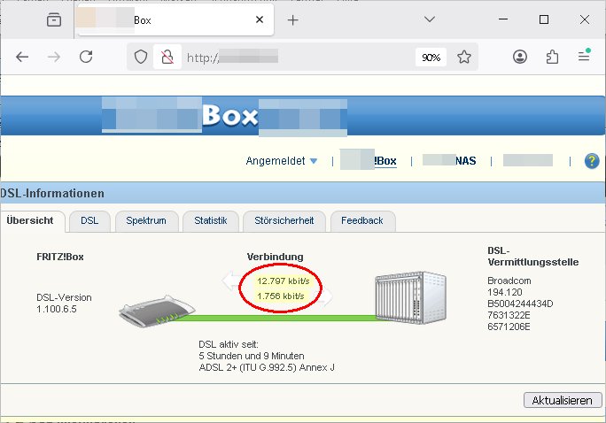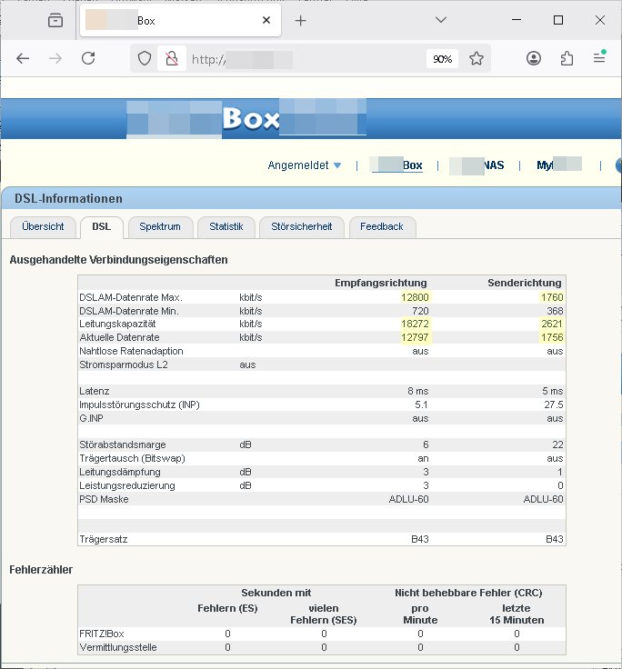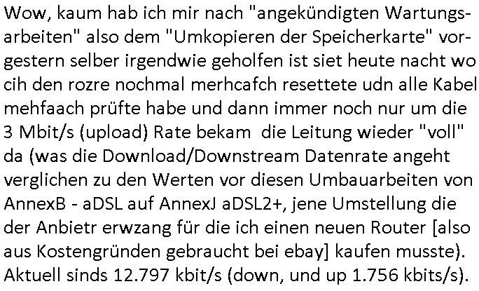 Wow, kaum hab ich mir nach "angekündigten Wartungs- arbeiten" also dem "Umkopieren der Speicherkarte" vor-gestern selber irgendwie geholfen ist siet heute nacht wo cih den rozre nochmal merhcafch resettete udn alle Kabel mehfaach prüfte habe und dann immer noch nur um die 3 Mbit/s (upload) Rate bekam die Leitung wieder "voll" da (was die Download/Downstream Datenrate angeht verglichen zu den Werten vor diesen Umbauarbeiten von AnnexB - aDSL auf AnnexJ aDSL2+, jene Umstellung die der Anbietr erwzang für die ich einen neuen Router [also aus Kostengründen gebraucht bei ebay] kaufen musste). Aktuell sinds 12.797 kbit/s (down, und up 1.756 kbits/s).