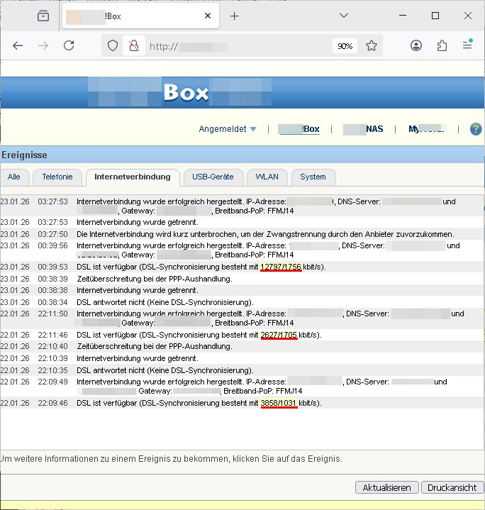 23.01.26 03:27:53 Internetverbindung wurde erfolgreich hergestellt. IP-Adresse: ***, DNS-Server: *** und ***, Gateway: ***, Breitband-PoP: FFMJ14