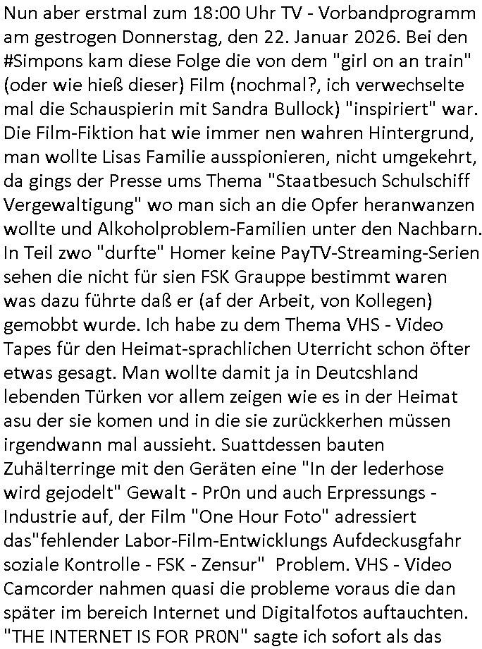 Nun aber erstmal zum 18:00 Uhr TV - Vorbandprogramm am gestrogen Donnerstag, den 22. Januar 2026. Bei den #Simpons kam diese Folge die von dem "girl on an train" (oder wie hieß dieser) Film (nochmal?, ich verwechselte mal die Schauspierin mit Sandra Bullock) "inspiriert" war. Die Film-Fiktion hat wie immer nen wahren Hintergrund, man wollte Lisas Familie ausspionieren, nicht umgekehrt, da gings der Presse ums Thema "Staatbesuch Schulschiff Vergewaltigung" wo man sich an die Opfer heranwanzen wollte und Alkoholproblem-Familien unter den Nachbarn. In Teil zwo "durfte" Homer keine PayTV-Streaming-Serien sehen die nicht für sien FSK Grauppe bestimmt waren was dazu führte daß er (af der Arbeit, von Kollegen) gemobbt wurde. Ich habe zu dem Thema VHS - Video Tapes für den Heimat-sprachlichen Uterricht schon öfter etwas gesagt. Man wollte damit ja in Deutcshland lebenden Türken vor allem zeigen wie es in der Heimat asu der sie komen und in die sie zurückkerhen müssen irgendwann mal aussieht. Suattdessen bauten Zuhälterringe mit den Geräten eine "In der lederhose wird gejodelt" Gewalt - Pr0n und auch Erpressungs - Industrie auf, der Film "One Hour Foto" adressiert das"fehlender Labor-Film-Entwicklungs Aufdeckusgfahr soziale Kontrolle - FSK - Zensur" Problem. VHS - Video Camcorder nahmen quasi die probleme voraus die dan später im bereich Internet und Digitalfotos auftauchten. "THE INTERNET IS FOR PR0N" sagte ich sofort als das
