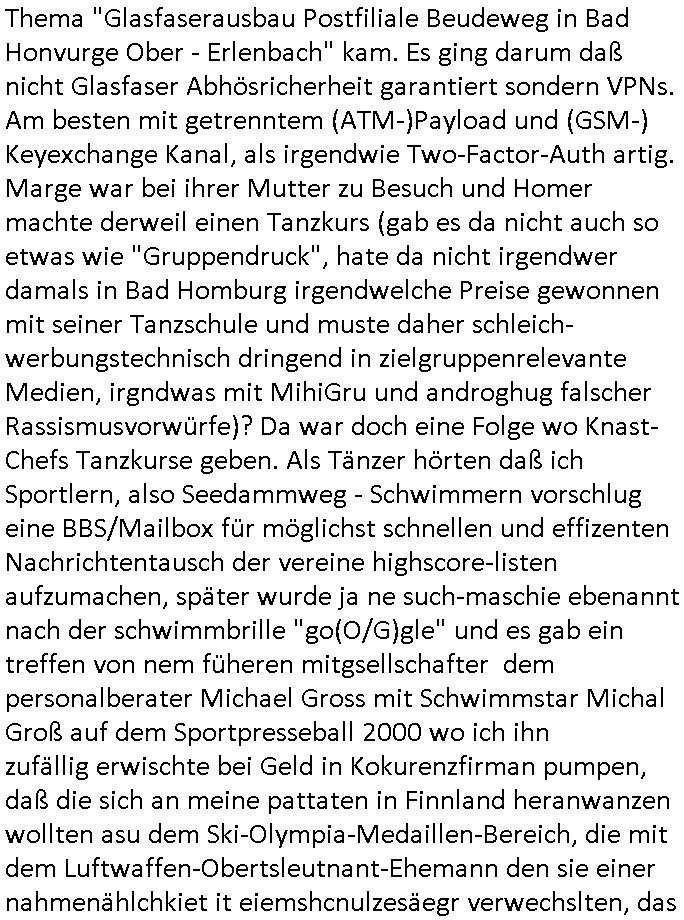 Thema "Glasfaserausbau Postfiliale Beudeweg in Bad Honvurge Ober - Erlenbach" kam. Es ging darum daß nicht Glasfaser Abhösricherheit garantiert sondern VPNs. Am besten mit getrenntem (ATM-)Payload und (GSM-) Keyexchange Kanal, als irgendwie Two-Factor-Auth artig. Marge war bei ihrer Mutter zu Besuch und Homer machte derweil einen Tanzkurs (gab es da nicht auch so etwas wie "Gruppendruck", hate da nicht irgendwer damals in Bad Homburg irgendwelche Preise gewonnen mit seiner Tanzschule und muste daher schleich-werbungstechnisch dringend in zielgruppenrelevante Medien, irgndwas mit MihiGru und androghug falscher Rassismusvorwürfe)? Da war doch eine Folge wo Knast-Chefs Tanzkurse geben. Als Tänzer hörten daß ich Sportlern, also Seedammweg - Schwimmern vorschlug eine BBS/Mailbox für möglichst schnellen und effizenten Nachrichtentausch der vereine highscore-listen aufzumachen, später wurde ja ne such-maschie ebenannt nach der schwimmbrille "go(O/G)gle" und es gab ein treffen von nem füheren mitgsellschafter dem personalberater Michael Gross mit Schwimmstar Michal Groß auf dem Sportpresseball 2000 wo ich ihn zufällig erwischte bei Geld in Kokurenzfirman pumpen, daß die sich an meine pattaten in Finnland heranwanzen wollten asu dem Ski-Olympia-Medaillen-Bereich, die mit dem Luftwaffen-Obertsleutnant-Ehemann den sie einer nahmenählchkiet it eiemshcnulzesäegr verwechslten, das