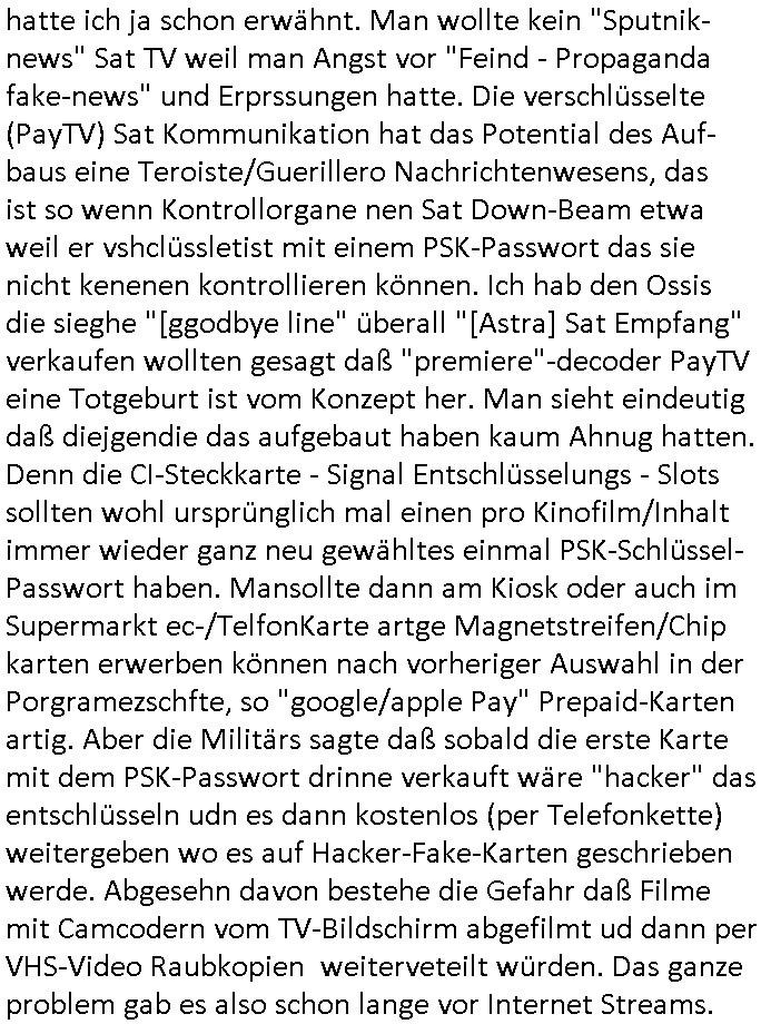 hatte ich ja schon erwähnt. Man wollte kein "Sputnik-news" Sat TV weil man Angst vor "Feind - Propaganda fake-news" und Erprssungen hatte. Die verschlüsselte (PayTV) Sat Kommunikation hat das Potential des Auf-baus eine Teroiste/Guerillero Nachrichtenwesens, das ist so wenn Kontrollorgane nen Sat Down-Beam etwa weil er vshclüssletist mit einem PSK-Passwort das sie nicht kenenen kontrollieren können. Ich hab den Ossis die sieghe "[ggodbye line" überall "[Astra] Sat Empfang" verkaufen wollten gesagt daß "premiere"-decoder PayTV eine Totgeburt ist vom Konzept her. Man sieht eindeutig daß diejgendie das aufgebaut haben kaum Ahnug hatten. Denn die CI-Steckkarte - Signal Entschlüsselungs - Slots sollten wohl ursprünglich mal einen pro Kinofilm/Inhalt immer wieder ganz neu gewähltes einmal PSK-Schlüssel-Passwort haben. Mansollte dann am Kiosk oder auch im Supermarkt ec-/TelfonKarte artge Magnetstreifen/Chip karten erwerben können nach vorheriger Auswahl in der Porgramezschfte, so "google/apple Pay" Prepaid-Karten artig. Aber die Militärs sagte daß sobald die erste Karte mit dem PSK-Passwort drinne verkauft wäre "hacker" das entschlüsseln udn es dann kostenlos (per Telefonkette) weitergeben wo es auf Hacker-Fake-Karten geschrieben werde. Abgesehn davon bestehe die Gefahr daß Filme mit Camcodern vom TV-Bildschirm abgefilmt ud dann per VHS-Video Raubkopien weiterveteilt würden. Das ganze problem gab es also schon lange vor Internet Streams.