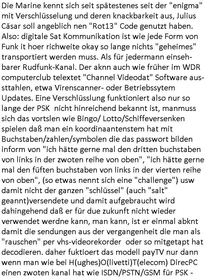 Die Marine kennt sich seit spätestenes seit der "enigma" mit Verschlüsselung und deren knackbarkeit aus, Julius Cäsar soll angeblich nen "Rot13" Code genutzt haben. Also: digitale Sat Kommunikation ist wie jede Form von Funk it hoer richweite okay so lange nichts "geheimes" transportiert werden muss. Als für jedermann einseh- barer Rudfunk-Kanal. Der aknn auch wie früher im WDR computerclub telextet "Channel Videodat" Software aus-sttahlen, etwa Virenscanner- oder Betriebssytem Updates. Eine Verschlüsslung funktioniert also nur so lange der PSK nicht hinreichend bekannt ist, manmuss sich das vortslen wie Bingo/ Lotto/Schiffeversenken spielen daß man ein koordinaantenstem hat mit Buchstaben/zahlen/symbolen die das passwort bilden inform von "ich hätte gerne mal den dritten buchstaben von links in der zwoten reihe von oben", "ich hätte gerne mal den füften buchstaben von links in der vierten reihe von oben", (so etwas nennt sich eine "challenge") usw damit nicht der ganzen "schlüssel" (auch "salt" geannt)versendete und damit aufgebraucht wird dahingehend daß er für due zukunft nicht wieder verwendet werdne kann, man kann, ist er einmal abknt damit die sendungen aus der vergangenheit die man als "rauschen" per vhs-videorekorder oder so mitgetapt hat decodieren. daher fuktioert das modell payTV nur dann wenn man wie bei H(ughes)O(livetti)T(elecom) DirecPC einen zwoten kanal hat wie ISDN/PSTN/GSM für PSK -