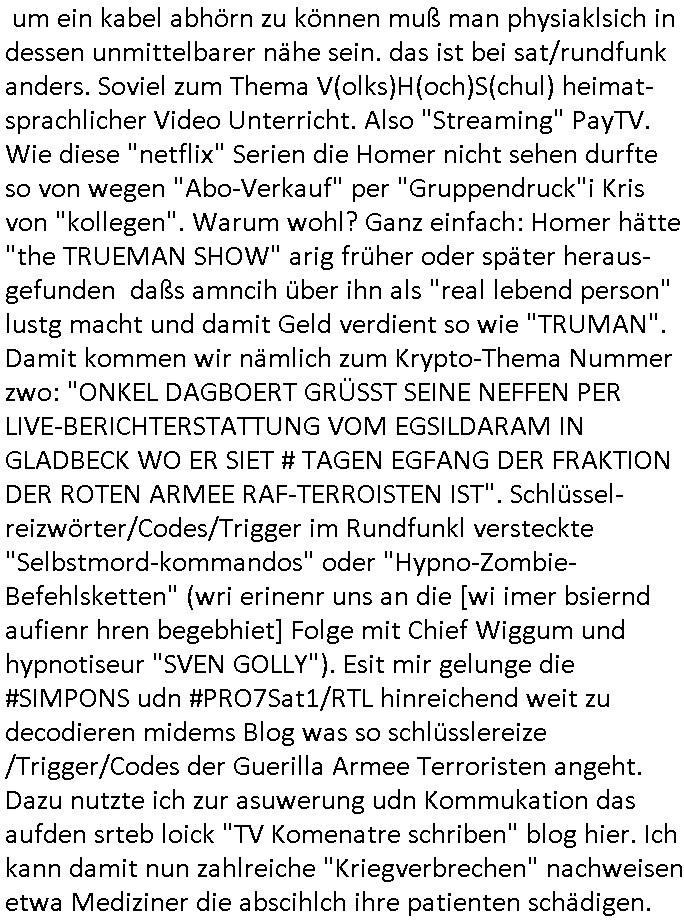 um ein kabel abhörn zu können muß man physiaklsich in dessen unmittelbarer nähe sein. das ist bei sat/rundfunk anders. Soviel zum Thema V(olks)H(och)S(chul) heimat-sprachlicher Video Unterricht. Also "Streaming" PayTV. Wie diese "netflix" Serien die Homer nicht sehen durfte so von wegen "Abo-Verkauf" per "Gruppendruck"i Kris von "kollegen". Warum wohl? Ganz einfach: Homer hätte "the TRUEMAN SHOW" arig früher oder später heraus-gefunden daßs amncih über ihn als "real lebend person" lustg macht und damit Geld verdient so wie "TRUMAN". Damit kommen wir nämlich zum Krypto-Thema Nummer zwo: "ONKEL DAGBOERT GRÜSST SEINE NEFFEN PER LIVE-BERICHTERSTATTUNG VOM EGSILDARAM IN GLADBECK WO ER SIET # TAGEN EGFANG DER FRAKTION DER ROTEN ARMEE RAF-TERROISTEN IST". Schlüssel-reizwörter/Codes/Trigger im Rundfunkl versteckte "Selbstmord-kommandos" oder "Hypno-Zombie-Befehlsketten" (wri erinenr uns an die [wi imer bsiernd aufienr hren begebhiet] Folge mit Chief Wiggum und hypnotiseur "SVEN GOLLY"). Esit mir gelunge die #SIMPONS udn #PRO7Sat1/RTL hinreichend weit zu decodieren midems Blog was so schlüsslereize /Trigger/Codes der Guerilla Armee Terroristen angeht. Dazu nutzte ich zur asuwerung udn Kommukation das aufden srteb loick "TV Komenatre schriben" blog hier. Ich kann damit nun zahlreiche "Kriegverbrechen" nachweisen etwa Mediziner die abscihlch ihre patienten schädigen.