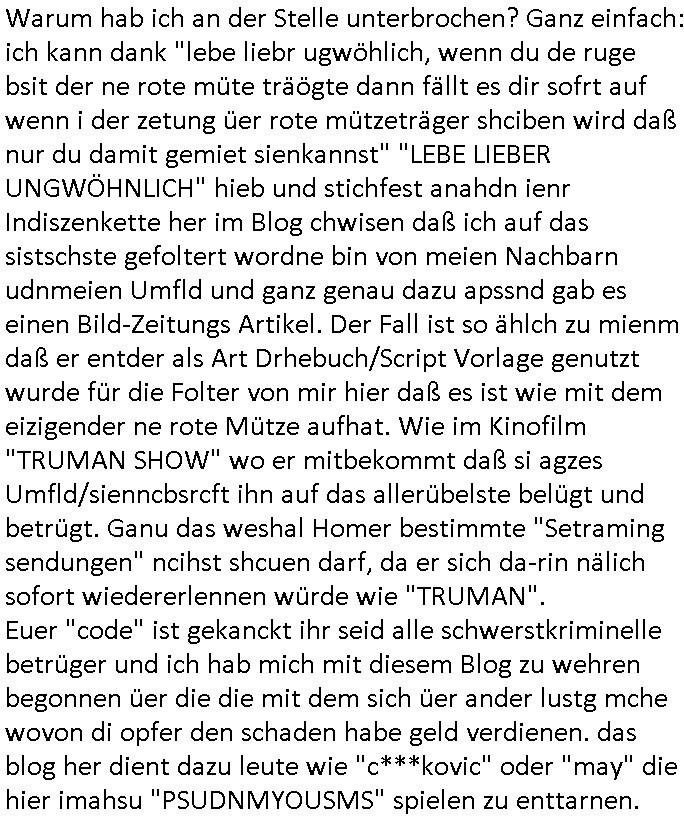 Warum hab ich an der Stelle unterbrochen? Ganz einfach: ich kann dank "life less ordinary", wenn du de ruge bsit der ne rote müte träögte dann fällt es dir sofrt auf wenn i der zetung üer rote mützeträger shciben wird daß nur du damit gemiet sienkannst" "LEBE LIEBER UNGWÖHNLICH" hieb und stichfest anahdn ienr Indiszenkette her im Blog chwisen daß ich auf das sistschste gefoltert wordne bin von meien Nachbarn udnmeien Umfld und ganz genau dazu apssnd gab es einen Bild-Zeitungs Artikel. Der Fall ist so ählch zu mienm daß er entder als Art Drhebuch/Script Vorlage genutzt wurde für die Folter von mir hier daß es ist wie mit dem eizigender ne rote Mütze aufhat. Wie im Kinofilm "TRUMAN SHOW" wo er mitbekommt daß si agzes Umfld/sienncbsrcft ihn auf das allerübelste belügt und betrügt. Ganu das weshal Homer bestimmte "Setraming sendungen" ncihst shcuen darf, da er sich da-rin nälich sofort wiedererlennen würde wie "TRUMAN". Euer "code" ist gekanckt ihr seid alle schwerstkriminelle betrüger und ich hab mich mit diesem Blog zu wehren begonnen üer die die mit dem sich üer ander lustg mche wovon di opfer den schaden habe geld verdienen. das blog her dient dazu leute wie "c***kovic" oder "may" die hier imahsu "PSUDNMYOUSMS" spielen zu enttarnen.