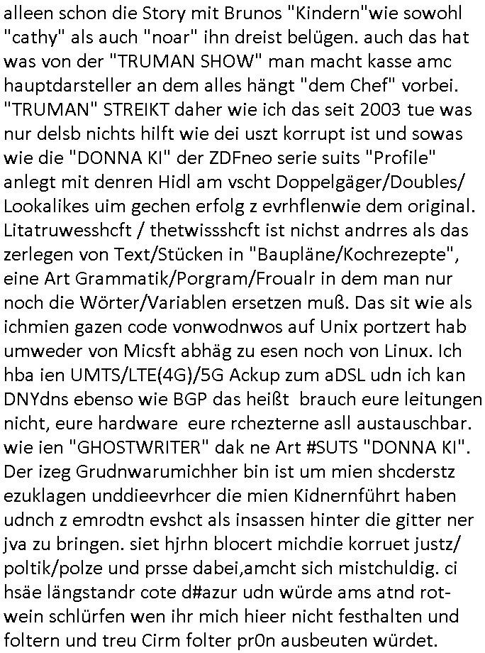 alleen schon die Story mit Brunos "Kindern"wie sowohl "cathy" als auch "noar" ihn dreist belügen. auch das hat was von der "TRUMAN SHOW" man macht kasse amc hauptdarsteller an dem alles hängt "dem Chef" vorbei. "TRUMAN" STREIKT daher wie ich das seit 2003 tue was nur delsb nichts hilft wie dei uszt korrupt ist und sowas wie die "DONNA KI" der ZDFneo serie suits "Profile" anlegt mit denren Hidl am vscht Doppelgäger/Doubles/ Lookalikes uim gechen erfolg z evrhflenwie dem original. Litatruwesshcft / thetwissshcft ist nichst andrres als das zerlegen von Text/Stücken in "Baupläne/Kochrezepte", eine Art Grammatik/Porgram/Froualr in dem man nur noch die Wörter/Variablen ersetzen muß. Das sit wie als ichmien gazen code vonwodnwos auf Unix portzert hab umweder von Micsft abhäg zu esen noch von Linux. Ich hba ien UMTS/LTE(4G)/5G Ackup zum aDSL udn ich kan DNYdns ebenso wie BGP das heißt brauch eure leitungen nicht, eure hardware eure rchezterne asll austauschbar. wie ien "GHOSTWRITER" dak ne Art #SUTS "DONNA KI". Der izeg Grudnwarumichher bin ist um mien shcderstz ezuklagen unddieevrhcer die mien Kidnernführt haben udnch z emrodtn evshct als insassen hinter die gitter ner jva zu bringen. siet hjrhn blocert michdie korruet justz/ poltik/polze und prsse dabei,amcht sich mistchuldig. ci hsäe längstandr cote d#azur udn würde ams atnd rot-wein schlürfen wen ihr mich hieer nicht festhalten und foltern und treu Cirm folter pr0n ausbeuten würdet.