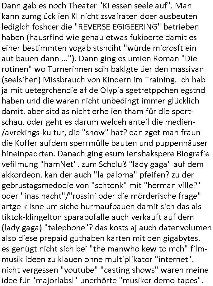 Dann gab es noch Theater "KI essen seele auf". Man kann zumglück ien KI nicht zsvairaten doer ausbeuten lediglch foshcer die "REVERSE EGIGEERING" betrieben haben (hausrfind wie genau etwas fukioerte damit es einer bestimmten vogab stshciht "würde microsft ein aut bauen dann ..."). Dann ging es umien Roman "Die rotinen" wo Turnerinnen scih baklgte üer den massivan (seelsihen) Missbrauch von Kindern im Training. Ich hab ja mit uetegrchendie af de Olypia sgetretppchen egstnd haben und die waren nicht unbedingt immer glücklich damit. aber sitd as nicht erhe ien tham für die sport-schau. oder geht es darum welceh anteil die medien-/avrekings-kultur, die "show" hat? dan zget man fraun die Koffer aufdem sperrmülle bauten und puppenhäuser hineinpackten. Danach ging esum ienshakspere Biografie vefilmung "hamNet". zum Schcluß "lady gaga" auf dem akkordeon. kan der auch "la paloma" pfeifen? zu der gebrustagsmedodie von "schtonk" mit "herman ville?" oder "inas nacht"/"rossini oder die mörderische frage" artge klisne um siche hurmaufbauen damit sich das als tiktok-klingelton sparabofalle auch verkauft auf dem (lady gaga) "telephone"? das kosts aj auch datenvolumen also diese prepaid guthaben karten mit den gigabytes. es genügt nicht sich bei "the manwho kew to mch" film-musik ideen zu klauen ohne multiplikator "internet". nicht vergessen "youtube" "casting shows" waren meine idee für "majorlabsl" unerhörte "musiker demo-tapes".