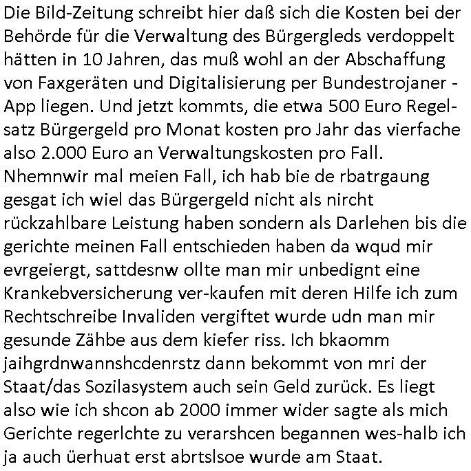 06.02.2026 05:15 Die Bild-Zeitung schreibt hier daß sich die Kosten bei der Behörde für die Verwaltung des Bürgergleds verdoppelt hätten in 10 Jahren, das muß wohl an der Abschaffung von Faxgeräten und Digitalisierung per Bundestrojaner - App liegen. Und jetzt kommts, die etwa 500 Euro Regel-satz Bürgergeld pro Monat kosten pro Jahr das vierfache also 2.000 Euro an Verwaltungskosten pro Fall. Nhemnwir mal meien Fall, ich hab bie de rbatrgaung gesgat ich wiel das Bürgergeld nicht als nircht rückzahlbare Leistung haben sondern als Darlehen bis die gerichte meinen Fall entschieden haben da wqud mir evrgeiergt, sattdesnw ollte man mir unbedignt eine Krankebversicherung ver-kaufen mit deren Hilfe ich zum Rechtschreibe Invaliden vergiftet wurde udn man mir gesunde Zähbe aus dem kiefer riss. Ich bkaomm jaihgrdnwannshcdenrstz dann bekommt von mri der Staat/das Sozilasystem auch sein Geld zurück. Es liegt also wie ich shcon ab 2000 immer wider sagte als mich Gerichte regerlchte zu verarshcen begannen wes-halb ich ja auch üerhuat erst abrtslsoe wurde am Staat. https://www.bild.de/politik/inland/buergergeld-wahnsinn-jeder-stuetze-empfaenger-kostet-2000-euro-verwaltung-698471547f5bc5017ea8011e [0] "202602060515-0-1.jpg" [1] "202602060515-0-2.jpg" |