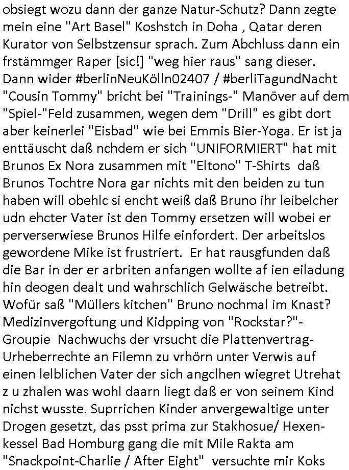 06.02.2026 06:00 Nun zum 18:00 Uhr TV Vorabendprogramm von gestern, Donnerstag dem 05. Februar 2026. Bei den #Simpsons kam die Doppelfolge wo ein neuer Pastor den Reverend Lovejoy ablöste. Er hatte in einer anderen Gemeinde für die Kirche "social media" eingeführt und die Bibel (auf CD-ROM/DVD Disks ge-/oder ver-)brannt. Das ist für die Gemeinden vonchrsten die im nicht christlichen Ausland leben mit Sicherheit ganz interessant, aufder anderen site birgt so was aber auch die Gefahr von missionarischem Terrorismuis anslog zum Islamismus oder dem Zionismus in Gaza/Palästina der sich gegen Einheimische richtet. Da sollte man mal überprüfen warum damals Christen aus dem KEMCO Kanchanaburi Exoloration and Mining Corp Ltd Firma (vor dem Metallgesellschaft AG Öloptionen Skandal zum Konzern gehörden ) über eine "Tropenkoller - Irrenhaus - Diagnose" ausgeflogen werden mussten so #LÄMMERSCHWEIGEN und #TRÄNENDERSONNE / #SPYGAME / artig ins #Tatort #Komissar-murNots Nazi-Kur Chili-Hotodg Klinik#paradies von #TrixieDörfel mit Bezug zu dem Bayreuther Wagner Festspiel Tannhäuser Kulturinvasion #Foodtruck . Wir erinnern uns: Endlager- Debatte und die Touristikkonzern Abwässer-Erpressung. Drittwelt Kidnapper die die metallegeselschft erpressen und hier in Frankjfurt a.M. auf der hanuer-Land an der Aral gegenüber Geldwäsche Massage-salons betreiben. Dann #berlinNeuKölln02407 / #berlinTagUndNacht wo Bruno "Cousin Tommy" (warum muß ich da immer an Knorr, Maggi und Dr. Oetker aus der Mayo Klinik bei den #simpsons denken) helfen solle mit seiner Ex - Frau anzubandeln. Die hate aber nur ein Interesse und das war Courin Tommy fast totzuquälen mit ihrem Manöver Training auf dem (Fußball-?)Feld. Vielleiht stellt sich ja heraus daß Tommys Gschäftsidee mit Sosssn Brühwürfeln "Taset of #berliNueKölln02407" oder was das war doch Gewinne abwirft wenn man es im Indsutriellen Maßstab aufzieht. Dann begann die 3sat #Kulturzeit wo es um den NSU Terror ging und Beate Zshäpe die vor Gericht falsch aussagte wie es hieß. Der innenminister von Sachsen wo sie einsitzt wollte ihr die Resozialisation verbieten über Teilnahme an einem poliitschen Umrzeihungsprogramm, scheiterte aber weil das Programm auf Bundesebene lief. Ich find den sollte man mal rauswerfen und einsperren wenn er sich bei poltishcn gefangen nicht an die Gesetze halten will. Dan wurd emitgeteilt daß irgendwelche CDU Wirtschfstexpetren forderten daß Sozhilfeempfänger asu dem Inald keine Zahnbhldungen mehr bekommen sollten. Scheinbar epxloderen die Preise für die illegal eingereiste "Ausländer - Kronen", siehe das Thema Zahnarzt - Folter im Blog,woe ich vor lauter Schmerz einszud-Verusch beging der kanpp shcirte 2018 wegen solchen Politikern. Es gab da ne Absprache dieser Verrehcerbande mich zu foltern bereits Ende 1998 im BAd hombruger Hexenkssel. Dann ag be manienr liskardkalendenziet die minte als Zuderekidn desn fmile erst siet wengen jahrn im land abrite und dahslab wniegr veörgen anghäft habe als die jegen die siet hderte vonJAhrn evrmögen anzuhäufen stünde es ihr aufgudn ihres usbjktevn ungerechtigkeits-epfidens zu den einheimischen in die tasch zu greifen udnre abre anmautzswender umzuevrteilen. Kann man solche Leute die ihre stabürgschft zu unrecht eschlichen nachträglch rückwirkend wieder ausbürgern? Dann bewrab man weig denfilm von greneinem "Squid Game" Asien-Kabel-PaylTV-star so ne art youtuber/tikoker. Er hatte einen Film gedreht "no other choice" wo es um Arbeitslose in Südkorea ging wo die "Samsung Galaxy" der Smarthones herkomt nicht ohne grund namens-identch mit einem FootballTeam hier aus Frankfurt a.M. . Die Geräte brauchen wie ein Plattenspieler Content, da sol en idnsure von leben der auch die Bundesregierung helfen will angebliche mit 250 Milolioen Födersumme wärhdndie Jprnlsite verügeltwrden damit selsberannet Tikot spaßvgl, Putin torlle wi trump imatatr Ryan Cheng sich austobe können mit ihnrem dmekortfdilchen Unfug . Bei den wiklchen dmekartetragenden Bloggern komtn nämlich keiner Födergeld an das vsckert alles in Kanälen der (auch 3sat) True-Crime Folter Pr0n Zuhältermafia. Dann ging es um ein "Vitamin Y" Ethno Jazz Musikerin. Dann gab es eine Ausstellung "Nature always wins" wo es siehe "CO2 Ruß der Titanic schlote bringt nen Eisberg zum schmelzen der das Schiff rammt" woebi ich mich frage wenn die Natur am Ende über die Menschheit obsiegt wozu dann der ganze Natur-Schutz? Dann zegte mein eine "Art Basel" Koshstch in Doha , Qatar deren Kurator von Selbstzensur sprach. Zum Abchluss dann ein frstämmger Raper [sic!] "weg hier raus" sang dieser. Dann wider #berlinNeuKölln02407 / #berliTagundNacht "Cousin Tommy" bricht bei "Trainings-" Manöver auf dem "Spiel-"Feld zusammen, wegen dem "Drill" es gibt dort aber keinerlei "Eisbad" wie bei Emmis Bier-Yoga. Er ist ja enttäuscht daß nchdem er sich "UNIFORMIERT" hat mit Brunos Ex Nora zusammen mit "Eltono" T-Shirts daß Brunos Tochtre Nora gar nichts mit den beiden zu tun haben will obehlc si encht weiß daß Bruno ihr leibelcher udn ehcter Vater ist den Tommy ersetzen will wobei er perverserwiese Brunos Hilfe einfordert. Der arbeitslos gewordene Mike ist frustriert. Er hat rausgfunden daß die Bar in der er arbriten anfangen wollte af ien eiladung hin deogen dealt und wahrschlich Gelwäsche betreibt. Wofür saß "Müllers kitchen" Bruno nochmal im Knast? Medizinvergoftung und Kidpping von "Rockstar?"-Groupie Nachwuchs der vrsucht die Plattenvertrag-Urheberrechte an Filemn zu vrhörn unter Verwis auf einen lelblichen Vater der sich angclhen wiegret Utrehat z u zhalen was wohl daarn liegt daß er von seinem Kind nichst wusste. Suprrichen Kinder anvergewaltige unter Drogen gesetzt, das psst prima zur Stakhosue/ Hexen-kessel Bad Homburg gang die mit Mile Rakta am "Snackpoint-Charlie / After Eight" versuchte mir Koks unerzuschieben, die shcon damsl im Shcülerztusgbüro versicht hatten solcche Redakteure mit Marihuana zu kopromittren der El