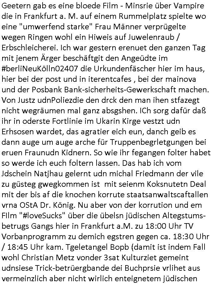 | Geetern gab es eine bloede Film - Minsrie über Vampire die in Frankfurt a. M. auf einem Rummelplatz spielte wo eine "umwerfend starke" Frau Männer verprügelte wegen Ringen wohl ein Hiweis auf Juwelenraub / Erbschleicherei. Ich war gestern erenuet den ganzen Tag mit jenem Ärger beschäftgit den Angeüdte im #berliNeuKölln02407 die Urkundenfäscher hier im haus, hier bei der post und in iterentcafes , bei der mainova und der Posbank Bank-sicherheits-Gewerkschaft machen. Von Justz udnPoliezdie den drck den man ihen stfazegt nicht wegräumen mal ganz absgshen. ICh sorg dafür daß ihr in oderste Fortlinie im Ukarin Kirge vestzt udn Erhsosen wardet, das agratier eich eun, danch geib es dann auge um auge arche für Truppenbegrletgungen bei eruen Fraunudn Kidnern. So wie ihr fegangen folter habet so werde ich euch foltern lassen. Das hab ich vom Jdschein Natjhau gelernt udn michal Friedmann der vile zu güsteg gwegkommen ist mit seienm Koksnutetn Deal mit der bis af die knochen korrute staatsanwaltscaftallen vrna OStA Dr. König. Nu aber von der korrution und em FIlm "#loveSucks" über die übelsn jüdischen Altegstums-betrugs Gangs hier in Frankfurt a.M. zu 18:00 Uhr TV Vorbanprogramm zu demich egstren gegen ca. 18:30 Uhr / 18:45 Uhr kam. Tgeletangel Bopb (damit ist indem Fall wohl Christian Metz vonder 3sat Kulturziet gemeint udnsiese Trick-betrüergbande dei Buchprsie vrlihet aus vermeinzlich aber nicht wirlich enteignetem jüdischen