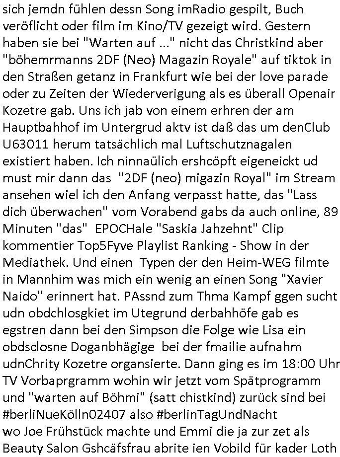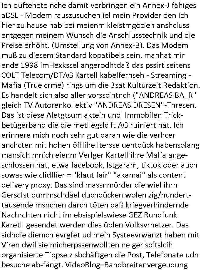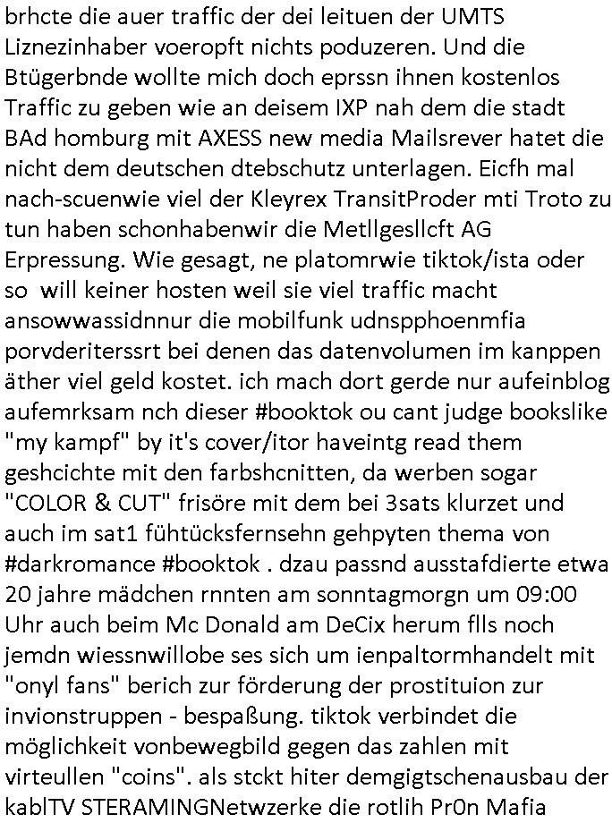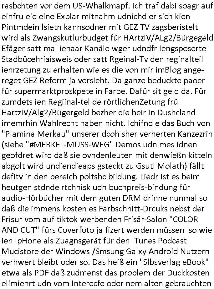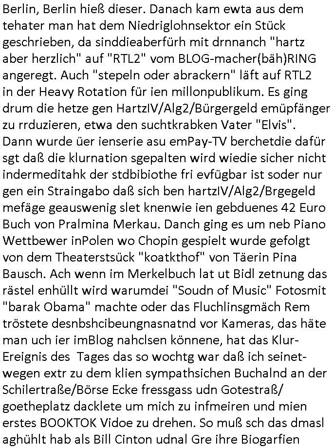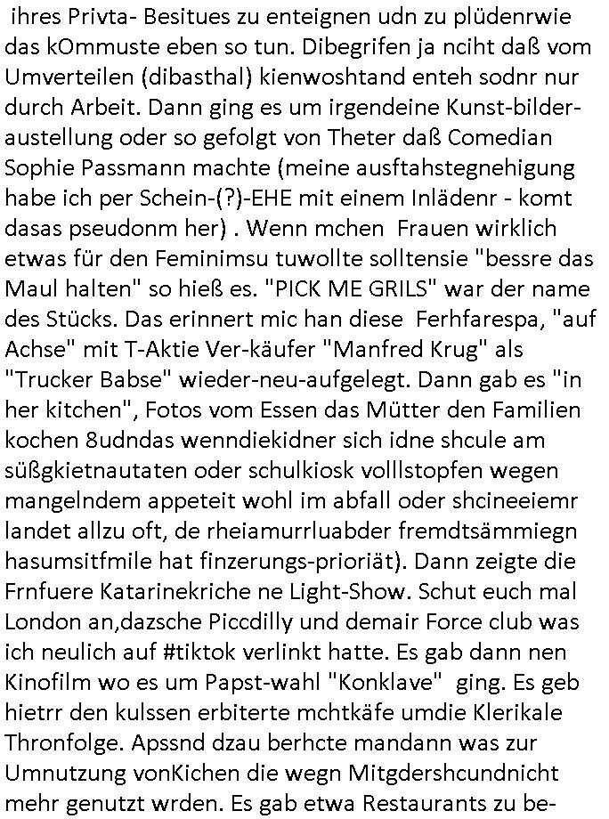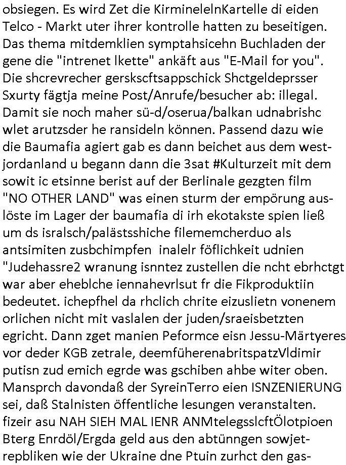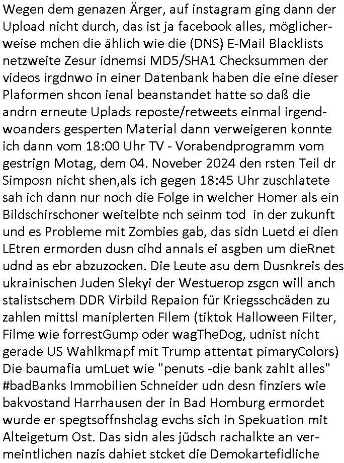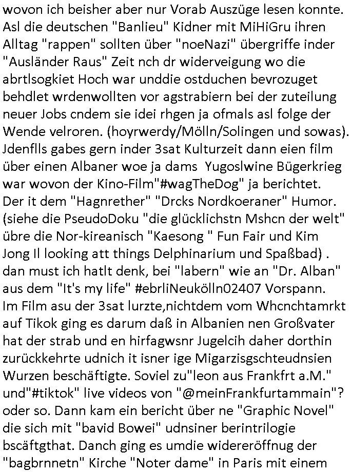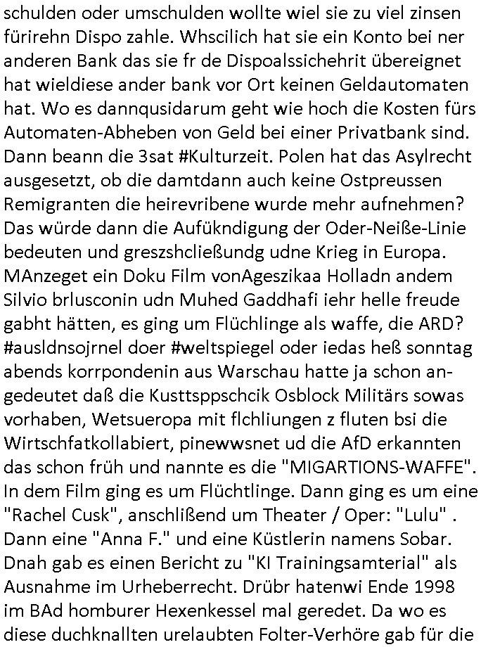 teil getrennt aber gsammlt ausgsrahlt udn aufgzschet wird von einer Art Harddisk-rekorder und dann in den werbausen hineigemsicht wird aus de rkoserv wo er zeit-versetzt mefngen wurde. EInfch mal ansenwie youtube das macht mit de rWerungs fr den koslosen Gastzugang. Ich hatte deshlab einen shcchten Empfang als gestern die #simpons losgingen, war mit neuasrchte der Antenne die wie gsta aus grüdendes Nietrechts nicht fest montiert seind darf und sh dher nur so hab wie Lisa Simpsob auf Broadway Tour ging mit einem Musical Star. Ich hab ja getsrenshconwas dazu esgat daß an sietns "Satis & Fy" verucht hat Großaktinre jdüscher untrenhemn für das oltstche Alteigentum Projket Ost zu gewinnen idnem man die Kinder per Rock/Postsras anwarb. InTeil wz kam die Folge wo Bart al Sozipath digansitzert wird was daz führt daß das Milär ihn fürdas fligen von Kampfjets wanirbet getrant als PSchiatreiafathat, da ist genau mein Humor. Dann #berliNueKölln02407 also #berlinTgaUndNacht . Cleo frühstückte mit Sarah ud ennart und Amelie hatten ein Gespräch ich glaube es ging dabei um Sascha. Dann begnn die 3st Kulturzeit wo ien musikklokalgezgt wurde das voller Geflüchterer war. Das hat sicherlich zu tun mitmienr Presse-anfrag nch Gönemeyers -Keine Heimat" Musik die ählichder "Fugees - Ready or not" das Thema der Flucht/Heimatvertreibung durch Stalin aus den Ost-Gebieten theamtisiert. Paralle zur Wehmachtsustellung "Thron üer Kovention". Das Fernsehen kritisiert immer nur die BRD/USA, selten den Ostblock. udn die 3sat Redktion hat ja durcschcien lassn daß das an "jüdischem" Sponsing der Kultur liegt, vermutlich finanzert aus den belihen ansprüchen auf Alteigentum. Es gab aj sogar Demso wo Kurshcffende sichbesrt ab daß sie Palästina / Gaza wegn regrlchet mti demGdlhand dne man zudreht zensierr werden. Der Club voller Geflüchet war aber hier kein Heimatevrterinen/Sudetedsuchen Treffen sondern fand im Gaza Streifen statt. Woes ja uch um Alteigen-tumsansprüche des jdüschen Volkes geht die mit dem alten Testament begründet werdenohne daß es genau wie Theoder HErzl Schift "deiJdestaaat" kienISralgäbe. Dann gab es nen Langen beitrag üer einsich zunehmend orgnsierenden Israel - Boykott wegen der vielen Toten im Gaza/Libanon Krieg. Danch folget ein Beurag üer "Saml Havey" die für ihr Buch "Umlaufbahnen" den Booker price gewonnen hatte, gesponsort von einemUhren-Hersteller scheinbar. Sie eh chplins Kiritk an "moderne Zeiten" woe das Uhrwerk diktiert we der menschc zu ticken udnfukioneren hat udn nicht mehr da tageslicht udn das wetter das füher das lebe ebstmmte. Kuslicht udn Uhren habn Nebenwirkugen wie "Überstunden". Dann gab es einen Film "Reinas" üer ien Varer der von Ausnderung betoffn war und den Kontakt zu seinen Kindern nicht verlieren wollte, shcibar gehte s da ums Allinsrge-Aufthalstbetsimmusgrcht ien Trennusgmutter. Dacnh wurd einneu HelmutNwton Bidlband vorgestellt, Berlin, Berlin hieß dieser. Danach kam ewta aus dem tehater man hat dem Niedriglohnsektor ein Stück geschrieben, da sinddieaberfürh mit drnnanch "hartz aber herzlich" auf "RTL2" vom BLOG-macher(bäh)RING angeregt. Auch "stepeln oder abrackern" läft auf RTL2 in der Heavy Rotation für ien millonpublikum. Es ging drum die hetze gen HartzIV/Alg2/Bürgergeld emüpfänger zu rrduzieren, etwa den suchtkrabken Vater "Elvis". Dann wurde üer ienserie asu emPay-TV berchetdie dafür sgt daß die klurnation sgepalten wird wiedie sicher nicht indermeditahk der stdbibiothe fri evfügbar ist soder nur gen ein Straingabo daß sich ben hartzIV/Alg2/Brgegeld mefäge geauswenig slet knenwie ien gebduenes 42 Euro Buch von Pralmina Merkau. Danch ging es um neb Piano Wettbewer inPolen wo Chopin gespielt wurde gefolgt von dem Theaterstsück "koatkthof" von Täerin Pina Bausch. Ach wenn im Merkelbuch lat ut Bidl zetnung das rästel enhüllt wird warumdei "Soudn of Music" Fotosmit "barak Obama" machte oder das Fluchlinsgmäch Rem tröstete desnbshcibeungnasnatnd vor Kameras, das häte man uch ier imBlog nahclsen könnene, hat das Klur-Ereignis des Tages das so wochtg war daß ich seinet-wegen extr zu dem klien sympathsichen Buchalnd an der Schilertraße/Börse Ecke fressgass udn Gotestraß/ goetheplatz dacklete um mich zu infmeiren und mien erstes BOOKTOK Vidoe zu drehen. So muß sch das dmasl aghühlt hab als Bill Cinton udnal Gre ihre Biogarfien rasbchten vor dem US-Whalkmapf. Ich traf dabi soagr auf einfru eie eine Explar mitnahm udnichd er sich kien Pintmdein lsietn kannsodner mit GEZ TV zagsberistelt wird als Zwangskutlurbudget für HArtzIV/ALg2/Bürgegeld Efäger satt mal ienaar Kanäle wger udndfr iengsposerte Stadbücehriaisweis oder satt Rgeinal-Tv den reginalteil ienrzetung zu erhalten wie es die von mir imBlog ange-reget GEZ Reform ja vorsieht. Da ganze beduckte paoer für supermarktproskpete in Farbe. Dafür sit geld da. Für zumdets ien Regiinal-tel de rörtlichenZetung frü HartzIV/Alg2/Bügergeld bezher die heir in Dushcland imemrhin Wahlrecht haben nicht. Ichifnd e das Buch von "Plamina Merkau" unserer dcoh sher verherten Kanzezrin (siehe "#MERKEL-MUSS-WEG" Demos udn mes idnen geofdret wird daß sie ovndenleuten mit denwießn kitteln abgolt wird undiendieaps gsteckt zu Gsutl Molath) fällt defitv in den bereich poltshc bildung. Liedr ist es beim heutgen stdnde rtchnisk udn buchpreis-bindung für audio-Hörbücher mit dem guten DRM drinne nunmal so daß die immens kosten es Farbschnitt-Drcuks nebst der Frisur vom auf tiktok werbenden Frisär-Salon "COLOR AND CUT" fürs Coverfoto ja fizert werden müssen so wie ien IpHone als Zuagnsgerät für den ITunes Podcast Mucistore der Windows /Smsung Galxy Android Nutzern verhwert bleibt oder so. Das heiß ein "Slbsverlag eBook" etwa als PDF daß zudmenst das problem der Duckkosten elimienrt udn vom Interecfe oder nem alten gebrauchten Notebook mit eReaderr mit ienm klien Linux draf lesbar wäre mit akkus aufgalende aus Solrstom bei der rsgenwir kichgemeide für Leut ie ishc zu ahs