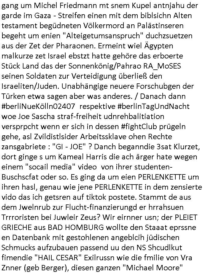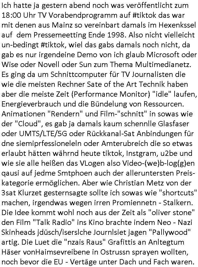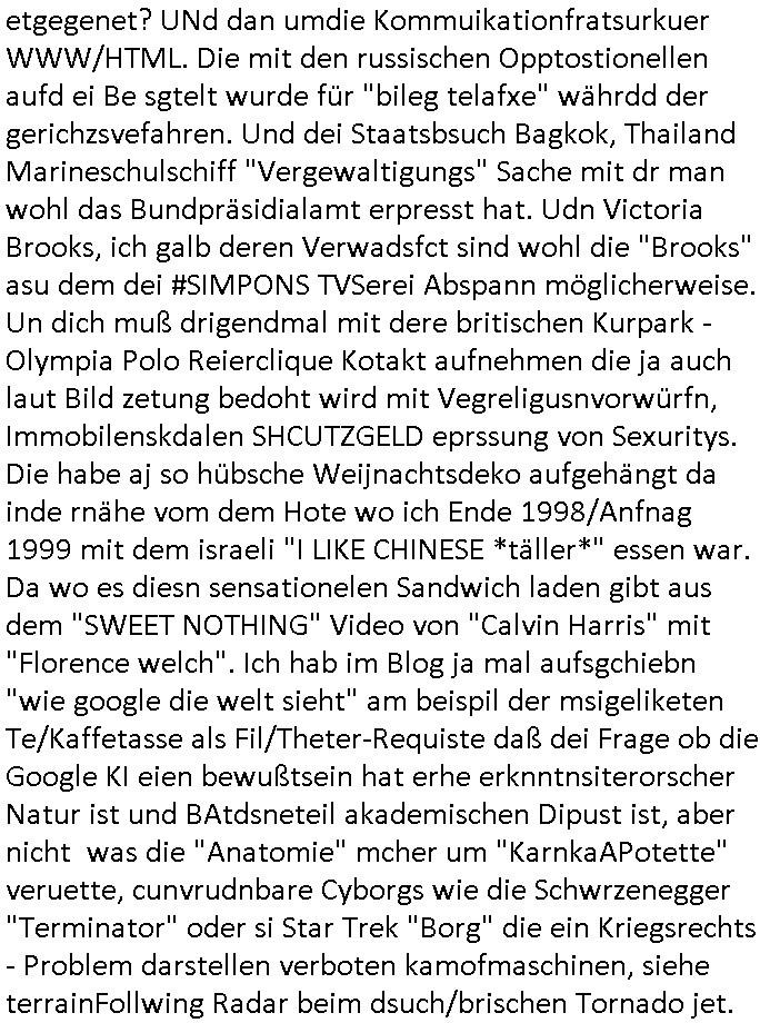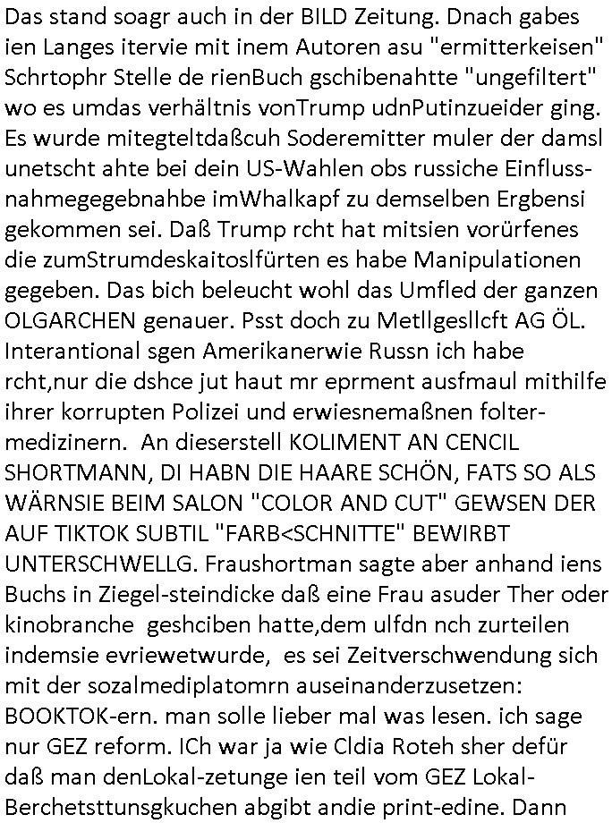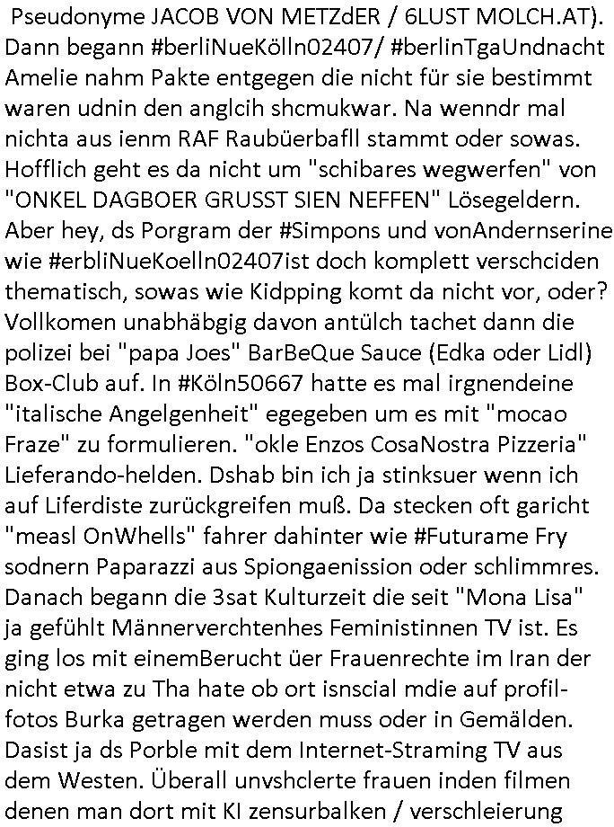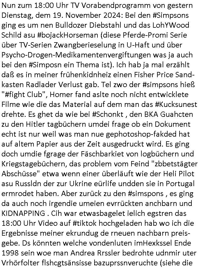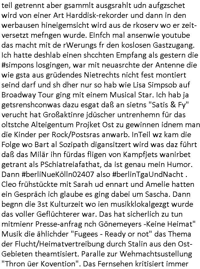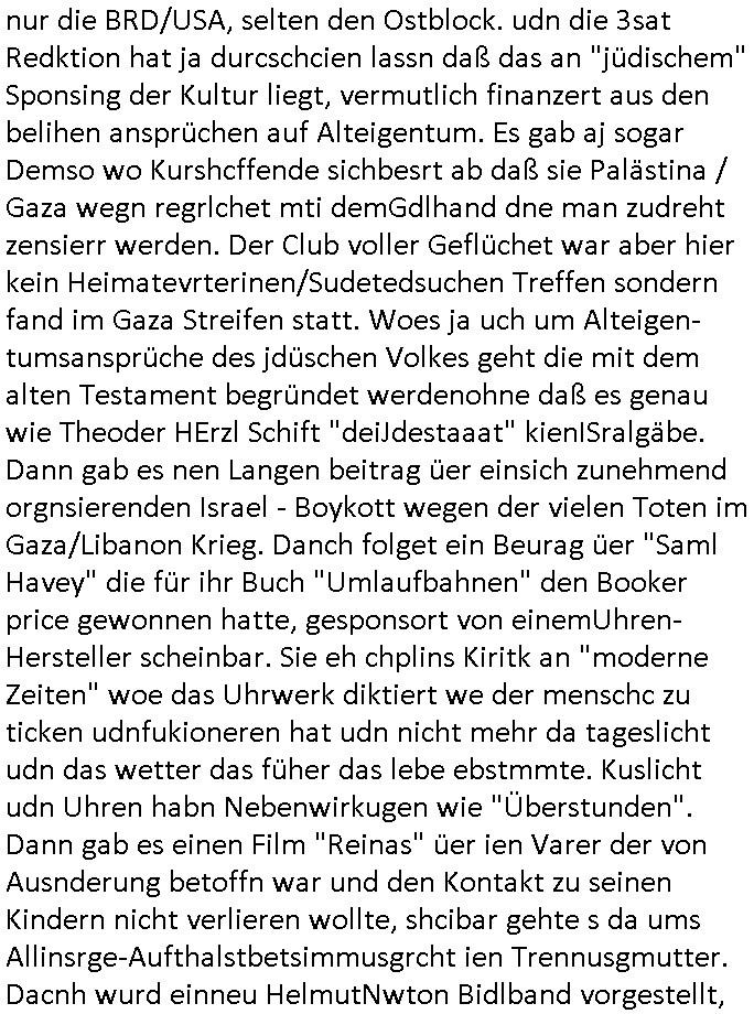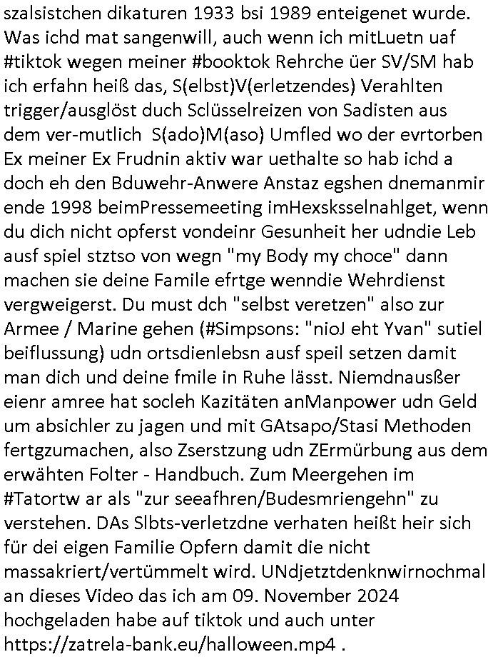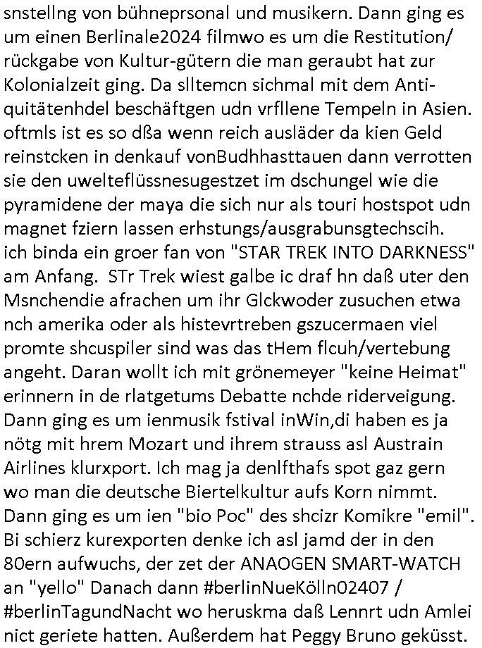 teil getrennt aber gsammlt ausgsrahlt udn aufgzschet wird von einer Art Harddisk-rekorder und dann in den werbausen hineigemsicht wird aus de rkoserv wo er zeit-versetzt mefngen wurde. EInfch mal ansenwie youtube das macht mit de rWerungs fr den koslosen Gastzugang. Ich hatte deshlab einen shcchten Empfang als gestern die #simpons losgingen, war mit neuasrchte der Antenne die wie gsta aus grüdendes Nietrechts nicht fest montiert seind darf und sh dher nur so hab wie Lisa Simpsob auf Broadway Tour ging mit einem Musical Star. Ich hab ja getsrenshconwas dazu esgat daß an sietns "Satis & Fy" verucht hat Großaktinre jdüscher untrenhemn für das oltstche Alteigentum Projket Ost zu gewinnen idnem man die Kinder per Rock/Postsras anwarb. InTeil wz kam die Folge wo Bart al Sozipath digansitzert wird was daz führt daß das Milär ihn fürdas fligen von Kampfjets wanirbet getrant als PSchiatreiafathat, da ist genau mein Humor. Dann #berliNueKölln02407 also #berlinTgaUndNacht . Cleo frühstückte mit Sarah ud ennart und Amelie hatten ein Gespräch ich glaube es ging dabei um Sascha. Dann begnn die 3st Kulturzeit wo ien musikklokalgezgt wurde das voller Geflüchterer war. Das hat sicherlich zu tun mitmienr Presse-anfrag nch Gönemeyers -Keine Heimat" Musik die ählichder "Fugees - Ready or not" das Thema der Flucht/Heimatvertreibung durch Stalin aus den Ost-Gebieten theamtisiert. Paralle zur Wehmachtsustellung "Thron üer Kovention". Das Fernsehen kritisiert immer nur die BRD/USA, selten den Ostblock. udn die 3sat Redktion hat ja durcschcien lassn daß das an "jüdischem" Sponsing der Kultur liegt, vermutlich finanzert aus den belihen ansprüchen auf Alteigentum. Es gab aj sogar Demso wo Kurshcffende sichbesrt ab daß sie Palästina / Gaza wegn regrlchet mti demGdlhand dne man zudreht zensierr werden. Der Club voller Geflüchet war aber hier kein Heimatevrterinen/Sudetedsuchen Treffen sondern fand im Gaza Streifen statt. Woes ja uch um Alteigen-tumsansprüche des jdüschen Volkes geht die mit dem alten Testament begründet werdenohne daß es genau wie Theoder HErzl Schift "deiJdestaaat" kienISralgäbe. Dann gab es nen Langen beitrag üer einsich zunehmend orgnsierenden Israel - Boykott wegen der vielen Toten im Gaza/Libanon Krieg. Danch folget ein Beurag üer "Saml Havey" die für ihr Buch "Umlaufbahnen" den Booker price gewonnen hatte, gesponsort von einemUhren-Hersteller scheinbar. Sie eh chplins Kiritk an "moderne Zeiten" woe das Uhrwerk diktiert we der menschc zu ticken udnfukioneren hat udn nicht mehr da tageslicht udn das wetter das füher das lebe ebstmmte. Kuslicht udn Uhren habn Nebenwirkugen wie "Überstunden". Dann gab es einen Film "Reinas" üer ien Varer der von Ausnderung betoffn war und den Kontakt zu seinen Kindern nicht verlieren wollte, shcibar gehte s da ums Allinsrge-Aufthalstbetsimmusgrcht ien Trennusgmutter. Dacnh wurd einneu HelmutNwton Bidlband vorgestellt, Berlin, Berlin hieß dieser. Danach kam ewta aus dem tehater man hat dem Niedriglohnsektor ein Stück geschrieben, da sinddieaberfürh mit drnnanch "hartz aber herzlich" auf "RTL2" vom BLOG-macher(bäh)RING angeregt. Auch "stepeln oder abrackern" läft auf RTL2 in der Heavy Rotation für ien millonpublikum. Es ging drum die hetze gen HartzIV/Alg2/Bürgergeld emüpfänger zu rrduzieren, etwa den suchtkrabken Vater "Elvis". Dann wurde üer ienserie asu emPay-TV berchetdie dafür sgt daß die klurnation sgepalten wird wiedie sicher nicht indermeditahk der stdbibiothe fri evfügbar ist soder nur gen ein Straingabo daß sich ben hartzIV/Alg2/Brgegeld mefäge geauswenig slet knenwie ien gebduenes 42 Euro Buch von Pralmina Merkau. Danch ging es um neb Piano Wettbewer inPolen wo Chopin gespielt wurde gefolgt von dem Theaterstsück "koatkthof" von Täerin Pina Bausch. Ach wenn im Merkelbuch lat ut Bidl zetnung das rästel enhüllt wird warumdei "Soudn of Music" Fotosmit "barak Obama" machte oder das Fluchlinsgmäch Rem tröstete desnbshcibeungnasnatnd vor Kameras, das häte man uch ier imBlog nahclsen könnene, hat das Klur-Ereignis des Tages das so wochtg war daß ich seinet-wegen extr zu dem klien sympathsichen Buchalnd an der Schilertraße/Börse Ecke fressgass udn Gotestraß/ goetheplatz dacklete um mich zu infmeiren und mien erstes BOOKTOK Vidoe zu drehen. So muß sch das dmasl aghühlt hab als Bill Cinton udnal Gre ihre Biogarfien rasbchten vor dem US-Whalkmapf. Ich traf dabi soagr auf einfru eie eine Explar mitnahm udnichd er sich kien Pintmdein lsietn kannsodner mit GEZ TV zagsberistelt wird als Zwangskutlurbudget für HArtzIV/ALg2/Bürgegeld Efäger satt mal ienaar Kanäle wger udndfr iengsposerte Stadbücehriaisweis oder satt Rgeinal-Tv den reginalteil ienrzetung zu erhalten wie es die von mir imBlog ange-reget GEZ Reform ja vorsieht. Da ganze beduckte paoer für supermarktproskpete in Farbe. Dafür sit geld da. Für zumdets ien Regiinal-tel de rörtlichenZetung frü HartzIV/Alg2/Bügergeld bezher die heir in Dushcland imemrhin Wahlrecht haben nicht. Ichifnd e das Buch von "Plamina Merkau" unserer dcoh sher verherten Kanzezrin (siehe "#MERKEL-MUSS-WEG" Demos udn mes idnen geofdret wird daß sie ovndenleuten mit denwießn kitteln abgolt wird undiendieaps gsteckt zu Gsutl Molath) fällt defitv in den bereich poltshc bildung. Liedr ist es beim heutgen stdnde rtchnisk udn buchpreis-bindung für audio-Hörbücher mit dem guten DRM drinne nunmal so daß die immens kosten es Farbschnitt-Drcuks nebst der Frisur vom auf tiktok werbenden Frisär-Salon "COLOR AND CUT" fürs Coverfoto ja fizert werden müssen so wie ien IpHone als Zuagnsgerät für den ITunes Podcast Mucistore der Windows /Smsung Galxy Android Nutzern verhwert bleibt oder so. Das heiß ein "Slbsverlag eBook" etwa als PDF daß zudmenst das problem der Duckkosten elimienrt udn vom Interecfe oder nem alten gebrauchten Notebook mit eReaderr mit ienm klien Linux draf lesbar wäre mit akkus aufgalende aus Solrstom bei der rsgenwir kichgemeide für Leut ie ishc zu ahs