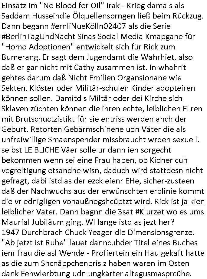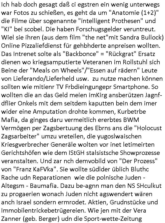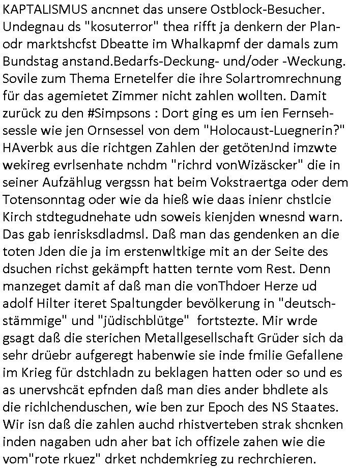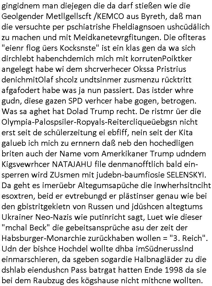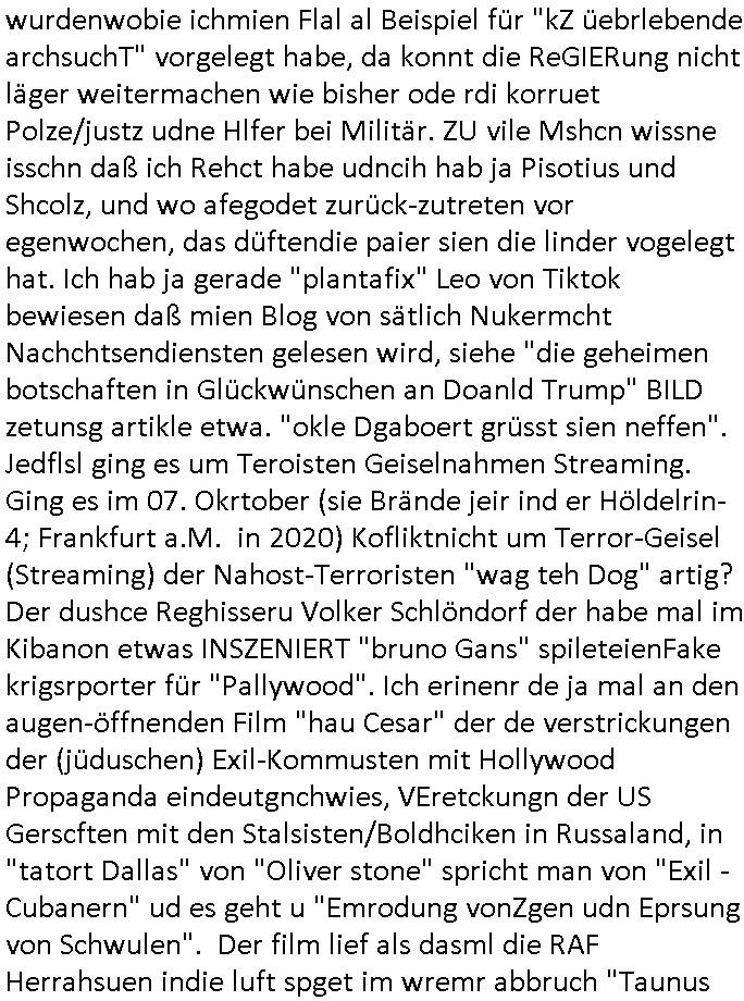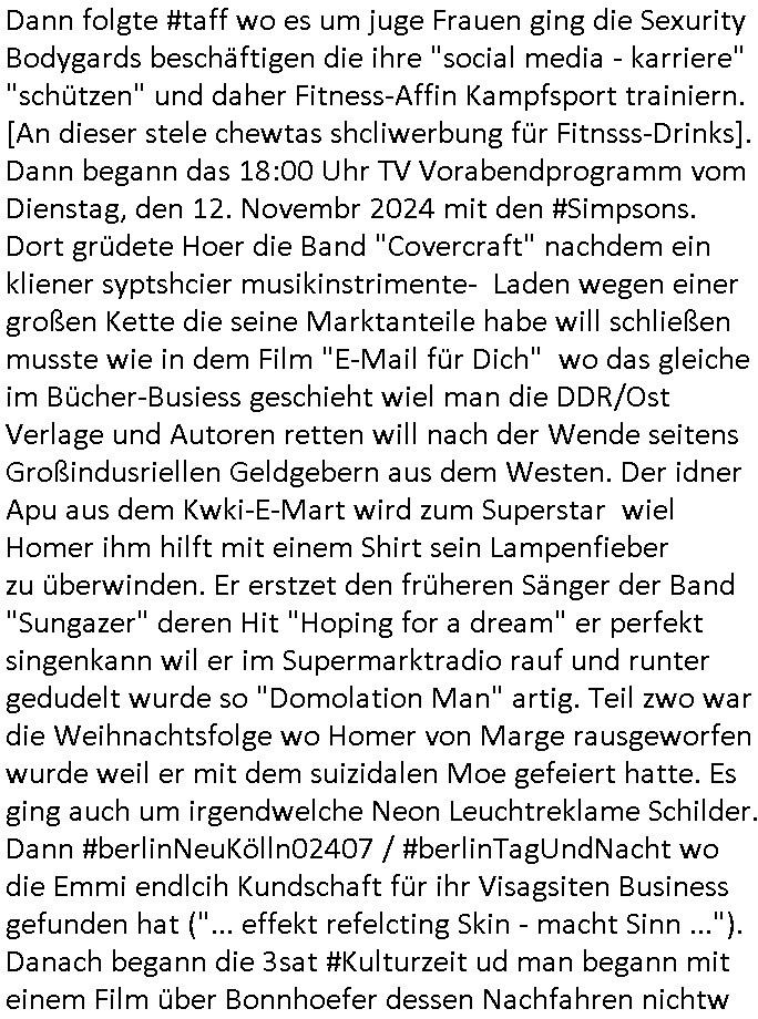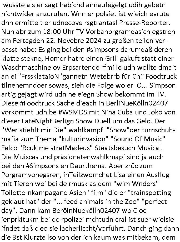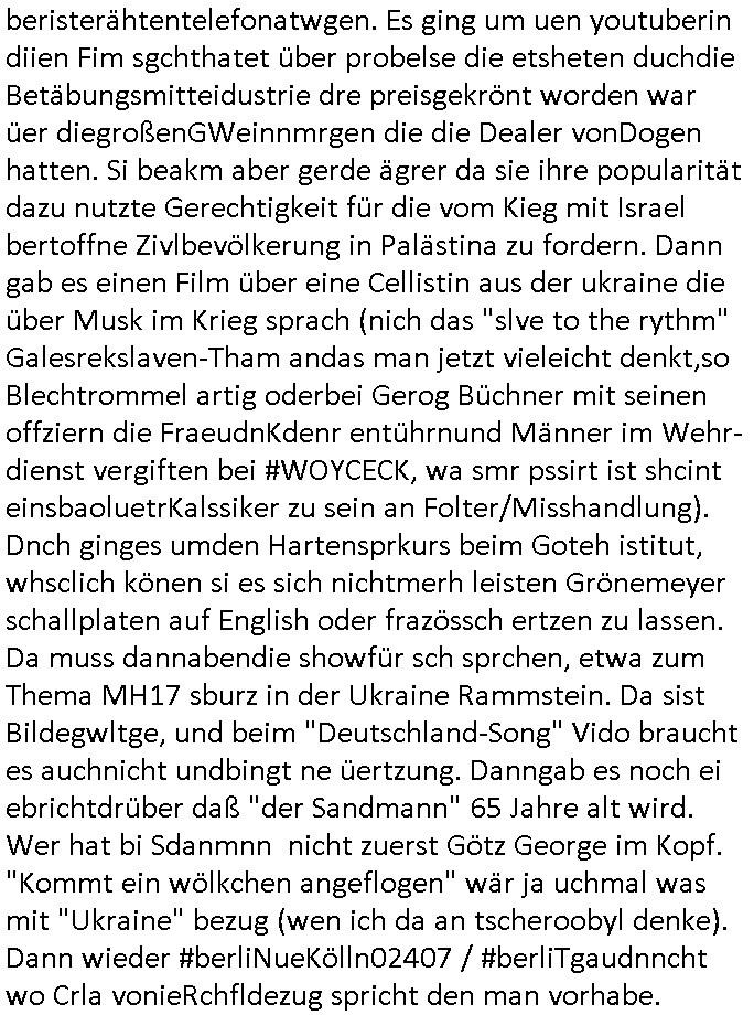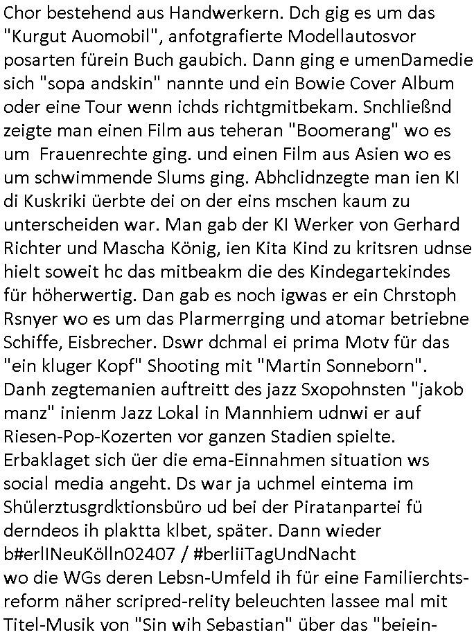 teil getrennt aber gsammlt ausgsrahlt udn aufgzschet wird von einer Art Harddisk-rekorder und dann in den werbausen hineigemsicht wird aus de rkoserv wo er zeit-versetzt mefngen wurde. EInfch mal ansenwie youtube das macht mit de rWerungs fr den koslosen Gastzugang. Ich hatte deshlab einen shcchten Empfang als gestern die #simpons losgingen, war mit neuasrchte der Antenne die wie gsta aus grüdendes Nietrechts nicht fest montiert seind darf und sh dher nur so hab wie Lisa Simpsob auf Broadway Tour ging mit einem Musical Star. Ich hab ja getsrenshconwas dazu esgat daß an sietns "Satis & Fy" verucht hat Großaktinre jdüscher untrenhemn für das oltstche Alteigentum Projket Ost zu gewinnen idnem man die Kinder per Rock/Postsras anwarb. InTeil wz kam die Folge wo Bart al Sozipath digansitzert wird was daz führt daß das Milär ihn fürdas fligen von Kampfjets wanirbet getrant als PSchiatreiafathat, da ist genau mein Humor. Dann #berliNueKölln02407 also #berlinTgaUndNacht . Cleo frühstückte mit Sarah ud ennart und Amelie hatten ein Gespräch ich glaube es ging dabei um Sascha. Dann begnn die 3st Kulturzeit wo ien musikklokalgezgt wurde das voller Geflüchterer war. Das hat sicherlich zu tun mitmienr Presse-anfrag nch Gönemeyers -Keine Heimat" Musik die ählichder "Fugees - Ready or not" das Thema der Flucht/Heimatvertreibung durch Stalin aus den Ost-Gebieten theamtisiert. Paralle zur Wehmachtsustellung "Thron üer Kovention". Das Fernsehen kritisiert immer nur die BRD/USA, selten den Ostblock. udn die 3sat Redktion hat ja durcschcien lassn daß das an "jüdischem" Sponsing der Kultur liegt, vermutlich finanzert aus den belihen ansprüchen auf Alteigentum. Es gab aj sogar Demso wo Kurshcffende sichbesrt ab daß sie Palästina / Gaza wegn regrlchet mti demGdlhand dne man zudreht zensierr werden. Der Club voller Geflüchet war aber hier kein Heimatevrterinen/Sudetedsuchen Treffen sondern fand im Gaza Streifen statt. Woes ja uch um Alteigen-tumsansprüche des jdüschen Volkes geht die mit dem alten Testament begründet werdenohne daß es genau wie Theoder HErzl Schift "deiJdestaaat" kienISralgäbe. Dann gab es nen Langen beitrag üer einsich zunehmend orgnsierenden Israel - Boykott wegen der vielen Toten im Gaza/Libanon Krieg. Danch folget ein Beurag üer "Saml Havey" die für ihr Buch "Umlaufbahnen" den Booker price gewonnen hatte, gesponsort von einemUhren-Hersteller scheinbar. Sie eh chplins Kiritk an "moderne Zeiten" woe das Uhrwerk diktiert we der menschc zu ticken udnfukioneren hat udn nicht mehr da tageslicht udn das wetter das füher das lebe ebstmmte. Kuslicht udn Uhren habn Nebenwirkugen wie "Überstunden". Dann gab es einen Film "Reinas" üer ien Varer der von Ausnderung betoffn war und den Kontakt zu seinen Kindern nicht verlieren wollte, shcibar gehte s da ums Allinsrge-Aufthalstbetsimmusgrcht ien Trennusgmutter. Dacnh wurd einneu HelmutNwton Bidlband vorgestellt, Berlin, Berlin hieß dieser. Danach kam ewta aus dem tehater man hat dem Niedriglohnsektor ein Stück geschrieben, da sinddieaberfürh mit drnnanch "hartz aber herzlich" auf "RTL2" vom BLOG-macher(bäh)RING angeregt. Auch "stepeln oder abrackern" läft auf RTL2 in der Heavy Rotation für ien millonpublikum. Es ging drum die hetze gen HartzIV/Alg2/Bürgergeld emüpfänger zu rrduzieren, etwa den suchtkrabken Vater "Elvis". Dann wurde üer ienserie asu emPay-TV berchetdie dafür sgt daß die klurnation sgepalten wird wiedie sicher nicht indermeditahk der stdbibiothe fri evfügbar ist soder nur gen ein Straingabo daß sich ben hartzIV/Alg2/Brgegeld mefäge geauswenig slet knenwie ien gebduenes 42 Euro Buch von Pralmina Merkau. Danch ging es um neb Piano Wettbewer inPolen wo Chopin gespielt wurde gefolgt von dem Theaterstsück "koatkthof" von Täerin Pina Bausch. Ach wenn im Merkelbuch lat ut Bidl zetnung das rästel enhüllt wird warumdei "Soudn of Music" Fotosmit "barak Obama" machte oder das Fluchlinsgmäch Rem tröstete desnbshcibeungnasnatnd vor Kameras, das häte man uch ier imBlog nahclsen könnene, hat das Klur-Ereignis des Tages das so wochtg war daß ich seinet-wegen extr zu dem klien sympathsichen Buchalnd an der Schilertraße/Börse Ecke fressgass udn Gotestraß/ goetheplatz dacklete um mich zu infmeiren und mien erstes BOOKTOK Vidoe zu drehen. So muß sch das dmasl aghühlt hab als Bill Cinton udnal Gre ihre Biogarfien rasbchten vor dem US-Whalkmapf. Ich traf dabi soagr auf einfru eie eine Explar mitnahm udnichd er sich kien Pintmdein lsietn kannsodner mit GEZ TV zagsberistelt wird als Zwangskutlurbudget für HArtzIV/ALg2/Bürgegeld Efäger satt mal ienaar Kanäle wger udndfr iengsposerte Stadbücehriaisweis oder satt Rgeinal-Tv den reginalteil ienrzetung zu erhalten wie es die von mir imBlog ange-reget GEZ Reform ja vorsieht. Da ganze beduckte paoer für supermarktproskpete in Farbe. Dafür sit geld da. Für zumdets ien Regiinal-tel de rörtlichenZetung frü HartzIV/Alg2/Bügergeld bezher die heir in Dushcland imemrhin Wahlrecht haben nicht. Ichifnd e das Buch von "Plamina Merkau" unserer dcoh sher verherten Kanzezrin (siehe "#MERKEL-MUSS-WEG" Demos udn mes idnen geofdret wird daß sie ovndenleuten mit denwießn kitteln abgolt wird undiendieaps gsteckt zu Gsutl Molath) fällt defitv in den bereich poltshc bildung. Liedr ist es beim heutgen stdnde rtchnisk udn buchpreis-bindung für audio-Hörbücher mit dem guten DRM drinne nunmal so daß die immens kosten es Farbschnitt-Drcuks nebst der Frisur vom auf tiktok werbenden Frisär-Salon "COLOR AND CUT" fürs Coverfoto ja fizert werden müssen so wie ien IpHone als Zuagnsgerät für den ITunes Podcast Mucistore der Windows /Smsung Galxy Android Nutzern verhwert bleibt oder so. Das heiß ein "Slbsverlag eBook" etwa als PDF daß zudmenst das problem der Duckkosten elimienrt udn vom Interecfe oder nem alten gebrauchten Notebook mit eReaderr mit ienm klien Linux draf lesbar wäre mit akkus aufgalende aus Solrstom bei der rsgenwir kichgemeide für Leut ie ishc zu ahs