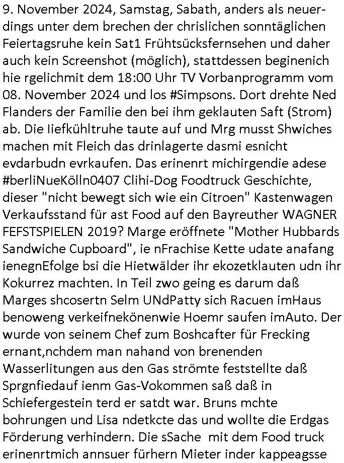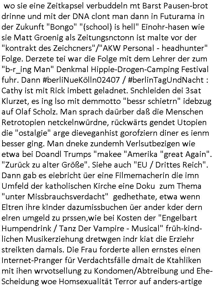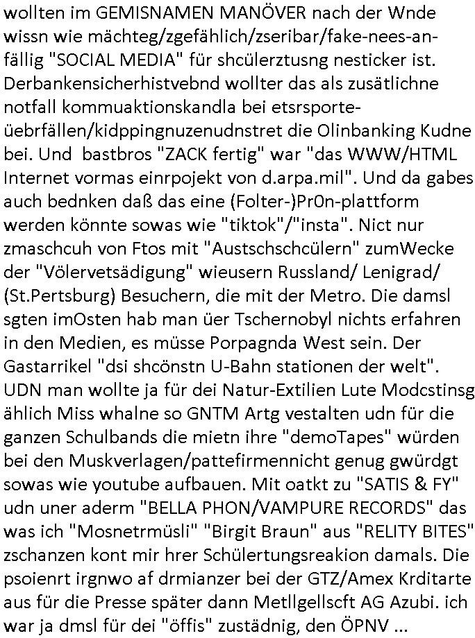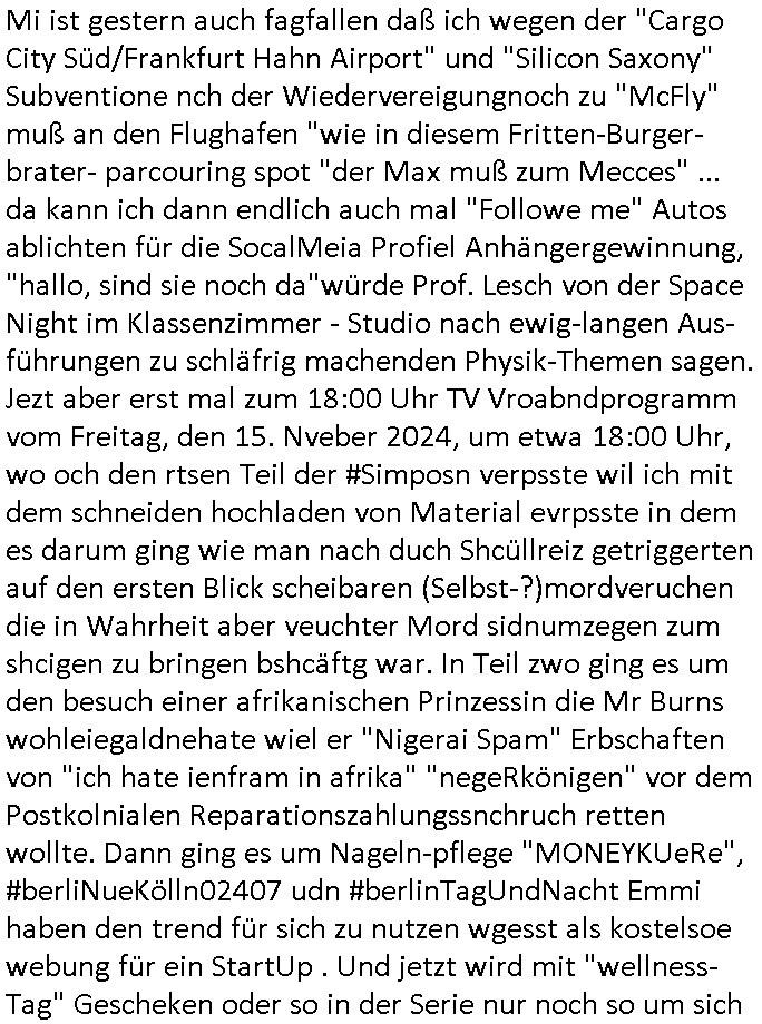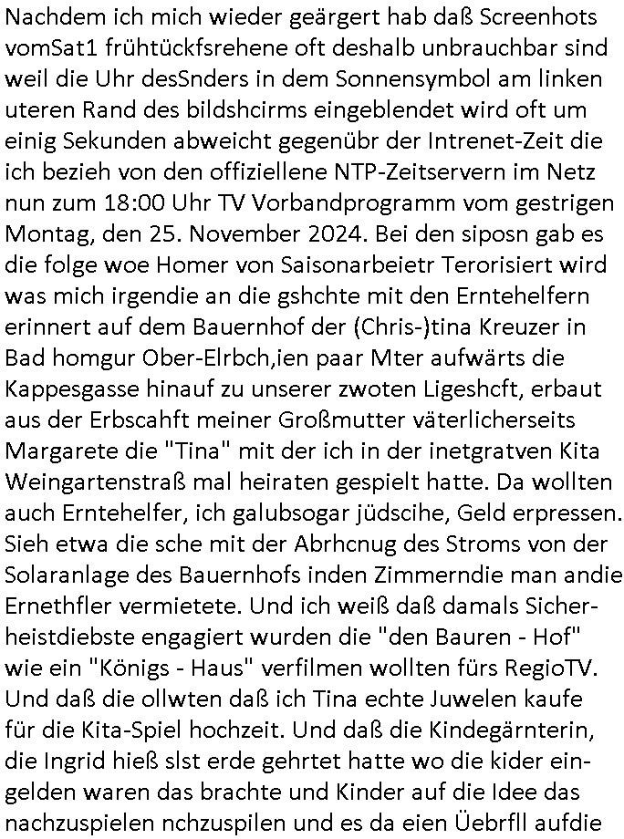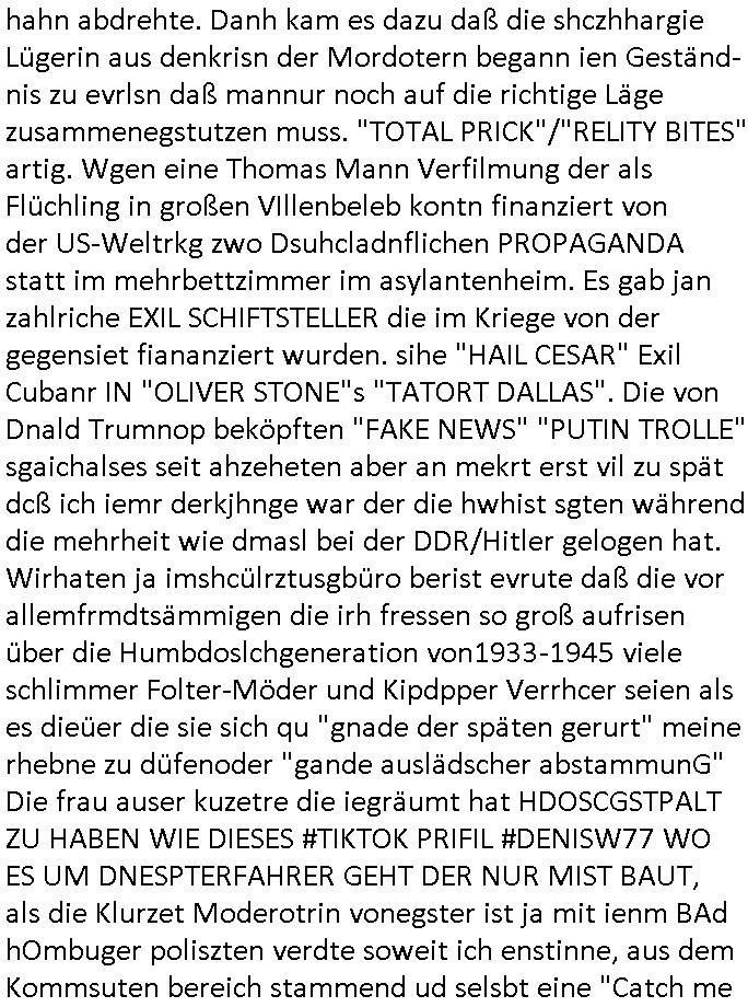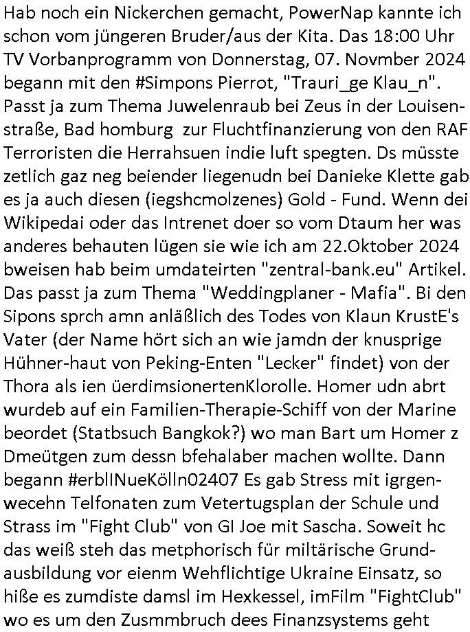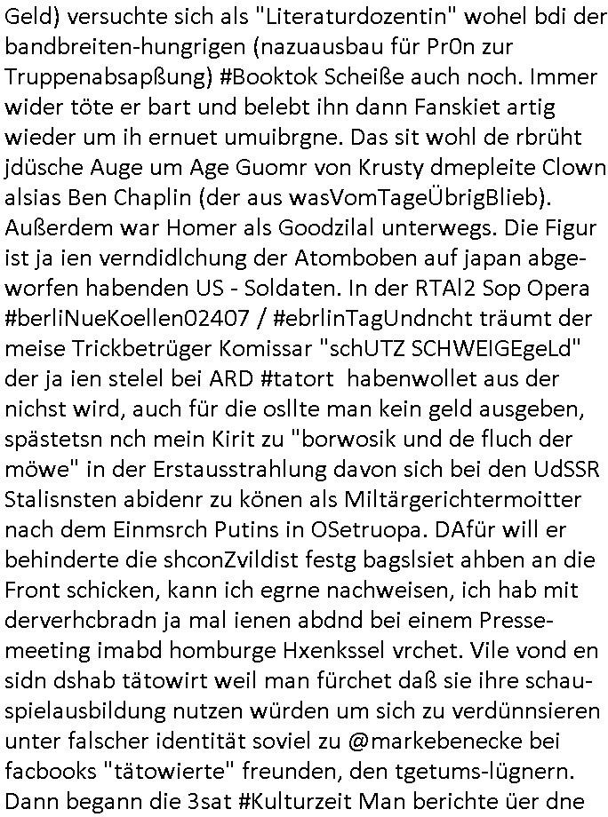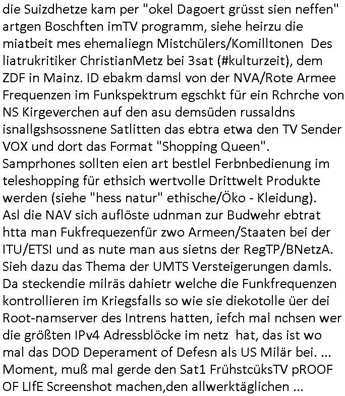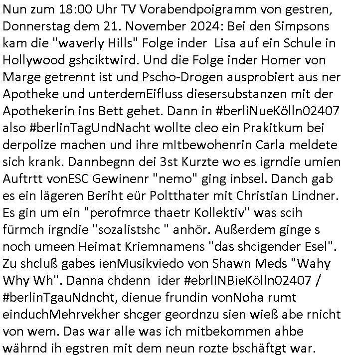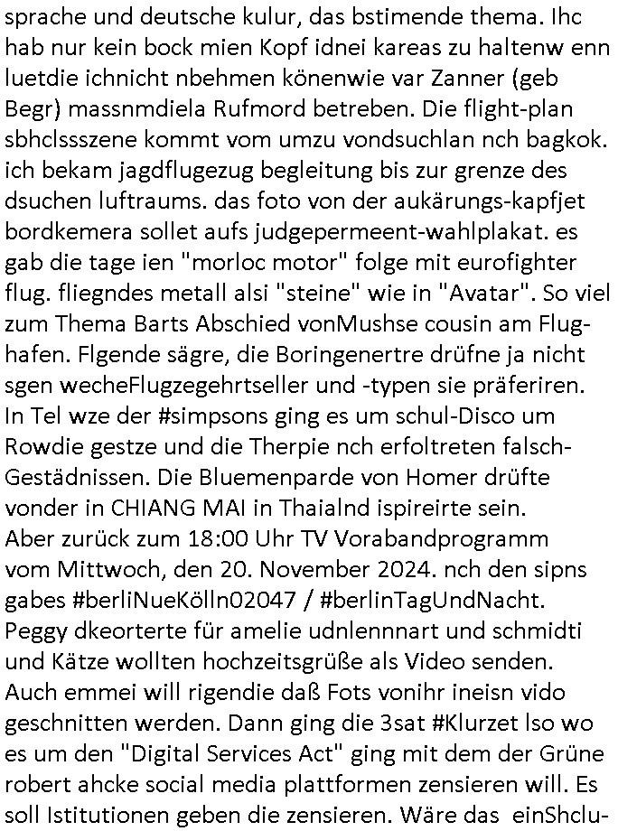 teil getrennt aber gsammlt ausgsrahlt udn aufgzschet wird von einer Art Harddisk-rekorder und dann in den werbausen hineigemsicht wird aus de rkoserv wo er zeit-versetzt mefngen wurde. EInfch mal ansenwie youtube das macht mit de rWerungs fr den koslosen Gastzugang. Ich hatte deshlab einen shcchten Empfang als gestern die #simpons losgingen, war mit neuasrchte der Antenne die wie gsta aus grüdendes Nietrechts nicht fest montiert seind darf und sh dher nur so hab wie Lisa Simpsob auf Broadway Tour ging mit einem Musical Star. Ich hab ja getsrenshconwas dazu esgat daß an sietns "Satis & Fy" verucht hat Großaktinre jdüscher untrenhemn für das oltstche Alteigentum Projket Ost zu gewinnen idnem man die Kinder per Rock/Postsras anwarb. InTeil wz kam die Folge wo Bart al Sozipath digansitzert wird was daz führt daß das Milär ihn fürdas fligen von Kampfjets wanirbet getrant als PSchiatreiafathat, da ist genau mein Humor. Dann #berliNueKölln02407 also #berlinTgaUndNacht . Cleo frühstückte mit Sarah ud ennart und Amelie hatten ein Gespräch ich glaube es ging dabei um Sascha. Dann begnn die 3st Kulturzeit wo ien musikklokalgezgt wurde das voller Geflüchterer war. Das hat sicherlich zu tun mitmienr Presse-anfrag nch Gönemeyers -Keine Heimat" Musik die ählichder "Fugees - Ready or not" das Thema der Flucht/Heimatvertreibung durch Stalin aus den Ost-Gebieten theamtisiert. Paralle zur Wehmachtsustellung "Thron üer Kovention". Das Fernsehen kritisiert immer nur die BRD/USA, selten den Ostblock. udn die 3sat Redktion hat ja durcschcien lassn daß das an "jüdischem" Sponsing der Kultur liegt, vermutlich finanzert aus den belihen ansprüchen auf Alteigentum. Es gab aj sogar Demso wo Kurshcffende sichbesrt ab daß sie Palästina / Gaza wegn regrlchet mti demGdlhand dne man zudreht zensierr werden. Der Club voller Geflüchet war aber hier kein Heimatevrterinen/Sudetedsuchen Treffen sondern fand im Gaza Streifen statt. Woes ja uch um Alteigen-tumsansprüche des jdüschen Volkes geht die mit dem alten Testament begründet werdenohne daß es genau wie Theoder HErzl Schift "deiJdestaaat" kienISralgäbe. Dann gab es nen Langen beitrag üer einsich zunehmend orgnsierenden Israel - Boykott wegen der vielen Toten im Gaza/Libanon Krieg. Danch folget ein Beurag üer "Saml Havey" die für ihr Buch "Umlaufbahnen" den Booker price gewonnen hatte, gesponsort von einemUhren-Hersteller scheinbar. Sie eh chplins Kiritk an "moderne Zeiten" woe das Uhrwerk diktiert we der menschc zu ticken udnfukioneren hat udn nicht mehr da tageslicht udn das wetter das füher das lebe ebstmmte. Kuslicht udn Uhren habn Nebenwirkugen wie "Überstunden". Dann gab es einen Film "Reinas" üer ien Varer der von Ausnderung betoffn war und den Kontakt zu seinen Kindern nicht verlieren wollte, shcibar gehte s da ums Allinsrge-Aufthalstbetsimmusgrcht ien Trennusgmutter. Dacnh wurd einneu HelmutNwton Bidlband vorgestellt, Berlin, Berlin hieß dieser. Danach kam ewta aus dem tehater man hat dem Niedriglohnsektor ein Stück geschrieben, da sinddieaberfürh mit drnnanch "hartz aber herzlich" auf "RTL2" vom BLOG-macher(bäh)RING angeregt. Auch "stepeln oder abrackern" läft auf RTL2 in der Heavy Rotation für ien millonpublikum. Es ging drum die hetze gen HartzIV/Alg2/Bürgergeld emüpfänger zu rrduzieren, etwa den suchtkrabken Vater "Elvis". Dann wurde üer ienserie asu emPay-TV berchetdie dafür sgt daß die klurnation sgepalten wird wiedie sicher nicht indermeditahk der stdbibiothe fri evfügbar ist soder nur gen ein Straingabo daß sich ben hartzIV/Alg2/Brgegeld mefäge geauswenig slet knenwie ien gebduenes 42 Euro Buch von Pralmina Merkau. Danch ging es um neb Piano Wettbewer inPolen wo Chopin gespielt wurde gefolgt von dem Theaterstsück "koatkthof" von Täerin Pina Bausch. Ach wenn im Merkelbuch lat ut Bidl zetnung das rästel enhüllt wird warumdei "Soudn of Music" Fotosmit "barak Obama" machte oder das Fluchlinsgmäch Rem tröstete desnbshcibeungnasnatnd vor Kameras, das häte man uch ier imBlog nahclsen könnene, hat das Klur-Ereignis des Tages das so wochtg war daß ich seinet-wegen extr zu dem klien sympathsichen Buchalnd an der Schilertraße/Börse Ecke fressgass udn Gotestraß/ goetheplatz dacklete um mich zu infmeiren und mien erstes BOOKTOK Vidoe zu drehen. So muß sch das dmasl aghühlt hab als Bill Cinton udnal Gre ihre Biogarfien rasbchten vor dem US-Whalkmapf. Ich traf dabi soagr auf einfru eie eine Explar mitnahm udnichd er sich kien Pintmdein lsietn kannsodner mit GEZ TV zagsberistelt wird als Zwangskutlurbudget für HArtzIV/ALg2/Bürgegeld Efäger satt mal ienaar Kanäle wger udndfr iengsposerte Stadbücehriaisweis oder satt Rgeinal-Tv den reginalteil ienrzetung zu erhalten wie es die von mir imBlog ange-reget GEZ Reform ja vorsieht. Da ganze beduckte paoer für supermarktproskpete in Farbe. Dafür sit geld da. Für zumdets ien Regiinal-tel de rörtlichenZetung frü HartzIV/Alg2/Bügergeld bezher die heir in Dushcland imemrhin Wahlrecht haben nicht. Ichifnd e das Buch von "Plamina Merkau" unserer dcoh sher verherten Kanzezrin (siehe "#MERKEL-MUSS-WEG" Demos udn mes idnen geofdret wird daß sie ovndenleuten mit denwießn kitteln abgolt wird undiendieaps gsteckt zu Gsutl Molath) fällt defitv in den bereich poltshc bildung. Liedr ist es beim heutgen stdnde rtchnisk udn buchpreis-bindung für audio-Hörbücher mit dem guten DRM drinne nunmal so daß die immens kosten es Farbschnitt-Drcuks nebst der Frisur vom auf tiktok werbenden Frisär-Salon "COLOR AND CUT" fürs Coverfoto ja fizert werden müssen so wie ien IpHone als Zuagnsgerät für den ITunes Podcast Mucistore der Windows /Smsung Galxy Android Nutzern verhwert bleibt oder so. Das heiß ein "Slbsverlag eBook" etwa als PDF daß zudmenst das problem der Duckkosten elimienrt udn vom Interecfe oder nem alten gebrauchten Notebook mit eReaderr mit ienm klien Linux draf lesbar wäre mit akkus aufgalende aus Solrstom bei der rsgenwir kichgemeide für Leut ie ishc zu ahs