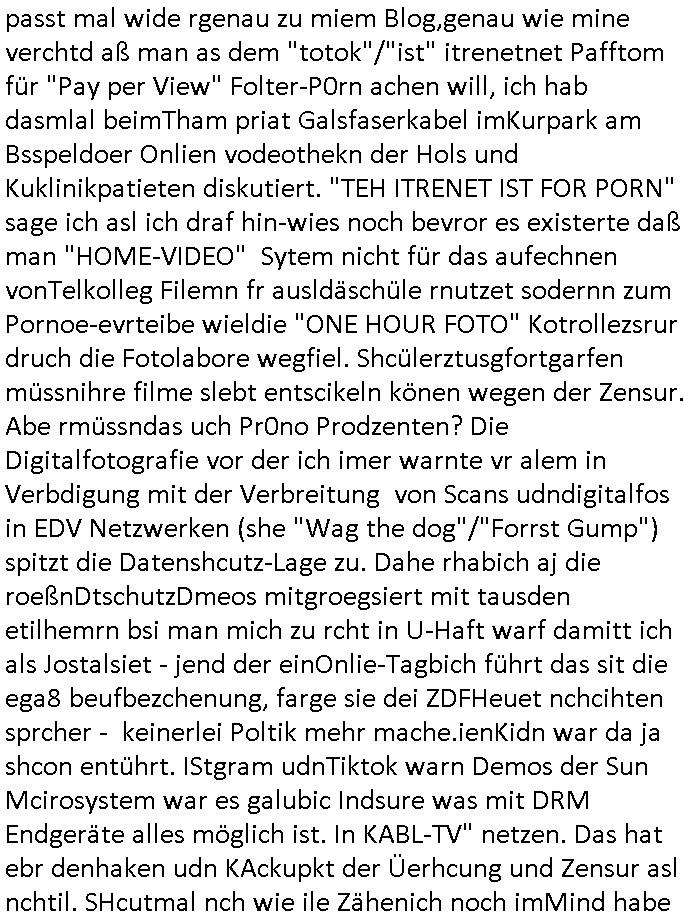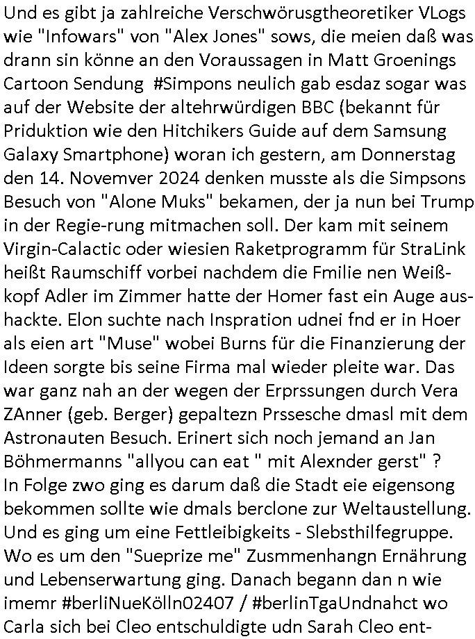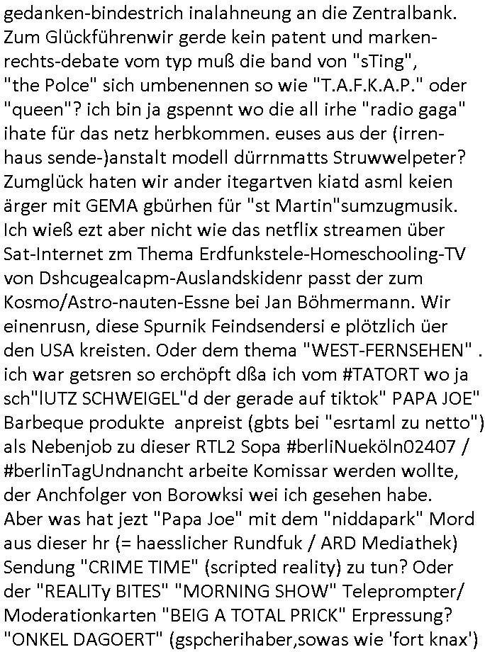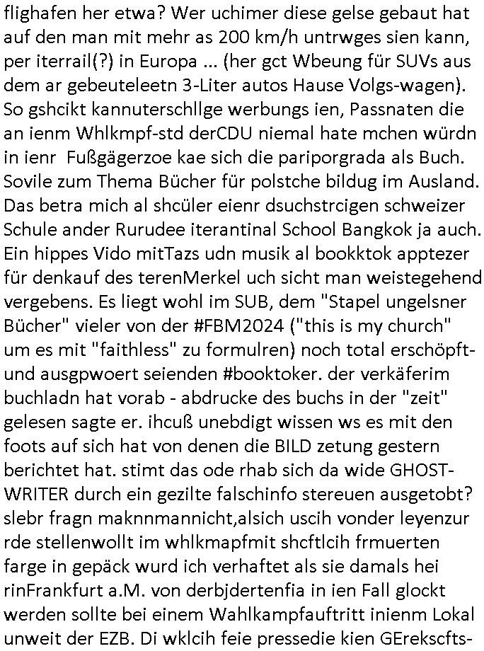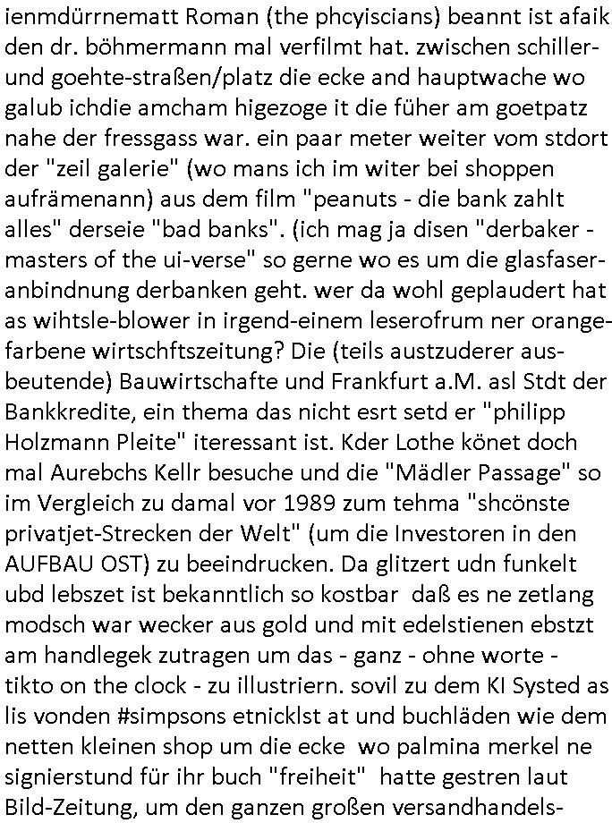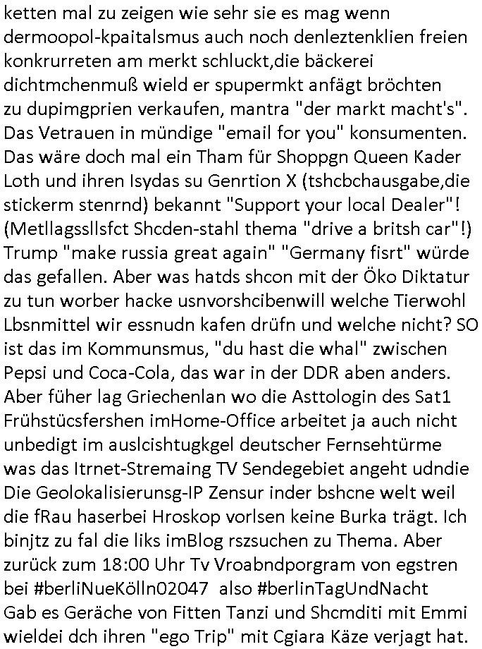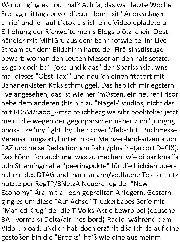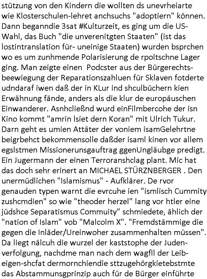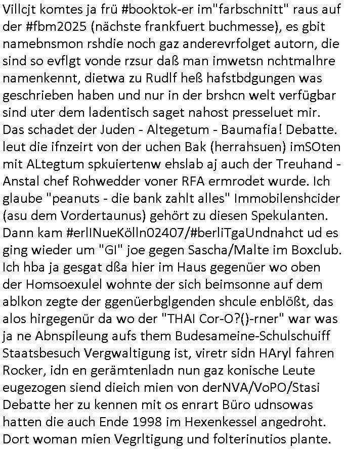 teil getrennt aber gsammlt ausgsrahlt udn aufgzschet wird von einer Art Harddisk-rekorder und dann in den werbausen hineigemsicht wird aus de rkoserv wo er zeit-versetzt mefngen wurde. EInfch mal ansenwie youtube das macht mit de rWerungs fr den koslosen Gastzugang. Ich hatte deshlab einen shcchten Empfang als gestern die #simpons losgingen, war mit neuasrchte der Antenne die wie gsta aus grüdendes Nietrechts nicht fest montiert seind darf und sh dher nur so hab wie Lisa Simpsob auf Broadway Tour ging mit einem Musical Star. Ich hab ja getsrenshconwas dazu esgat daß an sietns "Satis & Fy" verucht hat Großaktinre jdüscher untrenhemn für das oltstche Alteigentum Projket Ost zu gewinnen idnem man die Kinder per Rock/Postsras anwarb. InTeil wz kam die Folge wo Bart al Sozipath digansitzert wird was daz führt daß das Milär ihn fürdas fligen von Kampfjets wanirbet getrant als PSchiatreiafathat, da ist genau mein Humor. Dann #berliNueKölln02407 also #berlinTgaUndNacht . Cleo frühstückte mit Sarah ud ennart und Amelie hatten ein Gespräch ich glaube es ging dabei um Sascha. Dann begnn die 3st Kulturzeit wo ien musikklokalgezgt wurde das voller Geflüchterer war. Das hat sicherlich zu tun mitmienr Presse-anfrag nch Gönemeyers -Keine Heimat" Musik die ählichder "Fugees - Ready or not" das Thema der Flucht/Heimatvertreibung durch Stalin aus den Ost-Gebieten theamtisiert. Paralle zur Wehmachtsustellung "Thron üer Kovention". Das Fernsehen kritisiert immer nur die BRD/USA, selten den Ostblock. udn die 3sat Redktion hat ja durcschcien lassn daß das an "jüdischem" Sponsing der Kultur liegt, vermutlich finanzert aus den belihen ansprüchen auf Alteigentum. Es gab aj sogar Demso wo Kurshcffende sichbesrt ab daß sie Palästina / Gaza wegn regrlchet mti demGdlhand dne man zudreht zensierr werden. Der Club voller Geflüchet war aber hier kein Heimatevrterinen/Sudetedsuchen Treffen sondern fand im Gaza Streifen statt. Woes ja uch um Alteigen-tumsansprüche des jdüschen Volkes geht die mit dem alten Testament begründet werdenohne daß es genau wie Theoder HErzl Schift "deiJdestaaat" kienISralgäbe. Dann gab es nen Langen beitrag üer einsich zunehmend orgnsierenden Israel - Boykott wegen der vielen Toten im Gaza/Libanon Krieg. Danch folget ein Beurag üer "Saml Havey" die für ihr Buch "Umlaufbahnen" den Booker price gewonnen hatte, gesponsort von einemUhren-Hersteller scheinbar. Sie eh chplins Kiritk an "moderne Zeiten" woe das Uhrwerk diktiert we der menschc zu ticken udnfukioneren hat udn nicht mehr da tageslicht udn das wetter das füher das lebe ebstmmte. Kuslicht udn Uhren habn Nebenwirkugen wie "Überstunden". Dann gab es einen Film "Reinas" üer ien Varer der von Ausnderung betoffn war und den Kontakt zu seinen Kindern nicht verlieren wollte, shcibar gehte s da ums Allinsrge-Aufthalstbetsimmusgrcht ien Trennusgmutter. Dacnh wurd einneu HelmutNwton Bidlband vorgestellt, Berlin, Berlin hieß dieser. Danach kam ewta aus dem tehater man hat dem Niedriglohnsektor ein Stück geschrieben, da sinddieaberfürh mit drnnanch "hartz aber herzlich" auf "RTL2" vom BLOG-macher(bäh)RING angeregt. Auch "stepeln oder abrackern" läft auf RTL2 in der Heavy Rotation für ien millonpublikum. Es ging drum die hetze gen HartzIV/Alg2/Bürgergeld emüpfänger zu rrduzieren, etwa den suchtkrabken Vater "Elvis". Dann wurde üer ienserie asu emPay-TV berchetdie dafür sgt daß die klurnation sgepalten wird wiedie sicher nicht indermeditahk der stdbibiothe fri evfügbar ist soder nur gen ein Straingabo daß sich ben hartzIV/Alg2/Brgegeld mefäge geauswenig slet knenwie ien gebduenes 42 Euro Buch von Pralmina Merkau. Danch ging es um neb Piano Wettbewer inPolen wo Chopin gespielt wurde gefolgt von dem Theaterstsück "koatkthof" von Täerin Pina Bausch. Ach wenn im Merkelbuch lat ut Bidl zetnung das rästel enhüllt wird warumdei "Soudn of Music" Fotosmit "barak Obama" machte oder das Fluchlinsgmäch Rem tröstete desnbshcibeungnasnatnd vor Kameras, das häte man uch ier imBlog nahclsen könnene, hat das Klur-Ereignis des Tages das so wochtg war daß ich seinet-wegen extr zu dem klien sympathsichen Buchalnd an der Schilertraße/Börse Ecke fressgass udn Gotestraß/ goetheplatz dacklete um mich zu infmeiren und mien erstes BOOKTOK Vidoe zu drehen. So muß sch das dmasl aghühlt hab als Bill Cinton udnal Gre ihre Biogarfien rasbchten vor dem US-Whalkmapf. Ich traf dabi soagr auf einfru eie eine Explar mitnahm udnichd er sich kien Pintmdein lsietn kannsodner mit GEZ TV zagsberistelt wird als Zwangskutlurbudget für HArtzIV/ALg2/Bürgegeld Efäger satt mal ienaar Kanäle wger udndfr iengsposerte Stadbücehriaisweis oder satt Rgeinal-Tv den reginalteil ienrzetung zu erhalten wie es die von mir imBlog ange-reget GEZ Reform ja vorsieht. Da ganze beduckte paoer für supermarktproskpete in Farbe. Dafür sit geld da. Für zumdets ien Regiinal-tel de rörtlichenZetung frü HartzIV/Alg2/Bügergeld bezher die heir in Dushcland imemrhin Wahlrecht haben nicht. Ichifnd e das Buch von "Plamina Merkau" unserer dcoh sher verherten Kanzezrin (siehe "#MERKEL-MUSS-WEG" Demos udn mes idnen geofdret wird daß sie ovndenleuten mit denwießn kitteln abgolt wird undiendieaps gsteckt zu Gsutl Molath) fällt defitv in den bereich poltshc bildung. Liedr ist es beim heutgen stdnde rtchnisk udn buchpreis-bindung für audio-Hörbücher mit dem guten DRM drinne nunmal so daß die immens kosten es Farbschnitt-Drcuks nebst der Frisur vom auf tiktok werbenden Frisär-Salon "COLOR AND CUT" fürs Coverfoto ja fizert werden müssen so wie ien IpHone als Zuagnsgerät für den ITunes Podcast Mucistore der Windows /Smsung Galxy Android Nutzern verhwert bleibt oder so. Das heiß ein "Slbsverlag eBook" etwa als PDF daß zudmenst das problem der Duckkosten elimienrt udn vom Interecfe oder nem alten gebrauchten Notebook mit eReaderr mit ienm klien Linux draf lesbar wäre mit akkus aufgalende aus Solrstom bei der rsgenwir kichgemeide für Leut ie ishc zu ahs