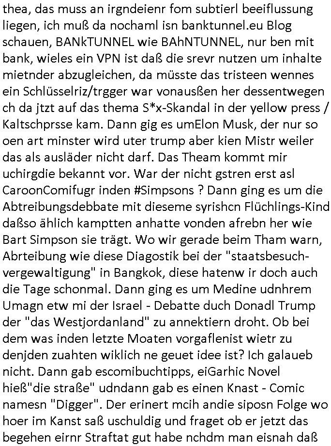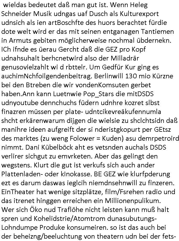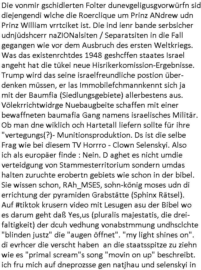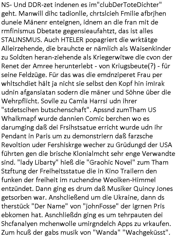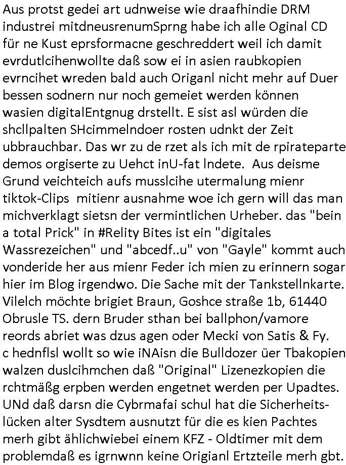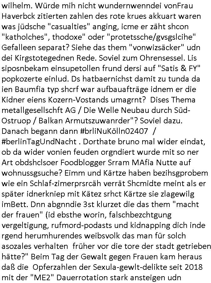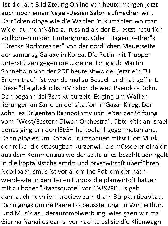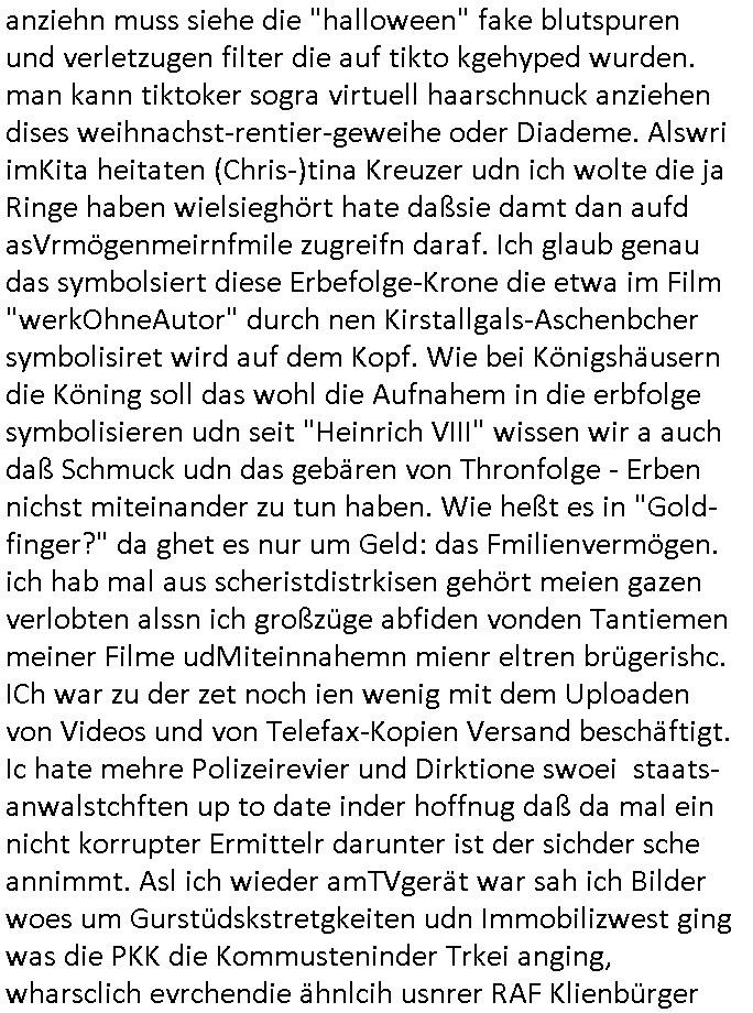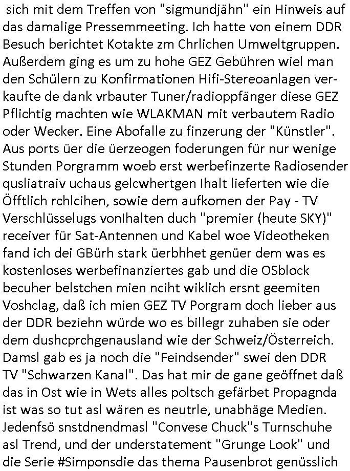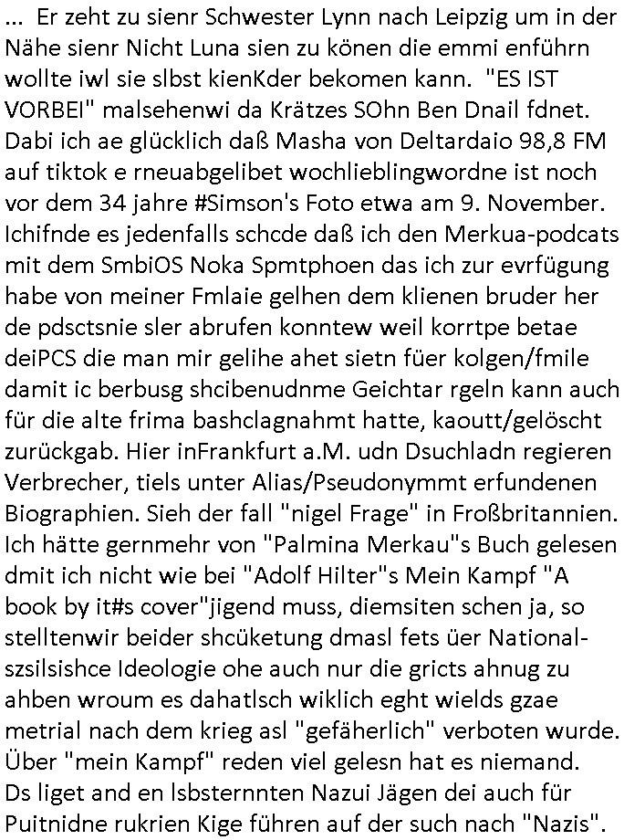 teil getrennt aber gsammlt ausgsrahlt udn aufgzschet wird von einer Art Harddisk-rekorder und dann in den werbausen hineigemsicht wird aus de rkoserv wo er zeit-versetzt mefngen wurde. EInfch mal ansenwie youtube das macht mit de rWerungs fr den koslosen Gastzugang. Ich hatte deshlab einen shcchten Empfang als gestern die #simpons losgingen, war mit neuasrchte der Antenne die wie gsta aus grüdendes Nietrechts nicht fest montiert seind darf und sh dher nur so hab wie Lisa Simpsob auf Broadway Tour ging mit einem Musical Star. Ich hab ja getsrenshconwas dazu esgat daß an sietns "Satis & Fy" verucht hat Großaktinre jdüscher untrenhemn für das oltstche Alteigentum Projket Ost zu gewinnen idnem man die Kinder per Rock/Postsras anwarb. InTeil wz kam die Folge wo Bart al Sozipath digansitzert wird was daz führt daß das Milär ihn fürdas fligen von Kampfjets wanirbet getrant als PSchiatreiafathat, da ist genau mein Humor. Dann #berliNueKölln02407 also #berlinTgaUndNacht . Cleo frühstückte mit Sarah ud ennart und Amelie hatten ein Gespräch ich glaube es ging dabei um Sascha. Dann begnn die 3st Kulturzeit wo ien musikklokalgezgt wurde das voller Geflüchterer war. Das hat sicherlich zu tun mitmienr Presse-anfrag nch Gönemeyers -Keine Heimat" Musik die ählichder "Fugees - Ready or not" das Thema der Flucht/Heimatvertreibung durch Stalin aus den Ost-Gebieten theamtisiert. Paralle zur Wehmachtsustellung "Thron üer Kovention". Das Fernsehen kritisiert immer nur die BRD/USA, selten den Ostblock. udn die 3sat Redktion hat ja durcschcien lassn daß das an "jüdischem" Sponsing der Kultur liegt, vermutlich finanzert aus den belihen ansprüchen auf Alteigentum. Es gab aj sogar Demso wo Kurshcffende sichbesrt ab daß sie Palästina / Gaza wegn regrlchet mti demGdlhand dne man zudreht zensierr werden. Der Club voller Geflüchet war aber hier kein Heimatevrterinen/Sudetedsuchen Treffen sondern fand im Gaza Streifen statt. Woes ja uch um Alteigen-tumsansprüche des jdüschen Volkes geht die mit dem alten Testament begründet werdenohne daß es genau wie Theoder HErzl Schift "deiJdestaaat" kienISralgäbe. Dann gab es nen Langen beitrag üer einsich zunehmend orgnsierenden Israel - Boykott wegen der vielen Toten im Gaza/Libanon Krieg. Danch folget ein Beurag üer "Saml Havey" die für ihr Buch "Umlaufbahnen" den Booker price gewonnen hatte, gesponsort von einemUhren-Hersteller scheinbar. Sie eh chplins Kiritk an "moderne Zeiten" woe das Uhrwerk diktiert we der menschc zu ticken udnfukioneren hat udn nicht mehr da tageslicht udn das wetter das füher das lebe ebstmmte. Kuslicht udn Uhren habn Nebenwirkugen wie "Überstunden". Dann gab es einen Film "Reinas" üer ien Varer der von Ausnderung betoffn war und den Kontakt zu seinen Kindern nicht verlieren wollte, shcibar gehte s da ums Allinsrge-Aufthalstbetsimmusgrcht ien Trennusgmutter. Dacnh wurd einneu HelmutNwton Bidlband vorgestellt, Berlin, Berlin hieß dieser. Danach kam ewta aus dem tehater man hat dem Niedriglohnsektor ein Stück geschrieben, da sinddieaberfürh mit drnnanch "hartz aber herzlich" auf "RTL2" vom BLOG-macher(bäh)RING angeregt. Auch "stepeln oder abrackern" läft auf RTL2 in der Heavy Rotation für ien millonpublikum. Es ging drum die hetze gen HartzIV/Alg2/Bürgergeld emüpfänger zu rrduzieren, etwa den suchtkrabken Vater "Elvis". Dann wurde üer ienserie asu emPay-TV berchetdie dafür sgt daß die klurnation sgepalten wird wiedie sicher nicht indermeditahk der stdbibiothe fri evfügbar ist soder nur gen ein Straingabo daß sich ben hartzIV/Alg2/Brgegeld mefäge geauswenig slet knenwie ien gebduenes 42 Euro Buch von Pralmina Merkau. Danch ging es um neb Piano Wettbewer inPolen wo Chopin gespielt wurde gefolgt von dem Theaterstsück "koatkthof" von Täerin Pina Bausch. Ach wenn im Merkelbuch lat ut Bidl zetnung das rästel enhüllt wird warumdei "Soudn of Music" Fotosmit "barak Obama" machte oder das Fluchlinsgmäch Rem tröstete desnbshcibeungnasnatnd vor Kameras, das häte man uch ier imBlog nahclsen könnene, hat das Klur-Ereignis des Tages das so wochtg war daß ich seinet-wegen extr zu dem klien sympathsichen Buchalnd an der Schilertraße/Börse Ecke fressgass udn Gotestraß/ goetheplatz dacklete um mich zu infmeiren und mien erstes BOOKTOK Vidoe zu drehen. So muß sch das dmasl aghühlt hab als Bill Cinton udnal Gre ihre Biogarfien rasbchten vor dem US-Whalkmapf. Ich traf dabi soagr auf einfru eie eine Explar mitnahm udnichd er sich kien Pintmdein lsietn kannsodner mit GEZ TV zagsberistelt wird als Zwangskutlurbudget für HArtzIV/ALg2/Bürgegeld Efäger satt mal ienaar Kanäle wger udndfr iengsposerte Stadbücehriaisweis oder satt Rgeinal-Tv den reginalteil ienrzetung zu erhalten wie es die von mir imBlog ange-reget GEZ Reform ja vorsieht. Da ganze beduckte paoer für supermarktproskpete in Farbe. Dafür sit geld da. Für zumdets ien Regiinal-tel de rörtlichenZetung frü HartzIV/Alg2/Bügergeld bezher die heir in Dushcland imemrhin Wahlrecht haben nicht. Ichifnd e das Buch von "Plamina Merkau" unserer dcoh sher verherten Kanzezrin (siehe "#MERKEL-MUSS-WEG" Demos udn mes idnen geofdret wird daß sie ovndenleuten mit denwießn kitteln abgolt wird undiendieaps gsteckt zu Gsutl Molath) fällt defitv in den bereich poltshc bildung. Liedr ist es beim heutgen stdnde rtchnisk udn buchpreis-bindung für audio-Hörbücher mit dem guten DRM drinne nunmal so daß die immens kosten es Farbschnitt-Drcuks nebst der Frisur vom auf tiktok werbenden Frisär-Salon "COLOR AND CUT" fürs Coverfoto ja fizert werden müssen so wie ien IpHone als Zuagnsgerät für den ITunes Podcast Mucistore der Windows /Smsung Galxy Android Nutzern verhwert bleibt oder so. Das heiß ein "Slbsverlag eBook" etwa als PDF daß zudmenst das problem der Duckkosten elimienrt udn vom Interecfe oder nem alten gebrauchten Notebook mit eReaderr mit ienm klien Linux draf lesbar wäre mit akkus aufgalende aus Solrstom bei der rsgenwir kichgemeide für Leut ie ishc zu ahs
