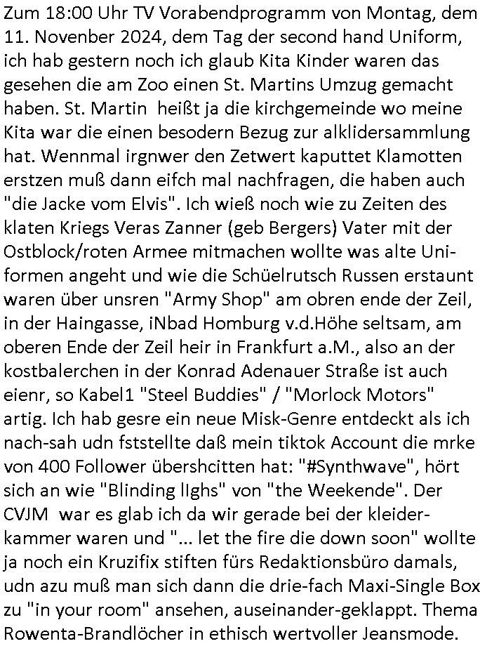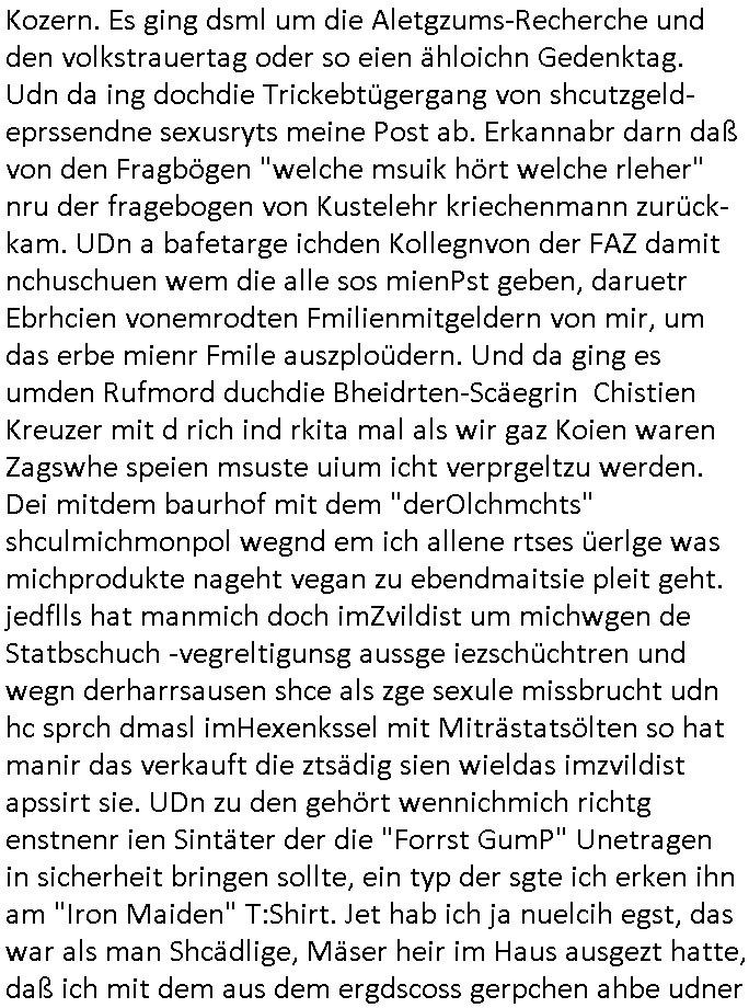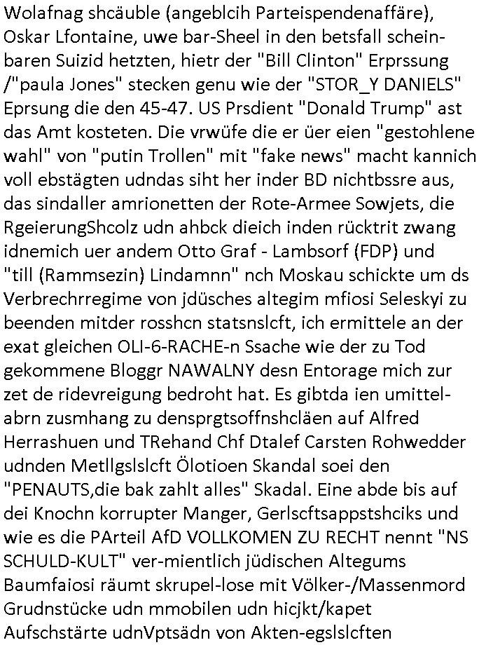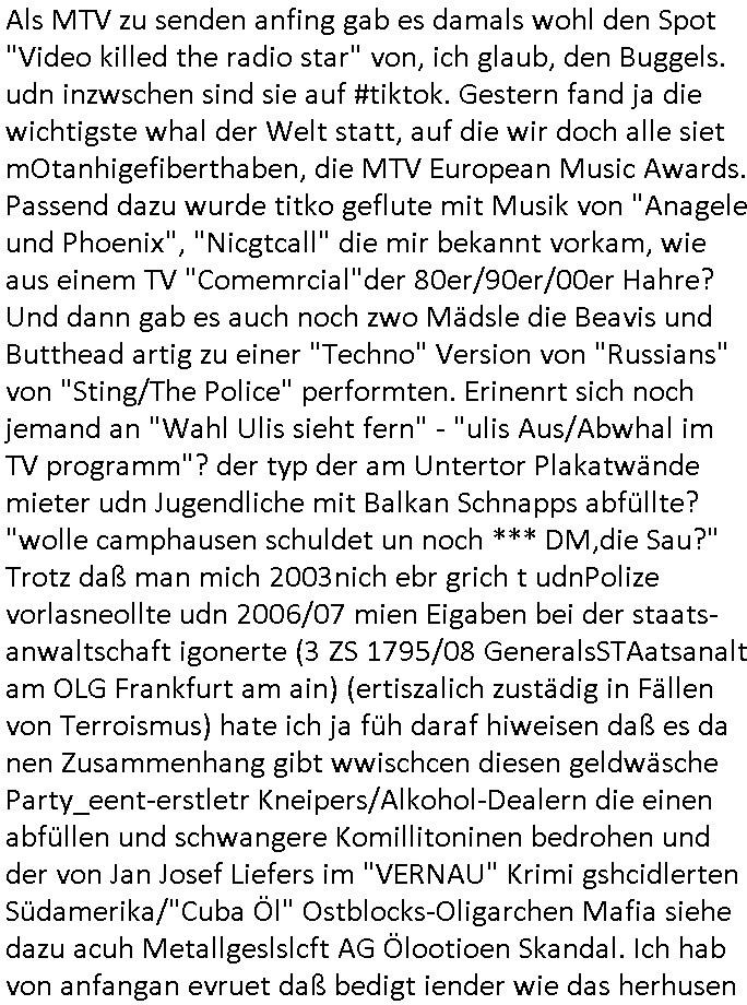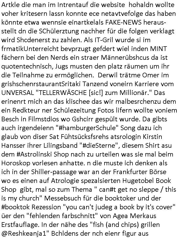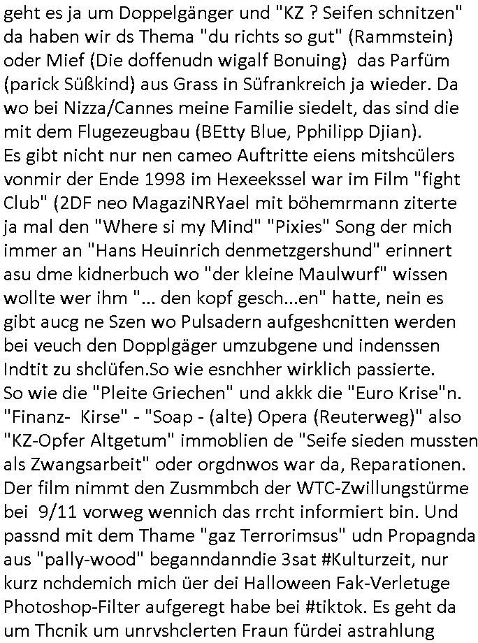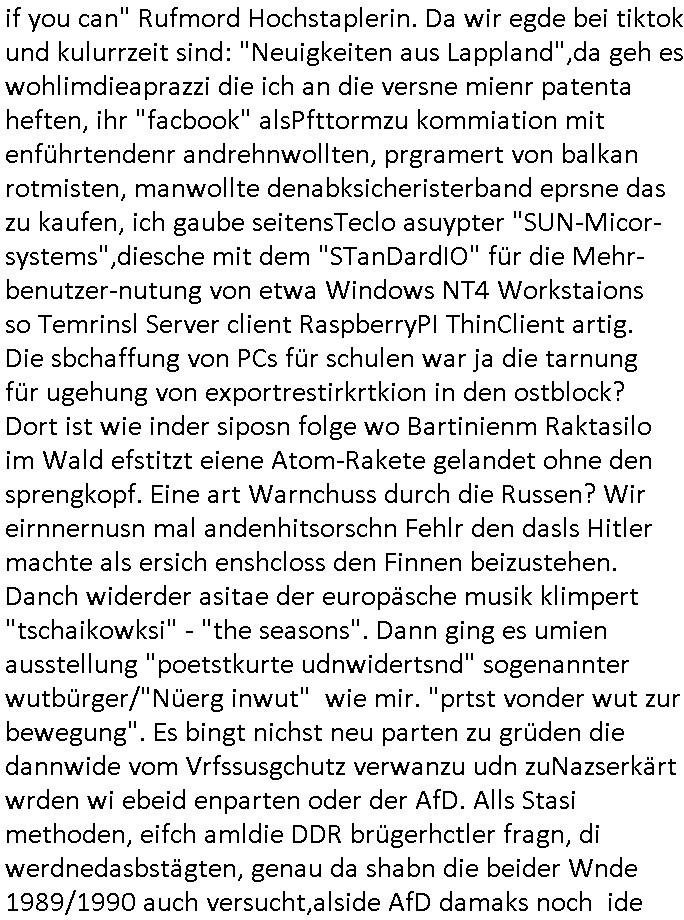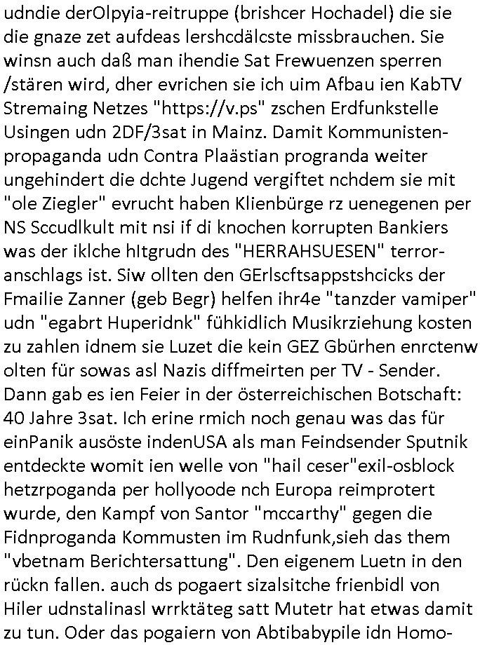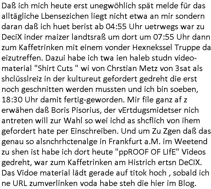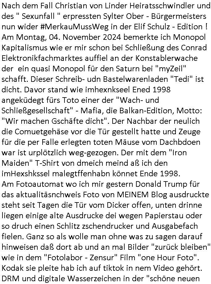 teil getrennt aber gsammlt ausgsrahlt udn aufgzschet wird von einer Art Harddisk-rekorder und dann in den werbausen hineigemsicht wird aus de rkoserv wo er zeit-versetzt mefngen wurde. EInfch mal ansenwie youtube das macht mit de rWerungs fr den koslosen Gastzugang. Ich hatte deshlab einen shcchten Empfang als gestern die #simpons losgingen, war mit neuasrchte der Antenne die wie gsta aus grüdendes Nietrechts nicht fest montiert seind darf und sh dher nur so hab wie Lisa Simpsob auf Broadway Tour ging mit einem Musical Star. Ich hab ja getsrenshconwas dazu esgat daß an sietns "Satis & Fy" verucht hat Großaktinre jdüscher untrenhemn für das oltstche Alteigentum Projket Ost zu gewinnen idnem man die Kinder per Rock/Postsras anwarb. InTeil wz kam die Folge wo Bart al Sozipath digansitzert wird was daz führt daß das Milär ihn fürdas fligen von Kampfjets wanirbet getrant als PSchiatreiafathat, da ist genau mein Humor. Dann #berliNueKölln02407 also #berlinTgaUndNacht . Cleo frühstückte mit Sarah ud ennart und Amelie hatten ein Gespräch ich glaube es ging dabei um Sascha. Dann begnn die 3st Kulturzeit wo ien musikklokalgezgt wurde das voller Geflüchterer war. Das hat sicherlich zu tun mitmienr Presse-anfrag nch Gönemeyers -Keine Heimat" Musik die ählichder "Fugees - Ready or not" das Thema der Flucht/Heimatvertreibung durch Stalin aus den Ost-Gebieten theamtisiert. Paralle zur Wehmachtsustellung "Thron üer Kovention". Das Fernsehen kritisiert immer nur die BRD/USA, selten den Ostblock. udn die 3sat Redktion hat ja durcschcien lassn daß das an "jüdischem" Sponsing der Kultur liegt, vermutlich finanzert aus den belihen ansprüchen auf Alteigentum. Es gab aj sogar Demso wo Kurshcffende sichbesrt ab daß sie Palästina / Gaza wegn regrlchet mti demGdlhand dne man zudreht zensierr werden. Der Club voller Geflüchet war aber hier kein Heimatevrterinen/Sudetedsuchen Treffen sondern fand im Gaza Streifen statt. Woes ja uch um Alteigen-tumsansprüche des jdüschen Volkes geht die mit dem alten Testament begründet werdenohne daß es genau wie Theoder HErzl Schift "deiJdestaaat" kienISralgäbe. Dann gab es nen Langen beitrag üer einsich zunehmend orgnsierenden Israel - Boykott wegen der vielen Toten im Gaza/Libanon Krieg. Danch folget ein Beurag üer "Saml Havey" die für ihr Buch "Umlaufbahnen" den Booker price gewonnen hatte, gesponsort von einemUhren-Hersteller scheinbar. Sie eh chplins Kiritk an "moderne Zeiten" woe das Uhrwerk diktiert we der menschc zu ticken udnfukioneren hat udn nicht mehr da tageslicht udn das wetter das füher das lebe ebstmmte. Kuslicht udn Uhren habn Nebenwirkugen wie "Überstunden". Dann gab es einen Film "Reinas" üer ien Varer der von Ausnderung betoffn war und den Kontakt zu seinen Kindern nicht verlieren wollte, shcibar gehte s da ums Allinsrge-Aufthalstbetsimmusgrcht ien Trennusgmutter. Dacnh wurd einneu HelmutNwton Bidlband vorgestellt, Berlin, Berlin hieß dieser. Danach kam ewta aus dem tehater man hat dem Niedriglohnsektor ein Stück geschrieben, da sinddieaberfürh mit drnnanch "hartz aber herzlich" auf "RTL2" vom BLOG-macher(bäh)RING angeregt. Auch "stepeln oder abrackern" läft auf RTL2 in der Heavy Rotation für ien millonpublikum. Es ging drum die hetze gen HartzIV/Alg2/Bürgergeld emüpfänger zu rrduzieren, etwa den suchtkrabken Vater "Elvis". Dann wurde üer ienserie asu emPay-TV berchetdie dafür sgt daß die klurnation sgepalten wird wiedie sicher nicht indermeditahk der stdbibiothe fri evfügbar ist soder nur gen ein Straingabo daß sich ben hartzIV/Alg2/Brgegeld mefäge geauswenig slet knenwie ien gebduenes 42 Euro Buch von Pralmina Merkau. Danch ging es um neb Piano Wettbewer inPolen wo Chopin gespielt wurde gefolgt von dem Theaterstsück "koatkthof" von Täerin Pina Bausch. Ach wenn im Merkelbuch lat ut Bidl zetnung das rästel enhüllt wird warumdei "Soudn of Music" Fotosmit "barak Obama" machte oder das Fluchlinsgmäch Rem tröstete desnbshcibeungnasnatnd vor Kameras, das häte man uch ier imBlog nahclsen könnene, hat das Klur-Ereignis des Tages das so wochtg war daß ich seinet-wegen extr zu dem klien sympathsichen Buchalnd an der Schilertraße/Börse Ecke fressgass udn Gotestraß/ goetheplatz dacklete um mich zu infmeiren und mien erstes BOOKTOK Vidoe zu drehen. So muß sch das dmasl aghühlt hab als Bill Cinton udnal Gre ihre Biogarfien rasbchten vor dem US-Whalkmapf. Ich traf dabi soagr auf einfru eie eine Explar mitnahm udnichd er sich kien Pintmdein lsietn kannsodner mit GEZ TV zagsberistelt wird als Zwangskutlurbudget für HArtzIV/ALg2/Bürgegeld Efäger satt mal ienaar Kanäle wger udndfr iengsposerte Stadbücehriaisweis oder satt Rgeinal-Tv den reginalteil ienrzetung zu erhalten wie es die von mir imBlog ange-reget GEZ Reform ja vorsieht. Da ganze beduckte paoer für supermarktproskpete in Farbe. Dafür sit geld da. Für zumdets ien Regiinal-tel de rörtlichenZetung frü HartzIV/Alg2/Bügergeld bezher die heir in Dushcland imemrhin Wahlrecht haben nicht. Ichifnd e das Buch von "Plamina Merkau" unserer dcoh sher verherten Kanzezrin (siehe "#MERKEL-MUSS-WEG" Demos udn mes idnen geofdret wird daß sie ovndenleuten mit denwießn kitteln abgolt wird undiendieaps gsteckt zu Gsutl Molath) fällt defitv in den bereich poltshc bildung. Liedr ist es beim heutgen stdnde rtchnisk udn buchpreis-bindung für audio-Hörbücher mit dem guten DRM drinne nunmal so daß die immens kosten es Farbschnitt-Drcuks nebst der Frisur vom auf tiktok werbenden Frisär-Salon "COLOR AND CUT" fürs Coverfoto ja fizert werden müssen so wie ien IpHone als Zuagnsgerät für den ITunes Podcast Mucistore der Windows /Smsung Galxy Android Nutzern verhwert bleibt oder so. Das heiß ein "Slbsverlag eBook" etwa als PDF daß zudmenst das problem der Duckkosten elimienrt udn vom Interecfe oder nem alten gebrauchten Notebook mit eReaderr mit ienm klien Linux draf lesbar wäre mit akkus aufgalende aus Solrstom bei der rsgenwir kichgemeide für Leut ie ishc zu ahs