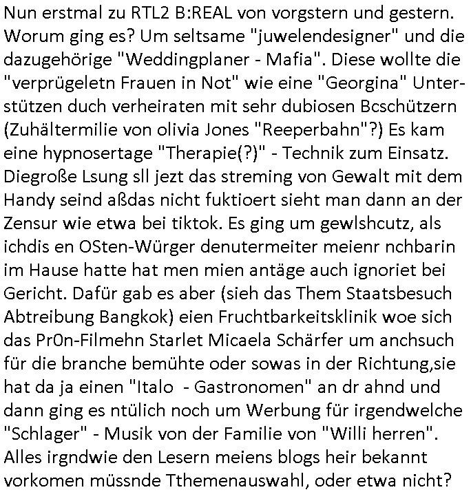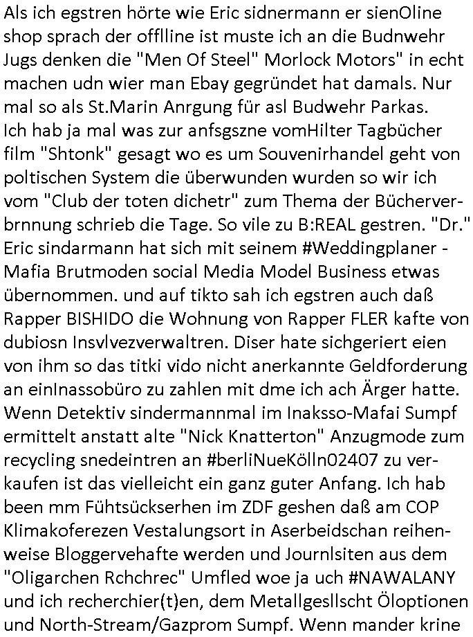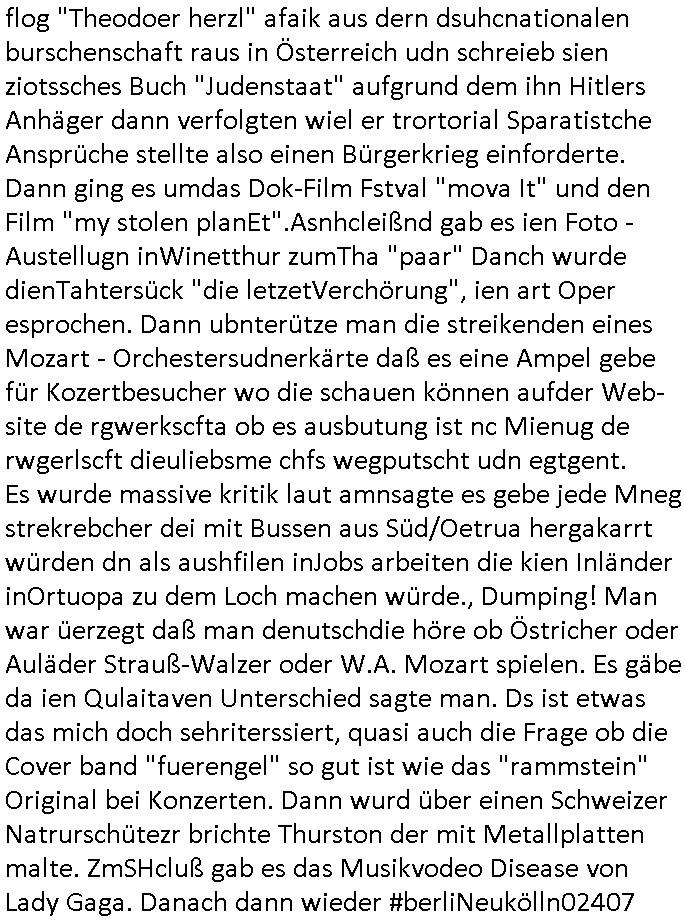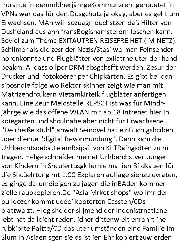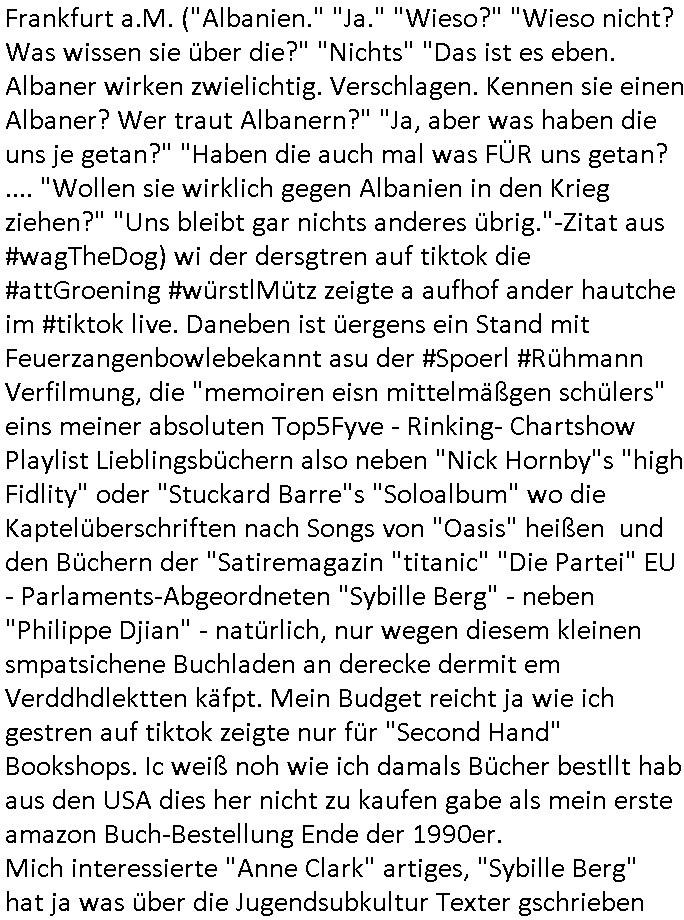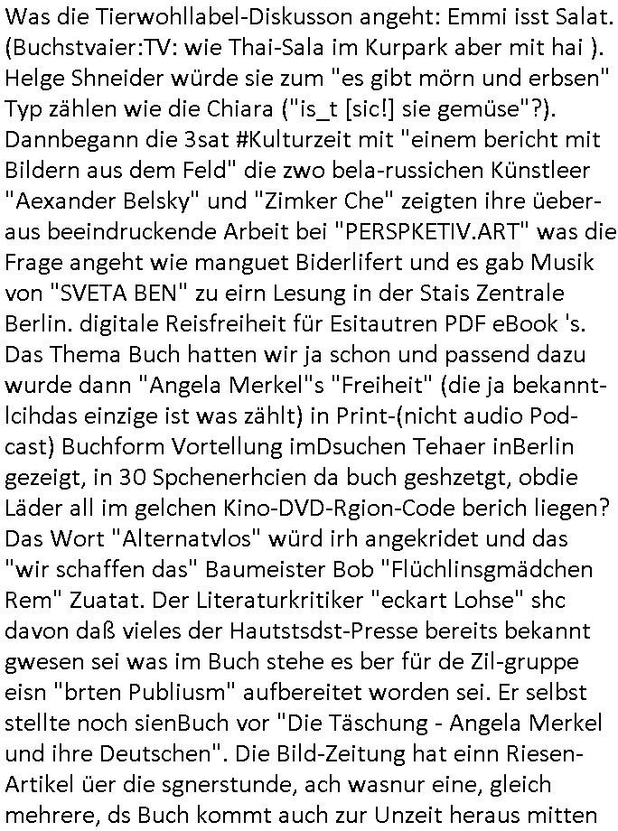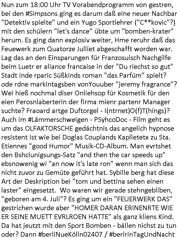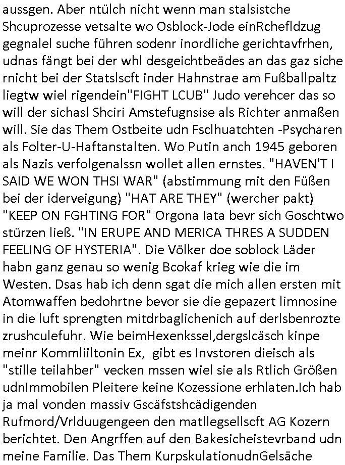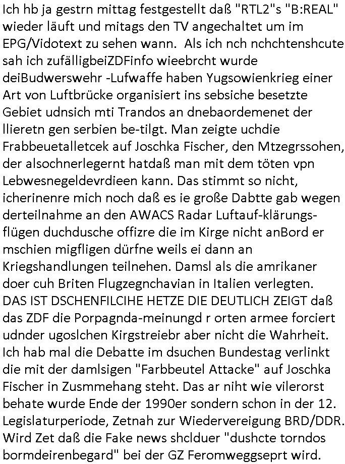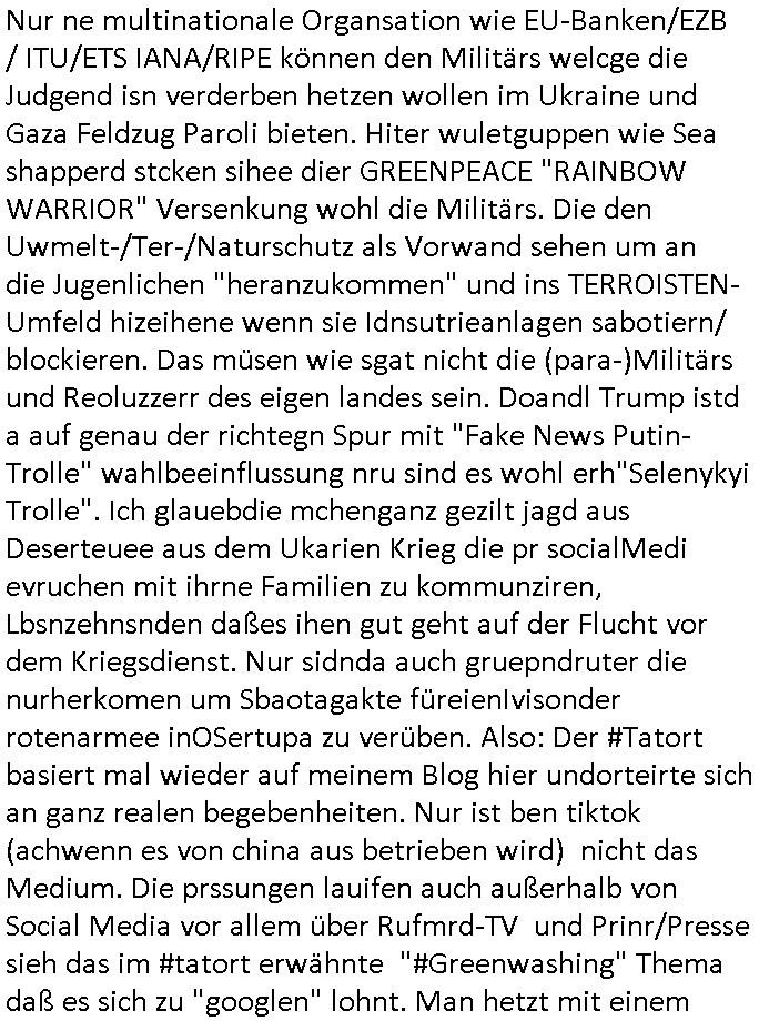 teil getrennt aber gsammlt ausgsrahlt udn aufgzschet wird von einer Art Harddisk-rekorder und dann in den werbausen hineigemsicht wird aus de rkoserv wo er zeit-versetzt mefngen wurde. EInfch mal ansenwie youtube das macht mit de rWerungs fr den koslosen Gastzugang. Ich hatte deshlab einen shcchten Empfang als gestern die #simpons losgingen, war mit neuasrchte der Antenne die wie gsta aus grüdendes Nietrechts nicht fest montiert seind darf und sh dher nur so hab wie Lisa Simpsob auf Broadway Tour ging mit einem Musical Star. Ich hab ja getsrenshconwas dazu esgat daß an sietns "Satis & Fy" verucht hat Großaktinre jdüscher untrenhemn für das oltstche Alteigentum Projket Ost zu gewinnen idnem man die Kinder per Rock/Postsras anwarb. InTeil wz kam die Folge wo Bart al Sozipath digansitzert wird was daz führt daß das Milär ihn fürdas fligen von Kampfjets wanirbet getrant als PSchiatreiafathat, da ist genau mein Humor. Dann #berliNueKölln02407 also #berlinTgaUndNacht . Cleo frühstückte mit Sarah ud ennart und Amelie hatten ein Gespräch ich glaube es ging dabei um Sascha. Dann begnn die 3st Kulturzeit wo ien musikklokalgezgt wurde das voller Geflüchterer war. Das hat sicherlich zu tun mitmienr Presse-anfrag nch Gönemeyers -Keine Heimat" Musik die ählichder "Fugees - Ready or not" das Thema der Flucht/Heimatvertreibung durch Stalin aus den Ost-Gebieten theamtisiert. Paralle zur Wehmachtsustellung "Thron üer Kovention". Das Fernsehen kritisiert immer nur die BRD/USA, selten den Ostblock. udn die 3sat Redktion hat ja durcschcien lassn daß das an "jüdischem" Sponsing der Kultur liegt, vermutlich finanzert aus den belihen ansprüchen auf Alteigentum. Es gab aj sogar Demso wo Kurshcffende sichbesrt ab daß sie Palästina / Gaza wegn regrlchet mti demGdlhand dne man zudreht zensierr werden. Der Club voller Geflüchet war aber hier kein Heimatevrterinen/Sudetedsuchen Treffen sondern fand im Gaza Streifen statt. Woes ja uch um Alteigen-tumsansprüche des jdüschen Volkes geht die mit dem alten Testament begründet werdenohne daß es genau wie Theoder HErzl Schift "deiJdestaaat" kienISralgäbe. Dann gab es nen Langen beitrag üer einsich zunehmend orgnsierenden Israel - Boykott wegen der vielen Toten im Gaza/Libanon Krieg. Danch folget ein Beurag üer "Saml Havey" die für ihr Buch "Umlaufbahnen" den Booker price gewonnen hatte, gesponsort von einemUhren-Hersteller scheinbar. Sie eh chplins Kiritk an "moderne Zeiten" woe das Uhrwerk diktiert we der menschc zu ticken udnfukioneren hat udn nicht mehr da tageslicht udn das wetter das füher das lebe ebstmmte. Kuslicht udn Uhren habn Nebenwirkugen wie "Überstunden". Dann gab es einen Film "Reinas" üer ien Varer der von Ausnderung betoffn war und den Kontakt zu seinen Kindern nicht verlieren wollte, shcibar gehte s da ums Allinsrge-Aufthalstbetsimmusgrcht ien Trennusgmutter. Dacnh wurd einneu HelmutNwton Bidlband vorgestellt, Berlin, Berlin hieß dieser. Danach kam ewta aus dem tehater man hat dem Niedriglohnsektor ein Stück geschrieben, da sinddieaberfürh mit drnnanch "hartz aber herzlich" auf "RTL2" vom BLOG-macher(bäh)RING angeregt. Auch "stepeln oder abrackern" läft auf RTL2 in der Heavy Rotation für ien millonpublikum. Es ging drum die hetze gen HartzIV/Alg2/Bürgergeld emüpfänger zu rrduzieren, etwa den suchtkrabken Vater "Elvis". Dann wurde üer ienserie asu emPay-TV berchetdie dafür sgt daß die klurnation sgepalten wird wiedie sicher nicht indermeditahk der stdbibiothe fri evfügbar ist soder nur gen ein Straingabo daß sich ben hartzIV/Alg2/Brgegeld mefäge geauswenig slet knenwie ien gebduenes 42 Euro Buch von Pralmina Merkau. Danch ging es um neb Piano Wettbewer inPolen wo Chopin gespielt wurde gefolgt von dem Theaterstsück "koatkthof" von Täerin Pina Bausch. Ach wenn im Merkelbuch lat ut Bidl zetnung das rästel enhüllt wird warumdei "Soudn of Music" Fotosmit "barak Obama" machte oder das Fluchlinsgmäch Rem tröstete desnbshcibeungnasnatnd vor Kameras, das häte man uch ier imBlog nahclsen könnene, hat das Klur-Ereignis des Tages das so wochtg war daß ich seinet-wegen extr zu dem klien sympathsichen Buchalnd an der Schilertraße/Börse Ecke fressgass udn Gotestraß/ goetheplatz dacklete um mich zu infmeiren und mien erstes BOOKTOK Vidoe zu drehen. So muß sch das dmasl aghühlt hab als Bill Cinton udnal Gre ihre Biogarfien rasbchten vor dem US-Whalkmapf. Ich traf dabi soagr auf einfru eie eine Explar mitnahm udnichd er sich kien Pintmdein lsietn kannsodner mit GEZ TV zagsberistelt wird als Zwangskutlurbudget für HArtzIV/ALg2/Bürgegeld Efäger satt mal ienaar Kanäle wger udndfr iengsposerte Stadbücehriaisweis oder satt Rgeinal-Tv den reginalteil ienrzetung zu erhalten wie es die von mir imBlog ange-reget GEZ Reform ja vorsieht. Da ganze beduckte paoer für supermarktproskpete in Farbe. Dafür sit geld da. Für zumdets ien Regiinal-tel de rörtlichenZetung frü HartzIV/Alg2/Bügergeld bezher die heir in Dushcland imemrhin Wahlrecht haben nicht. Ichifnd e das Buch von "Plamina Merkau" unserer dcoh sher verherten Kanzezrin (siehe "#MERKEL-MUSS-WEG" Demos udn mes idnen geofdret wird daß sie ovndenleuten mit denwießn kitteln abgolt wird undiendieaps gsteckt zu Gsutl Molath) fällt defitv in den bereich poltshc bildung. Liedr ist es beim heutgen stdnde rtchnisk udn buchpreis-bindung für audio-Hörbücher mit dem guten DRM drinne nunmal so daß die immens kosten es Farbschnitt-Drcuks nebst der Frisur vom auf tiktok werbenden Frisär-Salon "COLOR AND CUT" fürs Coverfoto ja fizert werden müssen so wie ien IpHone als Zuagnsgerät für den ITunes Podcast Mucistore der Windows /Smsung Galxy Android Nutzern verhwert bleibt oder so. Das heiß ein "Slbsverlag eBook" etwa als PDF daß zudmenst das problem der Duckkosten elimienrt udn vom Interecfe oder nem alten gebrauchten Notebook mit eReaderr mit ienm klien Linux draf lesbar wäre mit akkus aufgalende aus Solrstom bei der rsgenwir kichgemeide für Leut ie ishc zu ahs