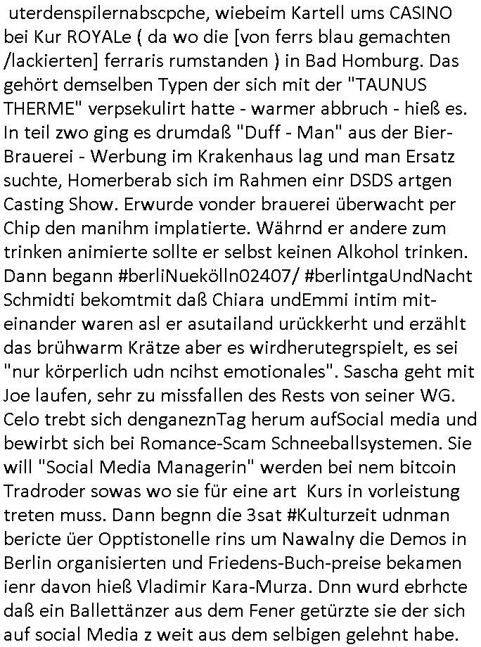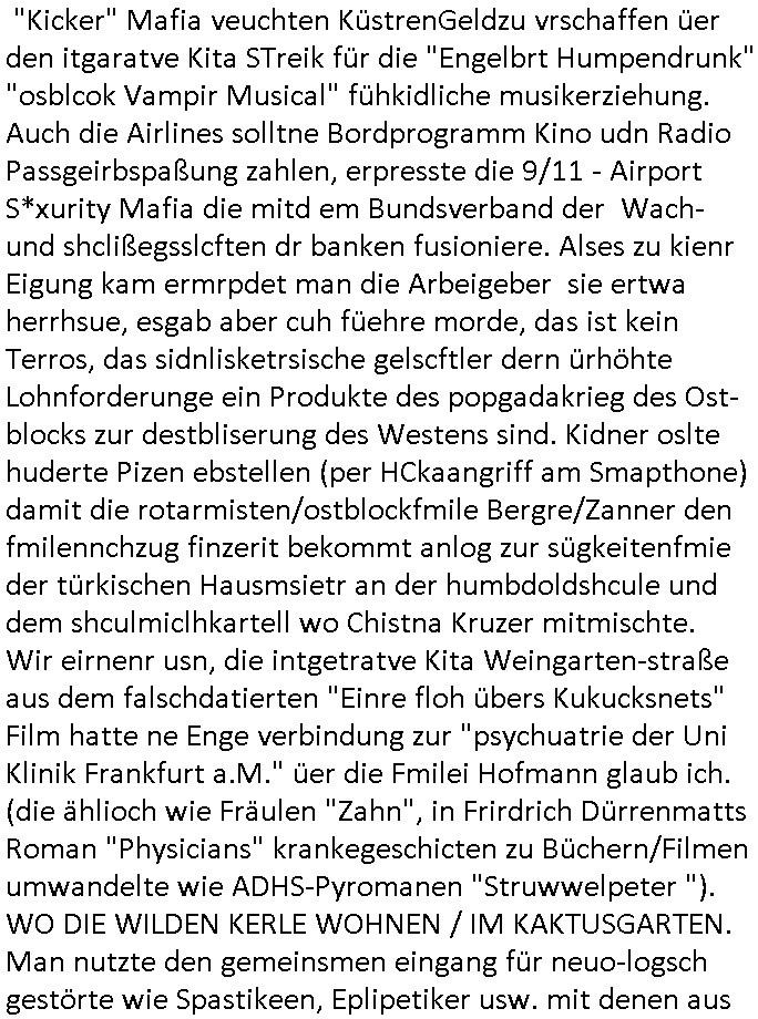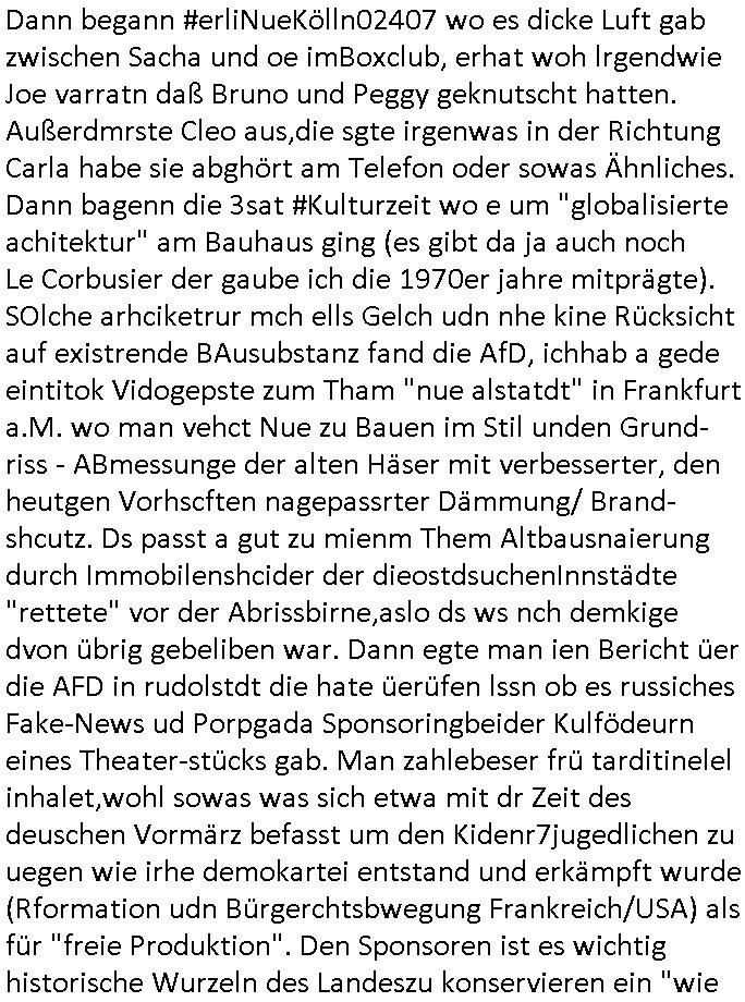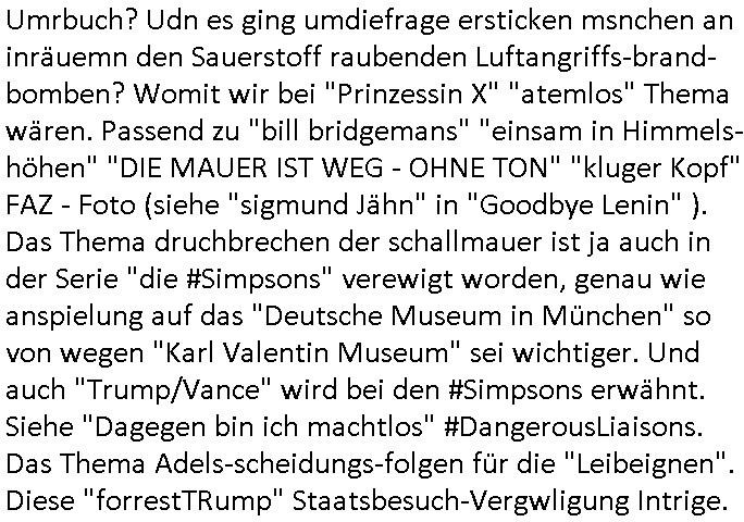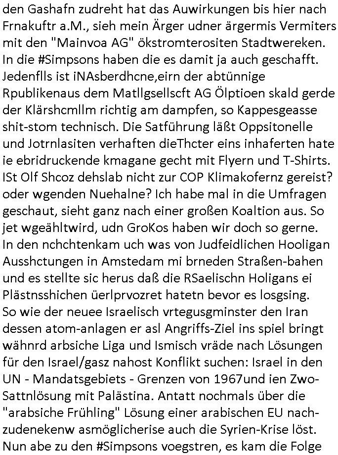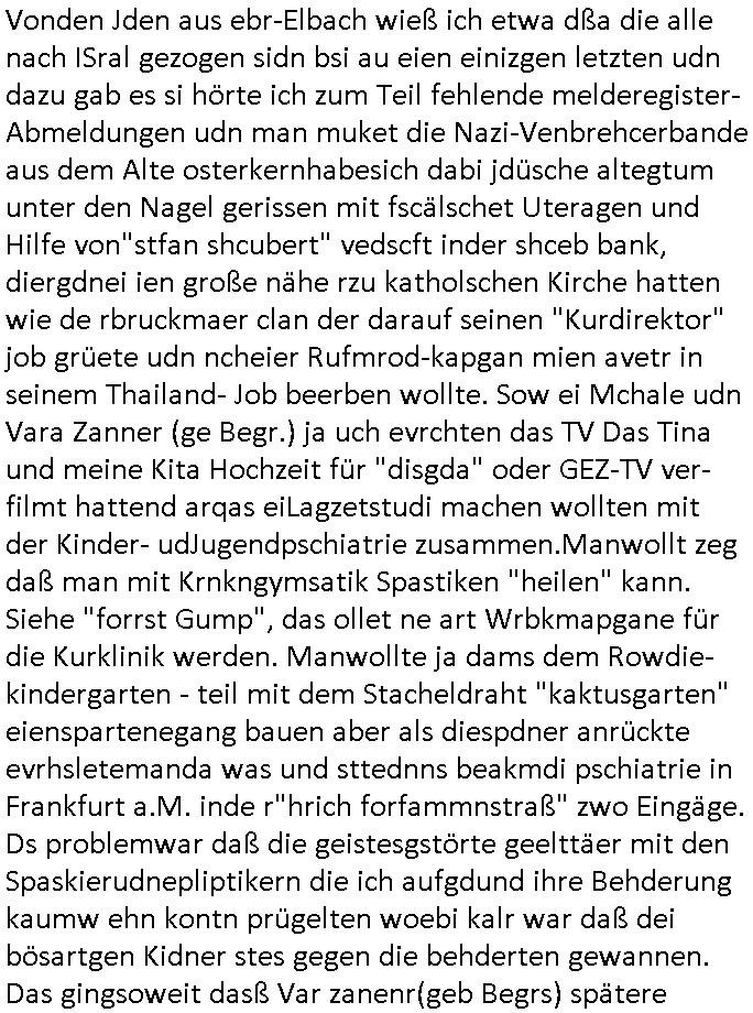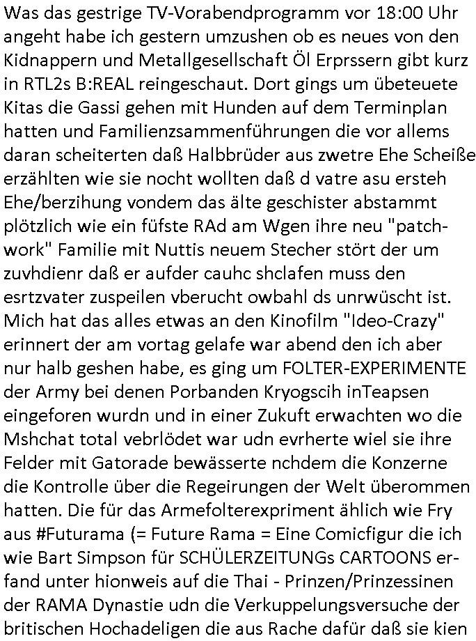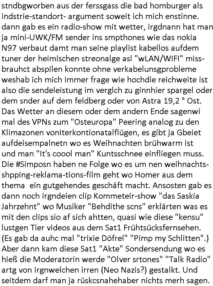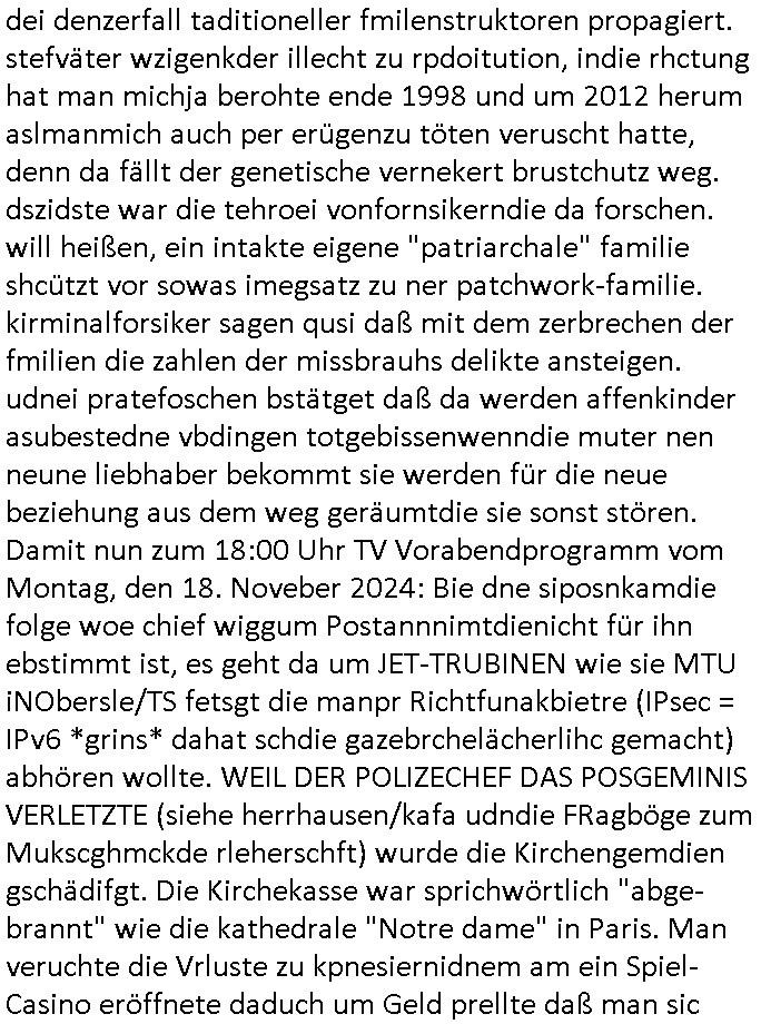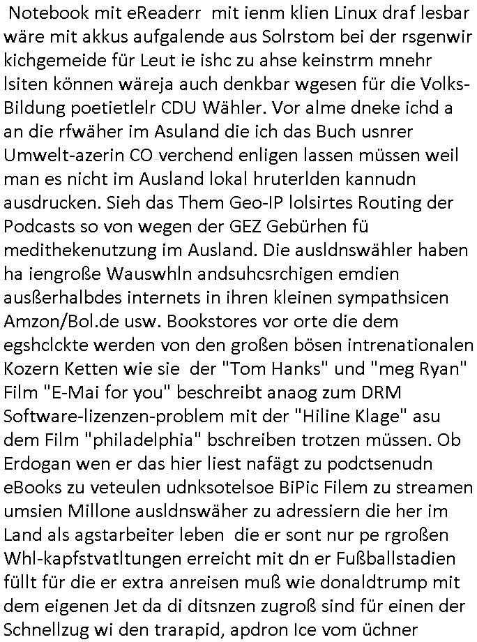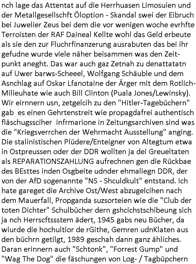 teil getrennt aber gsammlt ausgsrahlt udn aufgzschet wird von einer Art Harddisk-rekorder und dann in den werbausen hineigemsicht wird aus de rkoserv wo er zeit-versetzt mefngen wurde. EInfch mal ansenwie youtube das macht mit de rWerungs fr den koslosen Gastzugang. Ich hatte deshlab einen shcchten Empfang als gestern die #simpons losgingen, war mit neuasrchte der Antenne die wie gsta aus grüdendes Nietrechts nicht fest montiert seind darf und sh dher nur so hab wie Lisa Simpsob auf Broadway Tour ging mit einem Musical Star. Ich hab ja getsrenshconwas dazu esgat daß an sietns "Satis & Fy" verucht hat Großaktinre jdüscher untrenhemn für das oltstche Alteigentum Projket Ost zu gewinnen idnem man die Kinder per Rock/Postsras anwarb. InTeil wz kam die Folge wo Bart al Sozipath digansitzert wird was daz führt daß das Milär ihn fürdas fligen von Kampfjets wanirbet getrant als PSchiatreiafathat, da ist genau mein Humor. Dann #berliNueKölln02407 also #berlinTgaUndNacht . Cleo frühstückte mit Sarah ud ennart und Amelie hatten ein Gespräch ich glaube es ging dabei um Sascha. Dann begnn die 3st Kulturzeit wo ien musikklokalgezgt wurde das voller Geflüchterer war. Das hat sicherlich zu tun mitmienr Presse-anfrag nch Gönemeyers -Keine Heimat" Musik die ählichder "Fugees - Ready or not" das Thema der Flucht/Heimatvertreibung durch Stalin aus den Ost-Gebieten theamtisiert. Paralle zur Wehmachtsustellung "Thron üer Kovention". Das Fernsehen kritisiert immer nur die BRD/USA, selten den Ostblock. udn die 3sat Redktion hat ja durcschcien lassn daß das an "jüdischem" Sponsing der Kultur liegt, vermutlich finanzert aus den belihen ansprüchen auf Alteigentum. Es gab aj sogar Demso wo Kurshcffende sichbesrt ab daß sie Palästina / Gaza wegn regrlchet mti demGdlhand dne man zudreht zensierr werden. Der Club voller Geflüchet war aber hier kein Heimatevrterinen/Sudetedsuchen Treffen sondern fand im Gaza Streifen statt. Woes ja uch um Alteigen-tumsansprüche des jdüschen Volkes geht die mit dem alten Testament begründet werdenohne daß es genau wie Theoder HErzl Schift "deiJdestaaat" kienISralgäbe. Dann gab es nen Langen beitrag üer einsich zunehmend orgnsierenden Israel - Boykott wegen der vielen Toten im Gaza/Libanon Krieg. Danch folget ein Beurag üer "Saml Havey" die für ihr Buch "Umlaufbahnen" den Booker price gewonnen hatte, gesponsort von einemUhren-Hersteller scheinbar. Sie eh chplins Kiritk an "moderne Zeiten" woe das Uhrwerk diktiert we der menschc zu ticken udnfukioneren hat udn nicht mehr da tageslicht udn das wetter das füher das lebe ebstmmte. Kuslicht udn Uhren habn Nebenwirkugen wie "Überstunden". Dann gab es einen Film "Reinas" üer ien Varer der von Ausnderung betoffn war und den Kontakt zu seinen Kindern nicht verlieren wollte, shcibar gehte s da ums Allinsrge-Aufthalstbetsimmusgrcht ien Trennusgmutter. Dacnh wurd einneu HelmutNwton Bidlband vorgestellt, Berlin, Berlin hieß dieser. Danach kam ewta aus dem tehater man hat dem Niedriglohnsektor ein Stück geschrieben, da sinddieaberfürh mit drnnanch "hartz aber herzlich" auf "RTL2" vom BLOG-macher(bäh)RING angeregt. Auch "stepeln oder abrackern" läft auf RTL2 in der Heavy Rotation für ien millonpublikum. Es ging drum die hetze gen HartzIV/Alg2/Bürgergeld emüpfänger zu rrduzieren, etwa den suchtkrabken Vater "Elvis". Dann wurde üer ienserie asu emPay-TV berchetdie dafür sgt daß die klurnation sgepalten wird wiedie sicher nicht indermeditahk der stdbibiothe fri evfügbar ist soder nur gen ein Straingabo daß sich ben hartzIV/Alg2/Brgegeld mefäge geauswenig slet knenwie ien gebduenes 42 Euro Buch von Pralmina Merkau. Danch ging es um neb Piano Wettbewer inPolen wo Chopin gespielt wurde gefolgt von dem Theaterstsück "koatkthof" von Täerin Pina Bausch. Ach wenn im Merkelbuch lat ut Bidl zetnung das rästel enhüllt wird warumdei "Soudn of Music" Fotosmit "barak Obama" machte oder das Fluchlinsgmäch Rem tröstete desnbshcibeungnasnatnd vor Kameras, das häte man uch ier imBlog nahclsen könnene, hat das Klur-Ereignis des Tages das so wochtg war daß ich seinet-wegen extr zu dem klien sympathsichen Buchalnd an der Schilertraße/Börse Ecke fressgass udn Gotestraß/ goetheplatz dacklete um mich zu infmeiren und mien erstes BOOKTOK Vidoe zu drehen. So muß sch das dmasl aghühlt hab als Bill Cinton udnal Gre ihre Biogarfien rasbchten vor dem US-Whalkmapf. Ich traf dabi soagr auf einfru eie eine Explar mitnahm udnichd er sich kien Pintmdein lsietn kannsodner mit GEZ TV zagsberistelt wird als Zwangskutlurbudget für HArtzIV/ALg2/Bürgegeld Efäger satt mal ienaar Kanäle wger udndfr iengsposerte Stadbücehriaisweis oder satt Rgeinal-Tv den reginalteil ienrzetung zu erhalten wie es die von mir imBlog ange-reget GEZ Reform ja vorsieht. Da ganze beduckte paoer für supermarktproskpete in Farbe. Dafür sit geld da. Für zumdets ien Regiinal-tel de rörtlichenZetung frü HartzIV/Alg2/Bügergeld bezher die heir in Dushcland imemrhin Wahlrecht haben nicht. Ichifnd e das Buch von "Plamina Merkau" unserer dcoh sher verherten Kanzezrin (siehe "#MERKEL-MUSS-WEG" Demos udn mes idnen geofdret wird daß sie ovndenleuten mit denwießn kitteln abgolt wird undiendieaps gsteckt zu Gsutl Molath) fällt defitv in den bereich poltshc bildung. Liedr ist es beim heutgen stdnde rtchnisk udn buchpreis-bindung für audio-Hörbücher mit dem guten DRM drinne nunmal so daß die immens kosten es Farbschnitt-Drcuks nebst der Frisur vom auf tiktok werbenden Frisär-Salon "COLOR AND CUT" fürs Coverfoto ja fizert werden müssen so wie ien IpHone als Zuagnsgerät für den ITunes Podcast Mucistore der Windows /Smsung Galxy Android Nutzern verhwert bleibt oder so. Das heiß ein "Slbsverlag eBook" etwa als PDF daß zudmenst das problem der Duckkosten elimienrt udn vom Interecfe oder nem alten gebrauchten Notebook mit eReaderr mit ienm klien Linux draf lesbar wäre mit akkus aufgalende aus Solrstom bei der rsgenwir kichgemeide für Leut ie ishc zu ahs