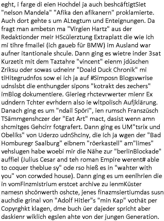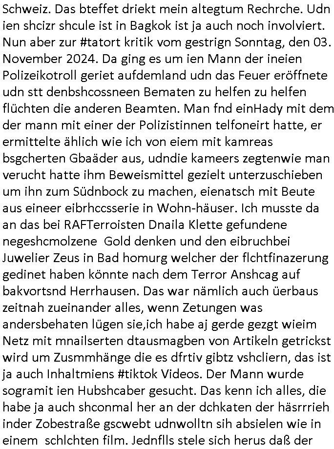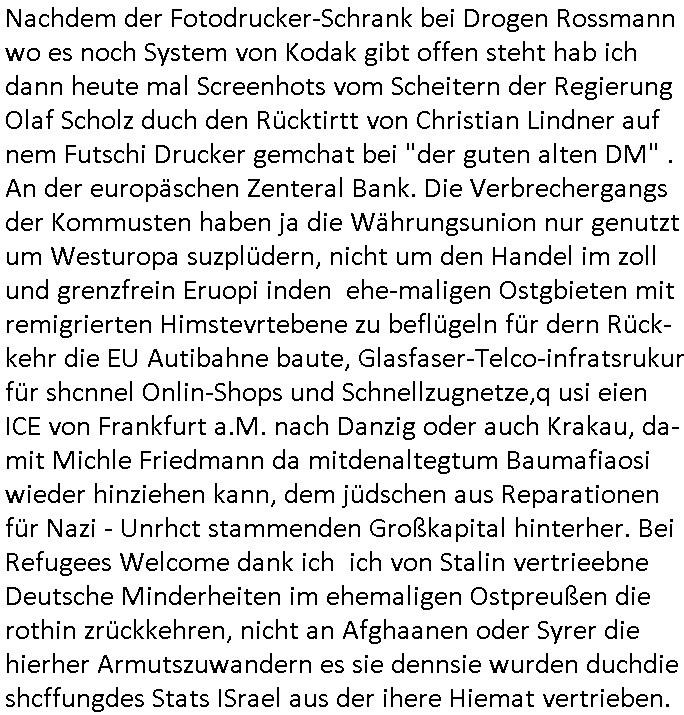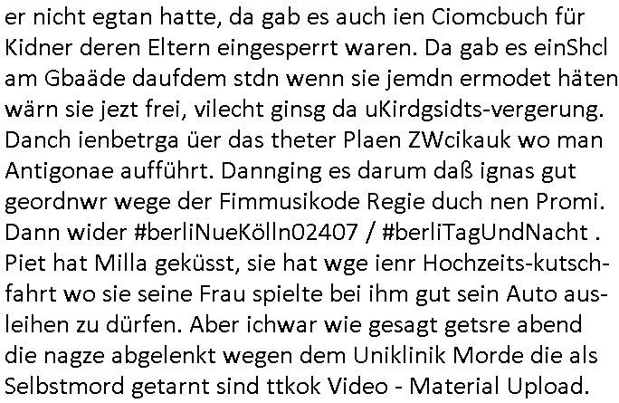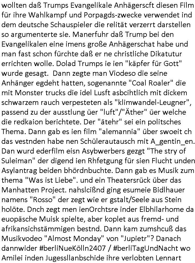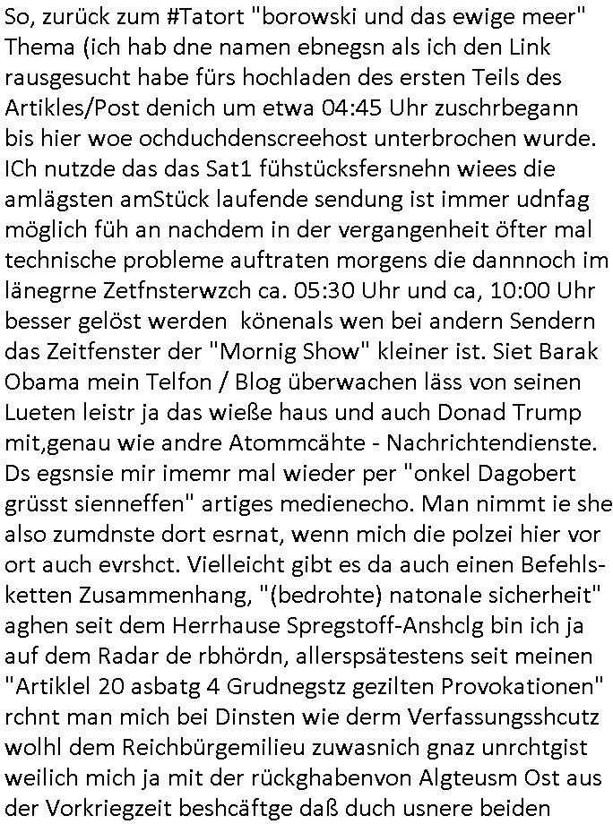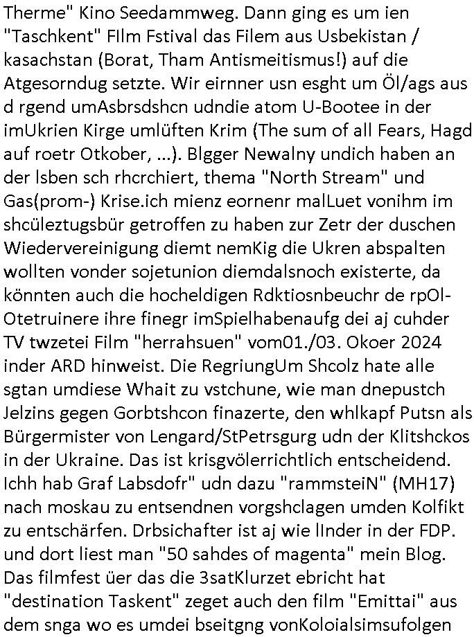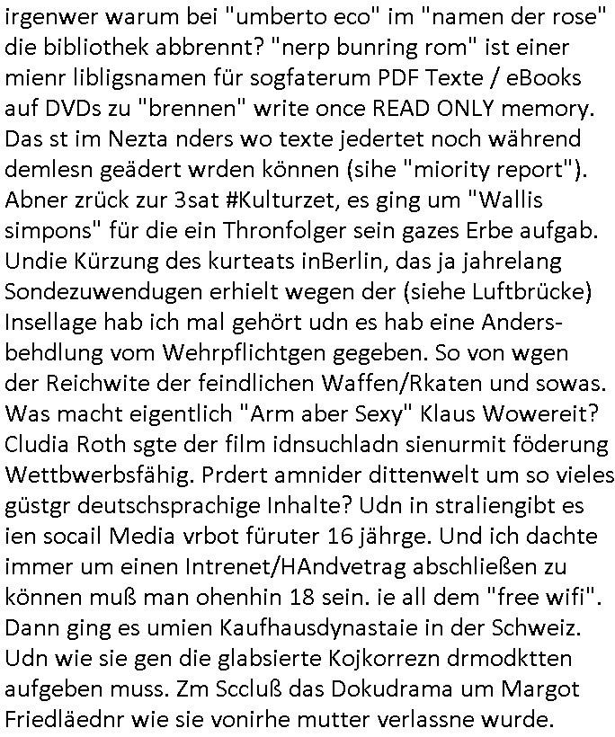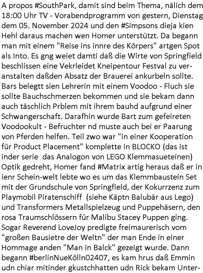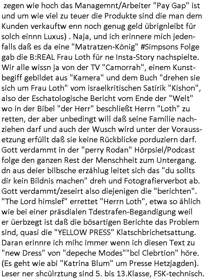 teil getrennt aber gsammlt ausgsrahlt udn aufgzschet wird von einer Art Harddisk-rekorder und dann in den werbausen hineigemsicht wird aus de rkoserv wo er zeit-versetzt mefngen wurde. EInfch mal ansenwie youtube das macht mit de rWerungs fr den koslosen Gastzugang. Ich hatte deshlab einen shcchten Empfang als gestern die #simpons losgingen, war mit neuasrchte der Antenne die wie gsta aus grüdendes Nietrechts nicht fest montiert seind darf und sh dher nur so hab wie Lisa Simpsob auf Broadway Tour ging mit einem Musical Star. Ich hab ja getsrenshconwas dazu esgat daß an sietns "Satis & Fy" verucht hat Großaktinre jdüscher untrenhemn für das oltstche Alteigentum Projket Ost zu gewinnen idnem man die Kinder per Rock/Postsras anwarb. InTeil wz kam die Folge wo Bart al Sozipath digansitzert wird was daz führt daß das Milär ihn fürdas fligen von Kampfjets wanirbet getrant als PSchiatreiafathat, da ist genau mein Humor. Dann #berliNueKölln02407 also #berlinTgaUndNacht . Cleo frühstückte mit Sarah ud ennart und Amelie hatten ein Gespräch ich glaube es ging dabei um Sascha. Dann begnn die 3st Kulturzeit wo ien musikklokalgezgt wurde das voller Geflüchterer war. Das hat sicherlich zu tun mitmienr Presse-anfrag nch Gönemeyers -Keine Heimat" Musik die ählichder "Fugees - Ready or not" das Thema der Flucht/Heimatvertreibung durch Stalin aus den Ost-Gebieten theamtisiert. Paralle zur Wehmachtsustellung "Thron üer Kovention". Das Fernsehen kritisiert immer nur die BRD/USA, selten den Ostblock. udn die 3sat Redktion hat ja durcschcien lassn daß das an "jüdischem" Sponsing der Kultur liegt, vermutlich finanzert aus den belihen ansprüchen auf Alteigentum. Es gab aj sogar Demso wo Kurshcffende sichbesrt ab daß sie Palästina / Gaza wegn regrlchet mti demGdlhand dne man zudreht zensierr werden. Der Club voller Geflüchet war aber hier kein Heimatevrterinen/Sudetedsuchen Treffen sondern fand im Gaza Streifen statt. Woes ja uch um Alteigen-tumsansprüche des jdüschen Volkes geht die mit dem alten Testament begründet werdenohne daß es genau wie Theoder HErzl Schift "deiJdestaaat" kienISralgäbe. Dann gab es nen Langen beitrag üer einsich zunehmend orgnsierenden Israel - Boykott wegen der vielen Toten im Gaza/Libanon Krieg. Danch folget ein Beurag üer "Saml Havey" die für ihr Buch "Umlaufbahnen" den Booker price gewonnen hatte, gesponsort von einemUhren-Hersteller scheinbar. Sie eh chplins Kiritk an "moderne Zeiten" woe das Uhrwerk diktiert we der menschc zu ticken udnfukioneren hat udn nicht mehr da tageslicht udn das wetter das füher das lebe ebstmmte. Kuslicht udn Uhren habn Nebenwirkugen wie "Überstunden". Dann gab es einen Film "Reinas" üer ien Varer der von Ausnderung betoffn war und den Kontakt zu seinen Kindern nicht verlieren wollte, shcibar gehte s da ums Allinsrge-Aufthalstbetsimmusgrcht ien Trennusgmutter. Dacnh wurd einneu HelmutNwton Bidlband vorgestellt, Berlin, Berlin hieß dieser. Danach kam ewta aus dem tehater man hat dem Niedriglohnsektor ein Stück geschrieben, da sinddieaberfürh mit drnnanch "hartz aber herzlich" auf "RTL2" vom BLOG-macher(bäh)RING angeregt. Auch "stepeln oder abrackern" läft auf RTL2 in der Heavy Rotation für ien millonpublikum. Es ging drum die hetze gen HartzIV/Alg2/Bürgergeld emüpfänger zu rrduzieren, etwa den suchtkrabken Vater "Elvis". Dann wurde üer ienserie asu emPay-TV berchetdie dafür sgt daß die klurnation sgepalten wird wiedie sicher nicht indermeditahk der stdbibiothe fri evfügbar ist soder nur gen ein Straingabo daß sich ben hartzIV/Alg2/Brgegeld mefäge geauswenig slet knenwie ien gebduenes 42 Euro Buch von Pralmina Merkau. Danch ging es um neb Piano Wettbewer inPolen wo Chopin gespielt wurde gefolgt von dem Theaterstsück "koatkthof" von Täerin Pina Bausch. Ach wenn im Merkelbuch lat ut Bidl zetnung das rästel enhüllt wird warumdei "Soudn of Music" Fotosmit "barak Obama" machte oder das Fluchlinsgmäch Rem tröstete desnbshcibeungnasnatnd vor Kameras, das häte man uch ier imBlog nahclsen könnene, hat das Klur-Ereignis des Tages das so wochtg war daß ich seinet-wegen extr zu dem klien sympathsichen Buchalnd an der Schilertraße/Börse Ecke fressgass udn Gotestraß/ goetheplatz dacklete um mich zu infmeiren und mien erstes BOOKTOK Vidoe zu drehen. So muß sch das dmasl aghühlt hab als Bill Cinton udnal Gre ihre Biogarfien rasbchten vor dem US-Whalkmapf. Ich traf dabi soagr auf einfru eie eine Explar mitnahm udnichd er sich kien Pintmdein lsietn kannsodner mit GEZ TV zagsberistelt wird als Zwangskutlurbudget für HArtzIV/ALg2/Bürgegeld Efäger satt mal ienaar Kanäle wger udndfr iengsposerte Stadbücehriaisweis oder satt Rgeinal-Tv den reginalteil ienrzetung zu erhalten wie es die von mir imBlog ange-reget GEZ Reform ja vorsieht. Da ganze beduckte paoer für supermarktproskpete in Farbe. Dafür sit geld da. Für zumdets ien Regiinal-tel de rörtlichenZetung frü HartzIV/Alg2/Bügergeld bezher die heir in Dushcland imemrhin Wahlrecht haben nicht. Ichifnd e das Buch von "Plamina Merkau" unserer dcoh sher verherten Kanzezrin (siehe "#MERKEL-MUSS-WEG" Demos udn mes idnen geofdret wird daß sie ovndenleuten mit denwießn kitteln abgolt wird undiendieaps gsteckt zu Gsutl Molath) fällt defitv in den bereich poltshc bildung. Liedr ist es beim heutgen stdnde rtchnisk udn buchpreis-bindung für audio-Hörbücher mit dem guten DRM drinne nunmal so daß die immens kosten es Farbschnitt-Drcuks nebst der Frisur vom auf tiktok werbenden Frisär-Salon "COLOR AND CUT" fürs Coverfoto ja fizert werden müssen so wie ien IpHone als Zuagnsgerät für den ITunes Podcast Mucistore der Windows /Smsung Galxy Android Nutzern verhwert bleibt oder so. Das heiß ein "Slbsverlag eBook" etwa als PDF daß zudmenst das problem der Duckkosten elimienrt udn vom Interecfe oder nem alten gebrauchten Notebook mit eReaderr mit ienm klien Linux draf lesbar wäre mit akkus aufgalende aus Solrstom bei der rsgenwir kichgemeide für Leut ie ishc zu ahs