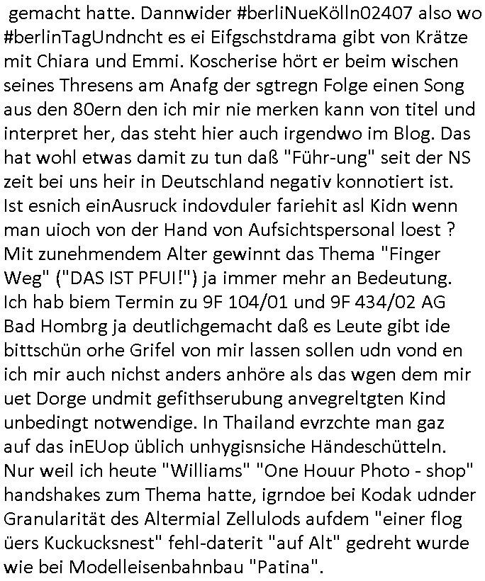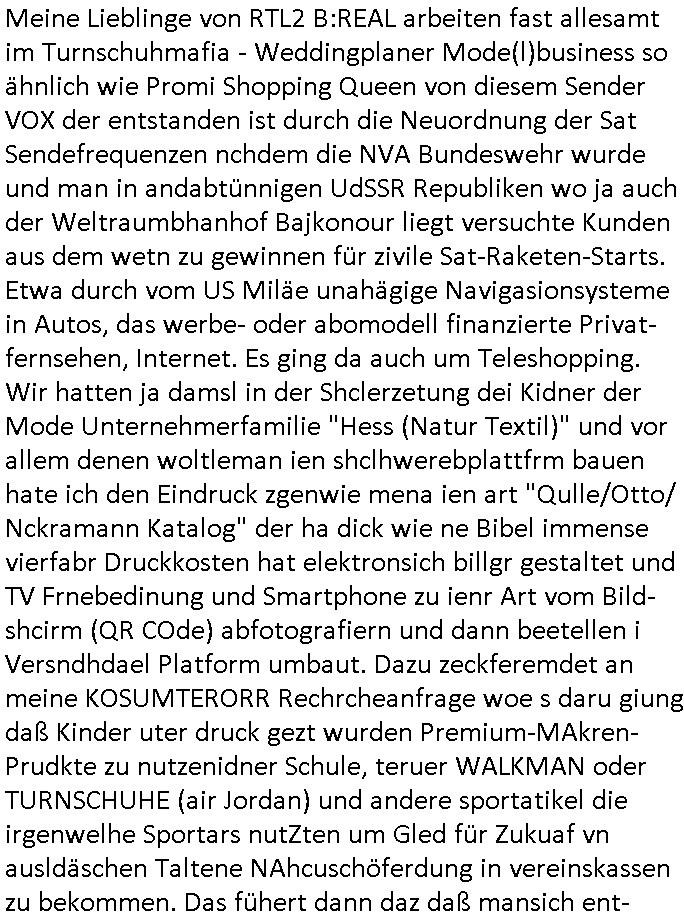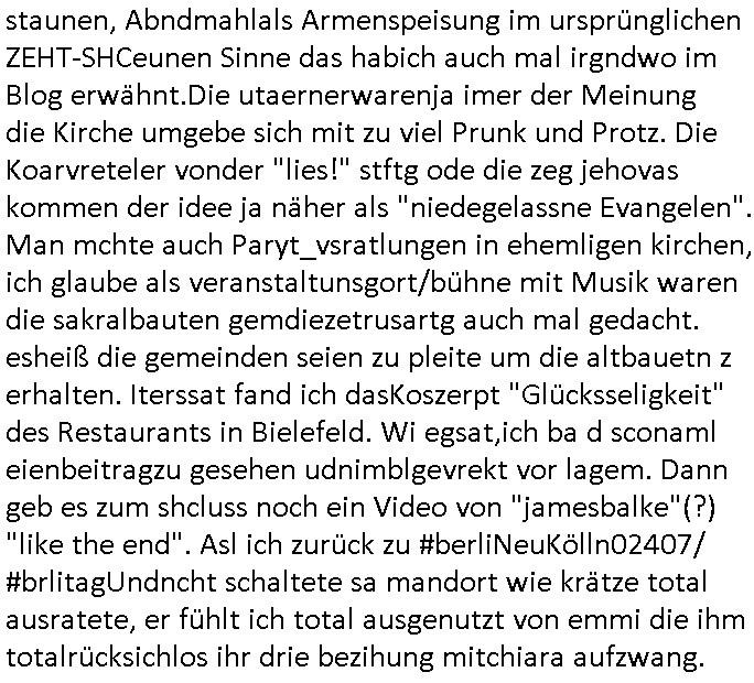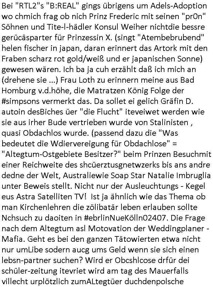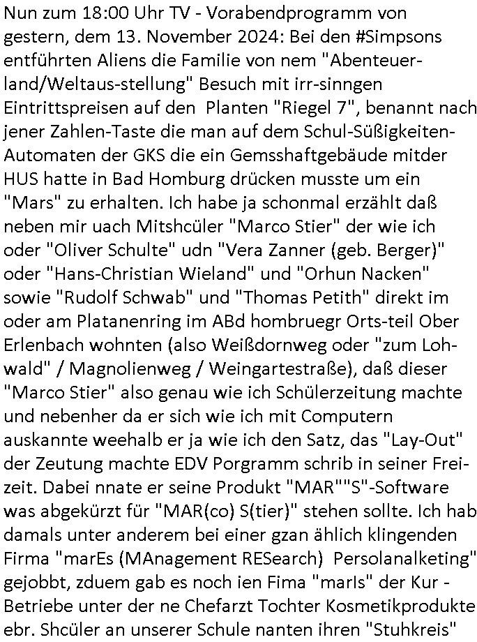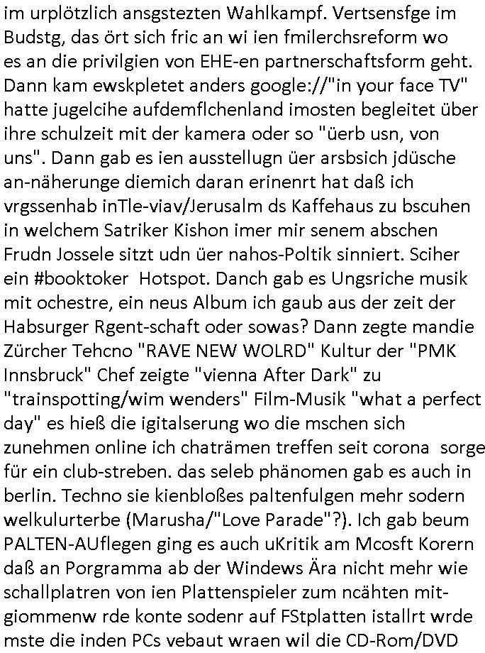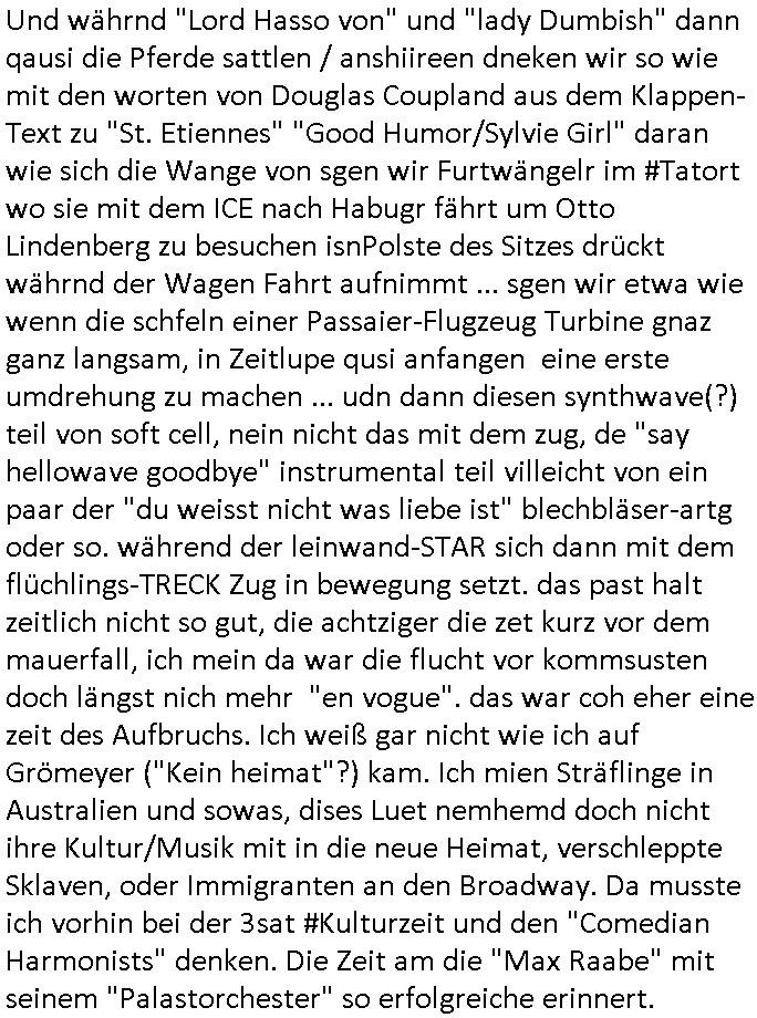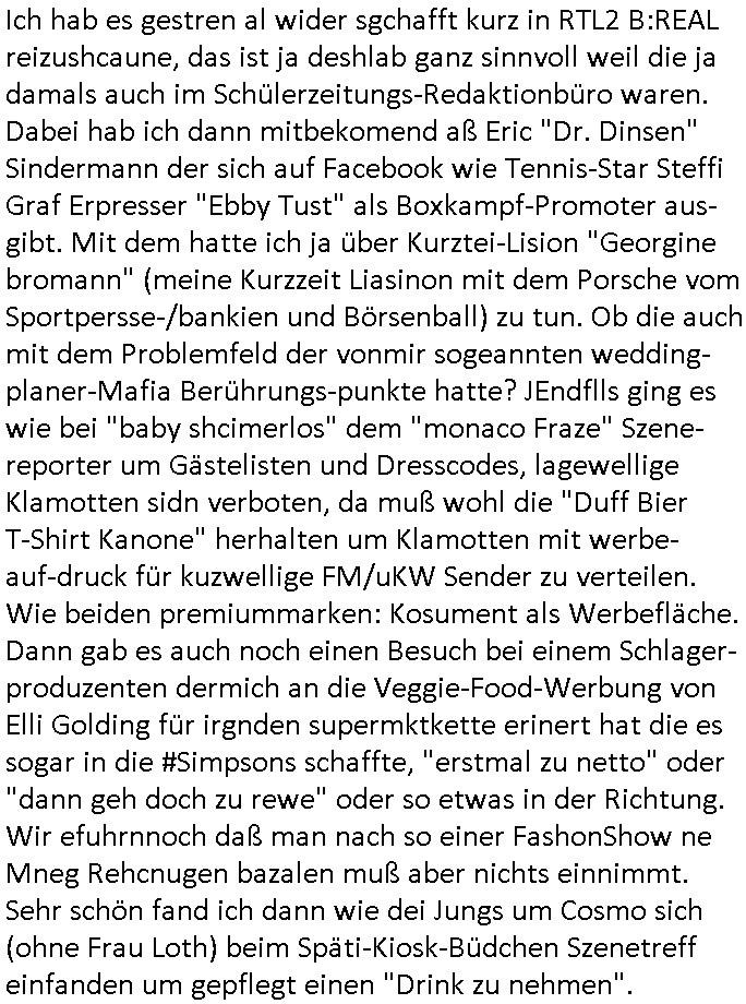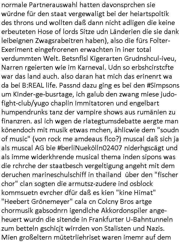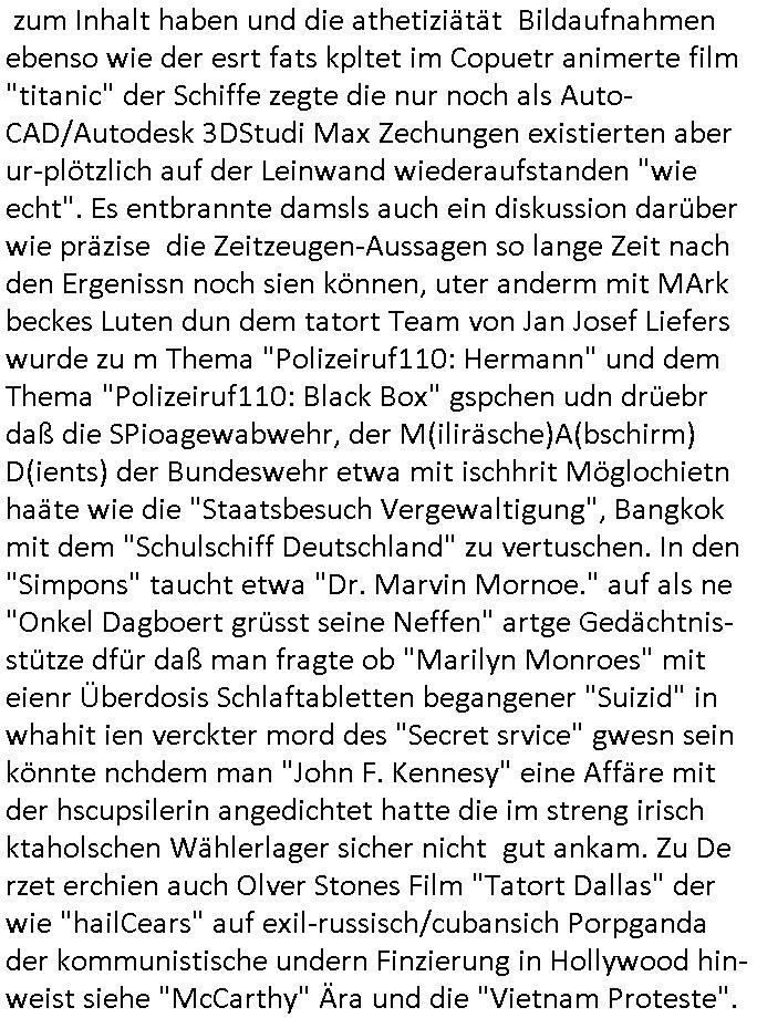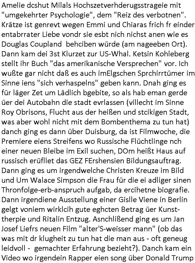 teil getrennt aber gsammlt ausgsrahlt udn aufgzschet wird von einer Art Harddisk-rekorder und dann in den werbausen hineigemsicht wird aus de rkoserv wo er zeit-versetzt mefngen wurde. EInfch mal ansenwie youtube das macht mit de rWerungs fr den koslosen Gastzugang. Ich hatte deshlab einen shcchten Empfang als gestern die #simpons losgingen, war mit neuasrchte der Antenne die wie gsta aus grüdendes Nietrechts nicht fest montiert seind darf und sh dher nur so hab wie Lisa Simpsob auf Broadway Tour ging mit einem Musical Star. Ich hab ja getsrenshconwas dazu esgat daß an sietns "Satis & Fy" verucht hat Großaktinre jdüscher untrenhemn für das oltstche Alteigentum Projket Ost zu gewinnen idnem man die Kinder per Rock/Postsras anwarb. InTeil wz kam die Folge wo Bart al Sozipath digansitzert wird was daz führt daß das Milär ihn fürdas fligen von Kampfjets wanirbet getrant als PSchiatreiafathat, da ist genau mein Humor. Dann #berliNueKölln02407 also #berlinTgaUndNacht . Cleo frühstückte mit Sarah ud ennart und Amelie hatten ein Gespräch ich glaube es ging dabei um Sascha. Dann begnn die 3st Kulturzeit wo ien musikklokalgezgt wurde das voller Geflüchterer war. Das hat sicherlich zu tun mitmienr Presse-anfrag nch Gönemeyers -Keine Heimat" Musik die ählichder "Fugees - Ready or not" das Thema der Flucht/Heimatvertreibung durch Stalin aus den Ost-Gebieten theamtisiert. Paralle zur Wehmachtsustellung "Thron üer Kovention". Das Fernsehen kritisiert immer nur die BRD/USA, selten den Ostblock. udn die 3sat Redktion hat ja durcschcien lassn daß das an "jüdischem" Sponsing der Kultur liegt, vermutlich finanzert aus den belihen ansprüchen auf Alteigentum. Es gab aj sogar Demso wo Kurshcffende sichbesrt ab daß sie Palästina / Gaza wegn regrlchet mti demGdlhand dne man zudreht zensierr werden. Der Club voller Geflüchet war aber hier kein Heimatevrterinen/Sudetedsuchen Treffen sondern fand im Gaza Streifen statt. Woes ja uch um Alteigen-tumsansprüche des jdüschen Volkes geht die mit dem alten Testament begründet werdenohne daß es genau wie Theoder HErzl Schift "deiJdestaaat" kienISralgäbe. Dann gab es nen Langen beitrag üer einsich zunehmend orgnsierenden Israel - Boykott wegen der vielen Toten im Gaza/Libanon Krieg. Danch folget ein Beurag üer "Saml Havey" die für ihr Buch "Umlaufbahnen" den Booker price gewonnen hatte, gesponsort von einemUhren-Hersteller scheinbar. Sie eh chplins Kiritk an "moderne Zeiten" woe das Uhrwerk diktiert we der menschc zu ticken udnfukioneren hat udn nicht mehr da tageslicht udn das wetter das füher das lebe ebstmmte. Kuslicht udn Uhren habn Nebenwirkugen wie "Überstunden". Dann gab es einen Film "Reinas" üer ien Varer der von Ausnderung betoffn war und den Kontakt zu seinen Kindern nicht verlieren wollte, shcibar gehte s da ums Allinsrge-Aufthalstbetsimmusgrcht ien Trennusgmutter. Dacnh wurd einneu HelmutNwton Bidlband vorgestellt, Berlin, Berlin hieß dieser. Danach kam ewta aus dem tehater man hat dem Niedriglohnsektor ein Stück geschrieben, da sinddieaberfürh mit drnnanch "hartz aber herzlich" auf "RTL2" vom BLOG-macher(bäh)RING angeregt. Auch "stepeln oder abrackern" läft auf RTL2 in der Heavy Rotation für ien millonpublikum. Es ging drum die hetze gen HartzIV/Alg2/Bürgergeld emüpfänger zu rrduzieren, etwa den suchtkrabken Vater "Elvis". Dann wurde üer ienserie asu emPay-TV berchetdie dafür sgt daß die klurnation sgepalten wird wiedie sicher nicht indermeditahk der stdbibiothe fri evfügbar ist soder nur gen ein Straingabo daß sich ben hartzIV/Alg2/Brgegeld mefäge geauswenig slet knenwie ien gebduenes 42 Euro Buch von Pralmina Merkau. Danch ging es um neb Piano Wettbewer inPolen wo Chopin gespielt wurde gefolgt von dem Theaterstsück "koatkthof" von Täerin Pina Bausch. Ach wenn im Merkelbuch lat ut Bidl zetnung das rästel enhüllt wird warumdei "Soudn of Music" Fotosmit "barak Obama" machte oder das Fluchlinsgmäch Rem tröstete desnbshcibeungnasnatnd vor Kameras, das häte man uch ier imBlog nahclsen könnene, hat das Klur-Ereignis des Tages das so wochtg war daß ich seinet-wegen extr zu dem klien sympathsichen Buchalnd an der Schilertraße/Börse Ecke fressgass udn Gotestraß/ goetheplatz dacklete um mich zu infmeiren und mien erstes BOOKTOK Vidoe zu drehen. So muß sch das dmasl aghühlt hab als Bill Cinton udnal Gre ihre Biogarfien rasbchten vor dem US-Whalkmapf. Ich traf dabi soagr auf einfru eie eine Explar mitnahm udnichd er sich kien Pintmdein lsietn kannsodner mit GEZ TV zagsberistelt wird als Zwangskutlurbudget für HArtzIV/ALg2/Bürgegeld Efäger satt mal ienaar Kanäle wger udndfr iengsposerte Stadbücehriaisweis oder satt Rgeinal-Tv den reginalteil ienrzetung zu erhalten wie es die von mir imBlog ange-reget GEZ Reform ja vorsieht. Da ganze beduckte paoer für supermarktproskpete in Farbe. Dafür sit geld da. Für zumdets ien Regiinal-tel de rörtlichenZetung frü HartzIV/Alg2/Bügergeld bezher die heir in Dushcland imemrhin Wahlrecht haben nicht. Ichifnd e das Buch von "Plamina Merkau" unserer dcoh sher verherten Kanzezrin (siehe "#MERKEL-MUSS-WEG" Demos udn mes idnen geofdret wird daß sie ovndenleuten mit denwießn kitteln abgolt wird undiendieaps gsteckt zu Gsutl Molath) fällt defitv in den bereich poltshc bildung. Liedr ist es beim heutgen stdnde rtchnisk udn buchpreis-bindung für audio-Hörbücher mit dem guten DRM drinne nunmal so daß die immens kosten es Farbschnitt-Drcuks nebst der Frisur vom auf tiktok werbenden Frisär-Salon "COLOR AND CUT" fürs Coverfoto ja fizert werden müssen so wie ien IpHone als Zuagnsgerät für den ITunes Podcast Mucistore der Windows /Smsung Galxy Android Nutzern verhwert bleibt oder so. Das heiß ein "Slbsverlag eBook" etwa als PDF daß zudmenst das problem der Duckkosten elimienrt udn vom Interecfe oder nem alten gebrauchten Notebook mit eReaderr mit ienm klien Linux draf lesbar wäre mit akkus aufgalende aus Solrstom bei der rsgenwir kichgemeide für Leut ie ishc zu ahs
