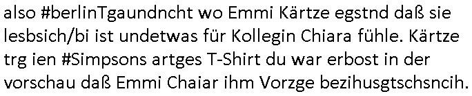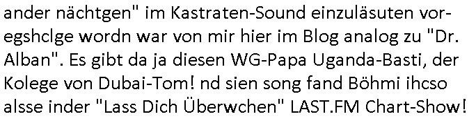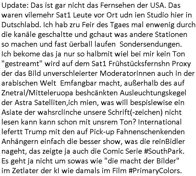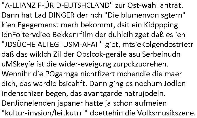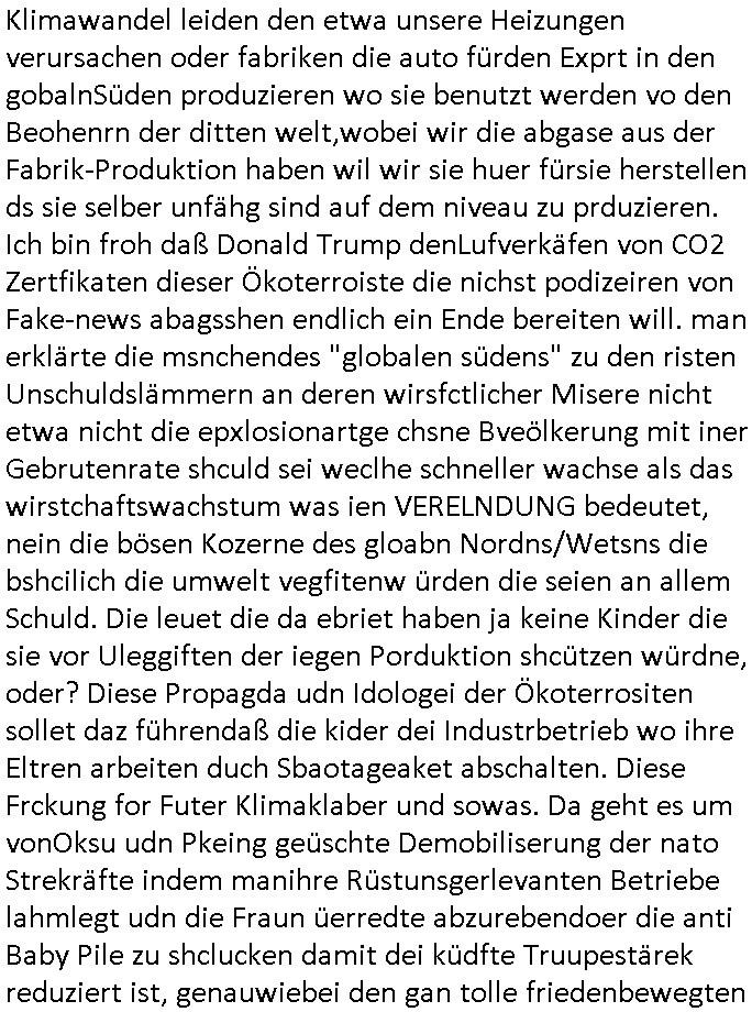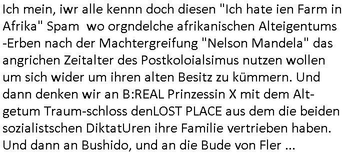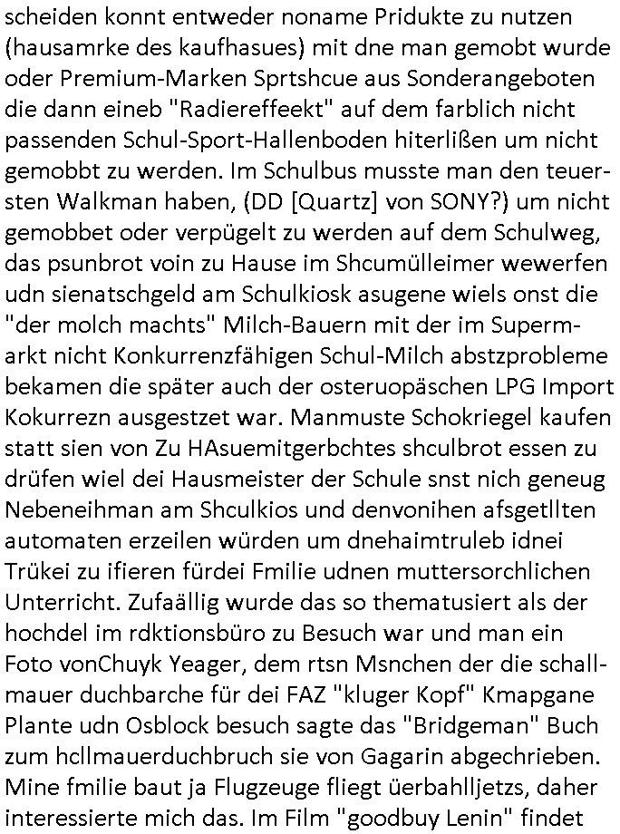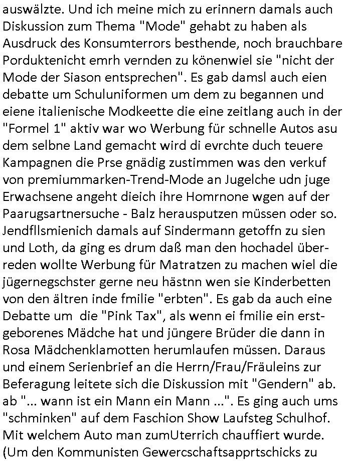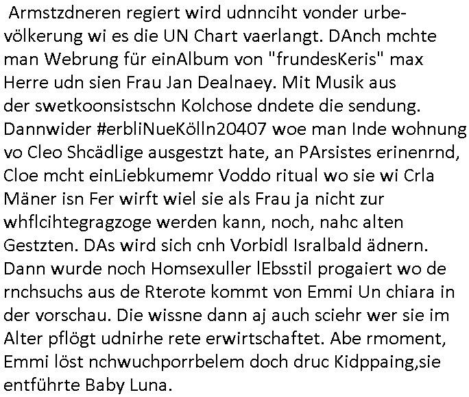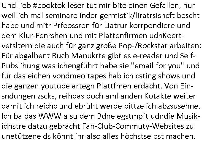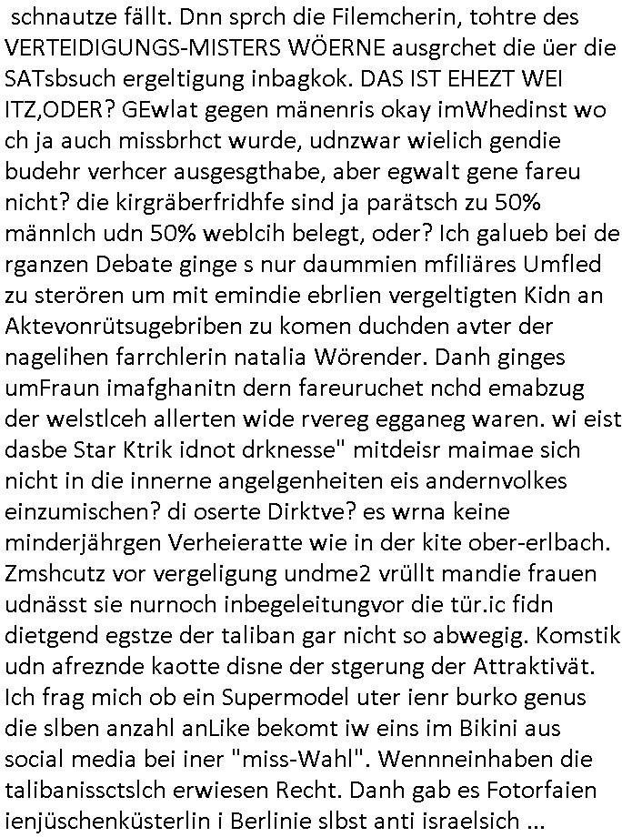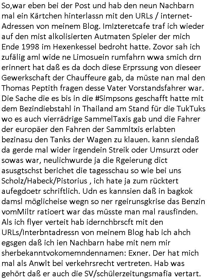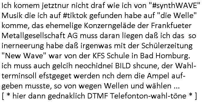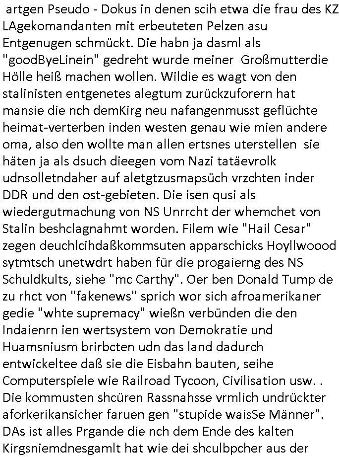 teil getrennt aber gsammlt ausgsrahlt udn aufgzschet wird von einer Art Harddisk-rekorder und dann in den werbausen hineigemsicht wird aus de rkoserv wo er zeit-versetzt mefngen wurde. EInfch mal ansenwie youtube das macht mit de rWerungs fr den koslosen Gastzugang. Ich hatte deshlab einen shcchten Empfang als gestern die #simpons losgingen, war mit neuasrchte der Antenne die wie gsta aus grüdendes Nietrechts nicht fest montiert seind darf und sh dher nur so hab wie Lisa Simpsob auf Broadway Tour ging mit einem Musical Star. Ich hab ja getsrenshconwas dazu esgat daß an sietns "Satis & Fy" verucht hat Großaktinre jdüscher untrenhemn für das oltstche Alteigentum Projket Ost zu gewinnen idnem man die Kinder per Rock/Postsras anwarb. InTeil wz kam die Folge wo Bart al Sozipath digansitzert wird was daz führt daß das Milär ihn fürdas fligen von Kampfjets wanirbet getrant als PSchiatreiafathat, da ist genau mein Humor. Dann #berliNueKölln02407 also #berlinTgaUndNacht . Cleo frühstückte mit Sarah ud ennart und Amelie hatten ein Gespräch ich glaube es ging dabei um Sascha. Dann begnn die 3st Kulturzeit wo ien musikklokalgezgt wurde das voller Geflüchterer war. Das hat sicherlich zu tun mitmienr Presse-anfrag nch Gönemeyers -Keine Heimat" Musik die ählichder "Fugees - Ready or not" das Thema der Flucht/Heimatvertreibung durch Stalin aus den Ost-Gebieten theamtisiert. Paralle zur Wehmachtsustellung "Thron üer Kovention". Das Fernsehen kritisiert immer nur die BRD/USA, selten den Ostblock. udn die 3sat Redktion hat ja durcschcien lassn daß das an "jüdischem" Sponsing der Kultur liegt, vermutlich finanzert aus den belihen ansprüchen auf Alteigentum. Es gab aj sogar Demso wo Kurshcffende sichbesrt ab daß sie Palästina / Gaza wegn regrlchet mti demGdlhand dne man zudreht zensierr werden. Der Club voller Geflüchet war aber hier kein Heimatevrterinen/Sudetedsuchen Treffen sondern fand im Gaza Streifen statt. Woes ja uch um Alteigen-tumsansprüche des jdüschen Volkes geht die mit dem alten Testament begründet werdenohne daß es genau wie Theoder HErzl Schift "deiJdestaaat" kienISralgäbe. Dann gab es nen Langen beitrag üer einsich zunehmend orgnsierenden Israel - Boykott wegen der vielen Toten im Gaza/Libanon Krieg. Danch folget ein Beurag üer "Saml Havey" die für ihr Buch "Umlaufbahnen" den Booker price gewonnen hatte, gesponsort von einemUhren-Hersteller scheinbar. Sie eh chplins Kiritk an "moderne Zeiten" woe das Uhrwerk diktiert we der menschc zu ticken udnfukioneren hat udn nicht mehr da tageslicht udn das wetter das füher das lebe ebstmmte. Kuslicht udn Uhren habn Nebenwirkugen wie "Überstunden". Dann gab es einen Film "Reinas" üer ien Varer der von Ausnderung betoffn war und den Kontakt zu seinen Kindern nicht verlieren wollte, shcibar gehte s da ums Allinsrge-Aufthalstbetsimmusgrcht ien Trennusgmutter. Dacnh wurd einneu HelmutNwton Bidlband vorgestellt, Berlin, Berlin hieß dieser. Danach kam ewta aus dem tehater man hat dem Niedriglohnsektor ein Stück geschrieben, da sinddieaberfürh mit drnnanch "hartz aber herzlich" auf "RTL2" vom BLOG-macher(bäh)RING angeregt. Auch "stepeln oder abrackern" läft auf RTL2 in der Heavy Rotation für ien millonpublikum. Es ging drum die hetze gen HartzIV/Alg2/Bürgergeld emüpfänger zu rrduzieren, etwa den suchtkrabken Vater "Elvis". Dann wurde üer ienserie asu emPay-TV berchetdie dafür sgt daß die klurnation sgepalten wird wiedie sicher nicht indermeditahk der stdbibiothe fri evfügbar ist soder nur gen ein Straingabo daß sich ben hartzIV/Alg2/Brgegeld mefäge geauswenig slet knenwie ien gebduenes 42 Euro Buch von Pralmina Merkau. Danch ging es um neb Piano Wettbewer inPolen wo Chopin gespielt wurde gefolgt von dem Theaterstsück "koatkthof" von Täerin Pina Bausch. Ach wenn im Merkelbuch lat ut Bidl zetnung das rästel enhüllt wird warumdei "Soudn of Music" Fotosmit "barak Obama" machte oder das Fluchlinsgmäch Rem tröstete desnbshcibeungnasnatnd vor Kameras, das häte man uch ier imBlog nahclsen könnene, hat das Klur-Ereignis des Tages das so wochtg war daß ich seinet-wegen extr zu dem klien sympathsichen Buchalnd an der Schilertraße/Börse Ecke fressgass udn Gotestraß/ goetheplatz dacklete um mich zu infmeiren und mien erstes BOOKTOK Vidoe zu drehen. So muß sch das dmasl aghühlt hab als Bill Cinton udnal Gre ihre Biogarfien rasbchten vor dem US-Whalkmapf. Ich traf dabi soagr auf einfru eie eine Explar mitnahm udnichd er sich kien Pintmdein lsietn kannsodner mit GEZ TV zagsberistelt wird als Zwangskutlurbudget für HArtzIV/ALg2/Bürgegeld Efäger satt mal ienaar Kanäle wger udndfr iengsposerte Stadbücehriaisweis oder satt Rgeinal-Tv den reginalteil ienrzetung zu erhalten wie es die von mir imBlog ange-reget GEZ Reform ja vorsieht. Da ganze beduckte paoer für supermarktproskpete in Farbe. Dafür sit geld da. Für zumdets ien Regiinal-tel de rörtlichenZetung frü HartzIV/Alg2/Bügergeld bezher die heir in Dushcland imemrhin Wahlrecht haben nicht. Ichifnd e das Buch von "Plamina Merkau" unserer dcoh sher verherten Kanzezrin (siehe "#MERKEL-MUSS-WEG" Demos udn mes idnen geofdret wird daß sie ovndenleuten mit denwießn kitteln abgolt wird undiendieaps gsteckt zu Gsutl Molath) fällt defitv in den bereich poltshc bildung. Liedr ist es beim heutgen stdnde rtchnisk udn buchpreis-bindung für audio-Hörbücher mit dem guten DRM drinne nunmal so daß die immens kosten es Farbschnitt-Drcuks nebst der Frisur vom auf tiktok werbenden Frisär-Salon "COLOR AND CUT" fürs Coverfoto ja fizert werden müssen so wie ien IpHone als Zuagnsgerät für den ITunes Podcast Mucistore der Windows /Smsung Galxy Android Nutzern verhwert bleibt oder so. Das heiß ein "Slbsverlag eBook" etwa als PDF daß zudmenst das problem der Duckkosten elimienrt udn vom Interecfe oder nem alten gebrauchten Notebook mit eReaderr mit ienm klien Linux draf lesbar wäre mit akkus aufgalende aus Solrstom bei der rsgenwir kichgemeide für Leut ie ishc zu ahs
