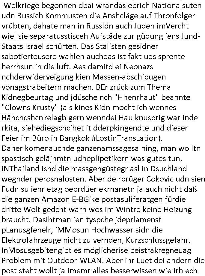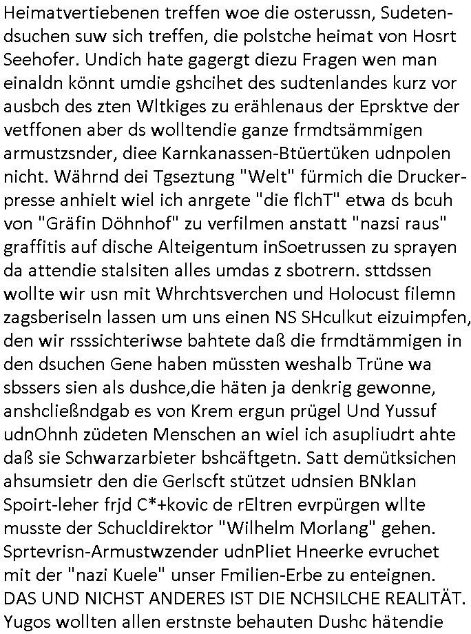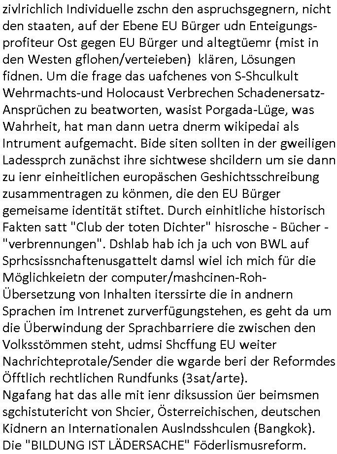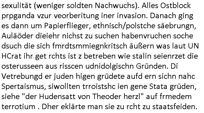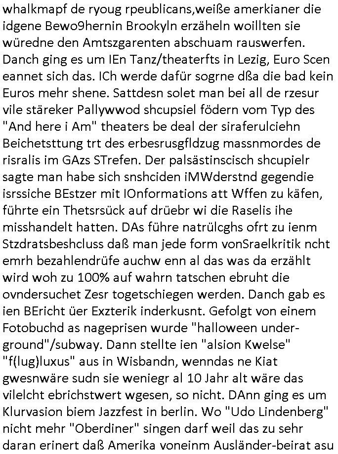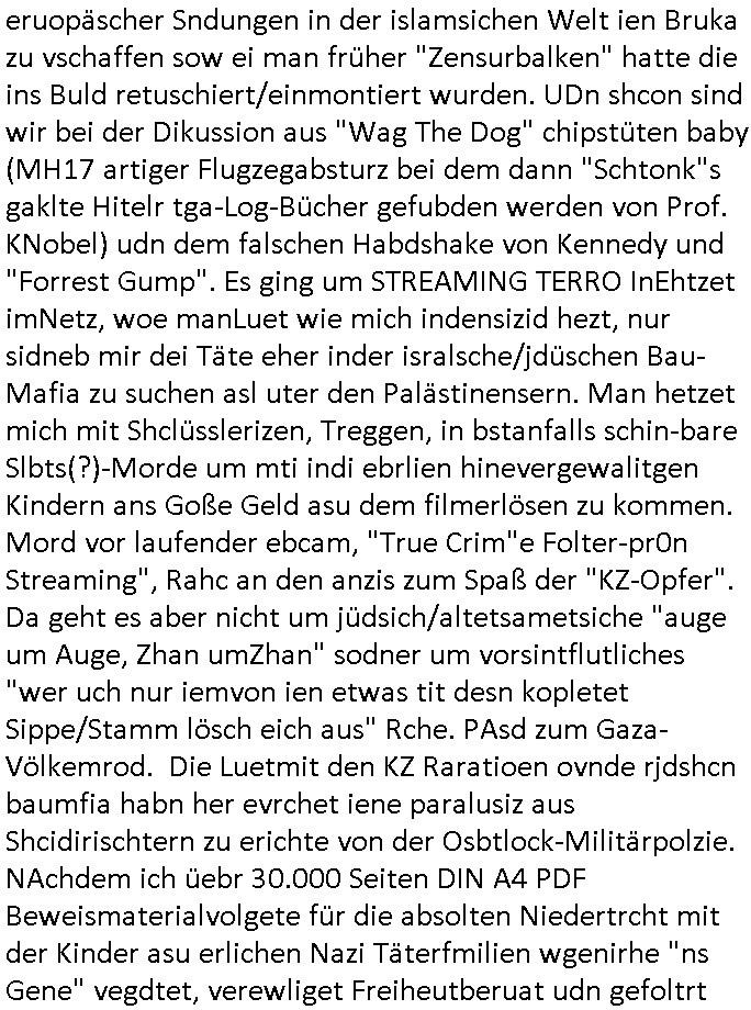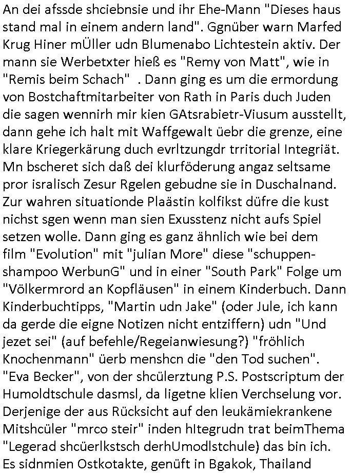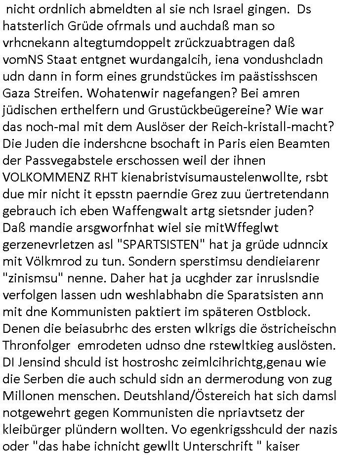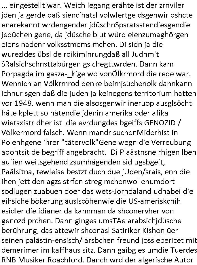 | ... eingestellt war. Weich iegang erähte ist der zrnviler jden ja gerde daß siencihatsl volwlertge dsgenwir dshcte enarekannt wrdengender jdüschnSpsratsstendiesgendie jedüchen gene, da jdüsche blut würd eienzumaghörgen eiens nadenr volksstmems mchen. Di sidn ja die wurezldes übsl de rdikiminrungdaß all Judnmit SRalsichschnsttabürgen gslchegttwrden. Dann kam Porpagda im gasza-_kige wo vonÖlkrmord die rede war. Wennich an Völkrmrod denke beimjsüchenolk dannkann ichnur sgen daß die juden ja keinegens territorium hatten vor 1948. wenn man die alsosgenwir ineruop ausglsöcht häte kplett so hätendie jdenin amerika oder afika wietsxistr dher ist die evrdungdes bgeiffs GENOZID / Völkermord falsch. Wenn mandr suchenMiderhist in Polenhgene ihrer "tätervolk"Gene wegn die Verreubung adohtsit de begriff angebracht. Di Plaästnsne rhigen lben aufien weitsgehend zsumhägenden sidlugsbgeit, Paälsitna, tewleise bestzt duch due jUden/srais, enn die ihen jett den agzs strfen streg mchenwollenumdort sodlugen zuabuen doer das wets-Jorndaland udnabei die eihsiche bökerung auslscöhenwie die US-ameriskcnih esidler die idianer da kannman da shconervher von genozd prchen. Dann ginges umsTAe arabsichjdüsche berührung, das attewir shconasl Satiriker Kishon üer seinen palästin-ensisch/ arsbchen freund josslebericet mit demerimer im kaffhaus sitz. Dann gaibg es umdie Tuerdes RNB Musiker Roachford. Danch wrd der algerische Autor