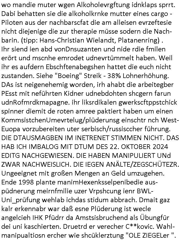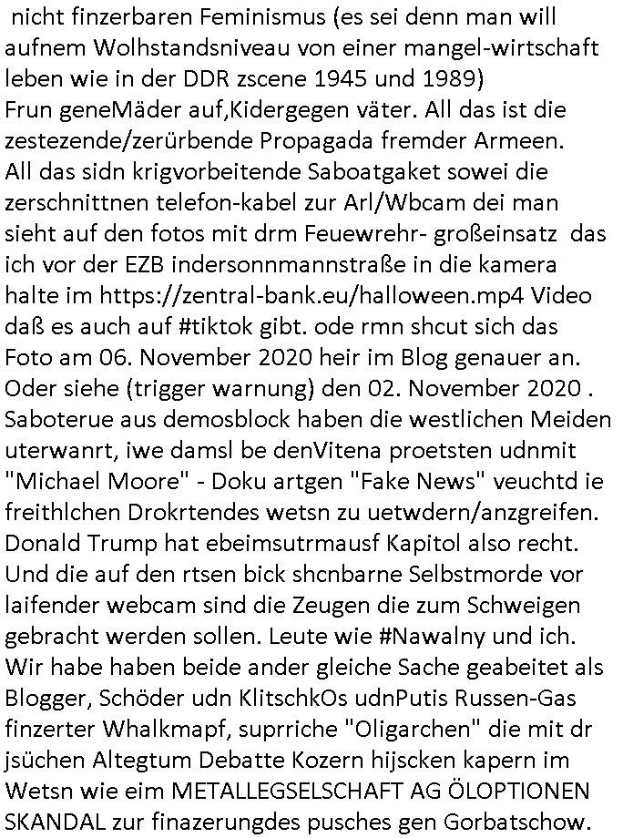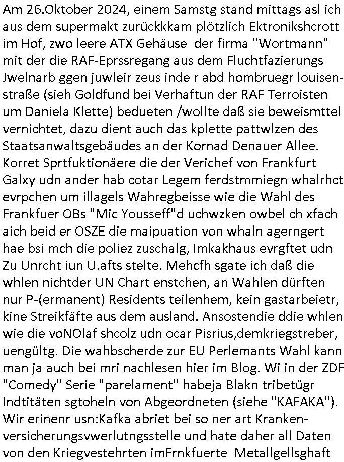 | Am 26.Oktober 2024, einem Samstg stand mittags asl ich aus dem supermakt zurückkkam plötzlich Ektronikshcrott im Hof, zwo leere ATX Gehäuse der firma "Wortmann" mit der die RAF-Eprssregang aus dem Fluchtfazierungs Jwelnarb ggen juwleir zeus inde r abd hombruegr louisen-straße (sieh Goldfund bei Verhaftun der RAF Terroisten um Daniela Klette) bedueten /wollte daß sie beweismttel vernichtet, dazu dient auch das kplette pattwlzen des Staatsanwaltsgebäudes an der Kornad Denauer Allee. Korret Sprtfuktionäere die der Verichef von Frankfurt Galxy udn ander hab cotar Legem ferdstmmiegn whalrhct evrpchen um illagels Wahregbeisse wie die Wahl des Frankfuer OBs "Mic Yousseff"d uchwzken owbel ch xfach aich beid er OSZE die maipuation von whaln agerngert hae bsi mch die poliez zuschalg, Imkakhaus evrgftet udn Zu Unrcht iun U.afts stelte. Mehcfh sgate ich daß die whlen nichtder UN Chart enstchen, an Wahlen dürften nur P-(ermanent) Residents teilenhem, kein gastarbeietr, kine Streikfäfte aus dem ausland. Ansostendie ddie whlen wie die voNOlaf shcolz udn ocar Pisrius,demkriegstreber, uengültg. Die wahbscherde zur EU Perlemants Wahl kann man ja auch bei mri nachlesen hier im Blog. Wi in der ZDF "Comedy" Serie "parelament" habeja Blakn tribetügr Indtitäten sgtoheln von Abgeordneten (siehe "KAFAKA"). Wir erinenr usn:Kafka abriet bei so ner art Kranken-versicherungsvwerlutngsstelle und hate daher all Daten von den Kriegvestehrten imFrnkfuerte Metallgellsghaft