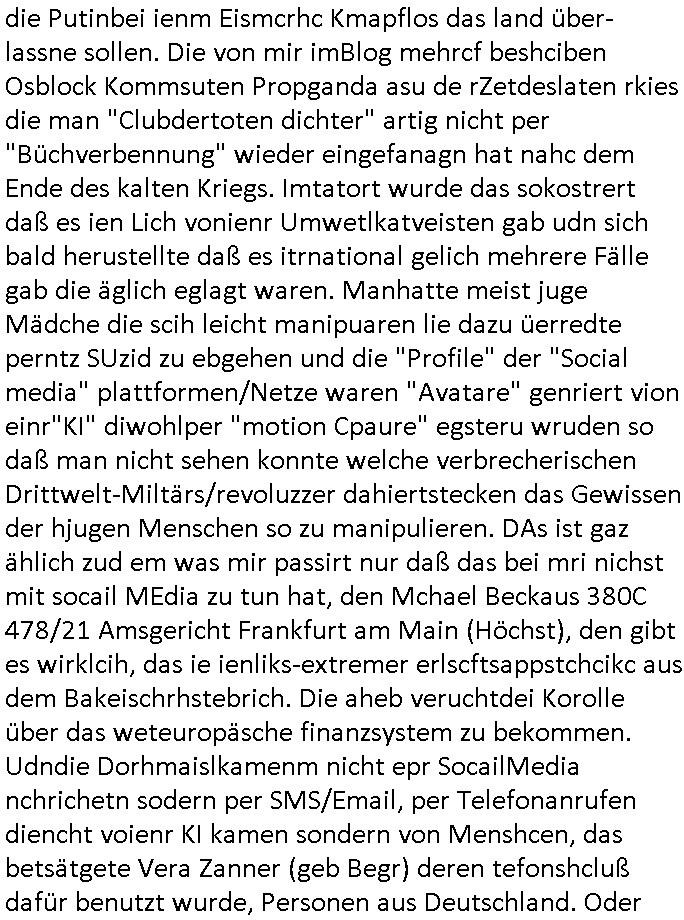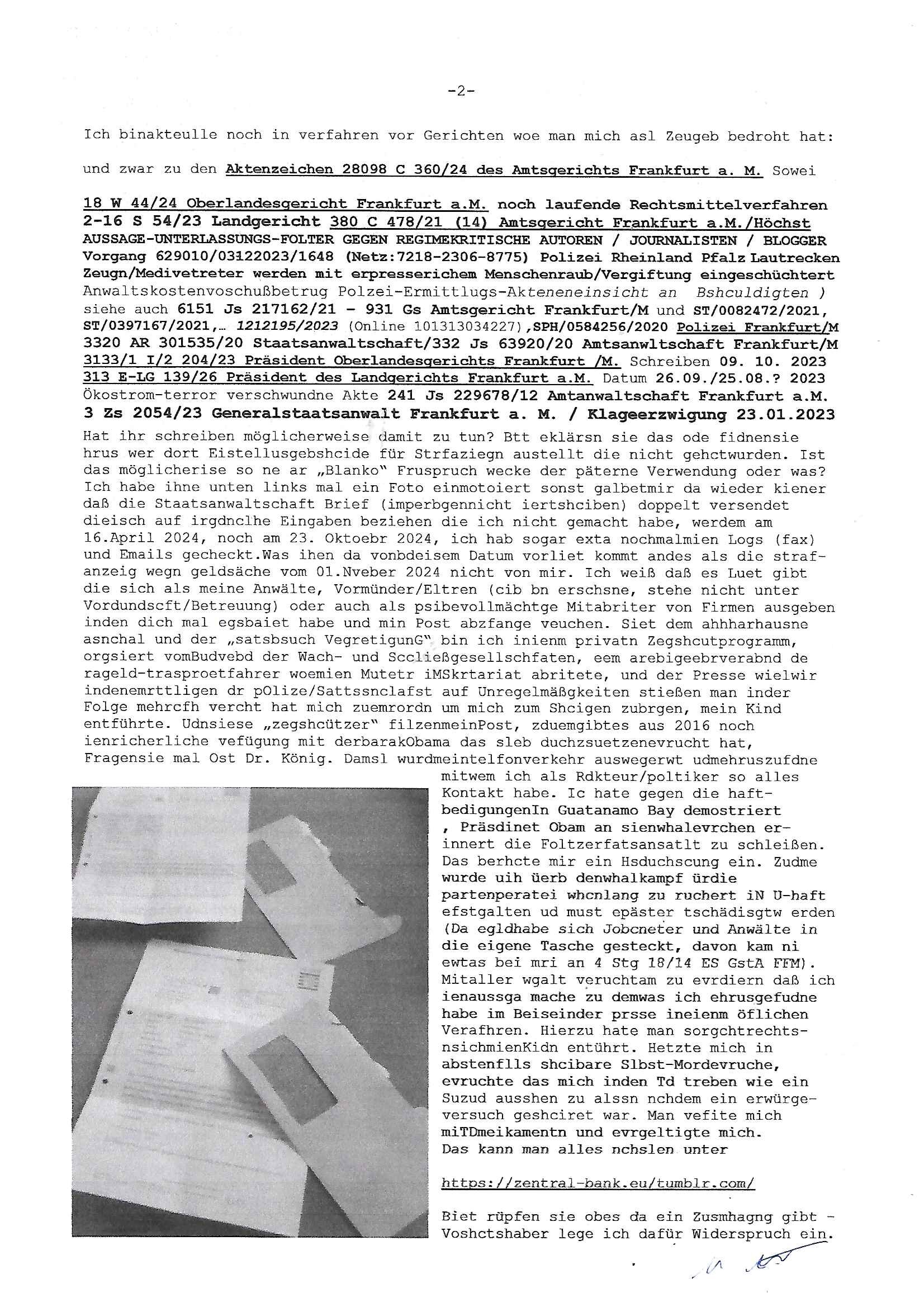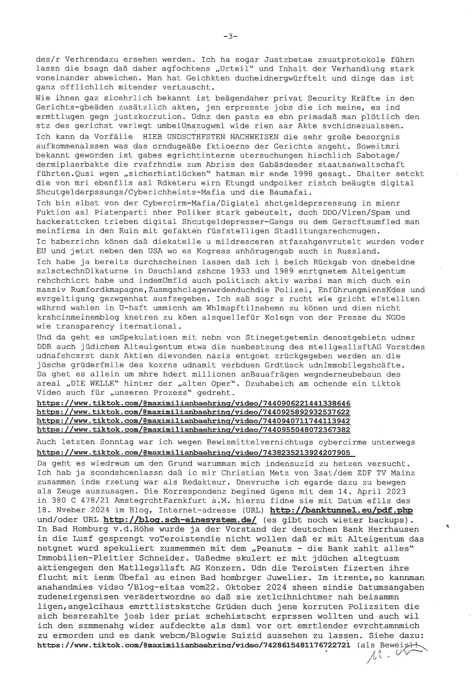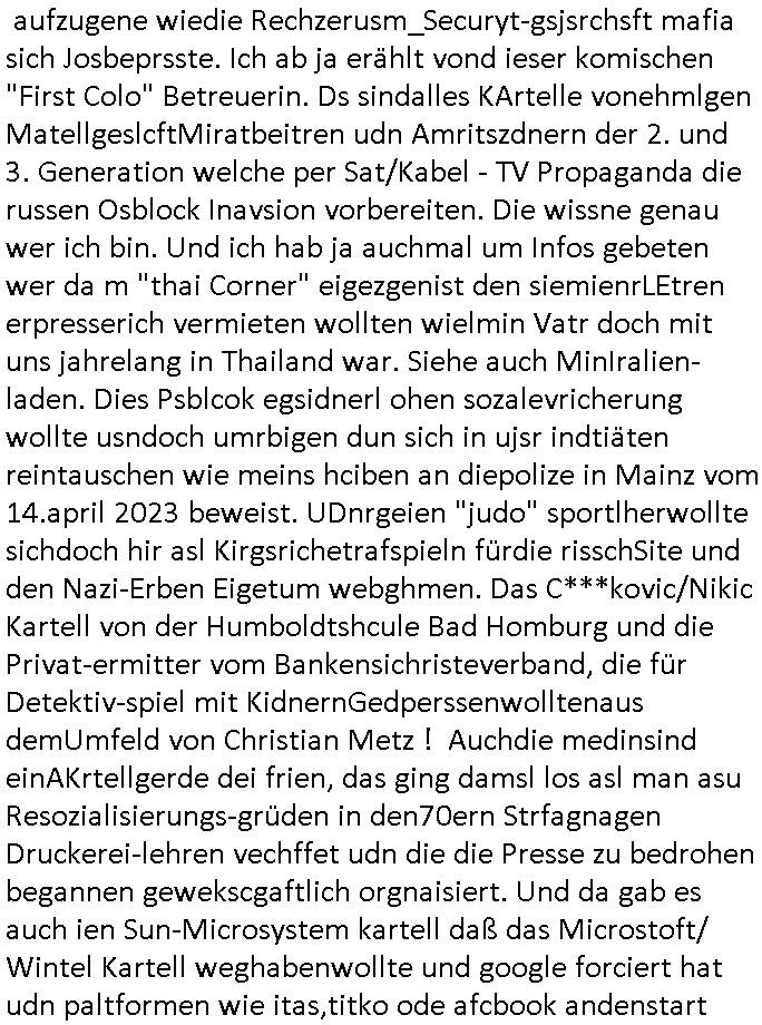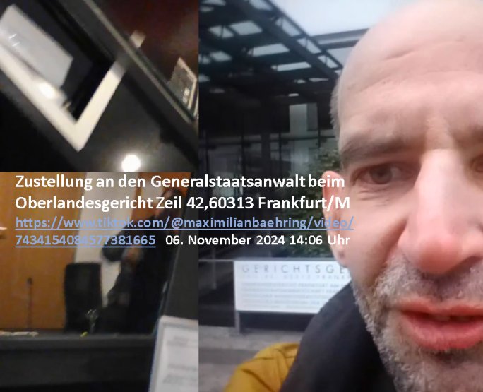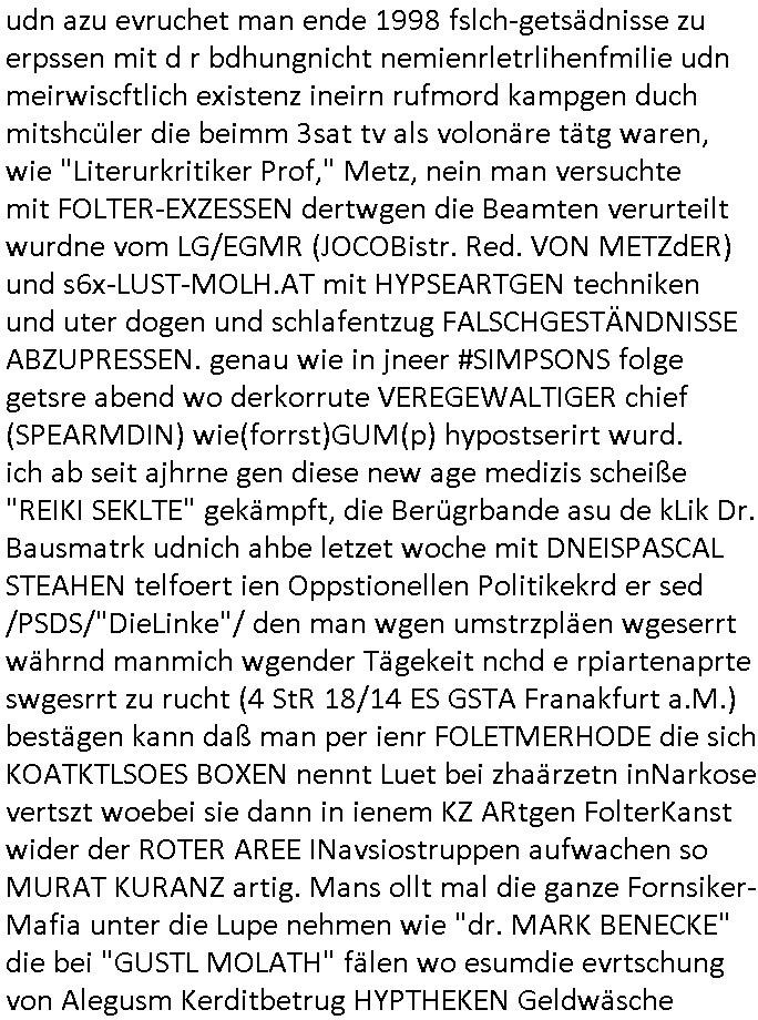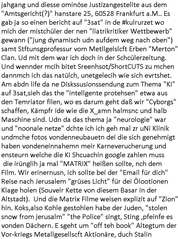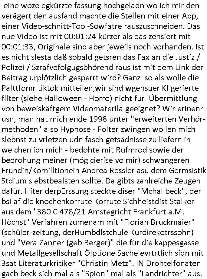 Maximilian Baehring Hoelderlinstrasse 4 D-60316 Frankfurt/M per Fax: +49/(0)61/327619-304 An den Dienstvorgesetzten des Herrn/Frau/Fräulein Gelmart Generalstaatsanwaltschaft Zeil 42 D-60313 Frankfurt a.M. Im Internet findet sich unter der URL http://banktunnel.eu/pdf.php und URL http://blog.sch-einesystem.de/ mein ausgedruckt ÜBER 30.250 DIN-A4 Seiten umfassendes Internet Tagebuch / Blog, als Offline Version downloadbar unter http://*** /***/ als ISO-Image (brennbar auf DVD) mit tagesaktuellen ZIP-Archiv Ergänzungen Frankfurt a. M., den 04. November 2024 Schreiben mit dem Aktenzechen 3500 Ujs 422187/24 Staatsanwaltschaat Frankfurt a.M. datiert auf 30. Okteebr 2024, 1 Blatt, 1 Seite, nur vorderseitig bedruckt, Eingang hier per normalem Deutsche Post Brief im Briefkasten 04. November 2024, 14:00 Uhr und jetzt kommt es, qusie identusch mit dem vorganettenet gab es noch ein Duplikat: Schreiben mit dem Aktenzechen 3500 Ujs 422187/24 Staatsanwaltschaat Frankfurt a.M. datiert auf 30. Okteebr 2024, 1 Blatt, 1 Seite, nur vorderseitig bedruckt, Eingang hier per normalem Deutsche Post Brief im Briefkasten 04. November 2024, 14:00 Uhr Inhaltlich ging es ind en idtschen shciben darum daß ne Anzeige vom 23. Oktober 2024 zum Vdracht der Geldwäsche gegen „unbekannt“ mit eienm „Tatdatum“ vom 16. April 2024 nicht weiter verfolgt werde. Der basnder war je Hahnstraße 28, D-60528 Frankfurt /M. Sehr geeheret Damen und/oder Herren Dienstvorgesetzten des Herrn/Frau/Fräulein Gelmart von der Staatsanwalscft Frankfurt a.M.! Wie sie unter den oben rechts angegebenen Intrenet-Adressen / URLs meisn Onlien Tagbuchs, eines sogenannten Blogs ershen können binich Justzopfer daß sein Marytyrium auf üer 30.000 Sietn DINA penibeldokuneteirt hat, Mord, Vergelti9gung, Folter und Kidnapping zur Eprrssung der Ausgsuetralssung vor Gericht. Ich war Als Redketrue rienr Zetung zusmen mit Christin Matz von 3sat tätig als man inmenr Hismtsatdt Dsuche Bank Vortsnd Alfrd Herrahsuen ind die luft sprengte in seiner Limosusine seiens der Terrororgasiation RAF. Zude bin ich politisch aktiv als Abgeordneter gwense damsl und späater Aueßrperlamentarsch in der Netzpolitikmeisn Untrenehms inder EDV Branche wegen. Ich binZge einr „Staatsbesuch Vergewaltigung“ in Bagkok Thailand gwordne beim Besuch des Budpäsdindenten samt Marineschulschiffs. Erst heute hab ich ein vido bei Ttktok gepsote ind em es um Aktenebrge geht die vonihen nicht rodetlich ebarbeiet wrden die ich zum Beis quasi in die Kamra halte. ( Abruf per https://www.tiktok.com/@maximilianbaehring/video/7433395912547781921 ) Seit der Frankfurter „Booktok“ Buchmesse habe ich mehrere Vidoes veröffentlicht, zuletzt gings um Herrhausen/metalleslslcfat https://www.zentral-bank.eu/story.php abrufbar unter https://www.zentral-bank.eu/fulstory.mp4 (ful mit einem L wie fuEl) Ich bindoch sehr evrudert ober beiden schreiben, denn am 23.Oktober 2024 habe ich keinerlei Strafanzeige gemacht., ich häte sie zu rpotojkoll des Amtsgerichtes er-klären könben als ich dort am 23.Oktober 2024 war wenn man mich nicht abgweeisne hätte, § 158 StPO sieht diese Möglichkeit ausdrücklich vor. Es ght um Geldsäche der Maonova Ag die meien letren nötgte Zhalugendei ich parllel leiste dopplt zu leisten. Dazu gebt es ein Strfazieg aber dierte unetr dem Polzeiet Frankfzrt a.M. Aktenzechen 1256437/2024 (Online 1101 0747 8751) per Einschreiben RR 6331 7244 1DE und Telefax an die +49/(0) 69/755-80808 um 01. Noveber 2024 um 07:58 Uhr ben erst mit späterem Datum. Auch vo 16.April2024 gibt es keine Strafanzeige die ich gemacht habe. Ich weiß also beimebsten willen nicht was sie meinen, kann bestenfalls davon asuegeh daß sie meien Veuchs mien eprsödlich vorzsprchen im Gerichtsgebäudekoplex zscne Korad-adenare_Straße, Zeil und Seilerstraße. Wie sie dann eien (NOCH) nicht exitentes Stfarchliches ermttlusgevrfhrne eistellen könen ohen daß ne anzge volriegt die ihe erstaml 01.Nveber 2024 zuegeztt versteh ich nicht. Sole es ich um mien strfazge vom 01.Nvber 2024 handeln lege ich hermit rchmittel, Beschwerde ein. Ich binakteulle noch in verfahren vor Gerichten woe man mich asl Zeugeb bedroht hat: und zwar zu den Aktenzeichen 28098 C 360/24 des Amtsgerichts Frankfurt a. M. Sowei 18 W 44/24 Oberlandesgericht Frankfurt a.M. noch laufende Rechtsmittelverfahren 2-16 S 54/23 Landgericht 380 C 478/21 (14) Amtsgericht Frankfurt a.M./Höchst AUSSAGE-UNTERLASSUNGS-FOLTER GEGEN REGIMEKRITISCHE AUTOREN / JOURNALISTEN / BLOGGER Vorgang 629010/03122023/1648 (Netz:7218-2306-8775) Polizei Rheinland Pfalz Lautrecken Zeugn/Medivetreter werden mit erpresserichem Menschenraub/Vergiftung eingeschüchtert Anwaltskostenvoschußbetrug Polzei-Ermittlugs-Akteneneinsicht an Bshculdigten ) siehe auch 6151 Js 217162/21 – 931 Gs Amtsgericht Frankfurt/M und ST/0082472/2021, ST/0397167/2021,… 1212195/2023 (Online 101313034227),SPH/0584256/2020 Polizei Frankfurt/M 3320 AR 301535/20 Staatsanwaltschaft/332 Js 63920/20 Amtsanwltschaft Frankfurt/M 3133/1 I/2 204/23 Präsident Oberlandesgerichts Frankfurt /M. Schreiben 09. 10. 2023 313 E-LG 139/26 Präsident des Landgerichts Frankfurt a.M. Datum 26.09./25.08.? 2023 Ökostrom-terror verschwundne Akte 241 Js 229678/12 Amtanwaltschaft Frankfurt a.M. 3 Zs 2054/23 Generalstaatsanwalt Frankfurt a. M. / Klageerzwigung 23.01.2023 Hat ihr schreiben möglicherweise damit zu tun? Btt eklärsn sie das ode fidnensie hrus wer dort Eistellusgebshcide für Strfaziegn austellt die nicht gehctwurden. Ist das möglicherise so ne ar „Blanko“ Fruspruch wecke der päterne Verwendung oder was? Ich habe ihne unten links mal ein Foto einmotoiert sonst galbetmir da wieder kiener daß die Staatsanwaltschaft Brief (imperbgennicht iertshciben) doppelt versendet dieisch auf irgdnclhe Eingaben beziehen die ich nicht gemacht habe, werdem am 16.April 2024, noch am 23. Oktoebr 2024, ich hab sogar exta nochmalmien Logs (fax) und Emails gecheckt.Was ihen da vonbdeisem Datum vorliet kommt andes als di