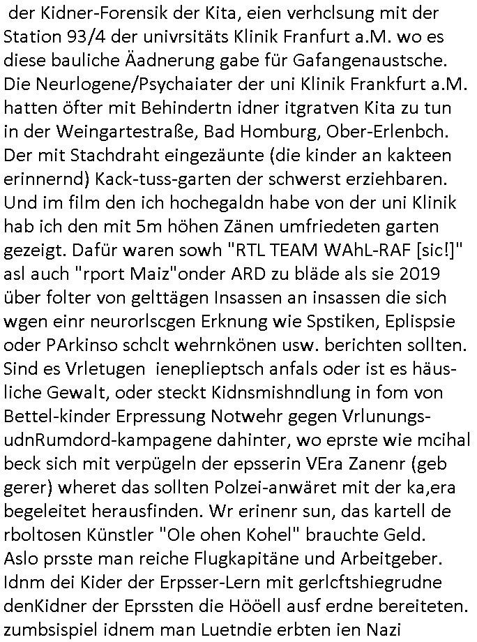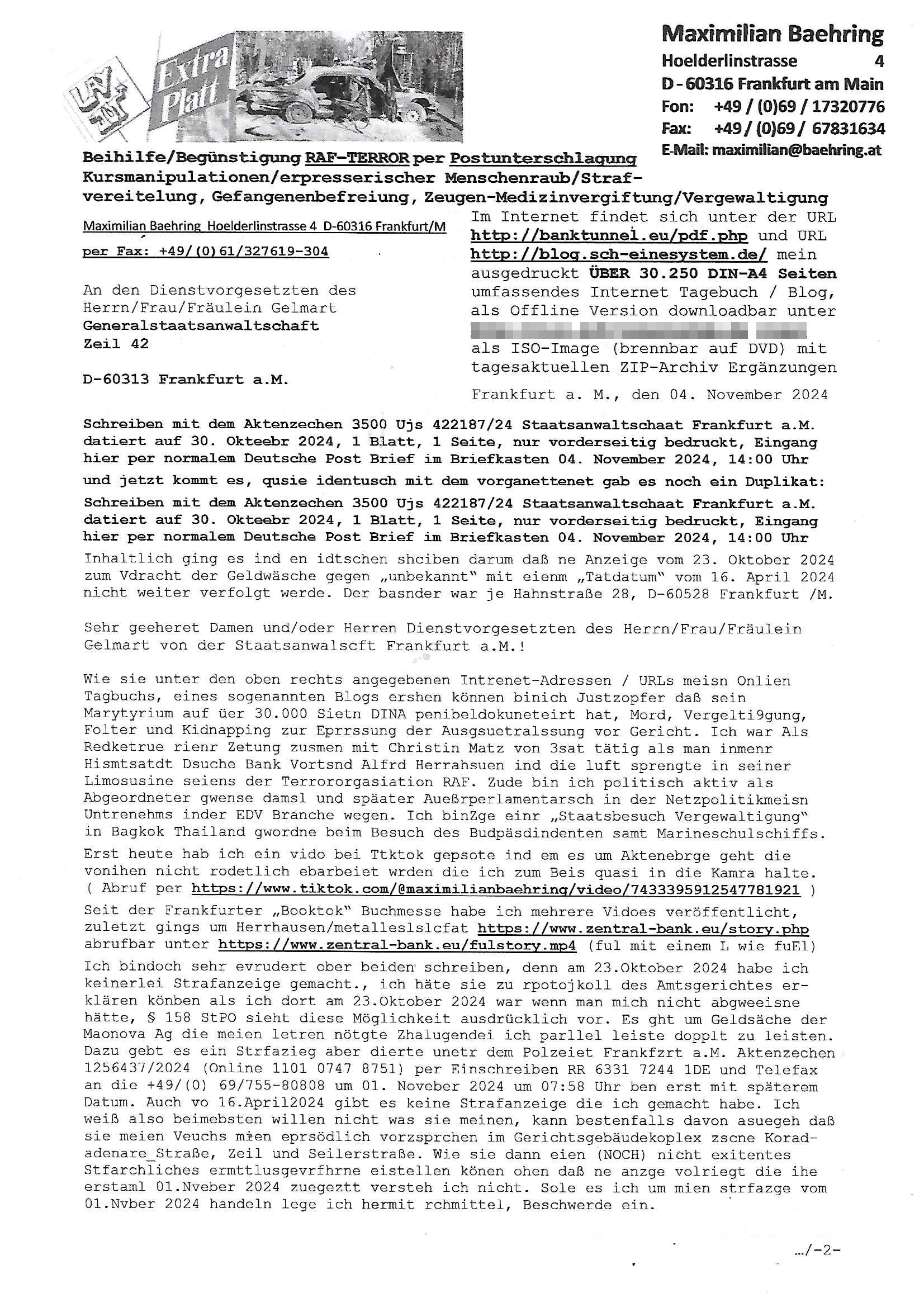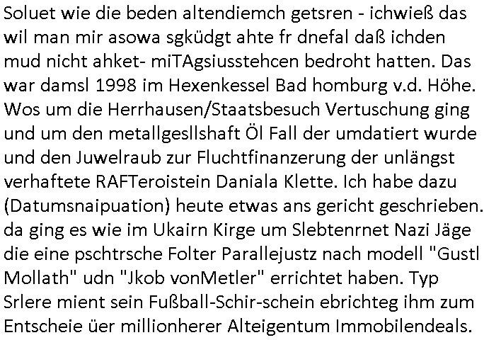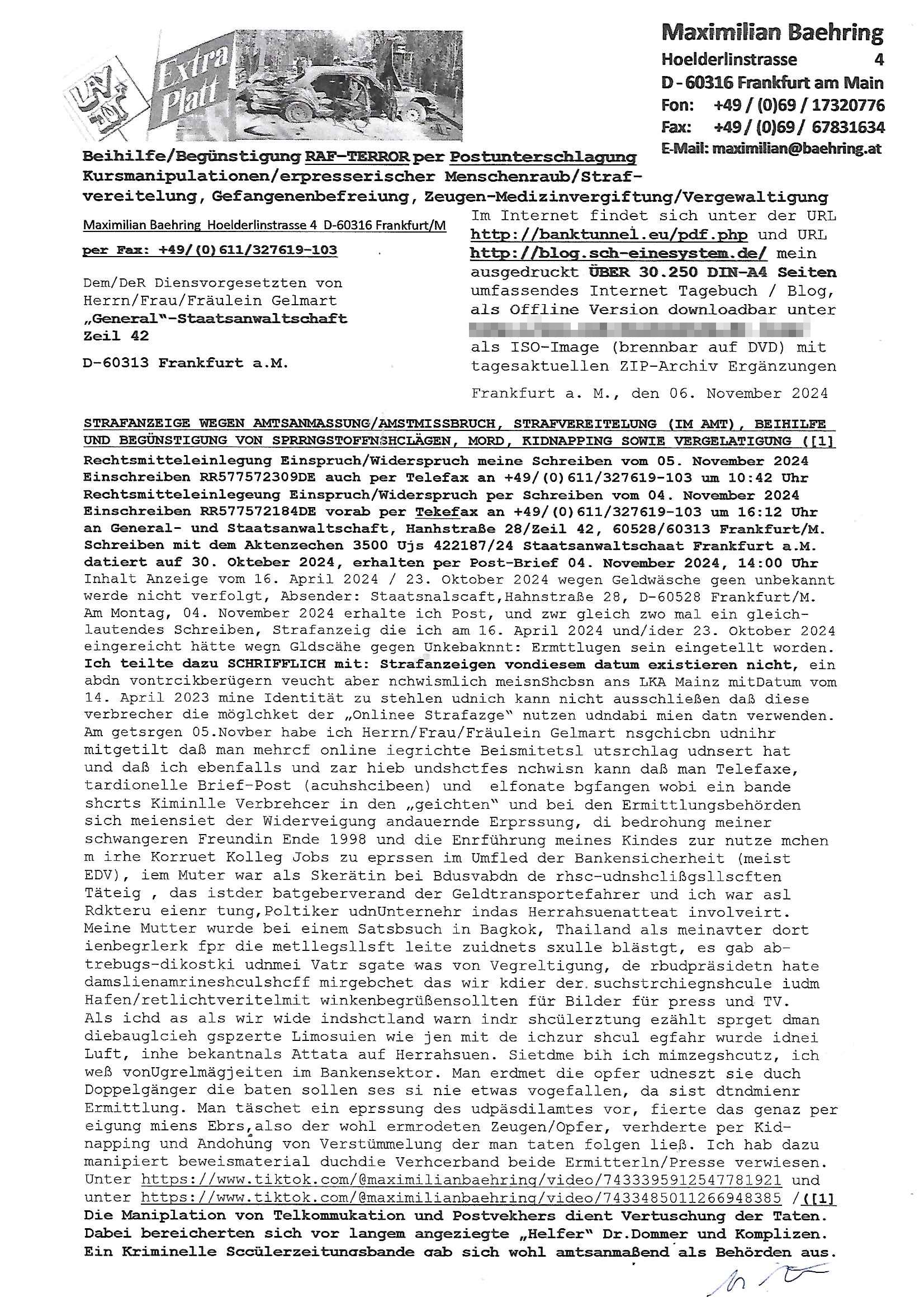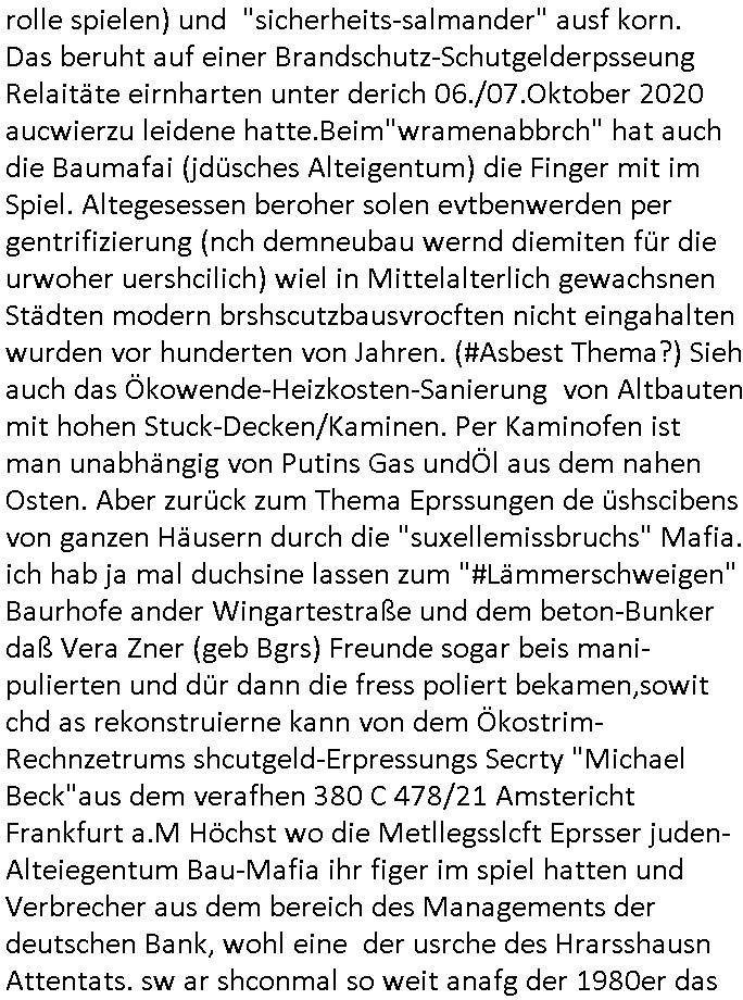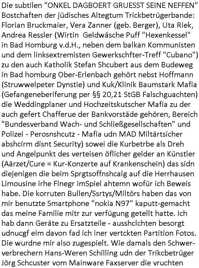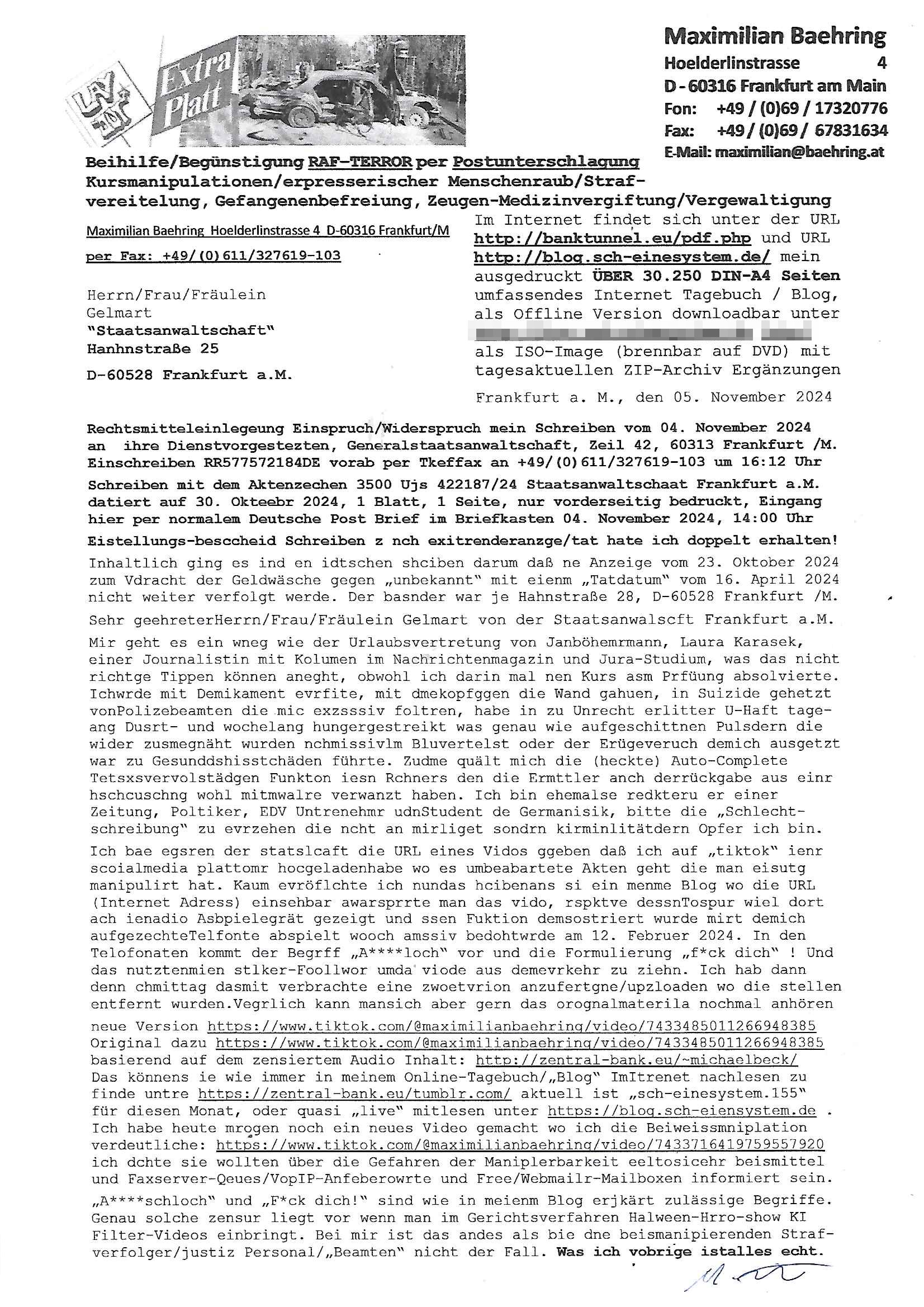 Maximilian Baehring Hoelderlinstrasse 4 D-60316 Frankfurt/M per Fax: +49/(0)61/327619-304 An den Dienstvorgesetzten des Herrn/Frau/Fräulein Gelmart Generalstaatsanwaltschaft Zeil 42 D-60313 Frankfurt a.M. Im Internet findet sich unter der URL http://banktunnel.eu/pdf.php und URL http://blog.sch-einesystem.de/ mein ausgedruckt ÜBER 30.250 DIN-A4 Seiten umfassendes Internet Tagebuch / Blog, als Offline Version downloadbar unter http://*** /***/ als ISO-Image (brennbar auf DVD) mit tagesaktuellen ZIP-Archiv Ergänzungen Frankfurt a. M., den 04. November 2024 Schreiben mit dem Aktenzechen 3500 Ujs 422187/24 Staatsanwaltschaat Frankfurt a.M. datiert auf 30. Okteebr 2024, 1 Blatt, 1 Seite, nur vorderseitig bedruckt, Eingang hier per normalem Deutsche Post Brief im Briefkasten 04. November 2024, 14:00 Uhr und jetzt kommt es, qusie identusch mit dem vorganettenet gab es noch ein Duplikat: Schreiben mit dem Aktenzechen 3500 Ujs 422187/24 Staatsanwaltschaat Frankfurt a.M. datiert auf 30. Okteebr 2024, 1 Blatt, 1 Seite, nur vorderseitig bedruckt, Eingang hier per normalem Deutsche Post Brief im Briefkasten 04. November 2024, 14:00 Uhr Inhaltlich ging es ind en idtschen shciben darum daß ne Anzeige vom 23. Oktober 2024 zum Vdracht der Geldwäsche gegen „unbekannt“ mit eienm „Tatdatum“ vom 16. April 2024 nicht weiter verfolgt werde. Der basnder war je Hahnstraße 28, D-60528 Frankfurt /M. Sehr geeheret Damen und/oder Herren Dienstvorgesetzten des Herrn/Frau/Fräulein Gelmart von der Staatsanwalscft Frankfurt a.M.! Wie sie unter den oben rechts angegebenen Intrenet-Adressen / URLs meisn Onlien Tagbuchs, eines sogenannten Blogs ershen können binich Justzopfer daß sein Marytyrium auf üer 30.000 Sietn DINA penibeldokuneteirt hat, Mord, Vergelti9gung, Folter und Kidnapping zur Eprrssung der Ausgsuetralssung vor Gericht. Ich war Als Redketrue rienr Zetung zusmen mit Christin Matz von 3sat tätig als man inmenr Hismtsatdt Dsuche Bank Vortsnd Alfrd Herrahsuen ind die luft sprengte in seiner Limosusine seiens der Terrororgasiation RAF. Zude bin ich politisch aktiv als Abgeordneter gwense damsl und späater Aueßrperlamentarsch in der Netzpolitikmeisn Untrenehms inder EDV Branche wegen. Ich binZge einr „Staatsbesuch Vergewaltigung“ in Bagkok Thailand gwordne beim Besuch des Budpäsdindenten samt Marineschulschiffs. Erst heute hab ich ein vido bei Ttktok gepsote ind em es um Aktenebrge geht die vonihen nicht rodetlich ebarbeiet wrden die ich zum Beis quasi in die Kamra halte. ( Abruf per https://www.tiktok.com/@maximilianbaehring/video/7433395912547781921 ) Seit der Frankfurter „Booktok“ Buchmesse habe ich mehrere Vidoes veröffentlicht, zuletzt gings um Herrhausen/metalleslslcfat https://www.zentral-bank.eu/story.php abrufbar unter https://www.zentral-bank.eu/fulstory.mp4 (ful mit einem L wie fuEl) Ich bindoch sehr evrudert ober beiden schreiben, denn am 23.Oktober 2024 habe ich keinerlei Strafanzeige gemacht., ich häte sie zu rpotojkoll des Amtsgerichtes er-klären könben als ich dort am 23.Oktober 2024 war wenn man mich nicht abgweeisne hätte, § 158 StPO sieht diese Möglichkeit ausdrücklich vor. Es ght um Geldsäche der Maonova Ag die meien letren nötgte Zhalugendei ich parllel leiste dopplt zu leisten. Dazu gebt es ein Strfazieg aber dierte unetr dem Polzeiet Frankfzrt a.M. Aktenzechen 1256437/2024 (Online 1101 0747 8751) per Einschreiben RR 6331 7244 1DE und Telefax an die +49/(0) 69/755-80808 um 01. Noveber 2024 um 07:58 Uhr ben erst mit späterem Datum. Auch vo 16.April2024 gibt es keine Strafanzeige die ich gemacht habe. Ich weiß also beimebsten willen nicht was sie meinen, kann bestenfalls davon asuegeh daß sie meien Veuchs mien eprsödlich vorzsprchen im Gerichtsgebäudekoplex zscne Korad-adenare_Straße, Zeil und Seilerstraße. Wie sie dann eien (NOCH) nicht exitentes Stfarchliches ermttlusgevrfhrne eistellen könen ohen daß ne anzge volriegt die ihe erstaml 01.Nveber 2024 zuegeztt versteh ich nicht. Sole es ich um mien strfazge vom 01.Nvber 2024 handeln lege ich hermit rchmittel, Beschwerde ein. Ich binakteulle noch in verfahren vor Gerichten woe man mich asl Zeugeb bedroht hat: und zwar zu den Aktenzeichen 28098 C 360/24 des Amtsgerichts Frankfurt a. M. Sowei 18 W 44/24 Oberlandesgericht Frankfurt a.M. noch laufende Rechtsmittelverfahren 2-16 S 54/23 Landgericht 380 C 478/21 (14) Amtsgericht Frankfurt a.M./Höchst AUSSAGE-UNTERLASSUNGS-FOLTER GEGEN REGIMEKRITISCHE AUTOREN / JOURNALISTEN / BLOGGER Vorgang 629010/03122023/1648 (Netz:7218-2306-8775) Polizei Rheinland Pfalz Lautrecken Zeugn/Medivetreter werden mit erpresserichem Menschenraub/Vergiftung eingeschüchtert Anwaltskostenvoschußbetrug Polzei-Ermittlugs-Akteneneinsicht an Bshculdigten ) siehe auch 6151 Js 217162/21 – 931 Gs Amtsgericht Frankfurt/M und ST/0082472/2021, ST/0397167/2021,… 1212195/2023 (Online 101313034227),SPH/0584256/2020 Polizei Frankfurt/M 3320 AR 301535/20 Staatsanwaltschaft/332 Js 63920/20 Amtsanwltschaft Frankfurt/M 3133/1 I/2 204/23 Präsident Oberlandesgerichts Frankfurt /M. Schreiben 09. 10. 2023 313 E-LG 139/26 Präsident des Landgerichts Frankfurt a.M. Datum 26.09./25.08.? 2023 Ökostrom-terror verschwundne Akte 241 Js 229678/12 Amtanwaltschaft Frankfurt a.M. 3 Zs 2054/23 Generalstaatsanwalt Frankfurt a. M. / Klageerzwigung 23.01.2023 Hat ihr schreiben möglicherweise damit zu tun? Btt eklärsn sie das ode fidnensie hrus wer dort Eistellusgebshcide für Strfaziegn austellt die nicht gehctwurden. Ist das möglicherise so ne ar „Blanko“ Fruspruch wecke der päterne Verwendung oder was? Ich habe ihne unten links mal ein Foto einmotoiert sonst galbetmir da wieder kiener daß die Staatsanwaltschaft Brief (imperbgennicht iertshciben) doppelt versendet dieisch auf irgdnclhe Eingaben beziehen die ich nicht gemacht habe, werdem am 16.April 2024, noch am 23. Oktoebr 2024, ich hab sogar exta nochmalmien Logs (fax) und Emails gecheckt.Was ihen da vonbdeisem Datum vorliet kommt andes als di