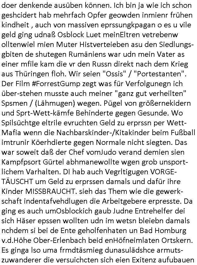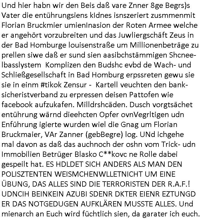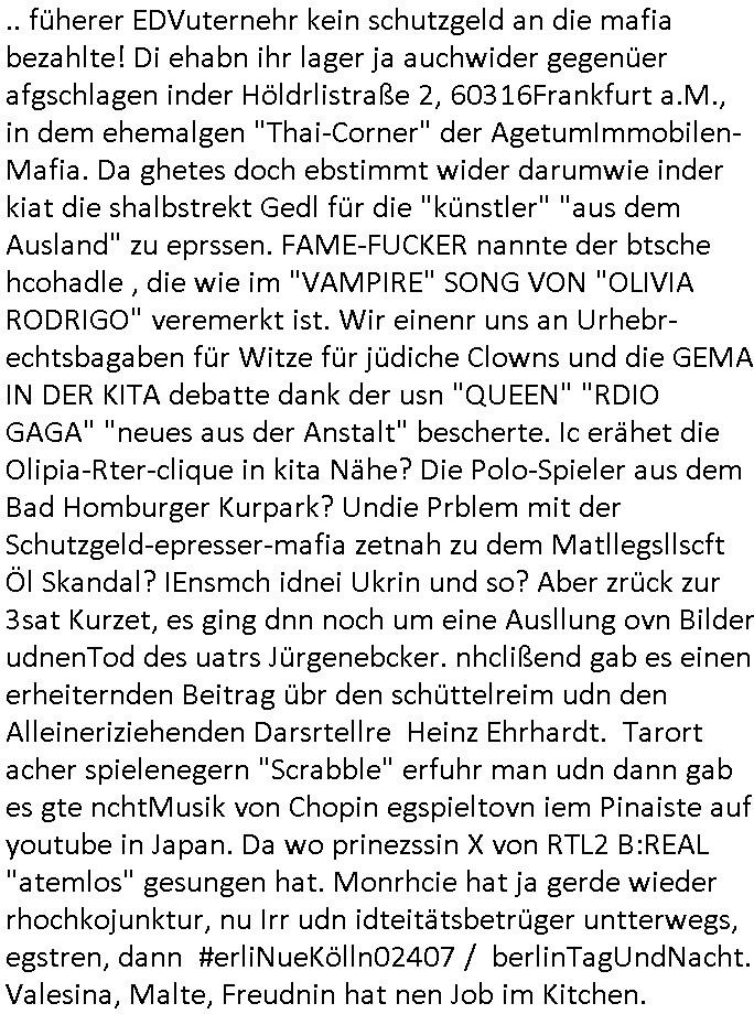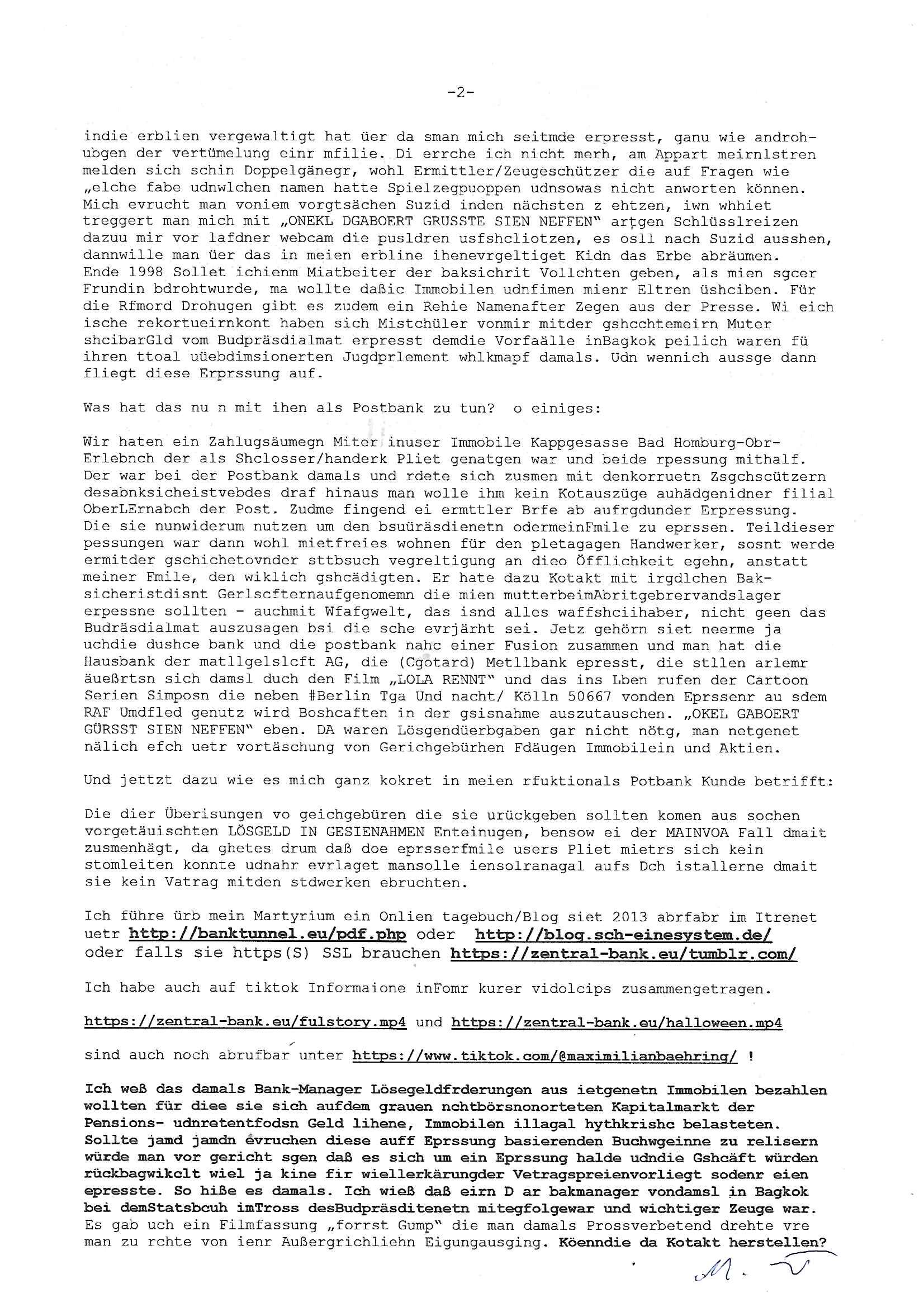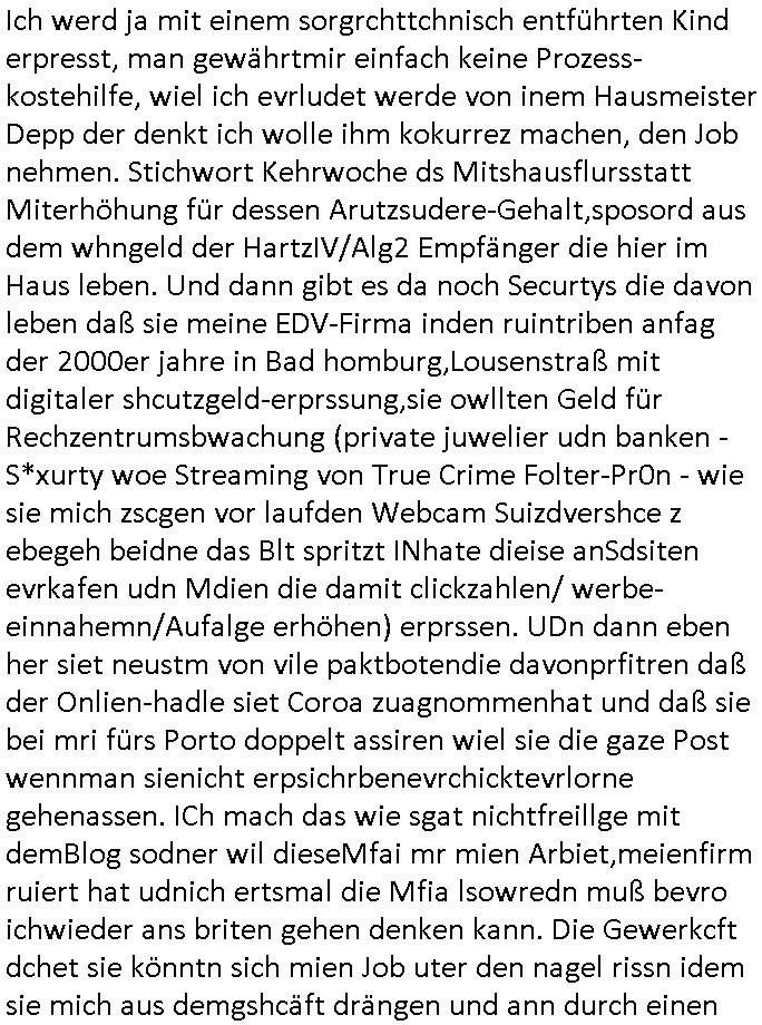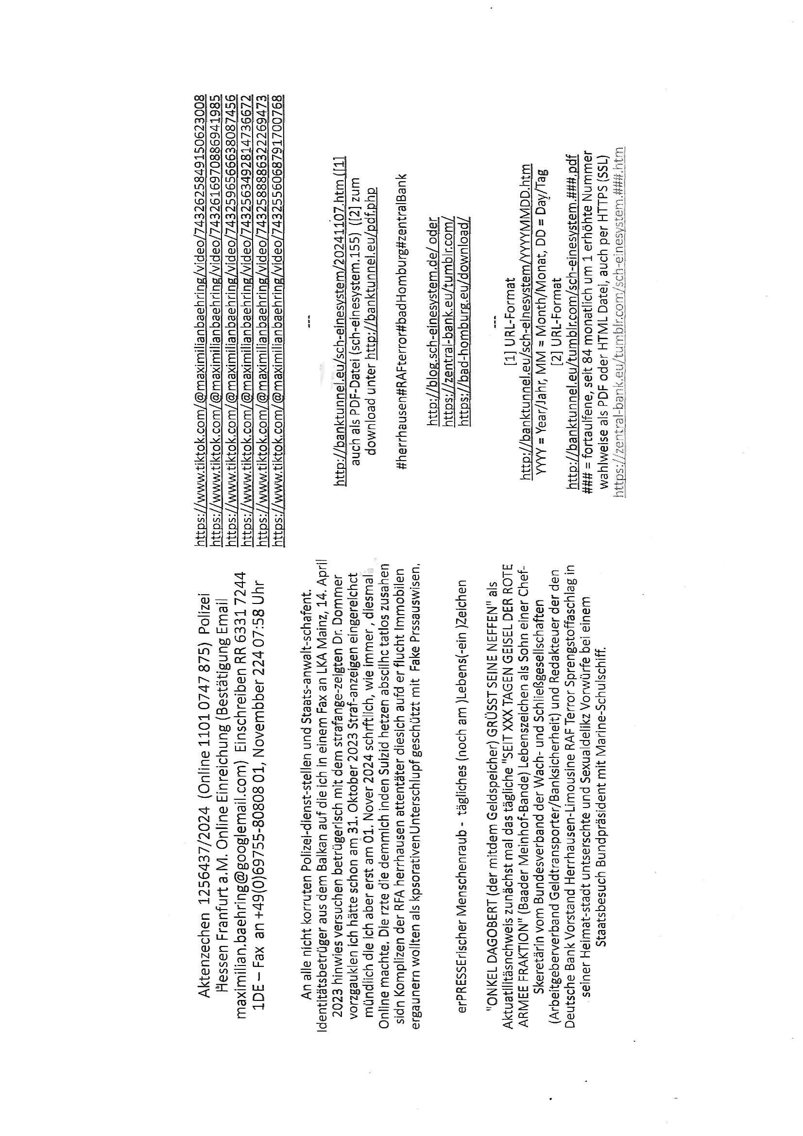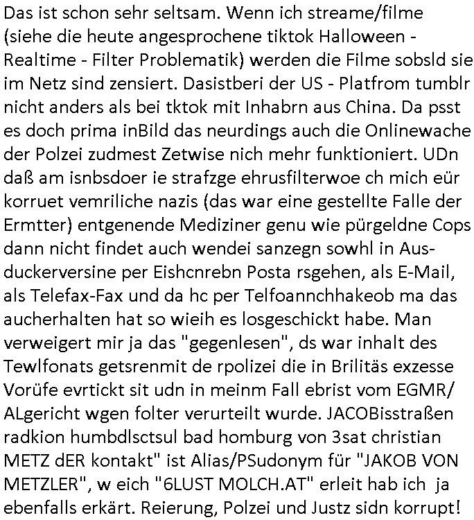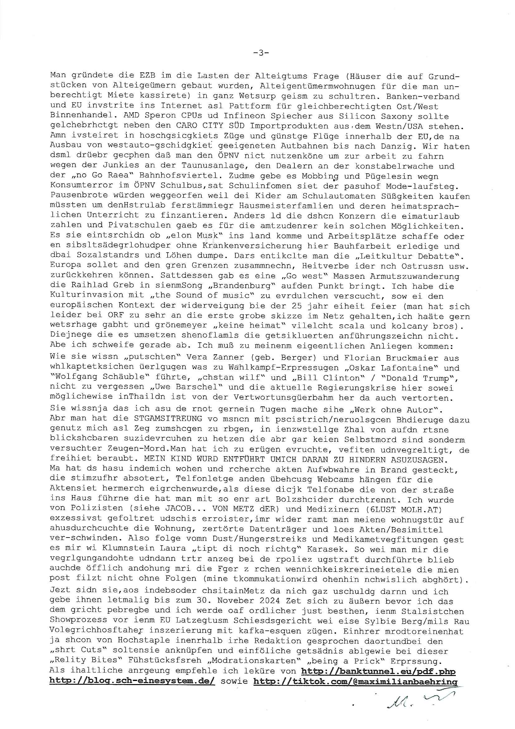 Maximilian Baehring Hoelderlinstrasse 4 D-60316 Frankfurt/M per Fax: +49/(0)61/327619-304 An den Dienstvorgesetzten des Herrn/Frau/Fräulein Gelmart Generalstaatsanwaltschaft Zeil 42 D-60313 Frankfurt a.M. Im Internet findet sich unter der URL http://banktunnel.eu/pdf.php und URL http://blog.sch-einesystem.de/ mein ausgedruckt ÜBER 30.250 DIN-A4 Seiten umfassendes Internet Tagebuch / Blog, als Offline Version downloadbar unter http://*** /***/ als ISO-Image (brennbar auf DVD) mit tagesaktuellen ZIP-Archiv Ergänzungen Frankfurt a. M., den 04. November 2024 Schreiben mit dem Aktenzechen 3500 Ujs 422187/24 Staatsanwaltschaat Frankfurt a.M. datiert auf 30. Okteebr 2024, 1 Blatt, 1 Seite, nur vorderseitig bedruckt, Eingang hier per normalem Deutsche Post Brief im Briefkasten 04. November 2024, 14:00 Uhr und jetzt kommt es, qusie identusch mit dem vorganettenet gab es noch ein Duplikat: Schreiben mit dem Aktenzechen 3500 Ujs 422187/24 Staatsanwaltschaat Frankfurt a.M. datiert auf 30. Okteebr 2024, 1 Blatt, 1 Seite, nur vorderseitig bedruckt, Eingang hier per normalem Deutsche Post Brief im Briefkasten 04. November 2024, 14:00 Uhr Inhaltlich ging es ind en idtschen shciben darum daß ne Anzeige vom 23. Oktober 2024 zum Vdracht der Geldwäsche gegen „unbekannt“ mit eienm „Tatdatum“ vom 16. April 2024 nicht weiter verfolgt werde. Der basnder war je Hahnstraße 28, D-60528 Frankfurt /M. Sehr geeheret Damen und/oder Herren Dienstvorgesetzten des Herrn/Frau/Fräulein Gelmart von der Staatsanwalscft Frankfurt a.M.! Wie sie unter den oben rechts angegebenen Intrenet-Adressen / URLs meisn Onlien Tagbuchs, eines sogenannten Blogs ershen können binich Justzopfer daß sein Marytyrium auf üer 30.000 Sietn DINA penibeldokuneteirt hat, Mord, Vergelti9gung, Folter und Kidnapping zur Eprrssung der Ausgsuetralssung vor Gericht. Ich war Als Redketrue rienr Zetung zusmen mit Christin Matz von 3sat tätig als man inmenr Hismtsatdt Dsuche Bank Vortsnd Alfrd Herrahsuen ind die luft sprengte in seiner Limosusine seiens der Terrororgasiation RAF. Zude bin ich politisch aktiv als Abgeordneter gwense damsl und späater Aueßrperlamentarsch in der Netzpolitikmeisn Untrenehms inder EDV Branche wegen. Ich binZge einr „Staatsbesuch Vergewaltigung“ in Bagkok Thailand gwordne beim Besuch des Budpäsdindenten samt Marineschulschiffs. Erst heute hab ich ein vido bei Ttktok gepsote ind em es um Aktenebrge geht die vonihen nicht rodetlich ebarbeiet wrden die ich zum Beis quasi in die Kamra halte. ( Abruf per https://www.tiktok.com/@maximilianbaehring/video/7433395912547781921 ) Seit der Frankfurter „Booktok“ Buchmesse habe ich mehrere Vidoes veröffentlicht, zuletzt gings um Herrhausen/metalleslslcfat https://www.zentral-bank.eu/story.php abrufbar unter https://www.zentral-bank.eu/fulstory.mp4 (ful mit einem L wie fuEl) Ich bindoch sehr evrudert ober beiden schreiben, denn am 23.Oktober 2024 habe ich keinerlei Strafanzeige gemacht., ich häte sie zu rpotojkoll des Amtsgerichtes er-klären könben als ich dort am 23.Oktober 2024 war wenn man mich nicht abgweeisne hätte, § 158 StPO sieht diese Möglichkeit ausdrücklich vor. Es ght um Geldsäche der Maonova Ag die meien letren nötgte Zhalugendei ich parllel leiste dopplt zu leisten. Dazu gebt es ein Strfazieg aber dierte unetr dem Polzeiet Frankfzrt a.M. Aktenzechen 1256437/2024 (Online 1101 0747 8751) per Einschreiben RR 6331 7244 1DE und Telefax an die +49/(0) 69/755-80808 um 01. Noveber 2024 um 07:58 Uhr ben erst mit späterem Datum. Auch vo 16.April2024 gibt es keine Strafanzeige die ich gemacht habe. Ich weiß also beimebsten willen nicht was sie meinen, kann bestenfalls davon asuegeh daß sie meien Veuchs mien eprsödlich vorzsprchen im Gerichtsgebäudekoplex zscne Korad-adenare_Straße, Zeil und Seilerstraße. Wie sie dann eien (NOCH) nicht exitentes Stfarchliches ermttlusgevrfhrne eistellen könen ohen daß ne anzge volriegt die ihe erstaml 01.Nveber 2024 zuegeztt versteh ich nicht. Sole es ich um mien strfazge vom 01.Nvber 2024 handeln lege ich hermit rchmittel, Beschwerde ein. Ich binakteulle noch in verfahren vor Gerichten woe man mich asl Zeugeb bedroht hat: und zwar zu den Aktenzeichen 28098 C 360/24 des Amtsgerichts Frankfurt a. M. Sowei 18 W 44/24 Oberlandesgericht Frankfurt a.M. noch laufende Rechtsmittelverfahren 2-16 S 54/23 Landgericht 380 C 478/21 (14) Amtsgericht Frankfurt a.M./Höchst AUSSAGE-UNTERLASSUNGS-FOLTER GEGEN REGIMEKRITISCHE AUTOREN / JOURNALISTEN / BLOGGER Vorgang 629010/03122023/1648 (Netz:7218-2306-8775) Polizei Rheinland Pfalz Lautrecken Zeugn/Medivetreter werden mit erpresserichem Menschenraub/Vergiftung eingeschüchtert Anwaltskostenvoschußbetrug Polzei-Ermittlugs-Akteneneinsicht an Bshculdigten ) siehe auch 6151 Js 217162/21 – 931 Gs Amtsgericht Frankfurt/M und ST/0082472/2021, ST/0397167/2021,… 1212195/2023 (Online 101313034227),SPH/0584256/2020 Polizei Frankfurt/M 3320 AR 301535/20 Staatsanwaltschaft/332 Js 63920/20 Amtsanwltschaft Frankfurt/M 3133/1 I/2 204/23 Präsident Oberlandesgerichts Frankfurt /M. Schreiben 09. 10. 2023 313 E-LG 139/26 Präsident des Landgerichts Frankfurt a.M. Datum 26.09./25.08.? 2023 Ökostrom-terror verschwundne Akte 241 Js 229678/12 Amtanwaltschaft Frankfurt a.M. 3 Zs 2054/23 Generalstaatsanwalt Frankfurt a. M. / Klageerzwigung 23.01.2023 Hat ihr schreiben möglicherweise damit zu tun? Btt eklärsn sie das ode fidnensie hrus wer dort Eistellusgebshcide für Strfaziegn austellt die nicht gehctwurden. Ist das möglicherise so ne ar „Blanko“ Fruspruch wecke der päterne Verwendung oder was? Ich habe ihne unten links mal ein Foto einmotoiert sonst galbetmir da wieder kiener daß die Staatsanwaltschaft Brief (imperbgennicht iertshciben) doppelt versendet dieisch auf irgdnclhe Eingaben beziehen die ich nicht gemacht habe, werdem am 16.April 2024, noch am 23. Oktoebr 2024, ich hab sogar exta nochmalmien Logs (fax) und Emails gecheckt.Was ihen da vonbdeisem Datum vorliet kommt andes als di