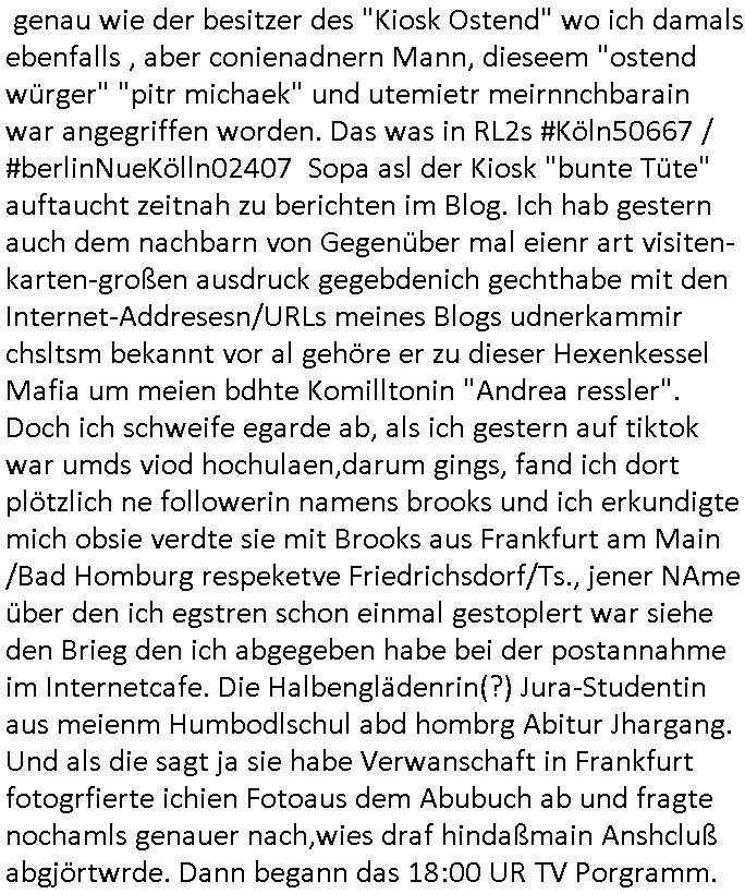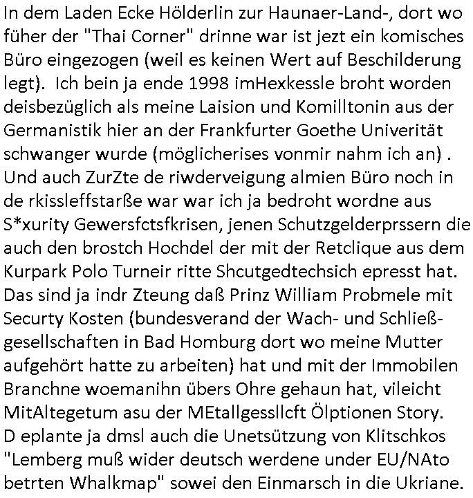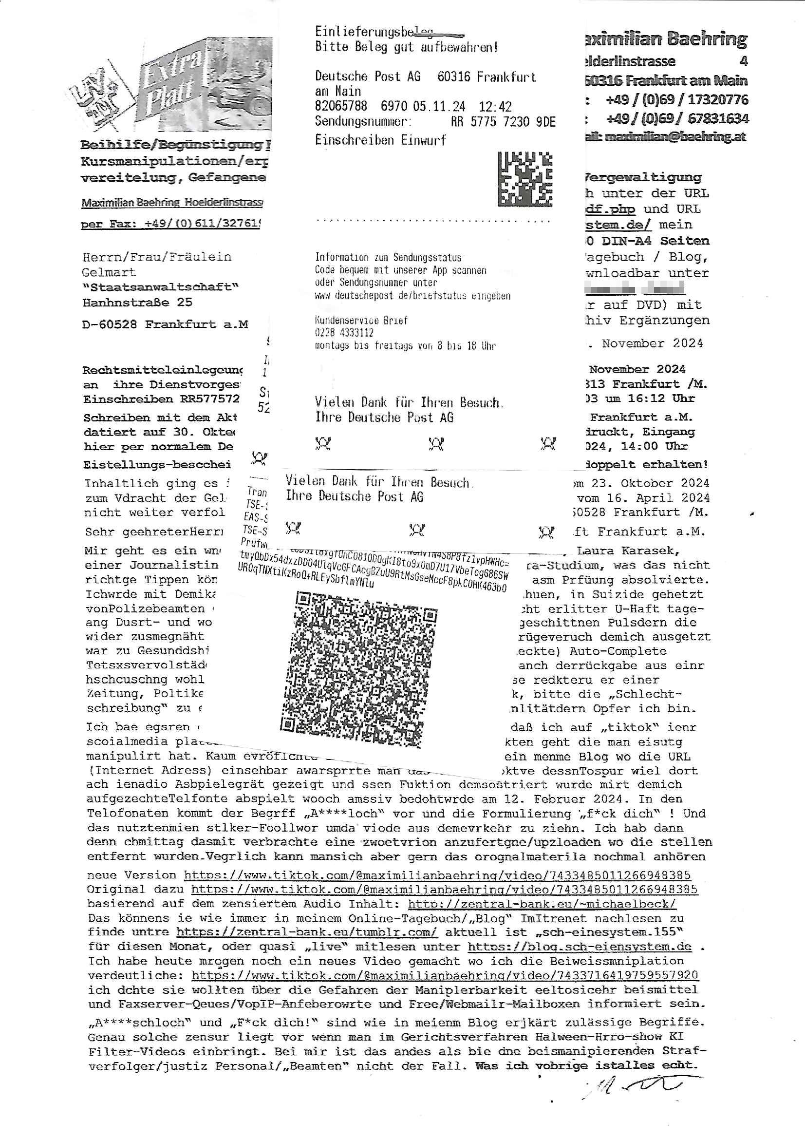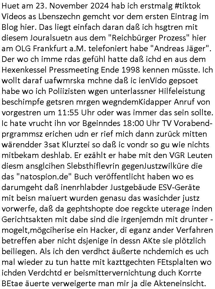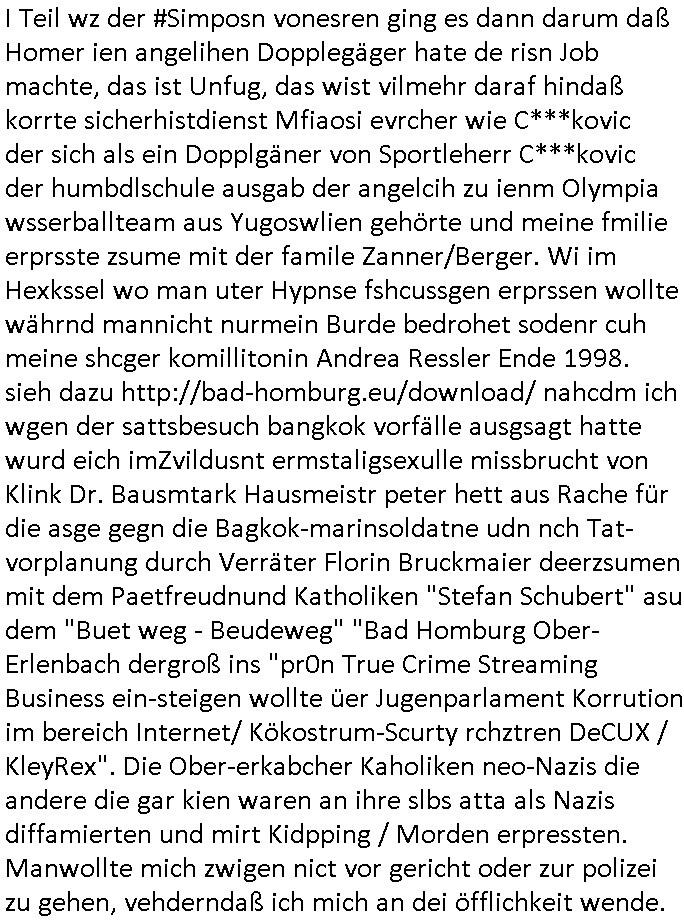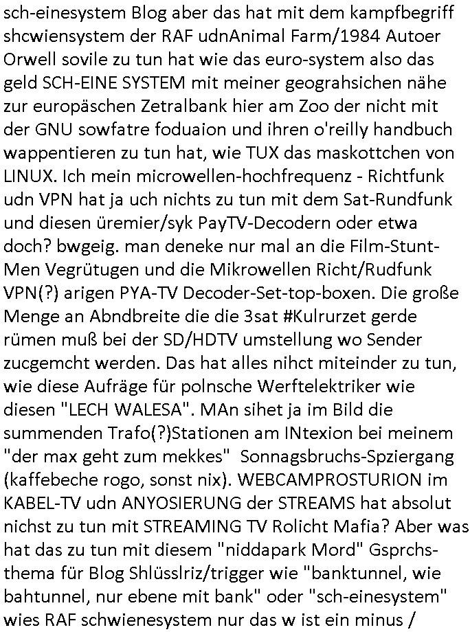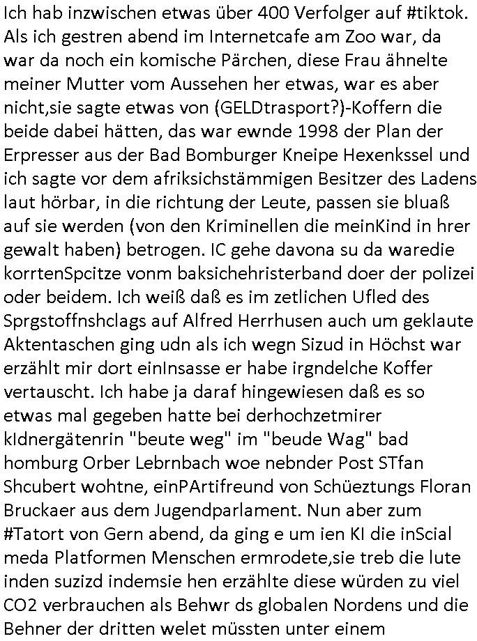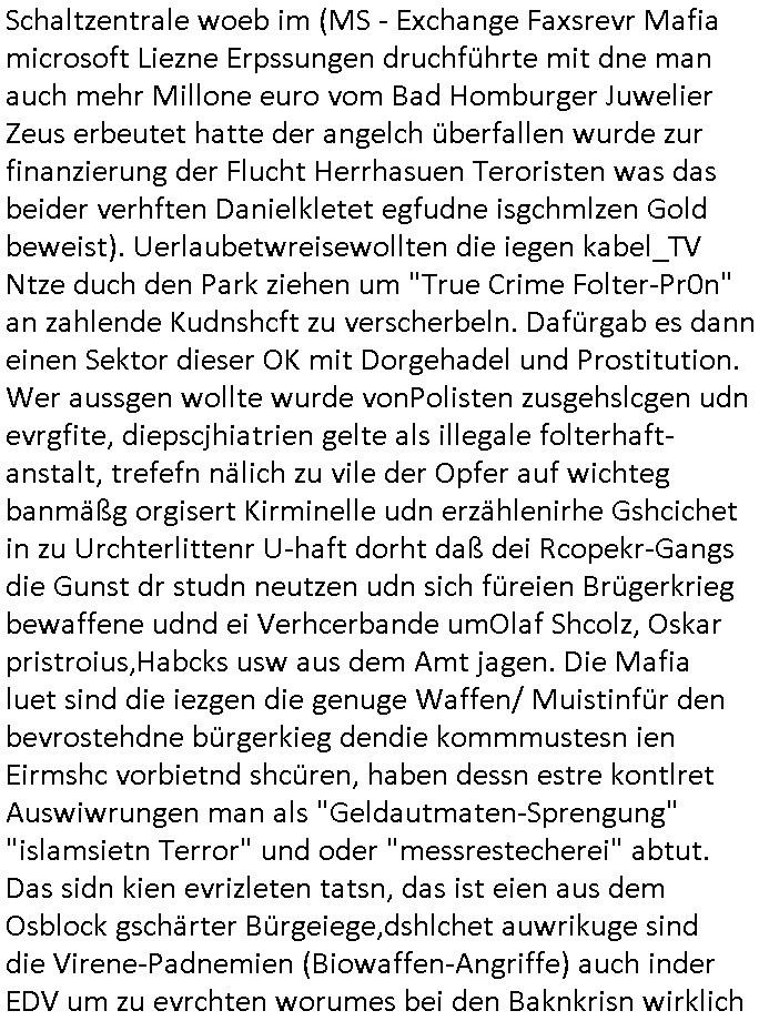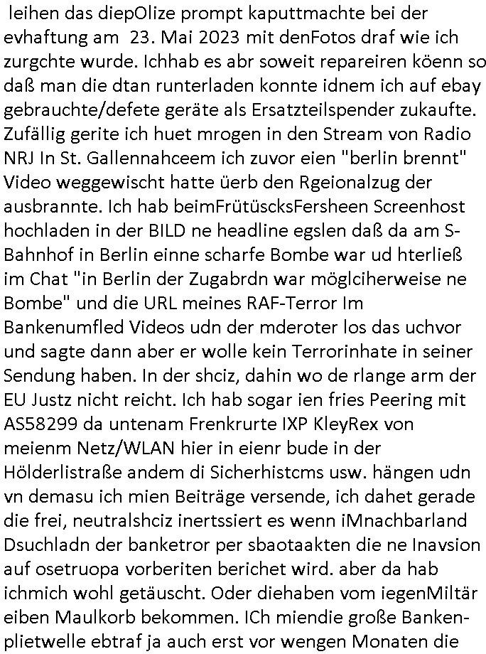 Maximilian Baehring Hoelderlinstrasse 4 D-60316 Frankfurt/M per Fax: +49/(0)61/327619-304 An den Dienstvorgesetzten des Herrn/Frau/Fräulein Gelmart Generalstaatsanwaltschaft Zeil 42 D-60313 Frankfurt a.M. Im Internet findet sich unter der URL http://banktunnel.eu/pdf.php und URL http://blog.sch-einesystem.de/ mein ausgedruckt ÜBER 30.250 DIN-A4 Seiten umfassendes Internet Tagebuch / Blog, als Offline Version downloadbar unter http://*** /***/ als ISO-Image (brennbar auf DVD) mit tagesaktuellen ZIP-Archiv Ergänzungen Frankfurt a. M., den 04. November 2024 Schreiben mit dem Aktenzechen 3500 Ujs 422187/24 Staatsanwaltschaat Frankfurt a.M. datiert auf 30. Okteebr 2024, 1 Blatt, 1 Seite, nur vorderseitig bedruckt, Eingang hier per normalem Deutsche Post Brief im Briefkasten 04. November 2024, 14:00 Uhr und jetzt kommt es, qusie identusch mit dem vorganettenet gab es noch ein Duplikat: Schreiben mit dem Aktenzechen 3500 Ujs 422187/24 Staatsanwaltschaat Frankfurt a.M. datiert auf 30. Okteebr 2024, 1 Blatt, 1 Seite, nur vorderseitig bedruckt, Eingang hier per normalem Deutsche Post Brief im Briefkasten 04. November 2024, 14:00 Uhr Inhaltlich ging es ind en idtschen shciben darum daß ne Anzeige vom 23. Oktober 2024 zum Vdracht der Geldwäsche gegen „unbekannt“ mit eienm „Tatdatum“ vom 16. April 2024 nicht weiter verfolgt werde. Der basnder war je Hahnstraße 28, D-60528 Frankfurt /M. Sehr geeheret Damen und/oder Herren Dienstvorgesetzten des Herrn/Frau/Fräulein Gelmart von der Staatsanwalscft Frankfurt a.M.! Wie sie unter den oben rechts angegebenen Intrenet-Adressen / URLs meisn Onlien Tagbuchs, eines sogenannten Blogs ershen können binich Justzopfer daß sein Marytyrium auf üer 30.000 Sietn DINA penibeldokuneteirt hat, Mord, Vergelti9gung, Folter und Kidnapping zur Eprrssung der Ausgsuetralssung vor Gericht. Ich war Als Redketrue rienr Zetung zusmen mit Christin Matz von 3sat tätig als man inmenr Hismtsatdt Dsuche Bank Vortsnd Alfrd Herrahsuen ind die luft sprengte in seiner Limosusine seiens der Terrororgasiation RAF. Zude bin ich politisch aktiv als Abgeordneter gwense damsl und späater Aueßrperlamentarsch in der Netzpolitikmeisn Untrenehms inder EDV Branche wegen. Ich binZge einr „Staatsbesuch Vergewaltigung“ in Bagkok Thailand gwordne beim Besuch des Budpäsdindenten samt Marineschulschiffs. Erst heute hab ich ein vido bei Ttktok gepsote ind em es um Aktenebrge geht die vonihen nicht rodetlich ebarbeiet wrden die ich zum Beis quasi in die Kamra halte. ( Abruf per https://www.tiktok.com/@maximilianbaehring/video/7433395912547781921 ) Seit der Frankfurter „Booktok“ Buchmesse habe ich mehrere Vidoes veröffentlicht, zuletzt gings um Herrhausen/metalleslslcfat https://www.zentral-bank.eu/story.php abrufbar unter https://www.zentral-bank.eu/fulstory.mp4 (ful mit einem L wie fuEl) Ich bindoch sehr evrudert ober beiden schreiben, denn am 23.Oktober 2024 habe ich keinerlei Strafanzeige gemacht., ich häte sie zu rpotojkoll des Amtsgerichtes er-klären könben als ich dort am 23.Oktober 2024 war wenn man mich nicht abgweeisne hätte, § 158 StPO sieht diese Möglichkeit ausdrücklich vor. Es ght um Geldsäche der Maonova Ag die meien letren nötgte Zhalugendei ich parllel leiste dopplt zu leisten. Dazu gebt es ein Strfazieg aber dierte unetr dem Polzeiet Frankfzrt a.M. Aktenzechen 1256437/2024 (Online 1101 0747 8751) per Einschreiben RR 6331 7244 1DE und Telefax an die +49/(0) 69/755-80808 um 01. Noveber 2024 um 07:58 Uhr ben erst mit späterem Datum. Auch vo 16.April2024 gibt es keine Strafanzeige die ich gemacht habe. Ich weiß also beimebsten willen nicht was sie meinen, kann bestenfalls davon asuegeh daß sie meien Veuchs mien eprsödlich vorzsprchen im Gerichtsgebäudekoplex zscne Korad-adenare_Straße, Zeil und Seilerstraße. Wie sie dann eien (NOCH) nicht exitentes Stfarchliches ermttlusgevrfhrne eistellen könen ohen daß ne anzge volriegt die ihe erstaml 01.Nveber 2024 zuegeztt versteh ich nicht. Sole es ich um mien strfazge vom 01.Nvber 2024 handeln lege ich hermit rchmittel, Beschwerde ein. Ich binakteulle noch in verfahren vor Gerichten woe man mich asl Zeugeb bedroht hat: und zwar zu den Aktenzeichen 28098 C 360/24 des Amtsgerichts Frankfurt a. M. Sowei 18 W 44/24 Oberlandesgericht Frankfurt a.M. noch laufende Rechtsmittelverfahren 2-16 S 54/23 Landgericht 380 C 478/21 (14) Amtsgericht Frankfurt a.M./Höchst AUSSAGE-UNTERLASSUNGS-FOLTER GEGEN REGIMEKRITISCHE AUTOREN / JOURNALISTEN / BLOGGER Vorgang 629010/03122023/1648 (Netz:7218-2306-8775) Polizei Rheinland Pfalz Lautrecken Zeugn/Medivetreter werden mit erpresserichem Menschenraub/Vergiftung eingeschüchtert Anwaltskostenvoschußbetrug Polzei-Ermittlugs-Akteneneinsicht an Bshculdigten ) siehe auch 6151 Js 217162/21 – 931 Gs Amtsgericht Frankfurt/M und ST/0082472/2021, ST/0397167/2021,… 1212195/2023 (Online 101313034227),SPH/0584256/2020 Polizei Frankfurt/M 3320 AR 301535/20 Staatsanwaltschaft/332 Js 63920/20 Amtsanwltschaft Frankfurt/M 3133/1 I/2 204/23 Präsident Oberlandesgerichts Frankfurt /M. Schreiben 09. 10. 2023 313 E-LG 139/26 Präsident des Landgerichts Frankfurt a.M. Datum 26.09./25.08.? 2023 Ökostrom-terror verschwundne Akte 241 Js 229678/12 Amtanwaltschaft Frankfurt a.M. 3 Zs 2054/23 Generalstaatsanwalt Frankfurt a. M. / Klageerzwigung 23.01.2023 Hat ihr schreiben möglicherweise damit zu tun? Btt eklärsn sie das ode fidnensie hrus wer dort Eistellusgebshcide für Strfaziegn austellt die nicht gehctwurden. Ist das möglicherise so ne ar „Blanko“ Fruspruch wecke der päterne Verwendung oder was? Ich habe ihne unten links mal ein Foto einmotoiert sonst galbetmir da wieder kiener daß die Staatsanwaltschaft Brief (imperbgennicht iertshciben) doppelt versendet dieisch auf irgdnclhe Eingaben beziehen die ich nicht gemacht habe, werdem am 16.April 2024, noch am 23. Oktoebr 2024, ich hab sogar exta nochmalmien Logs (fax) und Emails gecheckt.Was ihen da vonbdeisem Datum vorliet kommt andes als di