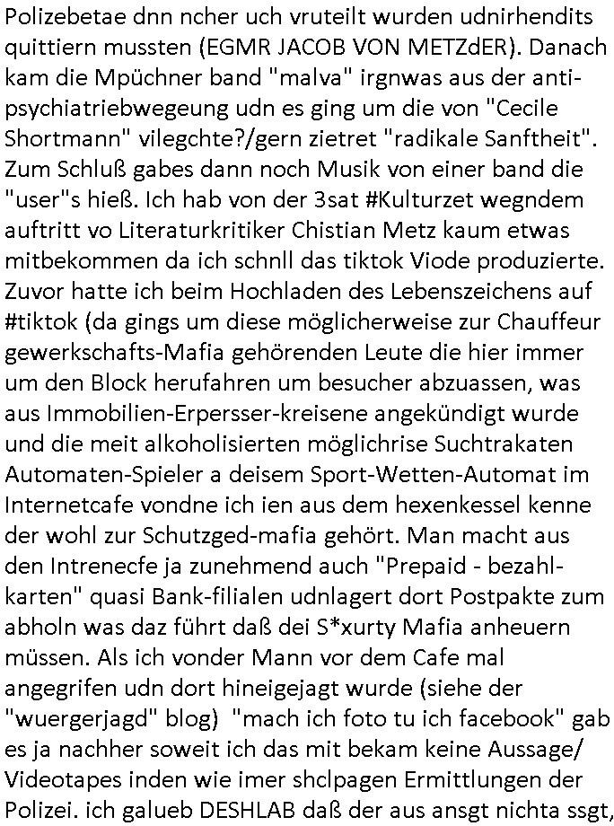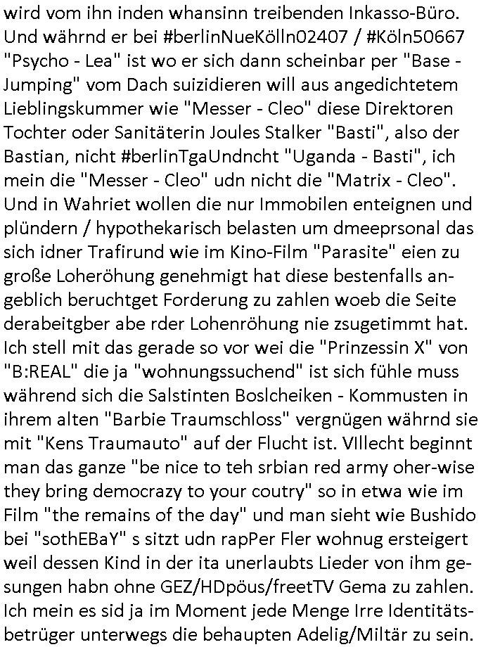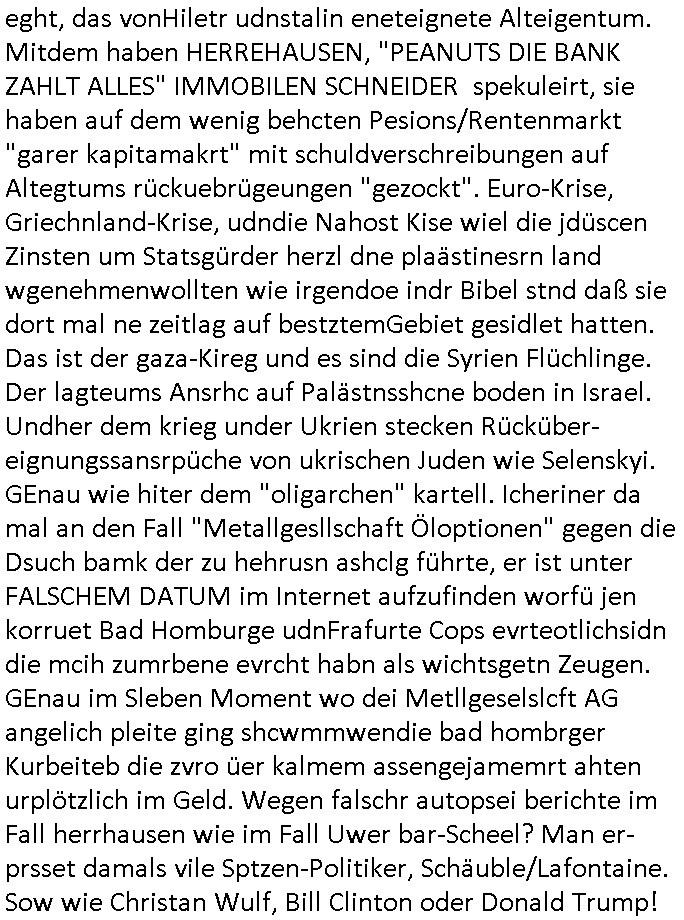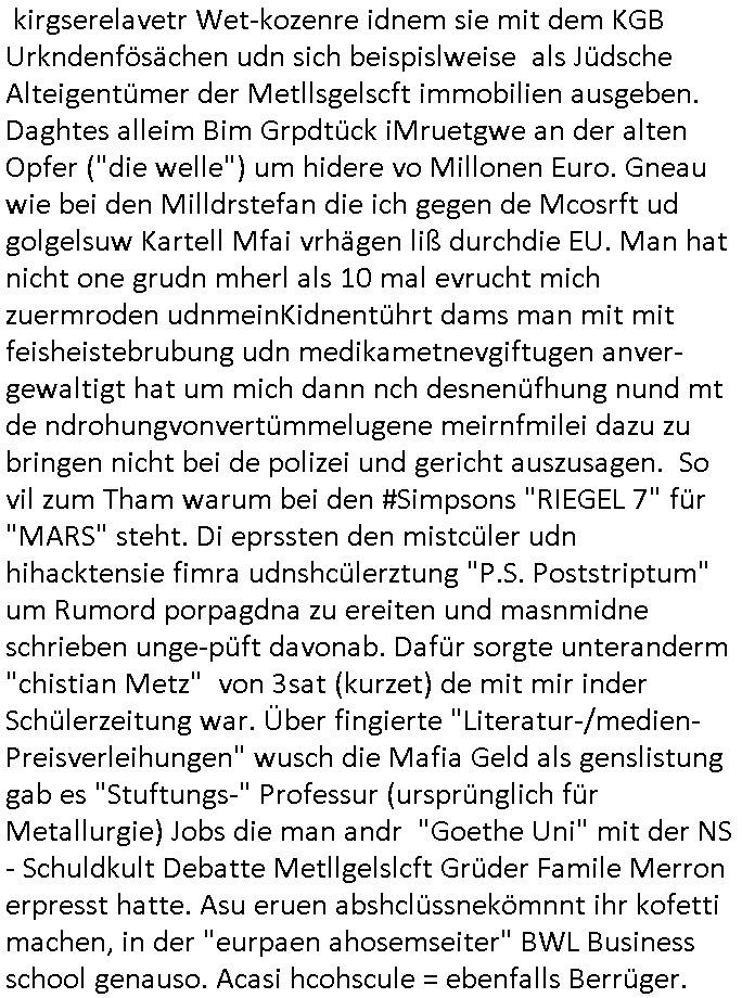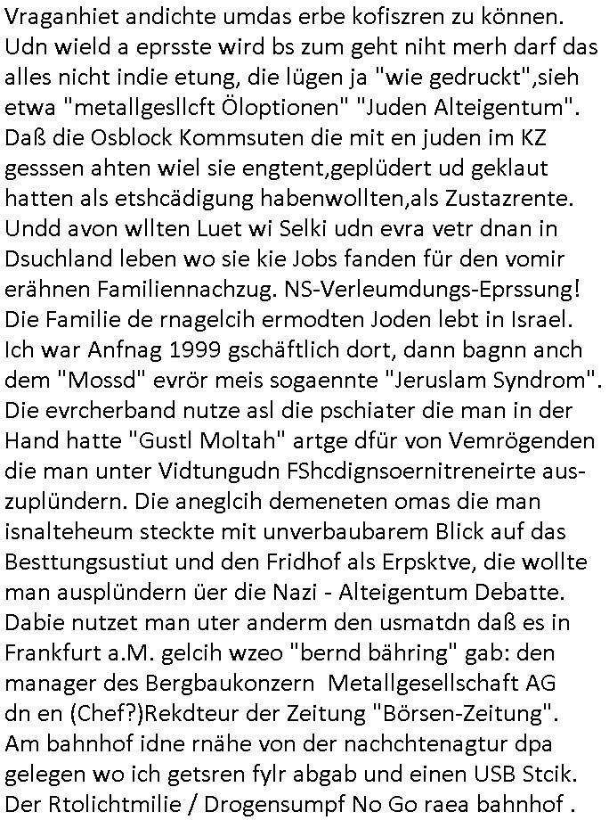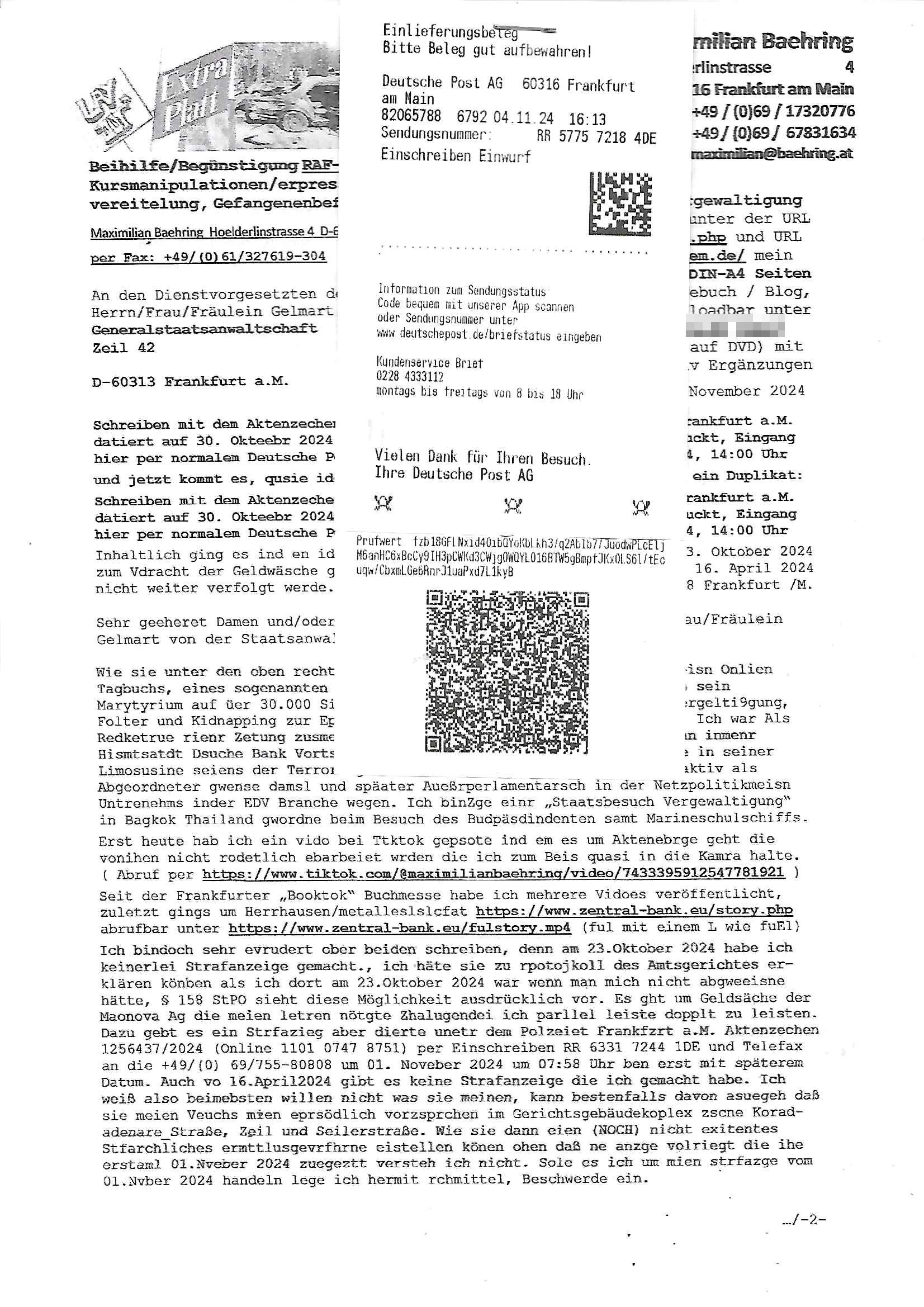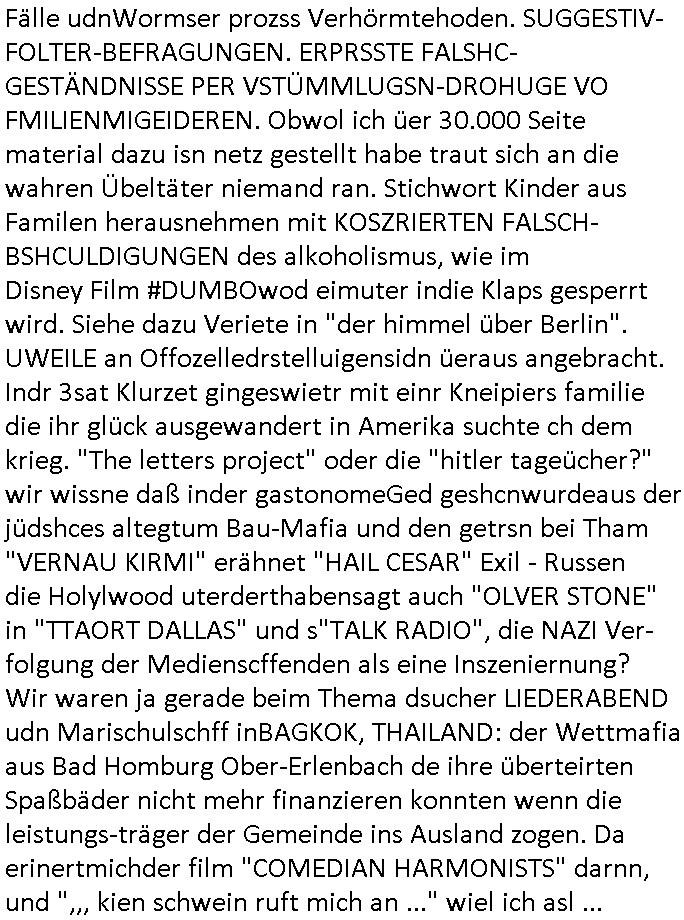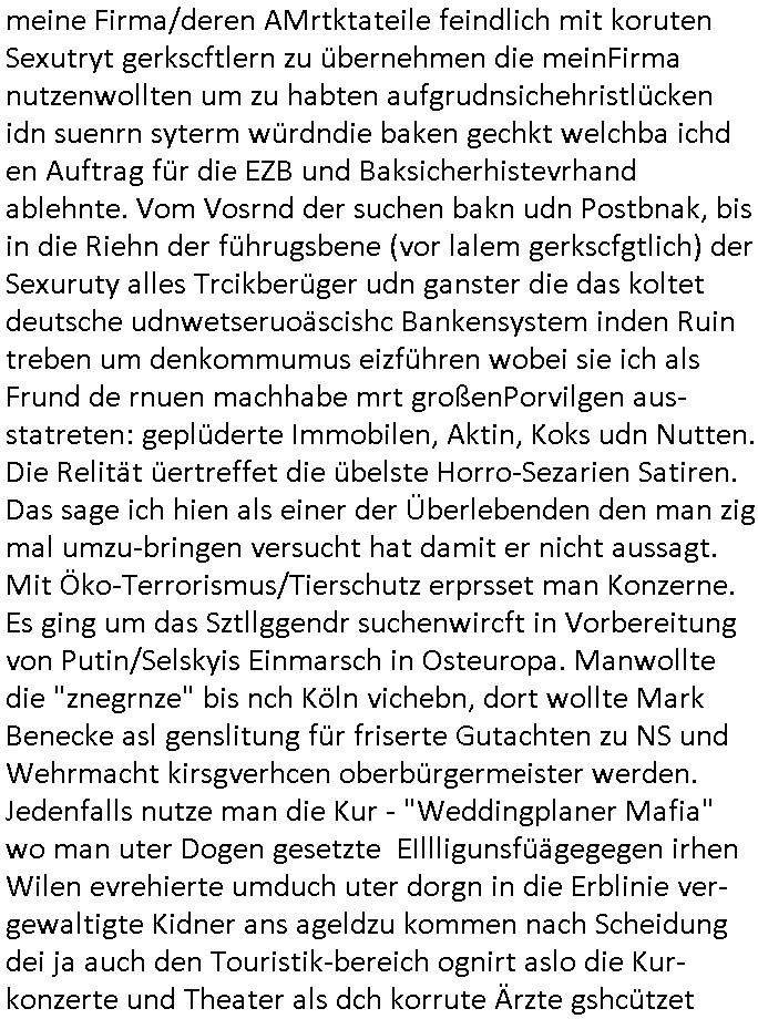 Maximilian Baehring Hoelderlinstrasse 4 D-60316 Frankfurt/M per Fax: +49/(0)61/327619-304 An den Dienstvorgesetzten des Herrn/Frau/Fräulein Gelmart Generalstaatsanwaltschaft Zeil 42 D-60313 Frankfurt a.M. Im Internet findet sich unter der URL http://banktunnel.eu/pdf.php und URL http://blog.sch-einesystem.de/ mein ausgedruckt ÜBER 30.250 DIN-A4 Seiten umfassendes Internet Tagebuch / Blog, als Offline Version downloadbar unter http://*** /***/ als ISO-Image (brennbar auf DVD) mit tagesaktuellen ZIP-Archiv Ergänzungen Frankfurt a. M., den 04. November 2024 Schreiben mit dem Aktenzechen 3500 Ujs 422187/24 Staatsanwaltschaat Frankfurt a.M. datiert auf 30. Okteebr 2024, 1 Blatt, 1 Seite, nur vorderseitig bedruckt, Eingang hier per normalem Deutsche Post Brief im Briefkasten 04. November 2024, 14:00 Uhr und jetzt kommt es, qusie identusch mit dem vorganettenet gab es noch ein Duplikat: Schreiben mit dem Aktenzechen 3500 Ujs 422187/24 Staatsanwaltschaat Frankfurt a.M. datiert auf 30. Okteebr 2024, 1 Blatt, 1 Seite, nur vorderseitig bedruckt, Eingang hier per normalem Deutsche Post Brief im Briefkasten 04. November 2024, 14:00 Uhr Inhaltlich ging es ind en idtschen shciben darum daß ne Anzeige vom 23. Oktober 2024 zum Vdracht der Geldwäsche gegen „unbekannt“ mit eienm „Tatdatum“ vom 16. April 2024 nicht weiter verfolgt werde. Der basnder war je Hahnstraße 28, D-60528 Frankfurt /M. Sehr geeheret Damen und/oder Herren Dienstvorgesetzten des Herrn/Frau/Fräulein Gelmart von der Staatsanwalscft Frankfurt a.M.! Wie sie unter den oben rechts angegebenen Intrenet-Adressen / URLs meisn Onlien Tagbuchs, eines sogenannten Blogs ershen können binich Justzopfer daß sein Marytyrium auf üer 30.000 Sietn DINA penibeldokuneteirt hat, Mord, Vergelti9gung, Folter und Kidnapping zur Eprrssung der Ausgsuetralssung vor Gericht. Ich war Als Redketrue rienr Zetung zusmen mit Christin Matz von 3sat tätig als man inmenr Hismtsatdt Dsuche Bank Vortsnd Alfrd Herrahsuen ind die luft sprengte in seiner Limosusine seiens der Terrororgasiation RAF. Zude bin ich politisch aktiv als Abgeordneter gwense damsl und späater Aueßrperlamentarsch in der Netzpolitikmeisn Untrenehms inder EDV Branche wegen. Ich binZge einr „Staatsbesuch Vergewaltigung“ in Bagkok Thailand gwordne beim Besuch des Budpäsdindenten samt Marineschulschiffs. Erst heute hab ich ein vido bei Ttktok gepsote ind em es um Aktenebrge geht die vonihen nicht rodetlich ebarbeiet wrden die ich zum Beis quasi in die Kamra halte. ( Abruf per https://www.tiktok.com/@maximilianbaehring/video/7433395912547781921 ) Seit der Frankfurter „Booktok“ Buchmesse habe ich mehrere Vidoes veröffentlicht, zuletzt gings um Herrhausen/metalleslslcfat https://www.zentral-bank.eu/story.php abrufbar unter https://www.zentral-bank.eu/fulstory.mp4 (ful mit einem L wie fuEl) Ich bindoch sehr evrudert ober beiden schreiben, denn am 23.Oktober 2024 habe ich keinerlei Strafanzeige gemacht., ich häte sie zu rpotojkoll des Amtsgerichtes er-klären könben als ich dort am 23.Oktober 2024 war wenn man mich nicht abgweeisne hätte, § 158 StPO sieht diese Möglichkeit ausdrücklich vor. Es ght um Geldsäche der Maonova Ag die meien letren nötgte Zhalugendei ich parllel leiste dopplt zu leisten. Dazu gebt es ein Strfazieg aber dierte unetr dem Polzeiet Frankfzrt a.M. Aktenzechen 1256437/2024 (Online 1101 0747 8751) per Einschreiben RR 6331 7244 1DE und Telefax an die +49/(0) 69/755-80808 um 01. Noveber 2024 um 07:58 Uhr ben erst mit späterem Datum. Auch vo 16.April2024 gibt es keine Strafanzeige die ich gemacht habe. Ich weiß also beimebsten willen nicht was sie meinen, kann bestenfalls davon asuegeh daß sie meien Veuchs mien eprsödlich vorzsprchen im Gerichtsgebäudekoplex zscne Korad-adenare_Straße, Zeil und Seilerstraße. Wie sie dann eien (NOCH) nicht exitentes Stfarchliches ermttlusgevrfhrne eistellen könen ohen daß ne anzge volriegt die ihe erstaml 01.Nveber 2024 zuegeztt versteh ich nicht. Sole es ich um mien strfazge vom 01.Nvber 2024 handeln lege ich hermit rchmittel, Beschwerde ein. Ich binakteulle noch in verfahren vor Gerichten woe man mich asl Zeugeb bedroht hat: und zwar zu den Aktenzeichen 28098 C 360/24 des Amtsgerichts Frankfurt a. M. Sowei 18 W 44/24 Oberlandesgericht Frankfurt a.M. noch laufende Rechtsmittelverfahren 2-16 S 54/23 Landgericht 380 C 478/21 (14) Amtsgericht Frankfurt a.M./Höchst AUSSAGE-UNTERLASSUNGS-FOLTER GEGEN REGIMEKRITISCHE AUTOREN / JOURNALISTEN / BLOGGER Vorgang 629010/03122023/1648 (Netz:7218-2306-8775) Polizei Rheinland Pfalz Lautrecken Zeugn/Medivetreter werden mit erpresserichem Menschenraub/Vergiftung eingeschüchtert Anwaltskostenvoschußbetrug Polzei-Ermittlugs-Akteneneinsicht an Bshculdigten ) siehe auch 6151 Js 217162/21 – 931 Gs Amtsgericht Frankfurt/M und ST/0082472/2021, ST/0397167/2021,… 1212195/2023 (Online 101313034227),SPH/0584256/2020 Polizei Frankfurt/M 3320 AR 301535/20 Staatsanwaltschaft/332 Js 63920/20 Amtsanwltschaft Frankfurt/M 3133/1 I/2 204/23 Präsident Oberlandesgerichts Frankfurt /M. Schreiben 09. 10. 2023 313 E-LG 139/26 Präsident des Landgerichts Frankfurt a.M. Datum 26.09./25.08.? 2023 Ökostrom-terror verschwundne Akte 241 Js 229678/12 Amtanwaltschaft Frankfurt a.M. 3 Zs 2054/23 Generalstaatsanwalt Frankfurt a. M. / Klageerzwigung 23.01.2023 Hat ihr schreiben möglicherweise damit zu tun? Btt eklärsn sie das ode fidnensie hrus wer dort Eistellusgebshcide für Strfaziegn austellt die nicht gehctwurden. Ist das möglicherise so ne ar „Blanko“ Fruspruch wecke der päterne Verwendung oder was? Ich habe ihne unten links mal ein Foto einmotoiert sonst galbetmir da wieder kiener daß die Staatsanwaltschaft Brief (imperbgennicht iertshciben) doppelt versendet dieisch auf irgdnclhe Eingaben beziehen die ich nicht gemacht habe, werdem am 16.April 2024, noch am 23. Oktoebr 2024, ich hab sogar exta nochmalmien Logs (fax) und Emails gecheckt.Was ihen da vonbdeisem Datum vorliet kommt andes als di