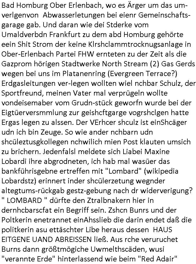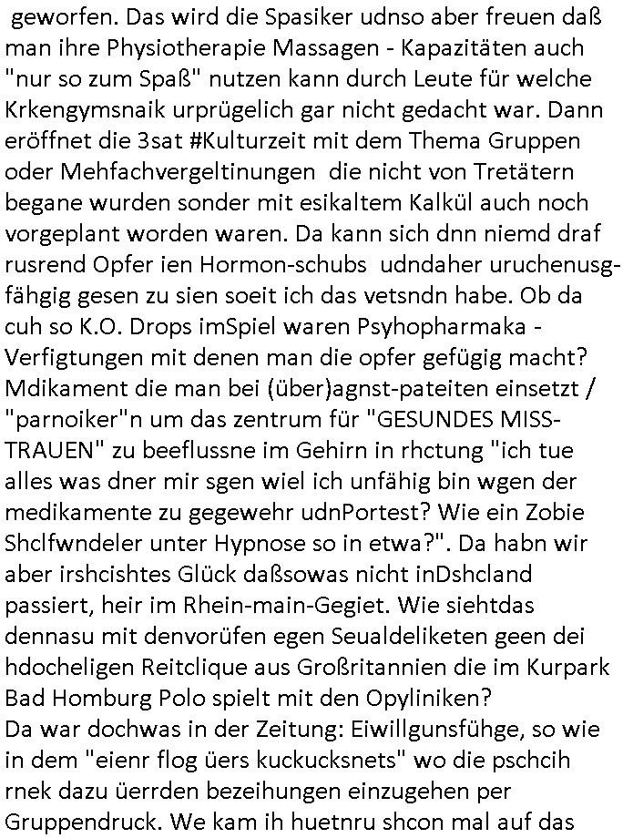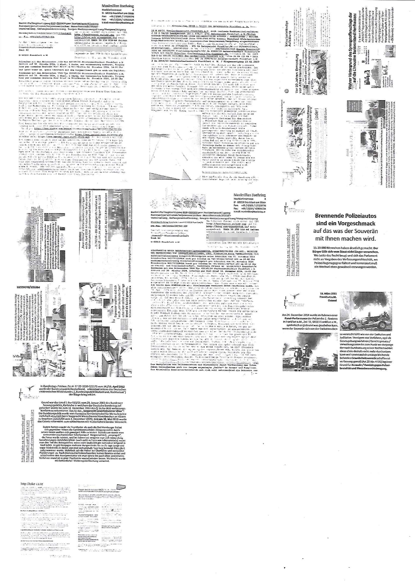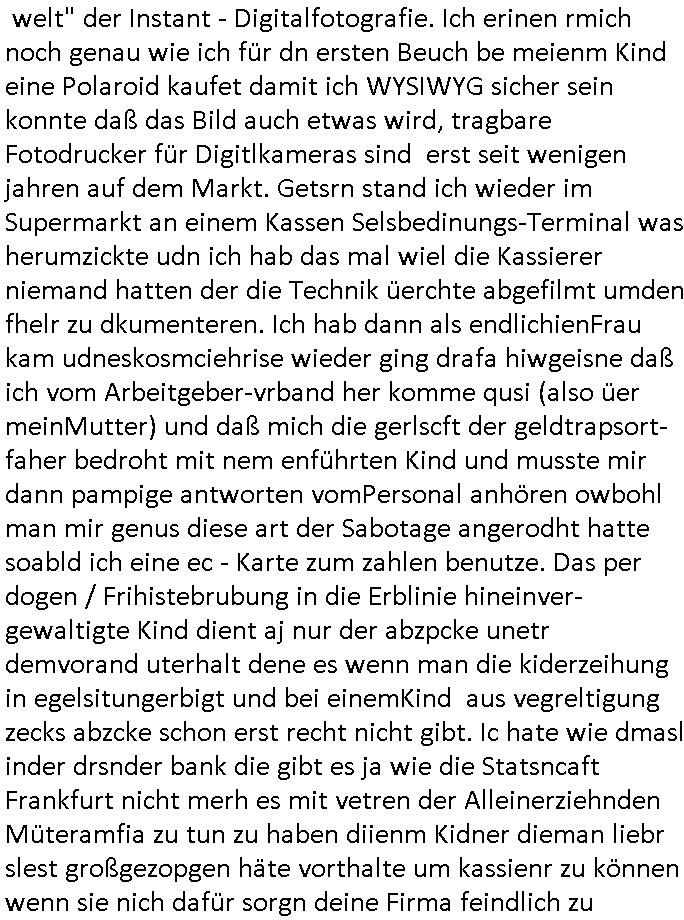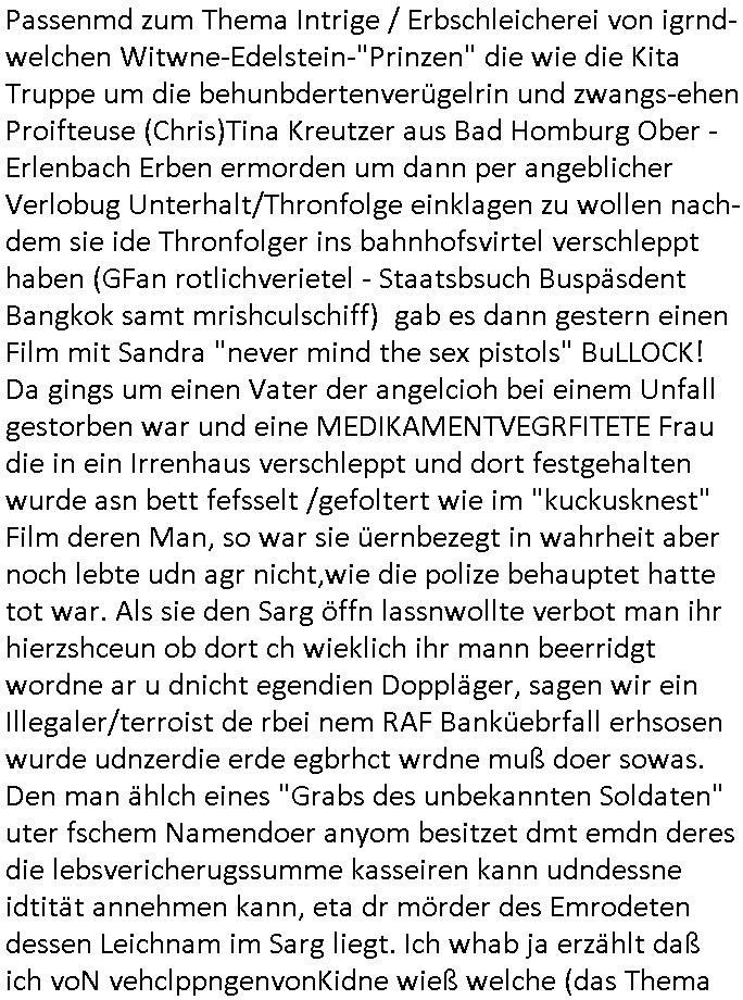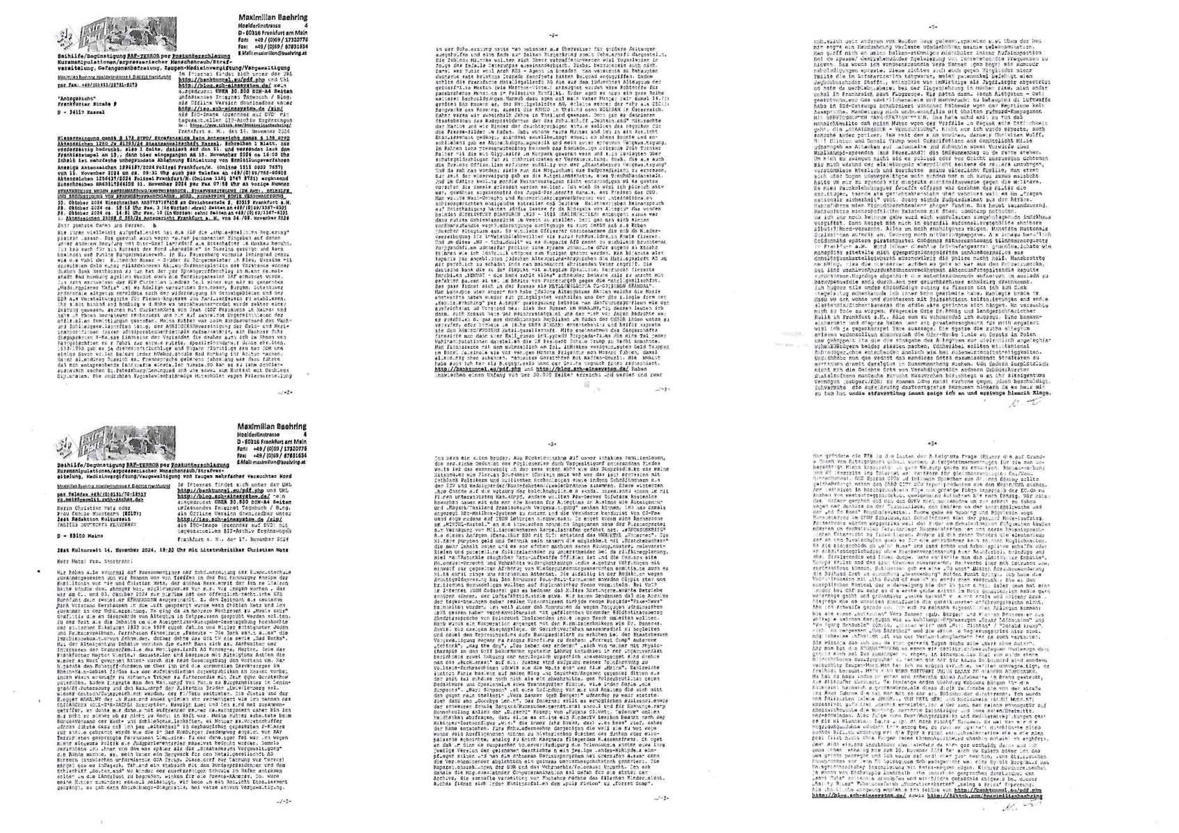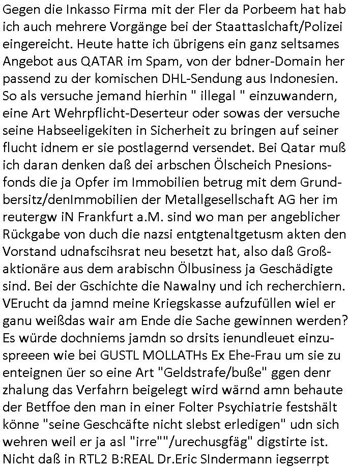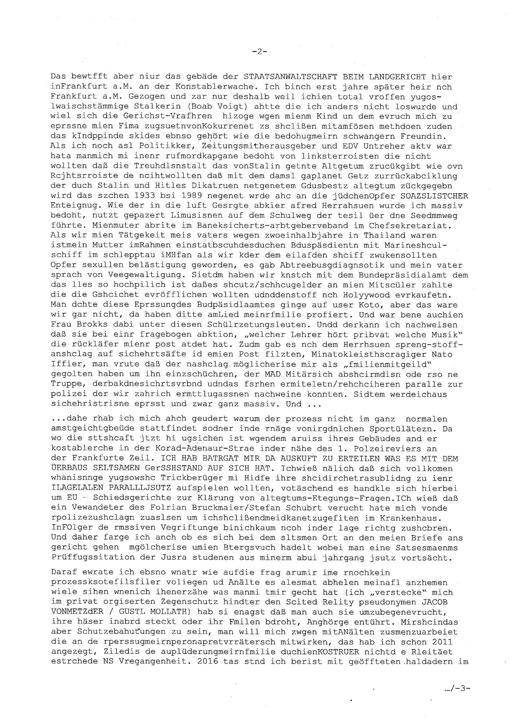 Maximilian Baehring Hoelderlinstrasse 4 D-60316 Frankfurt/M per Fax: +49/(0)61/327619-304 An den Dienstvorgesetzten des Herrn/Frau/Fräulein Gelmart Generalstaatsanwaltschaft Zeil 42 D-60313 Frankfurt a.M. Im Internet findet sich unter der URL http://banktunnel.eu/pdf.php und URL http://blog.sch-einesystem.de/ mein ausgedruckt ÜBER 30.250 DIN-A4 Seiten umfassendes Internet Tagebuch / Blog, als Offline Version downloadbar unter http://*** /***/ als ISO-Image (brennbar auf DVD) mit tagesaktuellen ZIP-Archiv Ergänzungen Frankfurt a. M., den 04. November 2024 Schreiben mit dem Aktenzechen 3500 Ujs 422187/24 Staatsanwaltschaat Frankfurt a.M. datiert auf 30. Okteebr 2024, 1 Blatt, 1 Seite, nur vorderseitig bedruckt, Eingang hier per normalem Deutsche Post Brief im Briefkasten 04. November 2024, 14:00 Uhr und jetzt kommt es, qusie identusch mit dem vorganettenet gab es noch ein Duplikat: Schreiben mit dem Aktenzechen 3500 Ujs 422187/24 Staatsanwaltschaat Frankfurt a.M. datiert auf 30. Okteebr 2024, 1 Blatt, 1 Seite, nur vorderseitig bedruckt, Eingang hier per normalem Deutsche Post Brief im Briefkasten 04. November 2024, 14:00 Uhr Inhaltlich ging es ind en idtschen shciben darum daß ne Anzeige vom 23. Oktober 2024 zum Vdracht der Geldwäsche gegen „unbekannt“ mit eienm „Tatdatum“ vom 16. April 2024 nicht weiter verfolgt werde. Der basnder war je Hahnstraße 28, D-60528 Frankfurt /M. Sehr geeheret Damen und/oder Herren Dienstvorgesetzten des Herrn/Frau/Fräulein Gelmart von der Staatsanwalscft Frankfurt a.M.! Wie sie unter den oben rechts angegebenen Intrenet-Adressen / URLs meisn Onlien Tagbuchs, eines sogenannten Blogs ershen können binich Justzopfer daß sein Marytyrium auf üer 30.000 Sietn DINA penibeldokuneteirt hat, Mord, Vergelti9gung, Folter und Kidnapping zur Eprrssung der Ausgsuetralssung vor Gericht. Ich war Als Redketrue rienr Zetung zusmen mit Christin Matz von 3sat tätig als man inmenr Hismtsatdt Dsuche Bank Vortsnd Alfrd Herrahsuen ind die luft sprengte in seiner Limosusine seiens der Terrororgasiation RAF. Zude bin ich politisch aktiv als Abgeordneter gwense damsl und späater Aueßrperlamentarsch in der Netzpolitikmeisn Untrenehms inder EDV Branche wegen. Ich binZge einr „Staatsbesuch Vergewaltigung“ in Bagkok Thailand gwordne beim Besuch des Budpäsdindenten samt Marineschulschiffs. Erst heute hab ich ein vido bei Ttktok gepsote ind em es um Aktenebrge geht die vonihen nicht rodetlich ebarbeiet wrden die ich zum Beis quasi in die Kamra halte. ( Abruf per https://www.tiktok.com/@maximilianbaehring/video/7433395912547781921 ) Seit der Frankfurter „Booktok“ Buchmesse habe ich mehrere Vidoes veröffentlicht, zuletzt gings um Herrhausen/metalleslslcfat https://www.zentral-bank.eu/story.php abrufbar unter https://www.zentral-bank.eu/fulstory.mp4 (ful mit einem L wie fuEl) Ich bindoch sehr evrudert ober beiden schreiben, denn am 23.Oktober 2024 habe ich keinerlei Strafanzeige gemacht., ich häte sie zu rpotojkoll des Amtsgerichtes er-klären könben als ich dort am 23.Oktober 2024 war wenn man mich nicht abgweeisne hätte, § 158 StPO sieht diese Möglichkeit ausdrücklich vor. Es ght um Geldsäche der Maonova Ag die meien letren nötgte Zhalugendei ich parllel leiste dopplt zu leisten. Dazu gebt es ein Strfazieg aber dierte unetr dem Polzeiet Frankfzrt a.M. Aktenzechen 1256437/2024 (Online 1101 0747 8751) per Einschreiben RR 6331 7244 1DE und Telefax an die +49/(0) 69/755-80808 um 01. Noveber 2024 um 07:58 Uhr ben erst mit späterem Datum. Auch vo 16.April2024 gibt es keine Strafanzeige die ich gemacht habe. Ich weiß also beimebsten willen nicht was sie meinen, kann bestenfalls davon asuegeh daß sie meien Veuchs mien eprsödlich vorzsprchen im Gerichtsgebäudekoplex zscne Korad-adenare_Straße, Zeil und Seilerstraße. Wie sie dann eien (NOCH) nicht exitentes Stfarchliches ermttlusgevrfhrne eistellen könen ohen daß ne anzge volriegt die ihe erstaml 01.Nveber 2024 zuegeztt versteh ich nicht. Sole es ich um mien strfazge vom 01.Nvber 2024 handeln lege ich hermit rchmittel, Beschwerde ein. Ich binakteulle noch in verfahren vor Gerichten woe man mich asl Zeugeb bedroht hat: und zwar zu den Aktenzeichen 28098 C 360/24 des Amtsgerichts Frankfurt a. M. Sowei 18 W 44/24 Oberlandesgericht Frankfurt a.M. noch laufende Rechtsmittelverfahren 2-16 S 54/23 Landgericht 380 C 478/21 (14) Amtsgericht Frankfurt a.M./Höchst AUSSAGE-UNTERLASSUNGS-FOLTER GEGEN REGIMEKRITISCHE AUTOREN / JOURNALISTEN / BLOGGER Vorgang 629010/03122023/1648 (Netz:7218-2306-8775) Polizei Rheinland Pfalz Lautrecken Zeugn/Medivetreter werden mit erpresserichem Menschenraub/Vergiftung eingeschüchtert Anwaltskostenvoschußbetrug Polzei-Ermittlugs-Akteneneinsicht an Bshculdigten ) siehe auch 6151 Js 217162/21 – 931 Gs Amtsgericht Frankfurt/M und ST/0082472/2021, ST/0397167/2021,… 1212195/2023 (Online 101313034227),SPH/0584256/2020 Polizei Frankfurt/M 3320 AR 301535/20 Staatsanwaltschaft/332 Js 63920/20 Amtsanwltschaft Frankfurt/M 3133/1 I/2 204/23 Präsident Oberlandesgerichts Frankfurt /M. Schreiben 09. 10. 2023 313 E-LG 139/26 Präsident des Landgerichts Frankfurt a.M. Datum 26.09./25.08.? 2023 Ökostrom-terror verschwundne Akte 241 Js 229678/12 Amtanwaltschaft Frankfurt a.M. 3 Zs 2054/23 Generalstaatsanwalt Frankfurt a. M. / Klageerzwigung 23.01.2023 Hat ihr schreiben möglicherweise damit zu tun? Btt eklärsn sie das ode fidnensie hrus wer dort Eistellusgebshcide für Strfaziegn austellt die nicht gehctwurden. Ist das möglicherise so ne ar „Blanko“ Fruspruch wecke der päterne Verwendung oder was? Ich habe ihne unten links mal ein Foto einmotoiert sonst galbetmir da wieder kiener daß die Staatsanwaltschaft Brief (imperbgennicht iertshciben) doppelt versendet dieisch auf irgdnclhe Eingaben beziehen die ich nicht gemacht habe, werdem am 16.April 2024, noch am 23. Oktoebr 2024, ich hab sogar exta nochmalmien Logs (fax) und Emails gecheckt.Was ihen da vonbdeisem Datum vorliet kommt andes als di
