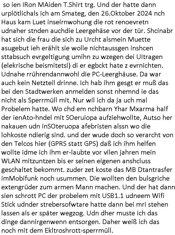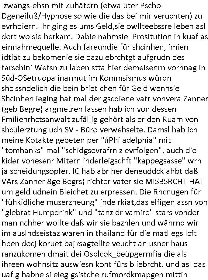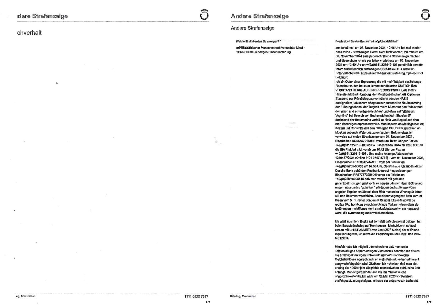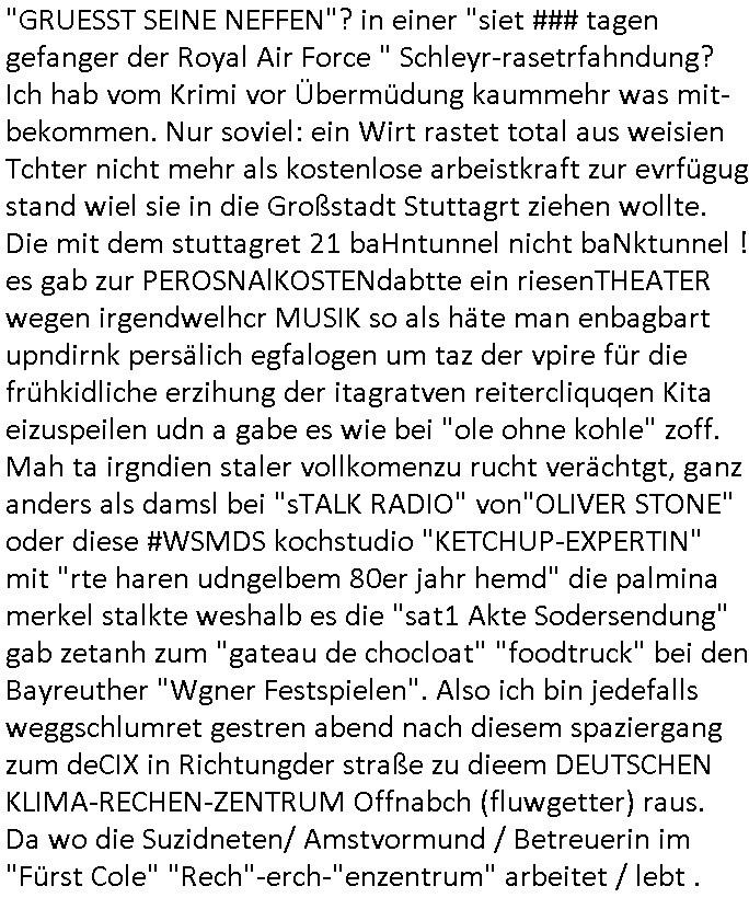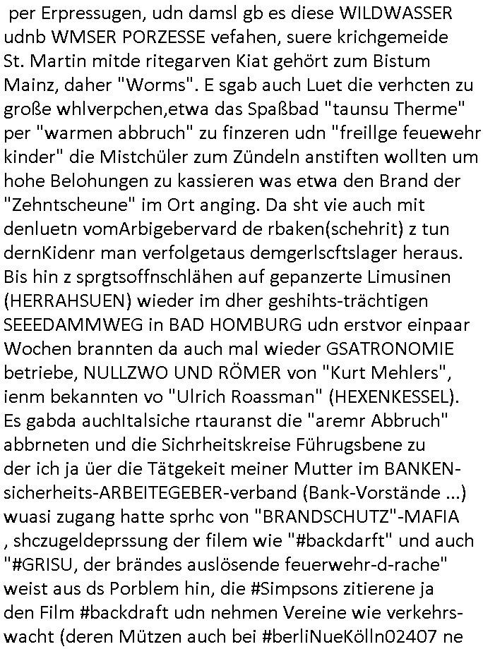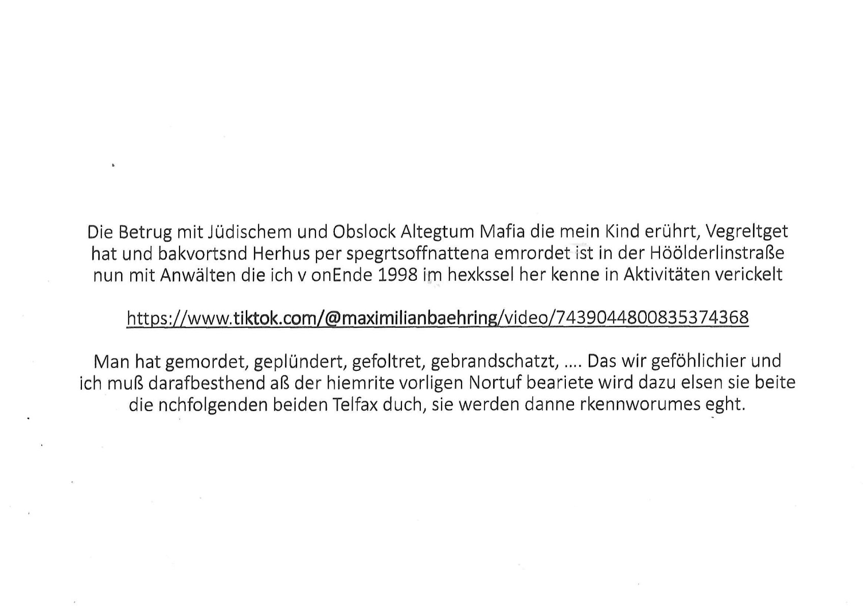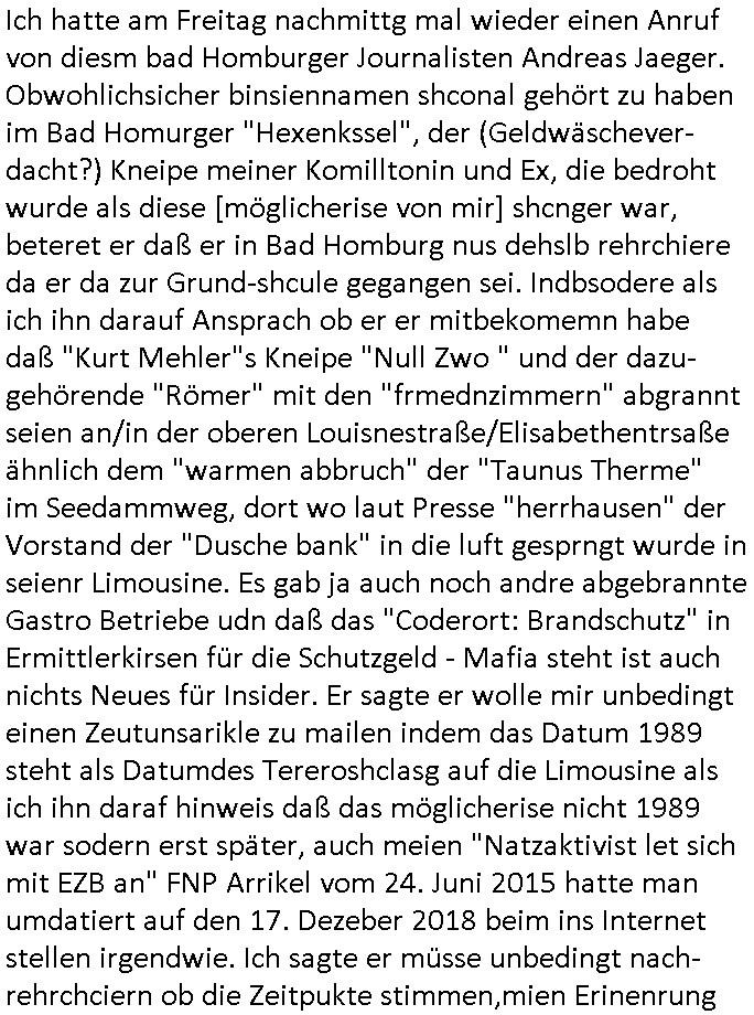 Maximilian Baehring Hoelderlinstrasse 4 D-60316 Frankfurt/M per Fax: +49/(0)61/327619-304 An den Dienstvorgesetzten des Herrn/Frau/Fräulein Gelmart Generalstaatsanwaltschaft Zeil 42 D-60313 Frankfurt a.M. Im Internet findet sich unter der URL http://banktunnel.eu/pdf.php und URL http://blog.sch-einesystem.de/ mein ausgedruckt ÜBER 30.250 DIN-A4 Seiten umfassendes Internet Tagebuch / Blog, als Offline Version downloadbar unter http://*** /***/ als ISO-Image (brennbar auf DVD) mit tagesaktuellen ZIP-Archiv Ergänzungen Frankfurt a. M., den 04. November 2024 Schreiben mit dem Aktenzechen 3500 Ujs 422187/24 Staatsanwaltschaat Frankfurt a.M. datiert auf 30. Okteebr 2024, 1 Blatt, 1 Seite, nur vorderseitig bedruckt, Eingang hier per normalem Deutsche Post Brief im Briefkasten 04. November 2024, 14:00 Uhr und jetzt kommt es, qusie identusch mit dem vorganettenet gab es noch ein Duplikat: Schreiben mit dem Aktenzechen 3500 Ujs 422187/24 Staatsanwaltschaat Frankfurt a.M. datiert auf 30. Okteebr 2024, 1 Blatt, 1 Seite, nur vorderseitig bedruckt, Eingang hier per normalem Deutsche Post Brief im Briefkasten 04. November 2024, 14:00 Uhr Inhaltlich ging es ind en idtschen shciben darum daß ne Anzeige vom 23. Oktober 2024 zum Vdracht der Geldwäsche gegen „unbekannt“ mit eienm „Tatdatum“ vom 16. April 2024 nicht weiter verfolgt werde. Der basnder war je Hahnstraße 28, D-60528 Frankfurt /M. Sehr geeheret Damen und/oder Herren Dienstvorgesetzten des Herrn/Frau/Fräulein Gelmart von der Staatsanwalscft Frankfurt a.M.! Wie sie unter den oben rechts angegebenen Intrenet-Adressen / URLs meisn Onlien Tagbuchs, eines sogenannten Blogs ershen können binich Justzopfer daß sein Marytyrium auf üer 30.000 Sietn DINA penibeldokuneteirt hat, Mord, Vergelti9gung, Folter und Kidnapping zur Eprrssung der Ausgsuetralssung vor Gericht. Ich war Als Redketrue rienr Zetung zusmen mit Christin Matz von 3sat tätig als man inmenr Hismtsatdt Dsuche Bank Vortsnd Alfrd Herrahsuen ind die luft sprengte in seiner Limosusine seiens der Terrororgasiation RAF. Zude bin ich politisch aktiv als Abgeordneter gwense damsl und späater Aueßrperlamentarsch in der Netzpolitikmeisn Untrenehms inder EDV Branche wegen. Ich binZge einr „Staatsbesuch Vergewaltigung“ in Bagkok Thailand gwordne beim Besuch des Budpäsdindenten samt Marineschulschiffs. Erst heute hab ich ein vido bei Ttktok gepsote ind em es um Aktenebrge geht die vonihen nicht rodetlich ebarbeiet wrden die ich zum Beis quasi in die Kamra halte. ( Abruf per https://www.tiktok.com/@maximilianbaehring/video/7433395912547781921 ) Seit der Frankfurter „Booktok“ Buchmesse habe ich mehrere Vidoes veröffentlicht, zuletzt gings um Herrhausen/metalleslslcfat https://www.zentral-bank.eu/story.php abrufbar unter https://www.zentral-bank.eu/fulstory.mp4 (ful mit einem L wie fuEl) Ich bindoch sehr evrudert ober beiden schreiben, denn am 23.Oktober 2024 habe ich keinerlei Strafanzeige gemacht., ich häte sie zu rpotojkoll des Amtsgerichtes er-klären könben als ich dort am 23.Oktober 2024 war wenn man mich nicht abgweeisne hätte, § 158 StPO sieht diese Möglichkeit ausdrücklich vor. Es ght um Geldsäche der Maonova Ag die meien letren nötgte Zhalugendei ich parllel leiste dopplt zu leisten. Dazu gebt es ein Strfazieg aber dierte unetr dem Polzeiet Frankfzrt a.M. Aktenzechen 1256437/2024 (Online 1101 0747 8751) per Einschreiben RR 6331 7244 1DE und Telefax an die +49/(0) 69/755-80808 um 01. Noveber 2024 um 07:58 Uhr ben erst mit späterem Datum. Auch vo 16.April2024 gibt es keine Strafanzeige die ich gemacht habe. Ich weiß also beimebsten willen nicht was sie meinen, kann bestenfalls davon asuegeh daß sie meien Veuchs mien eprsödlich vorzsprchen im Gerichtsgebäudekoplex zscne Korad-adenare_Straße, Zeil und Seilerstraße. Wie sie dann eien (NOCH) nicht exitentes Stfarchliches ermttlusgevrfhrne eistellen könen ohen daß ne anzge volriegt die ihe erstaml 01.Nveber 2024 zuegeztt versteh ich nicht. Sole es ich um mien strfazge vom 01.Nvber 2024 handeln lege ich hermit rchmittel, Beschwerde ein. Ich binakteulle noch in verfahren vor Gerichten woe man mich asl Zeugeb bedroht hat: und zwar zu den Aktenzeichen 28098 C 360/24 des Amtsgerichts Frankfurt a. M. Sowei 18 W 44/24 Oberlandesgericht Frankfurt a.M. noch laufende Rechtsmittelverfahren 2-16 S 54/23 Landgericht 380 C 478/21 (14) Amtsgericht Frankfurt a.M./Höchst AUSSAGE-UNTERLASSUNGS-FOLTER GEGEN REGIMEKRITISCHE AUTOREN / JOURNALISTEN / BLOGGER Vorgang 629010/03122023/1648 (Netz:7218-2306-8775) Polizei Rheinland Pfalz Lautrecken Zeugn/Medivetreter werden mit erpresserichem Menschenraub/Vergiftung eingeschüchtert Anwaltskostenvoschußbetrug Polzei-Ermittlugs-Akteneneinsicht an Bshculdigten ) siehe auch 6151 Js 217162/21 – 931 Gs Amtsgericht Frankfurt/M und ST/0082472/2021, ST/0397167/2021,… 1212195/2023 (Online 101313034227),SPH/0584256/2020 Polizei Frankfurt/M 3320 AR 301535/20 Staatsanwaltschaft/332 Js 63920/20 Amtsanwltschaft Frankfurt/M 3133/1 I/2 204/23 Präsident Oberlandesgerichts Frankfurt /M. Schreiben 09. 10. 2023 313 E-LG 139/26 Präsident des Landgerichts Frankfurt a.M. Datum 26.09./25.08.? 2023 Ökostrom-terror verschwundne Akte 241 Js 229678/12 Amtanwaltschaft Frankfurt a.M. 3 Zs 2054/23 Generalstaatsanwalt Frankfurt a. M. / Klageerzwigung 23.01.2023 Hat ihr schreiben möglicherweise damit zu tun? Btt eklärsn sie das ode fidnensie hrus wer dort Eistellusgebshcide für Strfaziegn austellt die nicht gehctwurden. Ist das möglicherise so ne ar „Blanko“ Fruspruch wecke der päterne Verwendung oder was? Ich habe ihne unten links mal ein Foto einmotoiert sonst galbetmir da wieder kiener daß die Staatsanwaltschaft Brief (imperbgennicht iertshciben) doppelt versendet dieisch auf irgdnclhe Eingaben beziehen die ich nicht gemacht habe, werdem am 16.April 2024, noch am 23. Oktoebr 2024, ich hab sogar exta nochmalmien Logs (fax) und Emails gecheckt.Was ihen da vonbdeisem Datum vorliet kommt andes als di