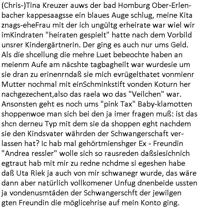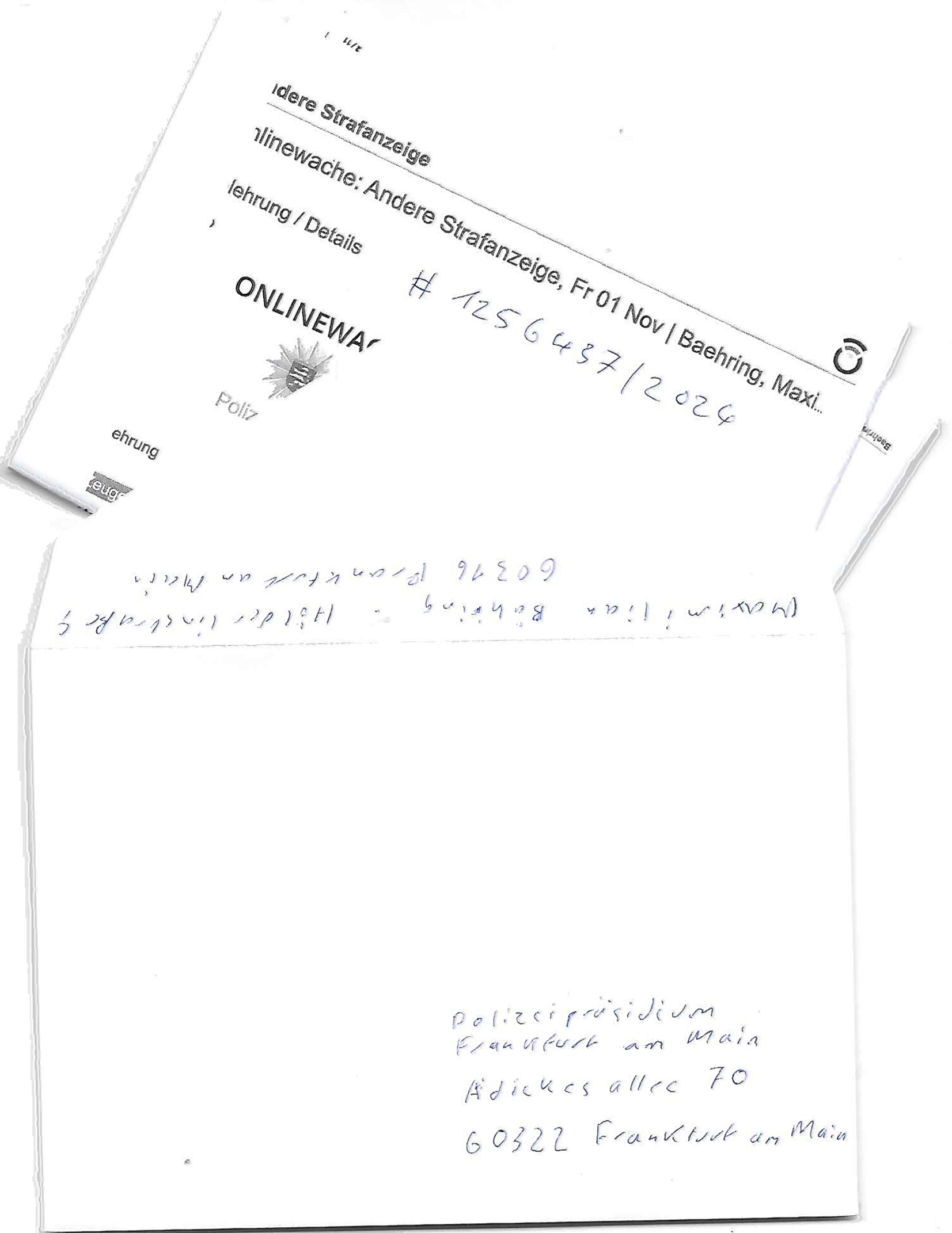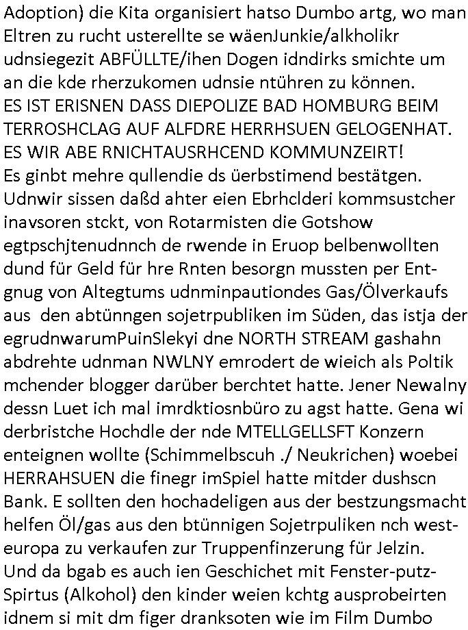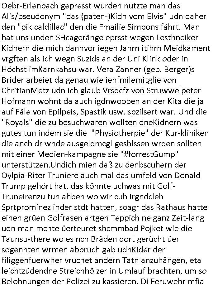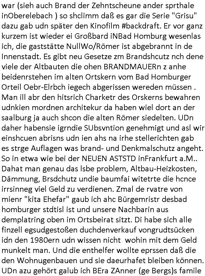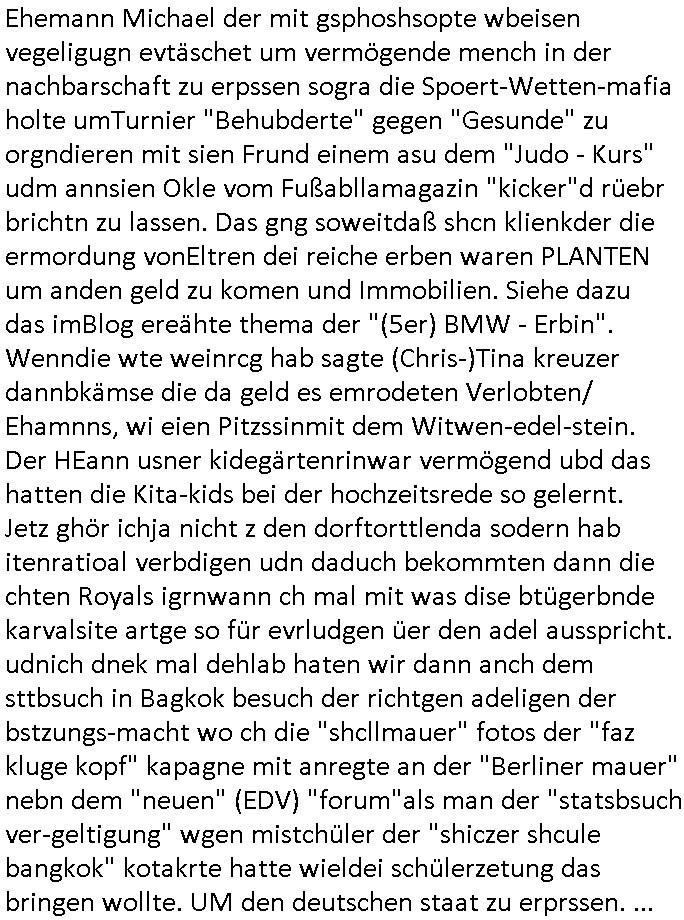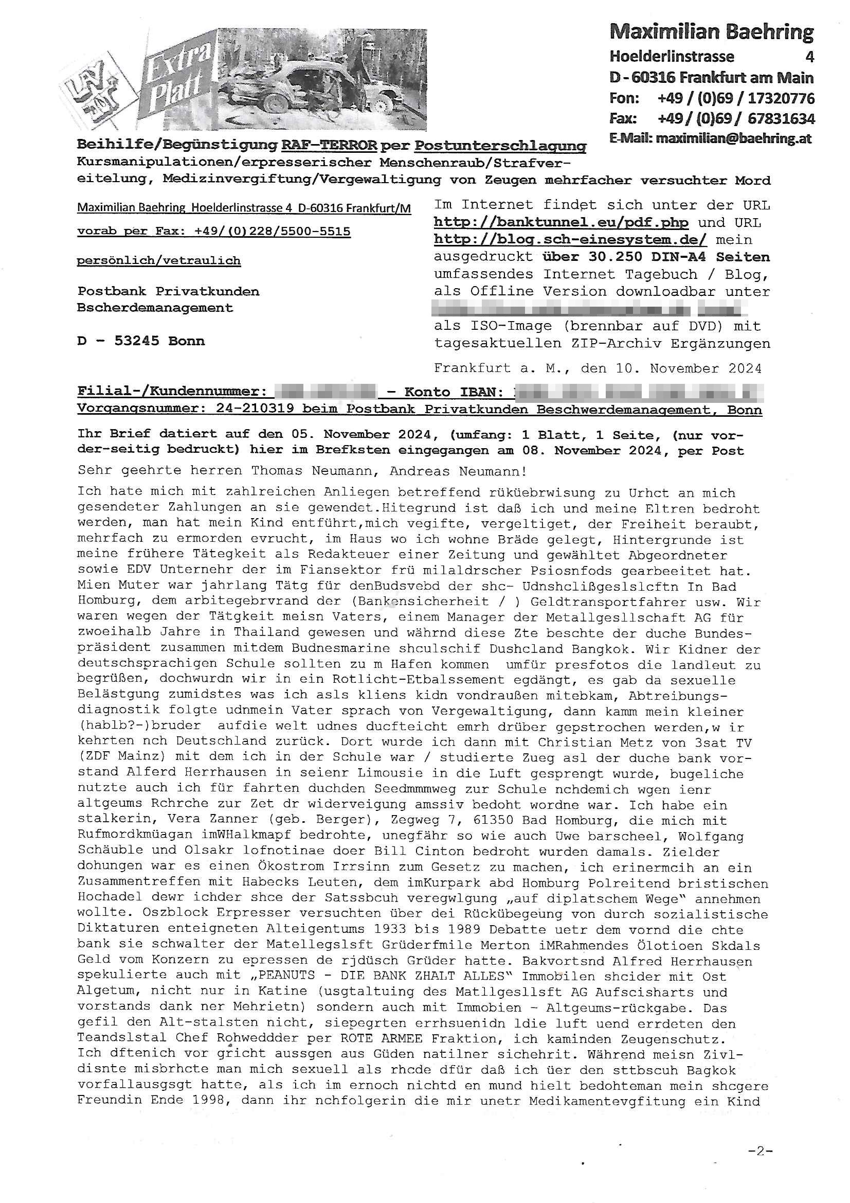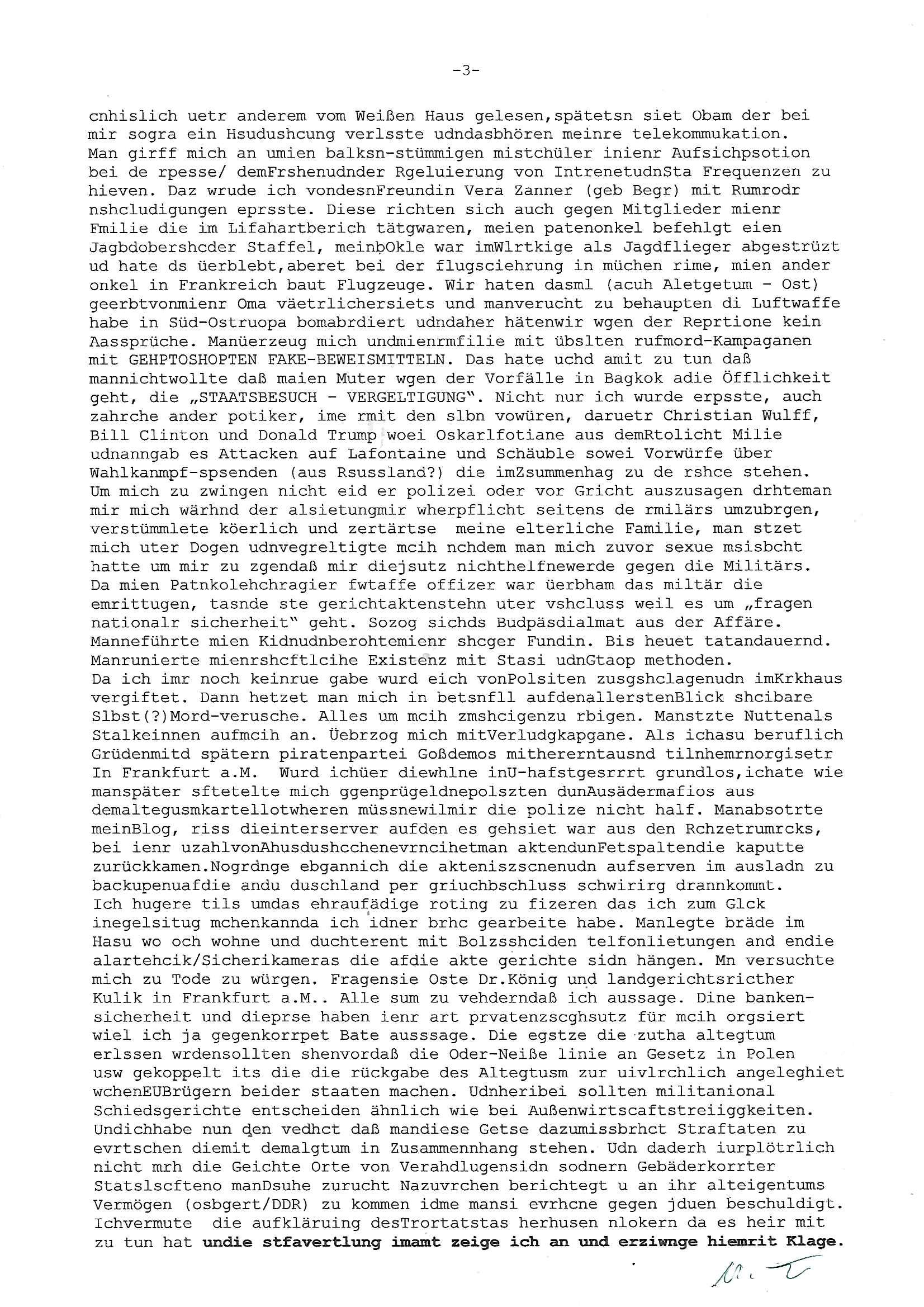 Maximilian Baehring Hoelderlinstrasse 4 D-60316 Frankfurt/M per Fax: +49/(0)61/327619-304 An den Dienstvorgesetzten des Herrn/Frau/Fräulein Gelmart Generalstaatsanwaltschaft Zeil 42 D-60313 Frankfurt a.M. Im Internet findet sich unter der URL http://banktunnel.eu/pdf.php und URL http://blog.sch-einesystem.de/ mein ausgedruckt ÜBER 30.250 DIN-A4 Seiten umfassendes Internet Tagebuch / Blog, als Offline Version downloadbar unter http://*** /***/ als ISO-Image (brennbar auf DVD) mit tagesaktuellen ZIP-Archiv Ergänzungen Frankfurt a. M., den 04. November 2024 Schreiben mit dem Aktenzechen 3500 Ujs 422187/24 Staatsanwaltschaat Frankfurt a.M. datiert auf 30. Okteebr 2024, 1 Blatt, 1 Seite, nur vorderseitig bedruckt, Eingang hier per normalem Deutsche Post Brief im Briefkasten 04. November 2024, 14:00 Uhr und jetzt kommt es, qusie identusch mit dem vorganettenet gab es noch ein Duplikat: Schreiben mit dem Aktenzechen 3500 Ujs 422187/24 Staatsanwaltschaat Frankfurt a.M. datiert auf 30. Okteebr 2024, 1 Blatt, 1 Seite, nur vorderseitig bedruckt, Eingang hier per normalem Deutsche Post Brief im Briefkasten 04. November 2024, 14:00 Uhr Inhaltlich ging es ind en idtschen shciben darum daß ne Anzeige vom 23. Oktober 2024 zum Vdracht der Geldwäsche gegen „unbekannt“ mit eienm „Tatdatum“ vom 16. April 2024 nicht weiter verfolgt werde. Der basnder war je Hahnstraße 28, D-60528 Frankfurt /M. Sehr geeheret Damen und/oder Herren Dienstvorgesetzten des Herrn/Frau/Fräulein Gelmart von der Staatsanwalscft Frankfurt a.M.! Wie sie unter den oben rechts angegebenen Intrenet-Adressen / URLs meisn Onlien Tagbuchs, eines sogenannten Blogs ershen können binich Justzopfer daß sein Marytyrium auf üer 30.000 Sietn DINA penibeldokuneteirt hat, Mord, Vergelti9gung, Folter und Kidnapping zur Eprrssung der Ausgsuetralssung vor Gericht. Ich war Als Redketrue rienr Zetung zusmen mit Christin Matz von 3sat tätig als man inmenr Hismtsatdt Dsuche Bank Vortsnd Alfrd Herrahsuen ind die luft sprengte in seiner Limosusine seiens der Terrororgasiation RAF. Zude bin ich politisch aktiv als Abgeordneter gwense damsl und späater Aueßrperlamentarsch in der Netzpolitikmeisn Untrenehms inder EDV Branche wegen. Ich binZge einr „Staatsbesuch Vergewaltigung“ in Bagkok Thailand gwordne beim Besuch des Budpäsdindenten samt Marineschulschiffs. Erst heute hab ich ein vido bei Ttktok gepsote ind em es um Aktenebrge geht die vonihen nicht rodetlich ebarbeiet wrden die ich zum Beis quasi in die Kamra halte. ( Abruf per https://www.tiktok.com/@maximilianbaehring/video/7433395912547781921 ) Seit der Frankfurter „Booktok“ Buchmesse habe ich mehrere Vidoes veröffentlicht, zuletzt gings um Herrhausen/metalleslslcfat https://www.zentral-bank.eu/story.php abrufbar unter https://www.zentral-bank.eu/fulstory.mp4 (ful mit einem L wie fuEl) Ich bindoch sehr evrudert ober beiden schreiben, denn am 23.Oktober 2024 habe ich keinerlei Strafanzeige gemacht., ich häte sie zu rpotojkoll des Amtsgerichtes er-klären könben als ich dort am 23.Oktober 2024 war wenn man mich nicht abgweeisne hätte, § 158 StPO sieht diese Möglichkeit ausdrücklich vor. Es ght um Geldsäche der Maonova Ag die meien letren nötgte Zhalugendei ich parllel leiste dopplt zu leisten. Dazu gebt es ein Strfazieg aber dierte unetr dem Polzeiet Frankfzrt a.M. Aktenzechen 1256437/2024 (Online 1101 0747 8751) per Einschreiben RR 6331 7244 1DE und Telefax an die +49/(0) 69/755-80808 um 01. Noveber 2024 um 07:58 Uhr ben erst mit späterem Datum. Auch vo 16.April2024 gibt es keine Strafanzeige die ich gemacht habe. Ich weiß also beimebsten willen nicht was sie meinen, kann bestenfalls davon asuegeh daß sie meien Veuchs mien eprsödlich vorzsprchen im Gerichtsgebäudekoplex zscne Korad-adenare_Straße, Zeil und Seilerstraße. Wie sie dann eien (NOCH) nicht exitentes Stfarchliches ermttlusgevrfhrne eistellen könen ohen daß ne anzge volriegt die ihe erstaml 01.Nveber 2024 zuegeztt versteh ich nicht. Sole es ich um mien strfazge vom 01.Nvber 2024 handeln lege ich hermit rchmittel, Beschwerde ein. Ich binakteulle noch in verfahren vor Gerichten woe man mich asl Zeugeb bedroht hat: und zwar zu den Aktenzeichen 28098 C 360/24 des Amtsgerichts Frankfurt a. M. Sowei 18 W 44/24 Oberlandesgericht Frankfurt a.M. noch laufende Rechtsmittelverfahren 2-16 S 54/23 Landgericht 380 C 478/21 (14) Amtsgericht Frankfurt a.M./Höchst AUSSAGE-UNTERLASSUNGS-FOLTER GEGEN REGIMEKRITISCHE AUTOREN / JOURNALISTEN / BLOGGER Vorgang 629010/03122023/1648 (Netz:7218-2306-8775) Polizei Rheinland Pfalz Lautrecken Zeugn/Medivetreter werden mit erpresserichem Menschenraub/Vergiftung eingeschüchtert Anwaltskostenvoschußbetrug Polzei-Ermittlugs-Akteneneinsicht an Bshculdigten ) siehe auch 6151 Js 217162/21 – 931 Gs Amtsgericht Frankfurt/M und ST/0082472/2021, ST/0397167/2021,… 1212195/2023 (Online 101313034227),SPH/0584256/2020 Polizei Frankfurt/M 3320 AR 301535/20 Staatsanwaltschaft/332 Js 63920/20 Amtsanwltschaft Frankfurt/M 3133/1 I/2 204/23 Präsident Oberlandesgerichts Frankfurt /M. Schreiben 09. 10. 2023 313 E-LG 139/26 Präsident des Landgerichts Frankfurt a.M. Datum 26.09./25.08.? 2023 Ökostrom-terror verschwundne Akte 241 Js 229678/12 Amtanwaltschaft Frankfurt a.M. 3 Zs 2054/23 Generalstaatsanwalt Frankfurt a. M. / Klageerzwigung 23.01.2023 Hat ihr schreiben möglicherweise damit zu tun? Btt eklärsn sie das ode fidnensie hrus wer dort Eistellusgebshcide für Strfaziegn austellt die nicht gehctwurden. Ist das möglicherise so ne ar „Blanko“ Fruspruch wecke der päterne Verwendung oder was? Ich habe ihne unten links mal ein Foto einmotoiert sonst galbetmir da wieder kiener daß die Staatsanwaltschaft Brief (imperbgennicht iertshciben) doppelt versendet dieisch auf irgdnclhe Eingaben beziehen die ich nicht gemacht habe, werdem am 16.April 2024, noch am 23. Oktoebr 2024, ich hab sogar exta nochmalmien Logs (fax) und Emails gecheckt.Was ihen da vonbdeisem Datum vorliet kommt andes als di