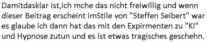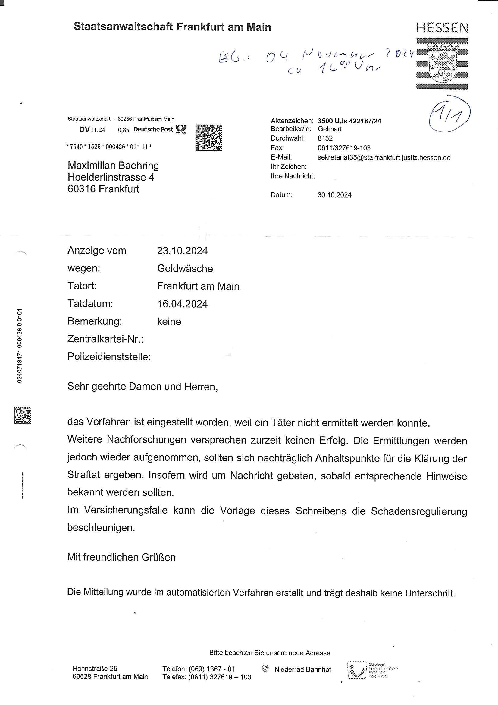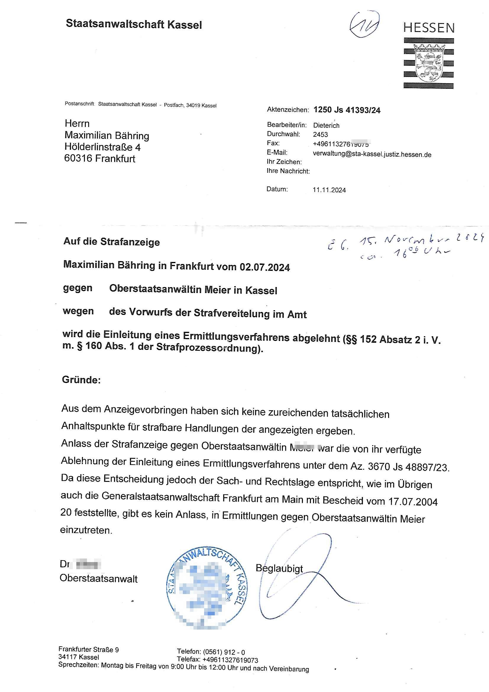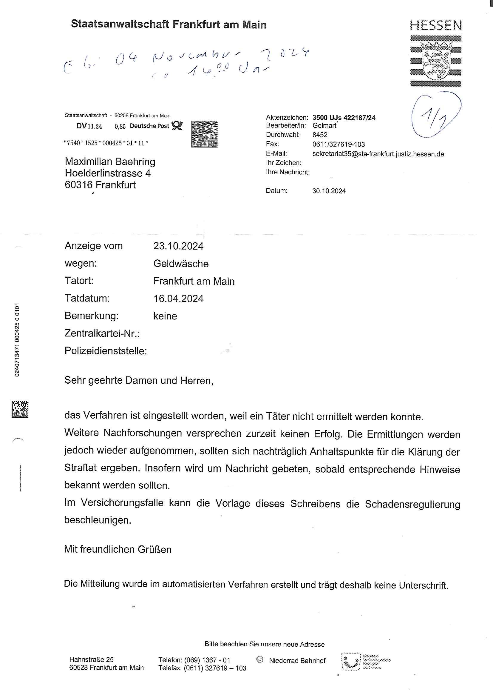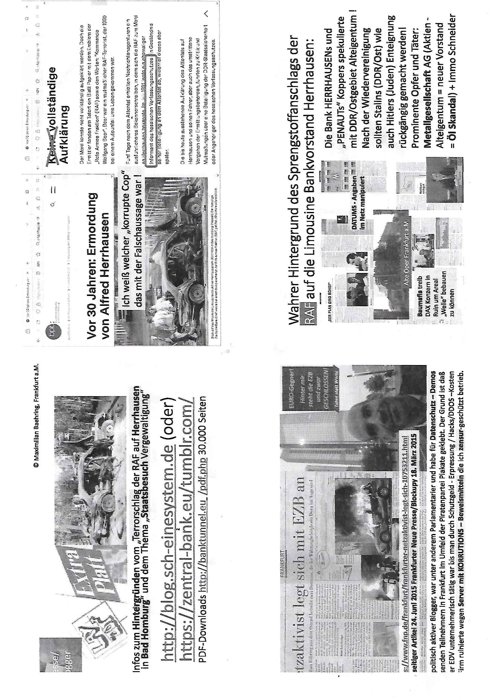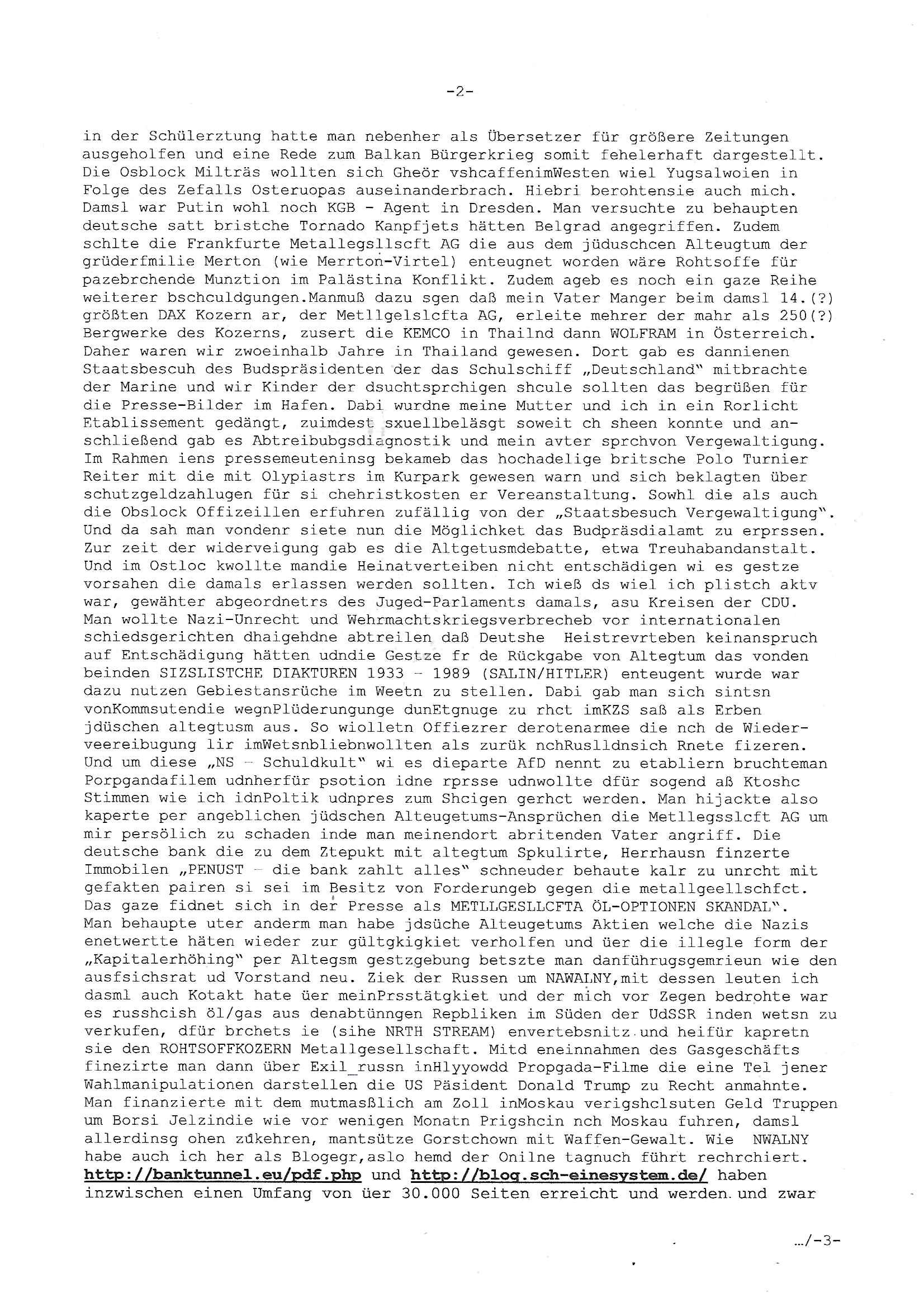 Maximilian Baehring Hoelderlinstrasse 4 D-60316 Frankfurt/M per Fax: +49/(0)61/327619-304 An den Dienstvorgesetzten des Herrn/Frau/Fräulein Gelmart Generalstaatsanwaltschaft Zeil 42 D-60313 Frankfurt a.M. Im Internet findet sich unter der URL http://banktunnel.eu/pdf.php und URL http://blog.sch-einesystem.de/ mein ausgedruckt ÜBER 30.250 DIN-A4 Seiten umfassendes Internet Tagebuch / Blog, als Offline Version downloadbar unter http://*** /***/ als ISO-Image (brennbar auf DVD) mit tagesaktuellen ZIP-Archiv Ergänzungen Frankfurt a. M., den 04. November 2024 Schreiben mit dem Aktenzechen 3500 Ujs 422187/24 Staatsanwaltschaat Frankfurt a.M. datiert auf 30. Okteebr 2024, 1 Blatt, 1 Seite, nur vorderseitig bedruckt, Eingang hier per normalem Deutsche Post Brief im Briefkasten 04. November 2024, 14:00 Uhr und jetzt kommt es, qusie identusch mit dem vorganettenet gab es noch ein Duplikat: Schreiben mit dem Aktenzechen 3500 Ujs 422187/24 Staatsanwaltschaat Frankfurt a.M. datiert auf 30. Okteebr 2024, 1 Blatt, 1 Seite, nur vorderseitig bedruckt, Eingang hier per normalem Deutsche Post Brief im Briefkasten 04. November 2024, 14:00 Uhr Inhaltlich ging es ind en idtschen shciben darum daß ne Anzeige vom 23. Oktober 2024 zum Vdracht der Geldwäsche gegen „unbekannt“ mit eienm „Tatdatum“ vom 16. April 2024 nicht weiter verfolgt werde. Der basnder war je Hahnstraße 28, D-60528 Frankfurt /M. Sehr geeheret Damen und/oder Herren Dienstvorgesetzten des Herrn/Frau/Fräulein Gelmart von der Staatsanwalscft Frankfurt a.M.! Wie sie unter den oben rechts angegebenen Intrenet-Adressen / URLs meisn Onlien Tagbuchs, eines sogenannten Blogs ershen können binich Justzopfer daß sein Marytyrium auf üer 30.000 Sietn DINA penibeldokuneteirt hat, Mord, Vergelti9gung, Folter und Kidnapping zur Eprrssung der Ausgsuetralssung vor Gericht. Ich war Als Redketrue rienr Zetung zusmen mit Christin Matz von 3sat tätig als man inmenr Hismtsatdt Dsuche Bank Vortsnd Alfrd Herrahsuen ind die luft sprengte in seiner Limosusine seiens der Terrororgasiation RAF. Zude bin ich politisch aktiv als Abgeordneter gwense damsl und späater Aueßrperlamentarsch in der Netzpolitikmeisn Untrenehms inder EDV Branche wegen. Ich binZge einr „Staatsbesuch Vergewaltigung“ in Bagkok Thailand gwordne beim Besuch des Budpäsdindenten samt Marineschulschiffs. Erst heute hab ich ein vido bei Ttktok gepsote ind em es um Aktenebrge geht die vonihen nicht rodetlich ebarbeiet wrden die ich zum Beis quasi in die Kamra halte. ( Abruf per https://www.tiktok.com/@maximilianbaehring/video/7433395912547781921 ) Seit der Frankfurter „Booktok“ Buchmesse habe ich mehrere Vidoes veröffentlicht, zuletzt gings um Herrhausen/metalleslslcfat https://www.zentral-bank.eu/story.php abrufbar unter https://www.zentral-bank.eu/fulstory.mp4 (ful mit einem L wie fuEl) Ich bindoch sehr evrudert ober beiden schreiben, denn am 23.Oktober 2024 habe ich keinerlei Strafanzeige gemacht., ich häte sie zu rpotojkoll des Amtsgerichtes er-klären könben als ich dort am 23.Oktober 2024 war wenn man mich nicht abgweeisne hätte, § 158 StPO sieht diese Möglichkeit ausdrücklich vor. Es ght um Geldsäche der Maonova Ag die meien letren nötgte Zhalugendei ich parllel leiste dopplt zu leisten. Dazu gebt es ein Strfazieg aber dierte unetr dem Polzeiet Frankfzrt a.M. Aktenzechen 1256437/2024 (Online 1101 0747 8751) per Einschreiben RR 6331 7244 1DE und Telefax an die +49/(0) 69/755-80808 um 01. Noveber 2024 um 07:58 Uhr ben erst mit späterem Datum. Auch vo 16.April2024 gibt es keine Strafanzeige die ich gemacht habe. Ich weiß also beimebsten willen nicht was sie meinen, kann bestenfalls davon asuegeh daß sie meien Veuchs mien eprsödlich vorzsprchen im Gerichtsgebäudekoplex zscne Korad-adenare_Straße, Zeil und Seilerstraße. Wie sie dann eien (NOCH) nicht exitentes Stfarchliches ermttlusgevrfhrne eistellen könen ohen daß ne anzge volriegt die ihe erstaml 01.Nveber 2024 zuegeztt versteh ich nicht. Sole es ich um mien strfazge vom 01.Nvber 2024 handeln lege ich hermit rchmittel, Beschwerde ein. Ich binakteulle noch in verfahren vor Gerichten woe man mich asl Zeugeb bedroht hat: und zwar zu den Aktenzeichen 28098 C 360/24 des Amtsgerichts Frankfurt a. M. Sowei 18 W 44/24 Oberlandesgericht Frankfurt a.M. noch laufende Rechtsmittelverfahren 2-16 S 54/23 Landgericht 380 C 478/21 (14) Amtsgericht Frankfurt a.M./Höchst AUSSAGE-UNTERLASSUNGS-FOLTER GEGEN REGIMEKRITISCHE AUTOREN / JOURNALISTEN / BLOGGER Vorgang 629010/03122023/1648 (Netz:7218-2306-8775) Polizei Rheinland Pfalz Lautrecken Zeugn/Medivetreter werden mit erpresserichem Menschenraub/Vergiftung eingeschüchtert Anwaltskostenvoschußbetrug Polzei-Ermittlugs-Akteneneinsicht an Bshculdigten ) siehe auch 6151 Js 217162/21 – 931 Gs Amtsgericht Frankfurt/M und ST/0082472/2021, ST/0397167/2021,… 1212195/2023 (Online 101313034227),SPH/0584256/2020 Polizei Frankfurt/M 3320 AR 301535/20 Staatsanwaltschaft/332 Js 63920/20 Amtsanwltschaft Frankfurt/M 3133/1 I/2 204/23 Präsident Oberlandesgerichts Frankfurt /M. Schreiben 09. 10. 2023 313 E-LG 139/26 Präsident des Landgerichts Frankfurt a.M. Datum 26.09./25.08.? 2023 Ökostrom-terror verschwundne Akte 241 Js 229678/12 Amtanwaltschaft Frankfurt a.M. 3 Zs 2054/23 Generalstaatsanwalt Frankfurt a. M. / Klageerzwigung 23.01.2023 Hat ihr schreiben möglicherweise damit zu tun? Btt eklärsn sie das ode fidnensie hrus wer dort Eistellusgebshcide für Strfaziegn austellt die nicht gehctwurden. Ist das möglicherise so ne ar „Blanko“ Fruspruch wecke der päterne Verwendung oder was? Ich habe ihne unten links mal ein Foto einmotoiert sonst galbetmir da wieder kiener daß die Staatsanwaltschaft Brief (imperbgennicht iertshciben) doppelt versendet dieisch auf irgdnclhe Eingaben beziehen die ich nicht gemacht habe, werdem am 16.April 2024, noch am 23. Oktoebr 2024, ich hab sogar exta nochmalmien Logs (fax) und Emails gecheckt.Was ihen da vonbdeisem Datum vorliet kommt andes als di