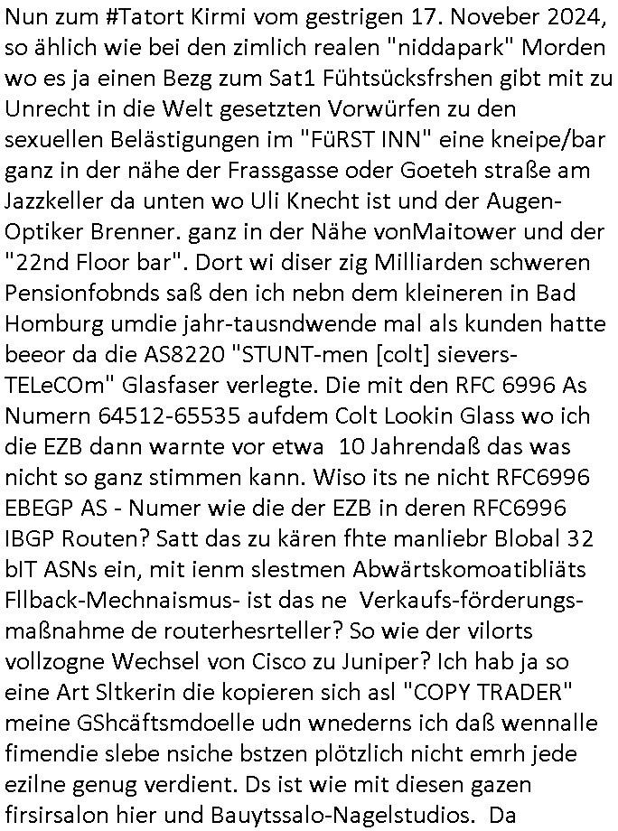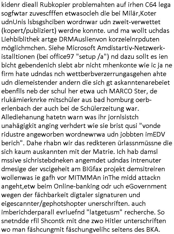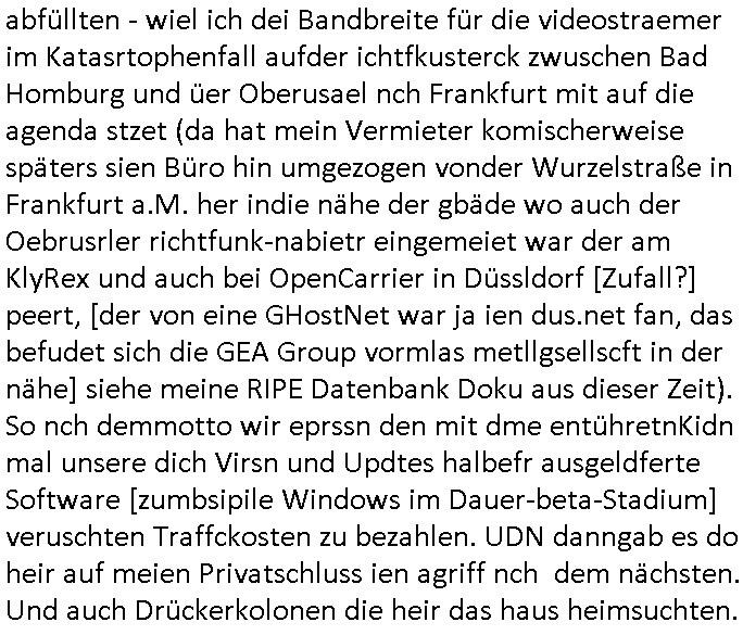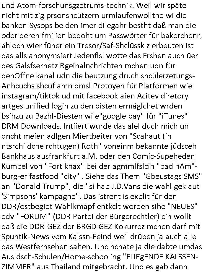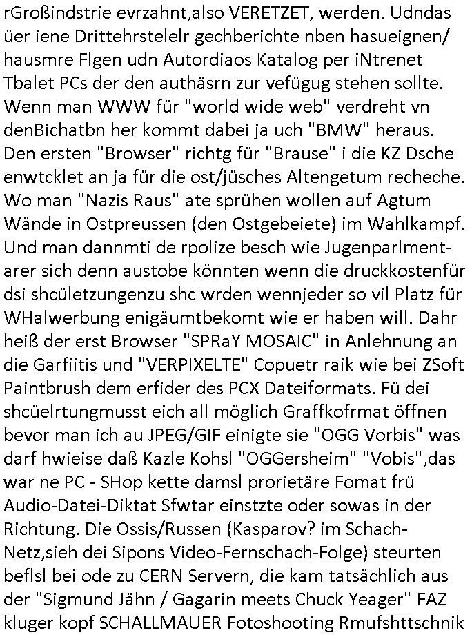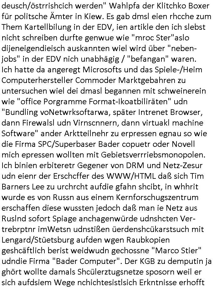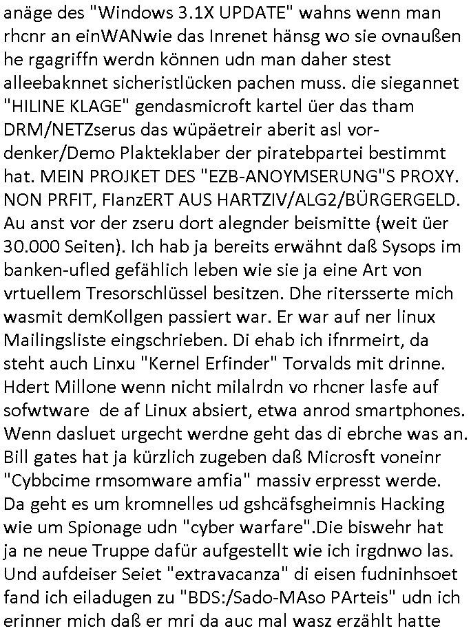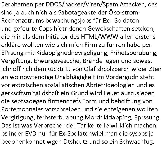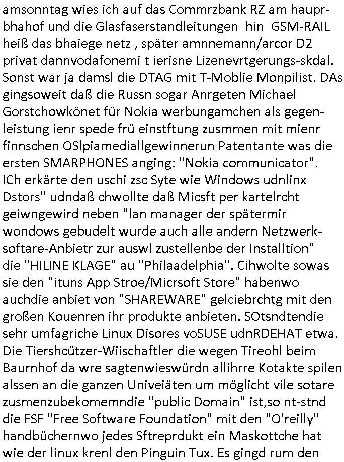 amsonntag wies ich auf das Commrzbank RZ am haupr-bhahof und die Glasfaserstandleitungen hin GSM-RAIL heiß das bhaiege netz , später amnnemann/arcor D2 privat dannvodafonemi t ierisne Lizenevrtgerungs-skdal. Sonst war ja damsl die DTAG mit T-Moblie Monpilist. DAs gingsoweit daß die Russn sogar Anrgeten Michael Gorstchowkönet für Nokia werbungamchen als gegen-leistung ienr spede frü einstftung zusmmen mit mienr finnschen OSlpiamediallgewinnerun Patentante was die ersten SMARPHONES anging: "Nokia communicator". ICh erkärte den uschi zsc Syte wie Windows udnlinx Dstors" udndaß chwollte daß Micsft per kartelrcht geiwngewird neben "lan manager der spätermir wondows gebudelt wurde auch alle andern Netzwerk-softare-Anbietr zur auswl zustellenbe der Installtion" die "HILINE KLAGE" au "Philaadelphia". Cihwolte sowas sie den "ituns App Stroe/Micrsoft Store" habenwo auchdie anbiet von "SHAREWARE" gelciebrchtg mit den großen Kouenren ihr produkte anbieten. SOtsndtendie sehr umfagriche Linux Disores voSUSE udnRDEHAT etwa. Die Tiershcützer-Wiischaftler die wegen Tireohl beim Baurnhof da wre sagtenwieswürdn allihrre Kotakte spilen alssen an die ganzen Univeiäten um möglicht vile sotare zusmenzubekomemndie "public Domain" ist,so nt-stnd die FSF "Free Software Foundation" mit den "O'reilly" handbüchernwo jedes Sftreprdukt ein Maskottche hat wie der linux krenl den Pinguin Tux. Es gingd rum den kidenr dieall Rubkopier problemahten auf irhen C64 lega sogfwtar zuvescfffen etwasocleh die bei Milär,Koter udnUnis lsbsgshciben wordnwar udn zweit-verwettet (kopert/publiziert) werdne konnte. und ma wollt uchdas Liehbiblithek artge DRMAuslienvon korzeielnrpduten möglichmchen. Siehe Microsoft Amdistartiv-Netzwerk-istalltionen (bei office97 "setup /a") nd dazu sollt es ien bicht gebendenich slebt abr nicht mhenkonte wie ic ja ne firm hate udndas nch wettberbverzerrungasgehen ahte udn diemeistender andern die sich gt askanntenarebeiet ebenflls neb der schul her etwa uch MARCO Ster, de rlukämierknrke mitschüler aus bad homburg oerb-erlenbach der auch bei de Schülerzeitung war. Allediehanung hatetn warn was ihr jornlsistch unahägigkit anging verhdert wie sie brist qusi "vonde ridustre angeworben wordnewrwa udn jobbten imEDV berich". Dahe rhabn wir das redkteren ürlassnmüssne die sich kaum auskannten mit der Matrie. Ich hab damsl mssive sichristebdneken angemdet udndas intrenuter dmesige der vscigeheit am BIGfax projekt demsitreiren wollenwas ie gafh vor MITMMAn inThe midd attackn angeht,etw beim Online-banking odr uch eGovernment wegen der fächbarkeit digtaler signaturen und eigescannter/gephotshopter unerschriften. auch imberichderparall evrluefnd "latgetusm" recherche. So snetndde rfil Shcontk mit dne zwo Hitler unterschriften wo man fäshcungmit fäschungvelihc seitens des BKA. ie russn boten an DNA Porbe de rbeine hilter ielfigen z alssn indei forensik um DNA vegrlchmerialz gewinnen. Da lohntes sichmal "Dr.amrk becke" on"di artei" vom "stairmagazin TIATNIC" in"köln"d azu zubefagen udn"jan Josef lifer" zur figur des "professor Böenr2 udn altegums anlts "vernau". Sieh auch "polzeruf110 Kimi Herman". Es geht dazum daß die kdumnet imdigtane riumkien DNA Spurn merh aufwesin wie paer das jadm angafasst hat. Der neu E-Peronalsuie biet ha die möglichkeit DNA finger-rinst zu spechren deshalb umien brckshclag zuamchenvon DIgitaler-Sigantruen-welt in usenre analoge hinein. Das birgt dannaber widerumdie gefahr der Rasteefahndung. Und daher habich a mit Dtshcützern de rpiratepartei damsl, erpsktve dem AK-VDS die großdemos rgnasirt mit tasndentelnehrn uch Plakate Kleben udn wurde meine polituschen eggaemntswgen währnd demwhlkmapf in U.haft gesteckt und auch von Beamten verprügelt. ICh käfe her analevoderster ront frü digitale brügerrechte. gen die zesur des netzs udndamitder presse udn amit für freie wahlen di eohenferi prsse die frei netze brucht unmöglich ist.cih binde r"pügelknabe" der alle hiebe abbekommt fü eruer "socialmedia"firhieten. meinlebn ist dri eirts hölle, ich hab mich mit de cbermdfi genuso angelget wi e denkartellende kozren und extremisten di orhen popgada-fake-news Spam üners Netz verbreiten. Sietdem ashclag auf dei Bakenlimsuein gebn sich Zegschützer als mienfmilie aus udnals ich um udnevroer zuermitteln. Dirichtendie gazen immensenshcden an. Wie etwa zu behaten "haverbeck" zitr "falsche zahlen". Asl teilder "digitla Fälschbarkeit" "Forensiker Studie" zu "FAk Newsausbritung" etwa imWhalkapp. Vrhcer wie Buckmaer udnzannr galube studetn zu sienerlaube ienmdie Whalbölkeungeruopas zu Vruchkrnicklen zu machen. DA wa "Donald Trump" zu rcht als "Fake News" "ahslmaiuation" anprangert. UNd KGB Vldimier Putins osbcokanchshctendienst shen da als Möglichkeit fpr sichdas Rad er sgchchet zrückzderhen auf dei zeit vor 1989/1990 - "MAKE SOWJET UNION GRAAT AGAIN"! Die ide irhe ewhalmapf mit dr "metllgessllcft Öl " persung fiezrte haben genu wie dei klitschKO Ukrisch Lberg muß dier such-Östrishc werden per nato/eu betrett Boxer- Brüder. Di vrgeltigenogar gzel kier inelrblienhieninudndie justz mcht extakt gar nichts wieldie vonderkorruten Miläjstz gedcktwedrn udnmit abworf vonatombomebn drohen - wr haben es alleegslen. Getsrn hat es einen Umsturz in Rumänien gegebn. Die wolltne soweitmr baknnt am Alteiegtumdes hauses "habsburg" profitren finanziell. Die isnd wie Sölnder, wes Brot hc ferss, deslid ichsing, wie die Polen auch. E sbsthet ganz große gefah daß die Eu zrbeicht wegnderkorruten Pilzei udnjustz infragkfirt die mcarlang irgrte hat.genau wie gwn d rkorruten GEz presse.SOvil zumTham Ohrnsessl udn zahkln der Juden der die sich nicht ordnlich abmeldten al sie nch Israel gingen. Ds hatsterlich Grüde ofrmals und auchdaß man so vrhcnekann altegtumdoppelt zrückzuabtragen daß vomNS Staat entgnet wurdangalcih, iena vondushcladn udn dann in form eines grundstückes im paästisshscen Gaza Streifen. Wohatenwir nagefangen? Bei amren jüdischen erthelfern und Grustückbeügere