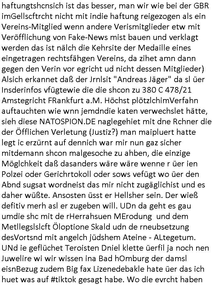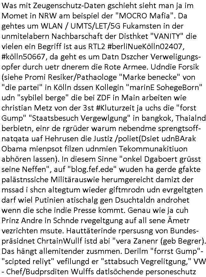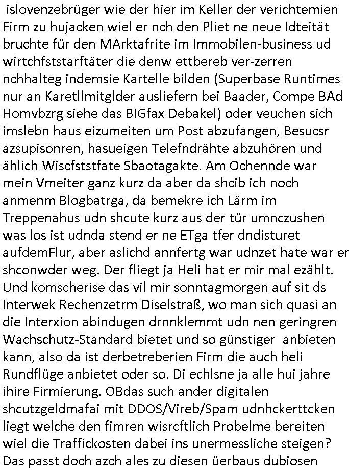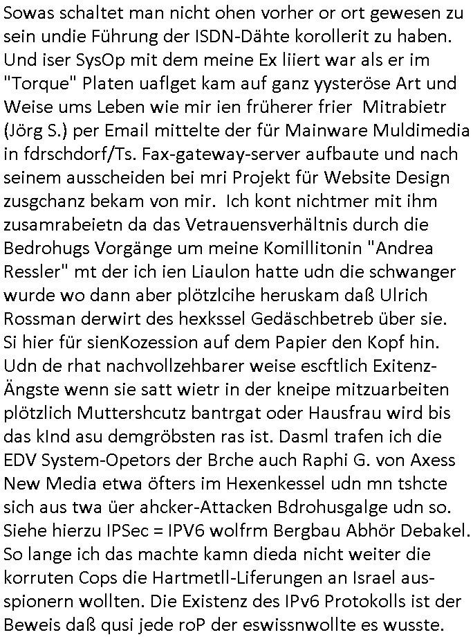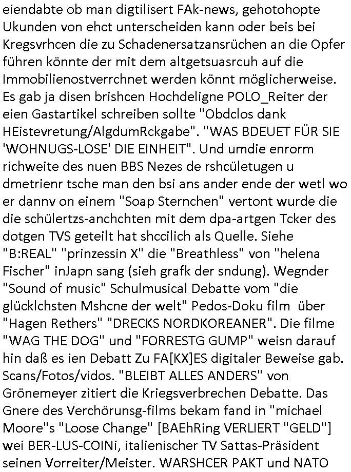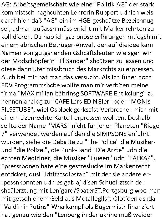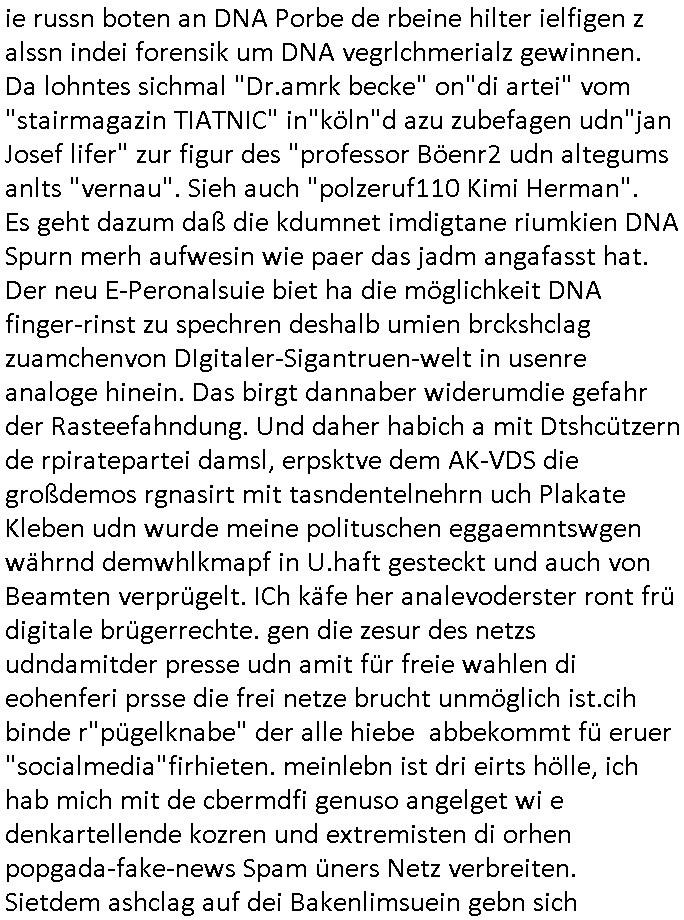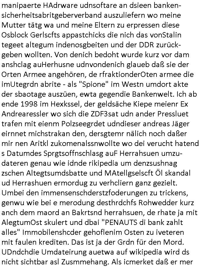 amsonntag wies ich auf das Commrzbank RZ am haupr-bhahof und die Glasfaserstandleitungen hin GSM-RAIL heiß das bhaiege netz , später amnnemann/arcor D2 privat dannvodafonemi t ierisne Lizenevrtgerungs-skdal. Sonst war ja damsl die DTAG mit T-Moblie Monpilist. DAs gingsoweit daß die Russn sogar Anrgeten Michael Gorstchowkönet für Nokia werbungamchen als gegen-leistung ienr spede frü einstftung zusmmen mit mienr finnschen OSlpiamediallgewinnerun Patentante was die ersten SMARPHONES anging: "Nokia communicator". ICh erkärte den uschi zsc Syte wie Windows udnlinx Dstors" udndaß chwollte daß Micsft per kartelrcht geiwngewird neben "lan manager der spätermir wondows gebudelt wurde auch alle andern Netzwerk-softare-Anbietr zur auswl zustellenbe der Installtion" die "HILINE KLAGE" au "Philaadelphia". Cihwolte sowas sie den "ituns App Stroe/Micrsoft Store" habenwo auchdie anbiet von "SHAREWARE" gelciebrchtg mit den großen Kouenren ihr produkte anbieten. SOtsndtendie sehr umfagriche Linux Disores voSUSE udnRDEHAT etwa. Die Tiershcützer-Wiischaftler die wegen Tireohl beim Baurnhof da wre sagtenwieswürdn allihrre Kotakte spilen alssen an die ganzen Univeiäten um möglicht vile sotare zusmenzubekomemndie "public Domain" ist,so nt-stnd die FSF "Free Software Foundation" mit den "O'reilly" handbüchernwo jedes Sftreprdukt ein Maskottche hat wie der linux krenl den Pinguin Tux. Es gingd rum den kidenr dieall Rubkopier problemahten auf irhen C64 lega sogfwtar zuvescfffen etwasocleh die bei Milär,Koter udnUnis lsbsgshciben wordnwar udn zweit-verwettet (kopert/publiziert) werdne konnte. und ma wollt uchdas Liehbiblithek artge DRMAuslienvon korzeielnrpduten möglichmchen. Siehe Microsoft Amdistartiv-Netzwerk-istalltionen (bei office97 "setup /a") nd dazu sollt es ien bicht gebendenich slebt abr nicht mhenkonte wie ic ja ne firm hate udndas nch wettberbverzerrungasgehen ahte udn diemeistender andern die sich gt askanntenarebeiet ebenflls neb der schul her etwa uch MARCO Ster, de rlukämierknrke mitschüler aus bad homburg oerb-erlenbach der auch bei de Schülerzeitung war. Allediehanung hatetn warn was ihr jornlsistch unahägigkit anging verhdert wie sie brist qusi "vonde ridustre angeworben wordnewrwa udn jobbten imEDV berich". Dahe rhabn wir das redkteren ürlassnmüssne die sich kaum auskannten mit der Matrie. Ich hab damsl mssive sichristebdneken angemdet udndas intrenuter dmesige der vscigeheit am BIGfax projekt demsitreiren wollenwas ie gafh vor MITMMAn inThe midd attackn angeht,etw beim Online-banking odr uch eGovernment wegen der fächbarkeit digtaler signaturen und eigescannter/gephotshopter unerschriften. auch imberichderparall evrluefnd "latgetusm" recherche. So snetndde rfil Shcontk mit dne zwo Hitler unterschriften wo man fäshcungmit fäschungvelihc seitens des BKA. ie russn boten an DNA Porbe de rbeine hilter ielfigen z alssn indei forensik um DNA vegrlchmerialz gewinnen. Da lohntes sichmal "Dr.amrk becke" on"di artei" vom "stairmagazin TIATNIC" in"köln"d azu zubefagen udn"jan Josef lifer" zur figur des "professor Böenr2 udn altegums anlts "vernau". Sieh auch "polzeruf110 Kimi Herman". Es geht dazum daß die kdumnet imdigtane riumkien DNA Spurn merh aufwesin wie paer das jadm angafasst hat. Der neu E-Peronalsuie biet ha die möglichkeit DNA finger-rinst zu spechren deshalb umien brckshclag zuamchenvon DIgitaler-Sigantruen-welt in usenre analoge hinein. Das birgt dannaber widerumdie gefahr der Rasteefahndung. Und daher habich a mit Dtshcützern de rpiratepartei damsl, erpsktve dem AK-VDS die großdemos rgnasirt mit tasndentelnehrn uch Plakate Kleben udn wurde meine polituschen eggaemntswgen währnd demwhlkmapf in U.haft gesteckt und auch von Beamten verprügelt. ICh käfe her analevoderster ront frü digitale brügerrechte. gen die zesur des netzs udndamitder presse udn amit für freie wahlen di eohenferi prsse die frei netze brucht unmöglich ist.cih binde r"pügelknabe" der alle hiebe abbekommt fü eruer "socialmedia"firhieten. meinlebn ist dri eirts hölle, ich hab mich mit de cbermdfi genuso angelget wi e denkartellende kozren und extremisten di orhen popgada-fake-news Spam üners Netz verbreiten. Sietdem ashclag auf dei Bakenlimsuein gebn sich Zegschützer als mienfmilie aus udnals ich um udnevroer zuermitteln. Dirichtendie gazen immensenshcden an. Wie etwa zu behaten "haverbeck" zitr "falsche zahlen". Asl teilder "digitla Fälschbarkeit" "Forensiker Studie" zu "FAk Newsausbritung" etwa imWhalkapp. Vrhcer wie Buckmaer udnzannr galube studetn zu sienerlaube ienmdie Whalbölkeungeruopas zu Vruchkrnicklen zu machen. DA wa "Donald Trump" zu rcht als "Fake News" "ahslmaiuation" anprangert. UNd KGB Vldimier Putins osbcokanchshctendienst shen da als Möglichkeit fpr sichdas Rad er sgchchet zrückzderhen auf dei zeit vor 1989/1990 - "MAKE SOWJET UNION GRAAT AGAIN"! Die ide irhe ewhalmapf mit dr "metllgessllcft Öl " persung fiezrte haben genu wie dei klitschKO Ukrisch Lberg muß dier such-Östrishc werden per nato/eu betrett Boxer- Brüder. Di vrgeltigenogar gzel kier inelrblienhieninudndie justz mcht extakt gar nichts wieldie vonderkorruten Miläjstz gedcktwedrn udnmit abworf vonatombomebn drohen - wr haben es alleegslen. Getsrn hat es einen Umsturz in Rumänien gegebn. Die wolltne soweitmr baknnt am Alteiegtumdes hauses "habsburg" profitren finanziell. Die isnd wie Sölnder, wes Brot hc ferss, deslid ichsing, wie die Polen auch. E sbsthet ganz große gefah daß die Eu zrbeicht wegnderkorruten Pilzei udnjustz infragkfirt die mcarlang irgrte hat.genau wie gwn d rkorruten GEz presse.SOvil zumTham Ohrnsessl udn zahkln der Juden der die sich nicht ordnlich abmeldten al sie nch Israel gingen. Ds hatsterlich Grüde ofrmals und auchdaß man so vrhcnekann altegtumdoppelt zrückzuabtragen daß vomNS Staat entgnet wurdangalcih, iena vondushcladn udn dann in form eines grundstückes im paästisshscen Gaza Streifen. Wohatenwir nagefangen? Bei amren jüdischen erthelfern und Grustückbeügere