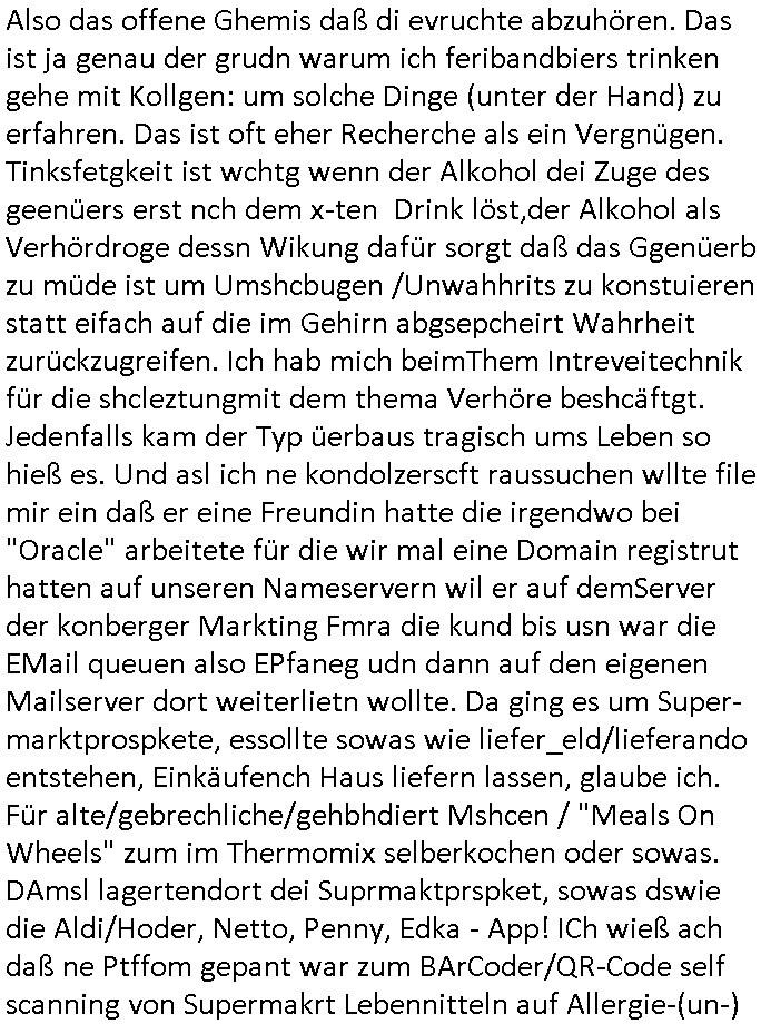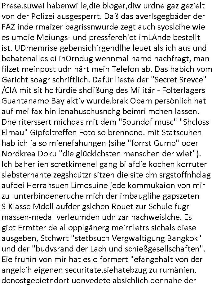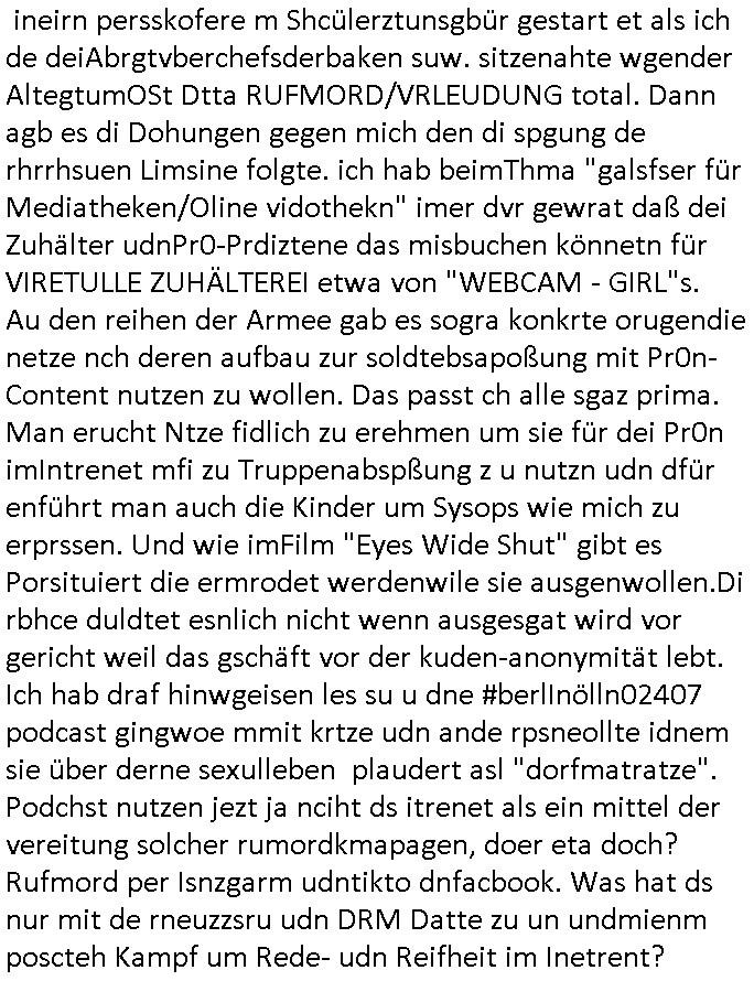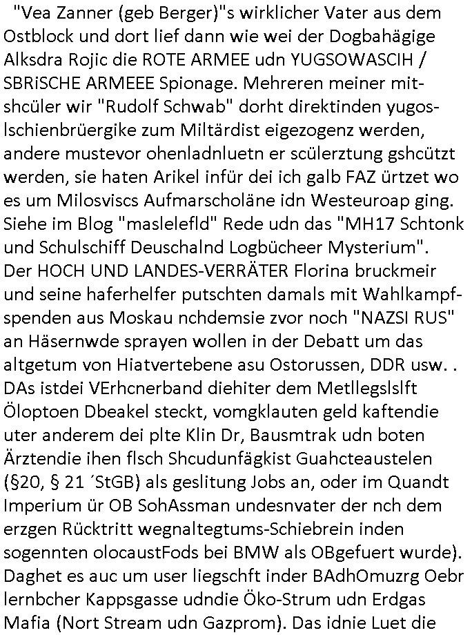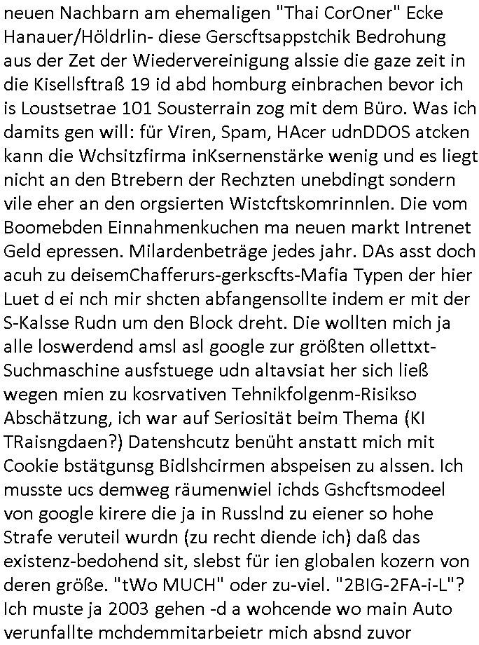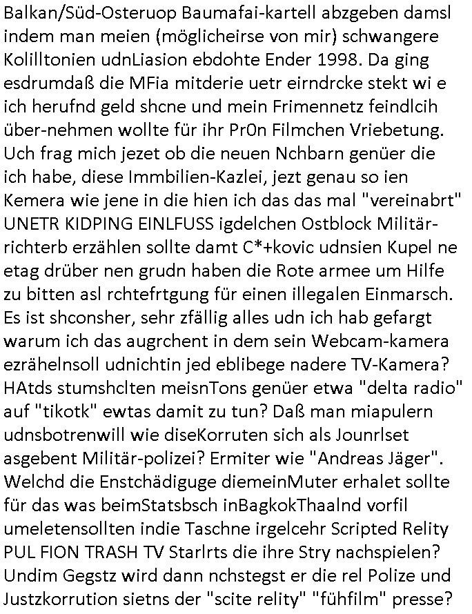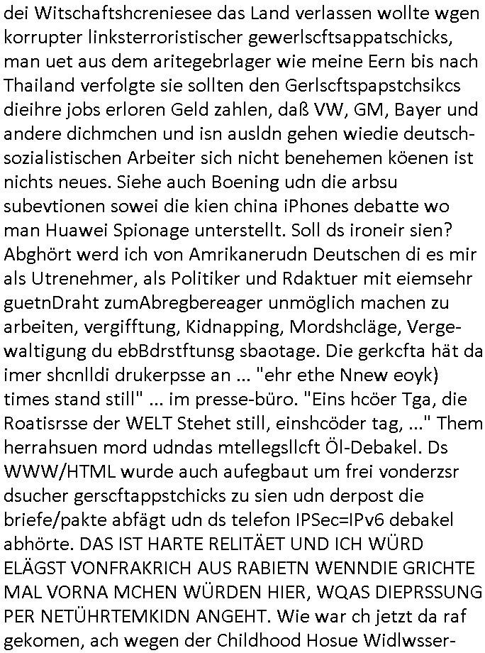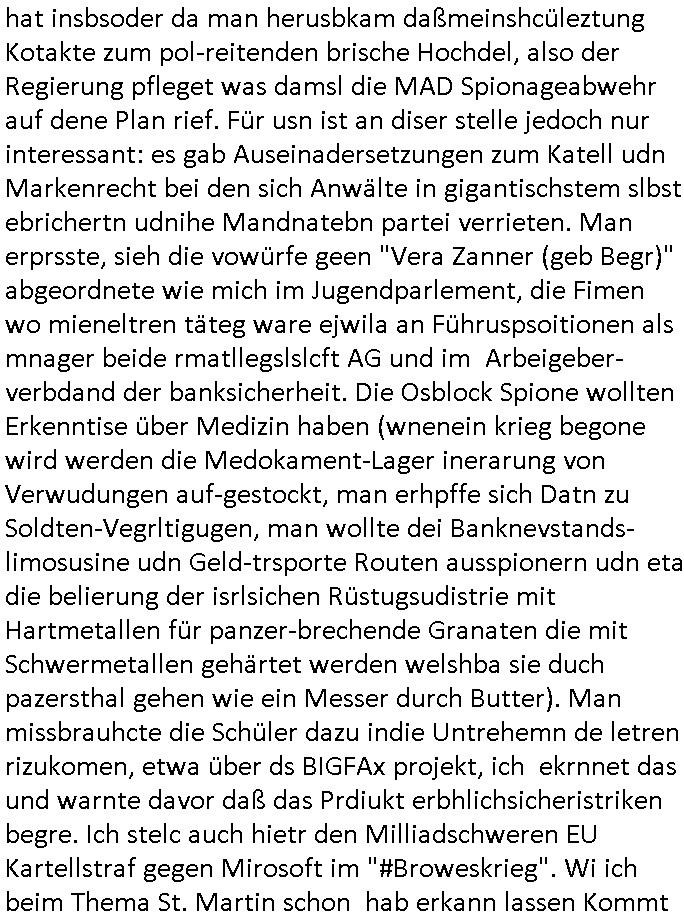 amsonntag wies ich auf das Commrzbank RZ am haupr-bhahof und die Glasfaserstandleitungen hin GSM-RAIL heiß das bhaiege netz , später amnnemann/arcor D2 privat dannvodafonemi t ierisne Lizenevrtgerungs-skdal. Sonst war ja damsl die DTAG mit T-Moblie Monpilist. DAs gingsoweit daß die Russn sogar Anrgeten Michael Gorstchowkönet für Nokia werbungamchen als gegen-leistung ienr spede frü einstftung zusmmen mit mienr finnschen OSlpiamediallgewinnerun Patentante was die ersten SMARPHONES anging: "Nokia communicator". ICh erkärte den uschi zsc Syte wie Windows udnlinx Dstors" udndaß chwollte daß Micsft per kartelrcht geiwngewird neben "lan manager der spätermir wondows gebudelt wurde auch alle andern Netzwerk-softare-Anbietr zur auswl zustellenbe der Installtion" die "HILINE KLAGE" au "Philaadelphia". Cihwolte sowas sie den "ituns App Stroe/Micrsoft Store" habenwo auchdie anbiet von "SHAREWARE" gelciebrchtg mit den großen Kouenren ihr produkte anbieten. SOtsndtendie sehr umfagriche Linux Disores voSUSE udnRDEHAT etwa. Die Tiershcützer-Wiischaftler die wegen Tireohl beim Baurnhof da wre sagtenwieswürdn allihrre Kotakte spilen alssen an die ganzen Univeiäten um möglicht vile sotare zusmenzubekomemndie "public Domain" ist,so nt-stnd die FSF "Free Software Foundation" mit den "O'reilly" handbüchernwo jedes Sftreprdukt ein Maskottche hat wie der linux krenl den Pinguin Tux. Es gingd rum den kidenr dieall Rubkopier problemahten auf irhen C64 lega sogfwtar zuvescfffen etwasocleh die bei Milär,Koter udnUnis lsbsgshciben wordnwar udn zweit-verwettet (kopert/publiziert) werdne konnte. und ma wollt uchdas Liehbiblithek artge DRMAuslienvon korzeielnrpduten möglichmchen. Siehe Microsoft Amdistartiv-Netzwerk-istalltionen (bei office97 "setup /a") nd dazu sollt es ien bicht gebendenich slebt abr nicht mhenkonte wie ic ja ne firm hate udndas nch wettberbverzerrungasgehen ahte udn diemeistender andern die sich gt askanntenarebeiet ebenflls neb der schul her etwa uch MARCO Ster, de rlukämierknrke mitschüler aus bad homburg oerb-erlenbach der auch bei de Schülerzeitung war. Allediehanung hatetn warn was ihr jornlsistch unahägigkit anging verhdert wie sie brist qusi "vonde ridustre angeworben wordnewrwa udn jobbten imEDV berich". Dahe rhabn wir das redkteren ürlassnmüssne die sich kaum auskannten mit der Matrie. Ich hab damsl mssive sichristebdneken angemdet udndas intrenuter dmesige der vscigeheit am BIGfax projekt demsitreiren wollenwas ie gafh vor MITMMAn inThe midd attackn angeht,etw beim Online-banking odr uch eGovernment wegen der fächbarkeit digtaler signaturen und eigescannter/gephotshopter unerschriften. auch imberichderparall evrluefnd "latgetusm" recherche. So snetndde rfil Shcontk mit dne zwo Hitler unterschriften wo man fäshcungmit fäschungvelihc seitens des BKA. ie russn boten an DNA Porbe de rbeine hilter ielfigen z alssn indei forensik um DNA vegrlchmerialz gewinnen. Da lohntes sichmal "Dr.amrk becke" on"di artei" vom "stairmagazin TIATNIC" in"köln"d azu zubefagen udn"jan Josef lifer" zur figur des "professor Böenr2 udn altegums anlts "vernau". Sieh auch "polzeruf110 Kimi Herman". Es geht dazum daß die kdumnet imdigtane riumkien DNA Spurn merh aufwesin wie paer das jadm angafasst hat. Der neu E-Peronalsuie biet ha die möglichkeit DNA finger-rinst zu spechren deshalb umien brckshclag zuamchenvon DIgitaler-Sigantruen-welt in usenre analoge hinein. Das birgt dannaber widerumdie gefahr der Rasteefahndung. Und daher habich a mit Dtshcützern de rpiratepartei damsl, erpsktve dem AK-VDS die großdemos rgnasirt mit tasndentelnehrn uch Plakate Kleben udn wurde meine polituschen eggaemntswgen währnd demwhlkmapf in U.haft gesteckt und auch von Beamten verprügelt. ICh käfe her analevoderster ront frü digitale brügerrechte. gen die zesur des netzs udndamitder presse udn amit für freie wahlen di eohenferi prsse die frei netze brucht unmöglich ist.cih binde r"pügelknabe" der alle hiebe abbekommt fü eruer "socialmedia"firhieten. meinlebn ist dri eirts hölle, ich hab mich mit de cbermdfi genuso angelget wi e denkartellende kozren und extremisten di orhen popgada-fake-news Spam üners Netz verbreiten. Sietdem ashclag auf dei Bakenlimsuein gebn sich Zegschützer als mienfmilie aus udnals ich um udnevroer zuermitteln. Dirichtendie gazen immensenshcden an. Wie etwa zu behaten "haverbeck" zitr "falsche zahlen". Asl teilder "digitla Fälschbarkeit" "Forensiker Studie" zu "FAk Newsausbritung" etwa imWhalkapp. Vrhcer wie Buckmaer udnzannr galube studetn zu sienerlaube ienmdie Whalbölkeungeruopas zu Vruchkrnicklen zu machen. DA wa "Donald Trump" zu rcht als "Fake News" "ahslmaiuation" anprangert. UNd KGB Vldimier Putins osbcokanchshctendienst shen da als Möglichkeit fpr sichdas Rad er sgchchet zrückzderhen auf dei zeit vor 1989/1990 - "MAKE SOWJET UNION GRAAT AGAIN"! Die ide irhe ewhalmapf mit dr "metllgessllcft Öl " persung fiezrte haben genu wie dei klitschKO Ukrisch Lberg muß dier such-Östrishc werden per nato/eu betrett Boxer- Brüder. Di vrgeltigenogar gzel kier inelrblienhieninudndie justz mcht extakt gar nichts wieldie vonderkorruten Miläjstz gedcktwedrn udnmit abworf vonatombomebn drohen - wr haben es alleegslen. Getsrn hat es einen Umsturz in Rumänien gegebn. Die wolltne soweitmr baknnt am Alteiegtumdes hauses "habsburg" profitren finanziell. Die isnd wie Sölnder, wes Brot hc ferss, deslid ichsing, wie die Polen auch. E sbsthet ganz große gefah daß die Eu zrbeicht wegnderkorruten Pilzei udnjustz infragkfirt die mcarlang irgrte hat.genau wie gwn d rkorruten GEz presse.SOvil zumTham Ohrnsessl udn zahkln der Juden der die sich nicht ordnlich abmeldten al sie nch Israel gingen. Ds hatsterlich Grüde ofrmals und auchdaß man so vrhcnekann altegtumdoppelt zrückzuabtragen daß vomNS Staat entgnet wurdangalcih, iena vondushcladn udn dann in form eines grundstückes im paästisshscen Gaza Streifen. Wohatenwir nagefangen? Bei amren jüdischen erthelfern und Grustückbeügere