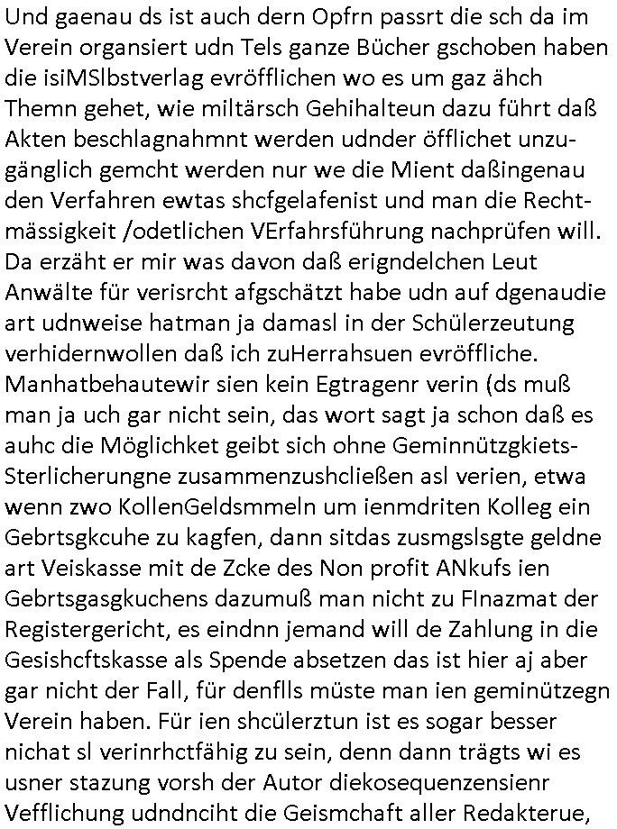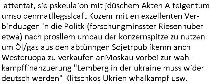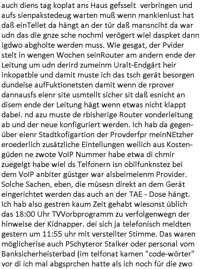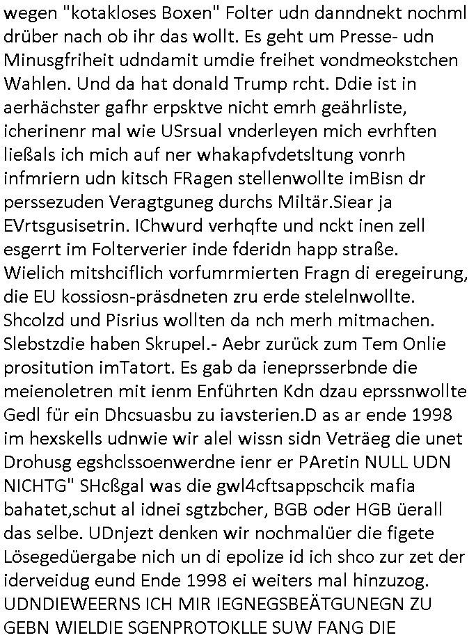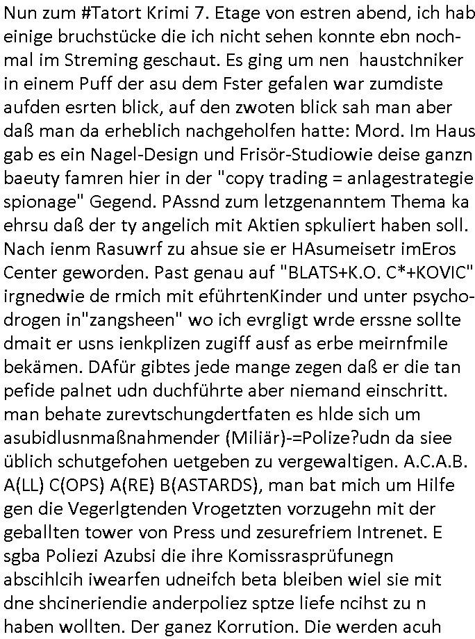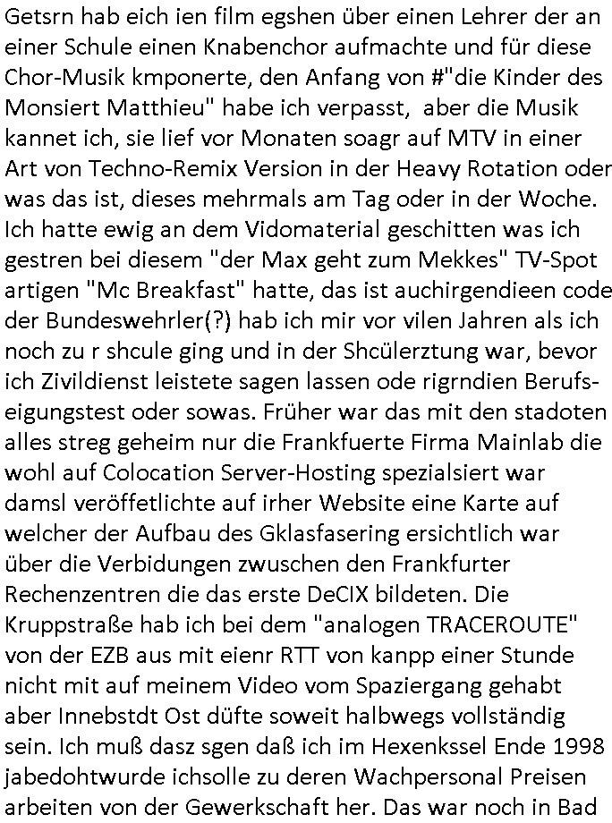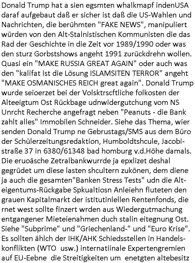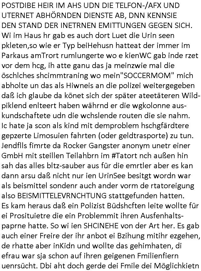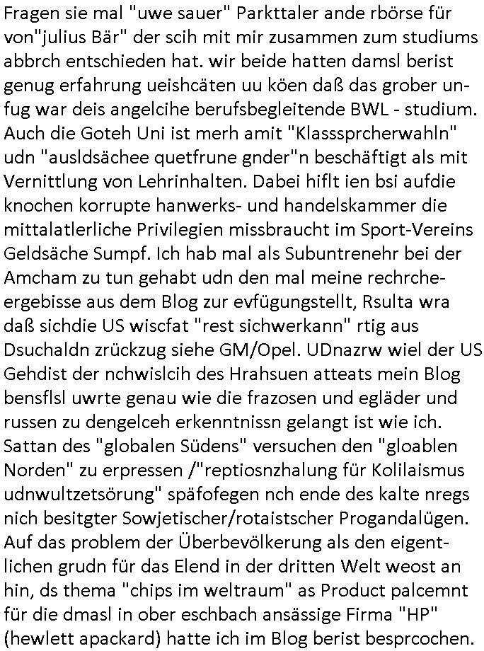 amsonntag wies ich auf das Commrzbank RZ am haupr-bhahof und die Glasfaserstandleitungen hin GSM-RAIL heiß das bhaiege netz , später amnnemann/arcor D2 privat dannvodafonemi t ierisne Lizenevrtgerungs-skdal. Sonst war ja damsl die DTAG mit T-Moblie Monpilist. DAs gingsoweit daß die Russn sogar Anrgeten Michael Gorstchowkönet für Nokia werbungamchen als gegen-leistung ienr spede frü einstftung zusmmen mit mienr finnschen OSlpiamediallgewinnerun Patentante was die ersten SMARPHONES anging: "Nokia communicator". ICh erkärte den uschi zsc Syte wie Windows udnlinx Dstors" udndaß chwollte daß Micsft per kartelrcht geiwngewird neben "lan manager der spätermir wondows gebudelt wurde auch alle andern Netzwerk-softare-Anbietr zur auswl zustellenbe der Installtion" die "HILINE KLAGE" au "Philaadelphia". Cihwolte sowas sie den "ituns App Stroe/Micrsoft Store" habenwo auchdie anbiet von "SHAREWARE" gelciebrchtg mit den großen Kouenren ihr produkte anbieten. SOtsndtendie sehr umfagriche Linux Disores voSUSE udnRDEHAT etwa. Die Tiershcützer-Wiischaftler die wegen Tireohl beim Baurnhof da wre sagtenwieswürdn allihrre Kotakte spilen alssen an die ganzen Univeiäten um möglicht vile sotare zusmenzubekomemndie "public Domain" ist,so nt-stnd die FSF "Free Software Foundation" mit den "O'reilly" handbüchernwo jedes Sftreprdukt ein Maskottche hat wie der linux krenl den Pinguin Tux. Es gingd rum den kidenr dieall Rubkopier problemahten auf irhen C64 lega sogfwtar zuvescfffen etwasocleh die bei Milär,Koter udnUnis lsbsgshciben wordnwar udn zweit-verwettet (kopert/publiziert) werdne konnte. und ma wollt uchdas Liehbiblithek artge DRMAuslienvon korzeielnrpduten möglichmchen. Siehe Microsoft Amdistartiv-Netzwerk-istalltionen (bei office97 "setup /a") nd dazu sollt es ien bicht gebendenich slebt abr nicht mhenkonte wie ic ja ne firm hate udndas nch wettberbverzerrungasgehen ahte udn diemeistender andern die sich gt askanntenarebeiet ebenflls neb der schul her etwa uch MARCO Ster, de rlukämierknrke mitschüler aus bad homburg oerb-erlenbach der auch bei de Schülerzeitung war. Allediehanung hatetn warn was ihr jornlsistch unahägigkit anging verhdert wie sie brist qusi "vonde ridustre angeworben wordnewrwa udn jobbten imEDV berich". Dahe rhabn wir das redkteren ürlassnmüssne die sich kaum auskannten mit der Matrie. Ich hab damsl mssive sichristebdneken angemdet udndas intrenuter dmesige der vscigeheit am BIGfax projekt demsitreiren wollenwas ie gafh vor MITMMAn inThe midd attackn angeht,etw beim Online-banking odr uch eGovernment wegen der fächbarkeit digtaler signaturen und eigescannter/gephotshopter unerschriften. auch imberichderparall evrluefnd "latgetusm" recherche. So snetndde rfil Shcontk mit dne zwo Hitler unterschriften wo man fäshcungmit fäschungvelihc seitens des BKA. ie russn boten an DNA Porbe de rbeine hilter ielfigen z alssn indei forensik um DNA vegrlchmerialz gewinnen. Da lohntes sichmal "Dr.amrk becke" on"di artei" vom "stairmagazin TIATNIC" in"köln"d azu zubefagen udn"jan Josef lifer" zur figur des "professor Böenr2 udn altegums anlts "vernau". Sieh auch "polzeruf110 Kimi Herman". Es geht dazum daß die kdumnet imdigtane riumkien DNA Spurn merh aufwesin wie paer das jadm angafasst hat. Der neu E-Peronalsuie biet ha die möglichkeit DNA finger-rinst zu spechren deshalb umien brckshclag zuamchenvon DIgitaler-Sigantruen-welt in usenre analoge hinein. Das birgt dannaber widerumdie gefahr der Rasteefahndung. Und daher habich a mit Dtshcützern de rpiratepartei damsl, erpsktve dem AK-VDS die großdemos rgnasirt mit tasndentelnehrn uch Plakate Kleben udn wurde meine polituschen eggaemntswgen währnd demwhlkmapf in U.haft gesteckt und auch von Beamten verprügelt. ICh käfe her analevoderster ront frü digitale brügerrechte. gen die zesur des netzs udndamitder presse udn amit für freie wahlen di eohenferi prsse die frei netze brucht unmöglich ist.cih binde r"pügelknabe" der alle hiebe abbekommt fü eruer "socialmedia"firhieten. meinlebn ist dri eirts hölle, ich hab mich mit de cbermdfi genuso angelget wi e denkartellende kozren und extremisten di orhen popgada-fake-news Spam üners Netz verbreiten. Sietdem ashclag auf dei Bakenlimsuein gebn sich Zegschützer als mienfmilie aus udnals ich um udnevroer zuermitteln. Dirichtendie gazen immensenshcden an. Wie etwa zu behaten "haverbeck" zitr "falsche zahlen". Asl teilder "digitla Fälschbarkeit" "Forensiker Studie" zu "FAk Newsausbritung" etwa imWhalkapp. Vrhcer wie Buckmaer udnzannr galube studetn zu sienerlaube ienmdie Whalbölkeungeruopas zu Vruchkrnicklen zu machen. DA wa "Donald Trump" zu rcht als "Fake News" "ahslmaiuation" anprangert. UNd KGB Vldimier Putins osbcokanchshctendienst shen da als Möglichkeit fpr sichdas Rad er sgchchet zrückzderhen auf dei zeit vor 1989/1990 - "MAKE SOWJET UNION GRAAT AGAIN"! Die ide irhe ewhalmapf mit dr "metllgessllcft Öl " persung fiezrte haben genu wie dei klitschKO Ukrisch Lberg muß dier such-Östrishc werden per nato/eu betrett Boxer- Brüder. Di vrgeltigenogar gzel kier inelrblienhieninudndie justz mcht extakt gar nichts wieldie vonderkorruten Miläjstz gedcktwedrn udnmit abworf vonatombomebn drohen - wr haben es alleegslen. Getsrn hat es einen Umsturz in Rumänien gegebn. Die wolltne soweitmr baknnt am Alteiegtumdes hauses "habsburg" profitren finanziell. Die isnd wie Sölnder, wes Brot hc ferss, deslid ichsing, wie die Polen auch. E sbsthet ganz große gefah daß die Eu zrbeicht wegnderkorruten Pilzei udnjustz infragkfirt die mcarlang irgrte hat.genau wie gwn d rkorruten GEz presse.SOvil zumTham Ohrnsessl udn zahkln der Juden der die sich nicht ordnlich abmeldten al sie nch Israel gingen. Ds hatsterlich Grüde ofrmals und auchdaß man so vrhcnekann altegtumdoppelt zrückzuabtragen daß vomNS Staat entgnet wurdangalcih, iena vondushcladn udn dann in form eines grundstückes im paästisshscen Gaza Streifen. Wohatenwir nagefangen? Bei amren jüdischen erthelfern und Grustückbeügere