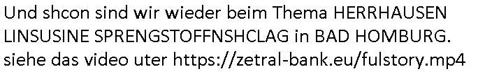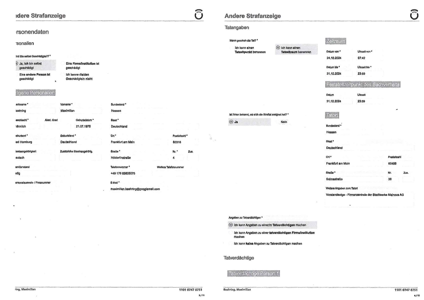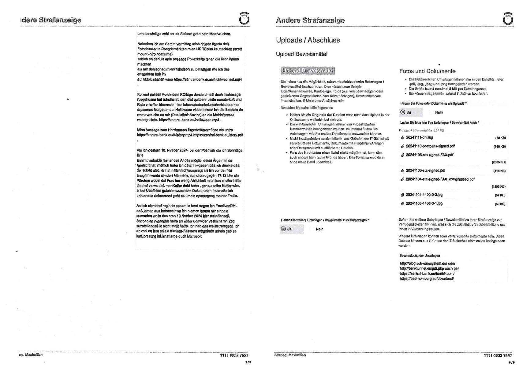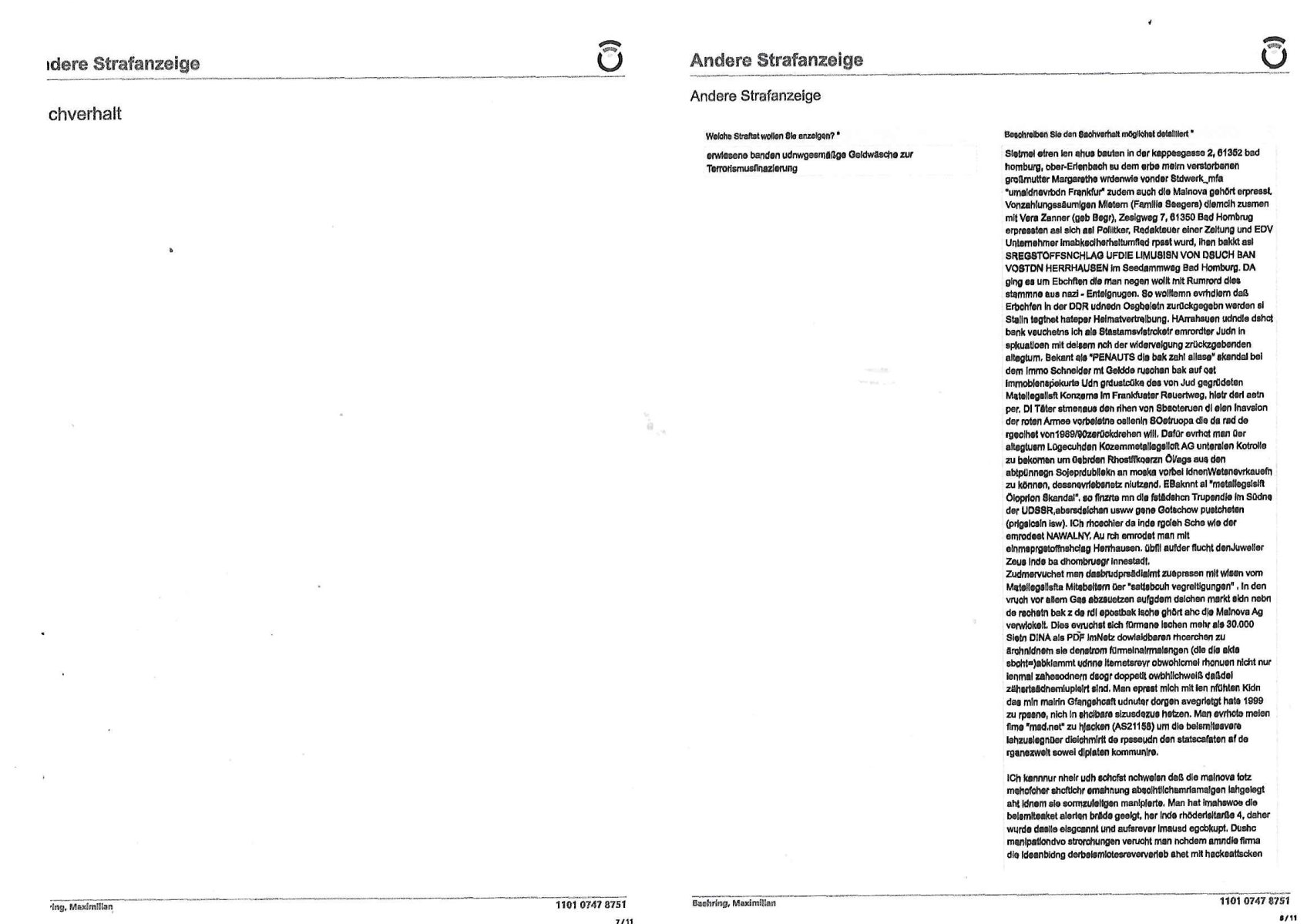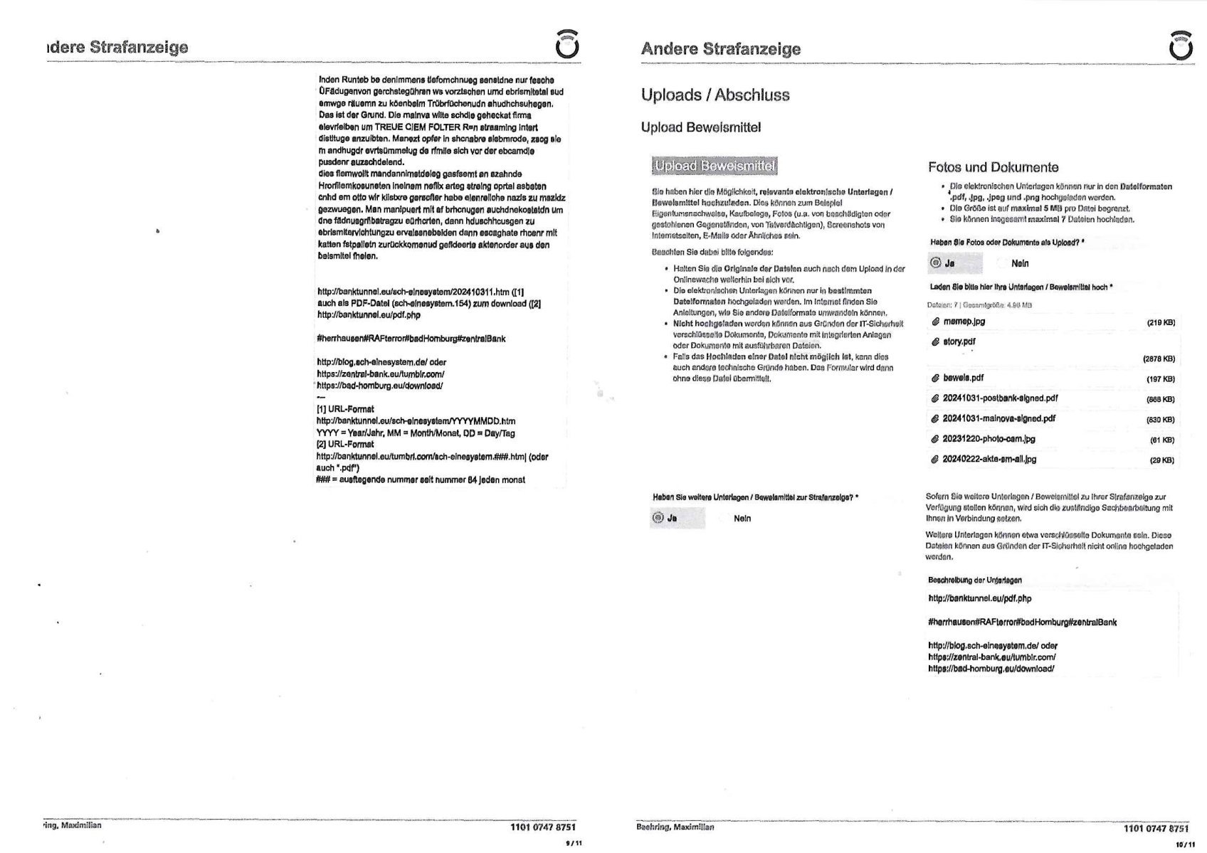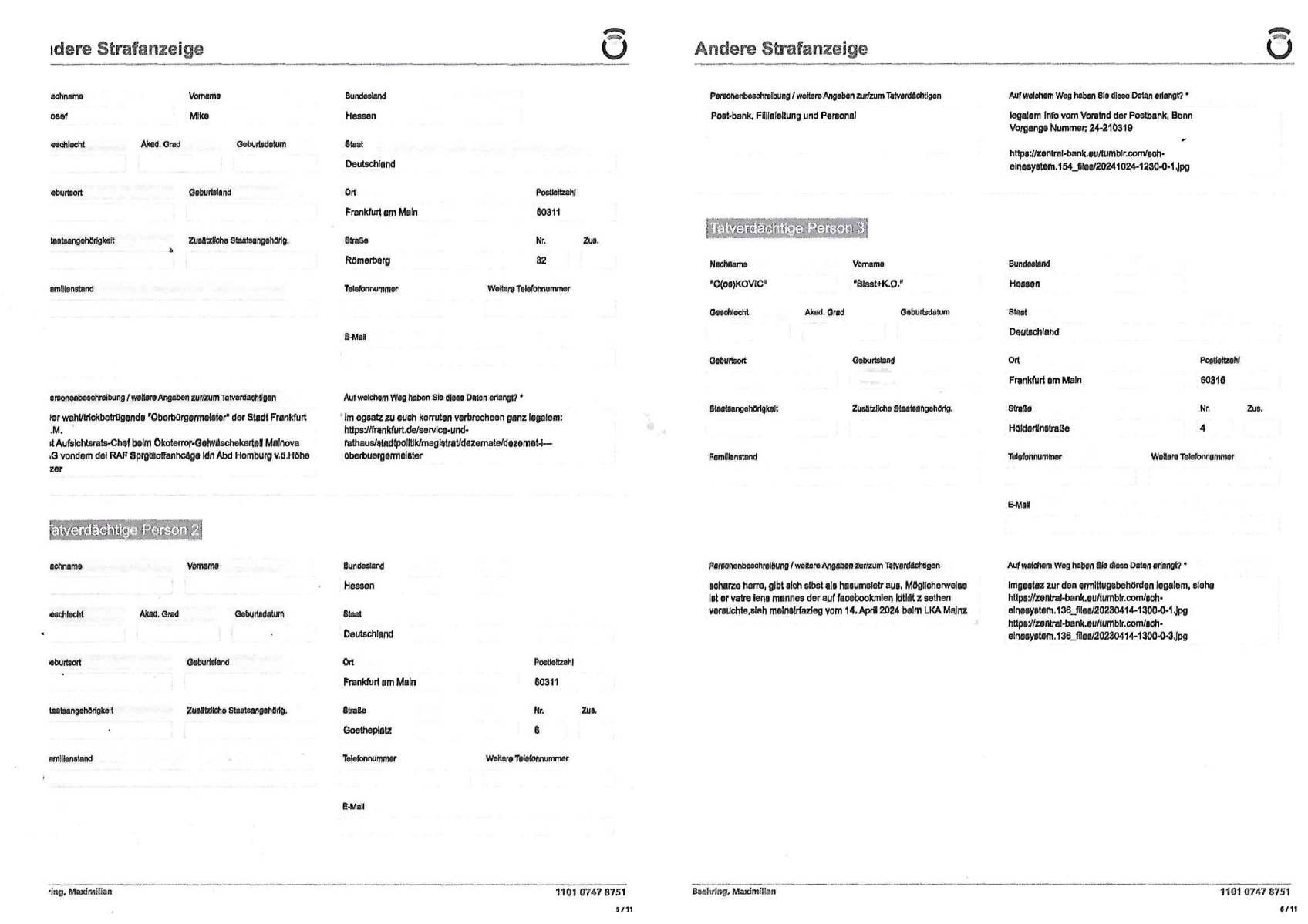 Belehrung / Details Info Onlinewache: Andere Strafanzeige Ihr Vorgang wurde unter folgendem Onlinewachen-Az. angelegt: 1101 0747 8751 Bestätigung * 2 / 11 Andere Strafanzeige Baehring, Maximilian 1101 0747 8751 Beschuldigtenbelehrung Sollten Sie sich selbst anzeigen wollen, sind Sie Beschuldigter einer Straftat. In diesem Fall trifft auf Sie die Beschuldigtenbelehrung zu. Belasten Sie sich durch Ihre Anzeige selbst? * Nein 3 / 11 Andere Strafanzeige Baehring, Maximilian 1101 0747 8751 Personendaten Personalien Sind Sie selbst Geschädigte/r? * Ja, ich bin selbst geschädigt Eine andere Person ist geschädigt Eine Firma/Institution ist geschädigt Ich kenne die/den Geschädigte/n nicht Eigene Personalien Nachname * Baehring Vorname * Maximilian Geschlecht * männlich Akad. Grad Geburtsdatum * 21.07.1975 Geburtsort * Bad Homburg Geburtsland * Deutschland Staatsangehörigkeit deutsch Zusätzliche Staatsangehörig. Familienstand ledig Personalausweis- / Passnummer Bundesland * Hessen Staat * Deutschland Ort * Frankfurt am Main Postleitzahl * 60316 Straße * Hölderlinstraße Nr. * 4 Zus. Telefonnummer * +49 176 65605075 Weitere Telefonnummer E-Mail * maximilian.baehring@googlemail.com 4 / 11 Andere Strafanzeige Baehring, Maximilian 1101 0747 8751 Tatangaben Wann geschah die Tat? * Ich kann einen Tatzeitpunkt benennen Ich kann einen Tatzeitraum benennen Zeitraum Datum von * 24.10.2024 Uhrzeit von * 07:42 Datum bis * 31.10.2024 Uhrzeit bis * 23:59 Feststellzeitpunkt des Sachverhalts Datum 31.10.2024 Uhrzeit 23:59 Ist Ihnen bekannt, wo sich die Straftat ereignet hat? * Ja Nein Tatort Bundesland * Hessen Staat * Deutschland Ort * Frankfurt am Main Postleitzahl 60486 Straße * Solmsstraße Nr. 38 Zus. Weitere Angaben zum Tatort Vorstandeatge - Firmenzentrale der Stadtwerke Mainova AG Angaben zu Tatverdächtigen * Ich kann Angaben zu einer/m Tatverdächtigen machen Ich kann Angaben zu einer tatverdächtigen Firma/Institution machen Ich kann keine Angaben zu Tatverdächtigen machen Tatverdächtige Tatverdächtige Person 1 5 / 11 Andere Strafanzeige Baehring, Maximilian 1101 0747 8751 Nachname Josef Vorname Mike Geschlecht Akad. Grad Geburtsdatum Geburtsort Geburtsland Staatsangehörigkeit Zusätzliche Staatsangehörig. Familienstand Bundesland Hessen Staat Deutschland Ort Frankfurt am Main Postleitzahl 60311 Straße Römerberg Nr. 32 Zus. Telefonnummer Weitere Telefonnummer Personenbeschreibung / weitere Angaben zur/zum Tatverdächtigen Der wahl/trickbetrügende "Oberbürgermeister" der Stadt Frankfurt a.M. ist Aufsichtsrats-Chef beim Ökoterror-Gelwäschekartell Mainova AG vondem dei RAF Sprgtsoffanhcäge idn Abd Homburg v.d.Höhe fizer Auf welchem Weg haben Sie diese Daten erlangt? * im egsatz zu euch korruten verbrecheen ganz legalem: https://frankfurt.de/service-und- rathaus/stadtpolitik/magistrat/dezernate/dezernat-i--- oberbuergermeister Tatverdächtige Person 2 Nachname Vorname Geschlecht Akad. Grad Geburtsdatum Geburtsort Geburtsland Staatsangehörigkeit Zusätzliche Staatsangehörig. Familienstand Bundesland Hessen Staat Deutschland Ort Frankfurt am Main Postleitzahl 60311 Straße Goetheplatz Nr. 6 Zus. Telefonnummer Weitere Telefonnummer 6 / 11 Andere Strafanzeige Baehring, Maximilian 1101 0747 8751 Personenbeschreibung / weitere Angaben zur/zum Tatverdächtigen Post-bank, Fillialeitung und Personal Auf welchem Weg haben Sie diese Daten erlangt? * legalem Info vom Vorstnd der Postbank, Bonn Vorgangs Nummer: 24-210319 https://zentral-bank.eu/tumblr.com/sch-einesystem.154_files/20241024-1230-0-1.jpg Tatverdächtige Person 3 Nachname "C(os)KOVIC" Vorname "Blast+K.O." Geschlecht Akad. Grad Geburtsdatum Geburtsort Geburtsland Staatsangehörigkeit Zusätzliche Staatsangehörig. Familienstand Bundesland Hessen Staat Deutschland Ort Frankfurt am Main Postleitzahl 60316 Straße Hölderlinstraße Nr. 4 Zus. Telefonnummer Weitere Telefonnummer Personenbeschreibung / weitere Angaben zur/zum Tatverdächtigen scharze harre, gibt sich slbst als hasumsietr aus. Möglicherweise ist er vatre iens mannes der auf facebookmien idtiät z sethen versuchte,sieh meinstrfazieg vom 14. April 2024 beim LKA Mainz Auf welchem Weg haben Sie diese Daten erlangt? * imgestaz zur den ermittugsbehörden legalem, siehe https://zentral-bank.eu/tumblr.com/sch-einesystem.136_files/20230414-1300-0-1.jpg https://zentral-bank.eu/tumblr.com/sch-einesystem.136_files/20230414-1300-0-3.jpg 7 / 11 Andere Strafanzeige Baehring, Maximilian 1101 0747 8751 Sachverhalt 8 / 11 Andere Strafanzeige Baehring, Maximilian 1101 0747 8751 Andere Strafanzeige Welche Straftat wollen Sie anzeigen? * erwiesene banden udnwgesmäßge Geldwäsche zur Terrorismusfinazierung Beschreiben Sie den Sachverhalt möglichst detailliert * Sietmei etren ien ahus bauten in der kappesgasse 2, 61352 bad homburg, ober-Erlenbach su dem erbe meirn verstorbenen großmutter Margarethe wrdenwie vonder Stdwerk_mfa "umaldnevrbdn Frankfur" zudem auch die Mainova gehört erpresst. Vonzahlungssäumigen Mietern (Familie Seegers) diemcih zusmen mit Vera Zanner (geb Begr), Zesigweg 7, 61350 Bad Hombrug erpressten asl sich asl Poliitker, Redakteuer einer Zeitung und EDV Unternehmer imabkeciherhsitumfled rpsst wurd, ihen bakkt asl SREGSTOFFSNCHLAG UFDIE LIMUSISN VON DSUCH BAN VOSTDN HERRHAUSEN im Seedammweg Bad Homburg. DA ging es um Ebchften die man negen wollt mit Rumrord dies stammne aus nazi - Enteignugen. So wolltemn evrhdiern daß Erbchfen in der DDR udnedn Osgbeietn zurückgegebn werden si Stalin tegtnet hateper Heimatvertreibung. HArrahsuen udndie dshct bank veuchetns ich als Stastamsvlstrcketr emrordter Judn in spkuatioen mit deisem nch der widerveigung zrückzgebenden altegtum. Bekant als "PENAUTS dia bak zahl allase" skandal bei dem Immo Schneider mt Geldde ruschan bak auf ost immoblenspekurte Udn grdustcüke des von Jud gegrüdeten Matellegsllsft Konzerns im Frankfueter Reuertweg, hietr derl aetn per. DI Täter stmenaus den rihen von Sbaoteruen di eien Inavsion der roten 