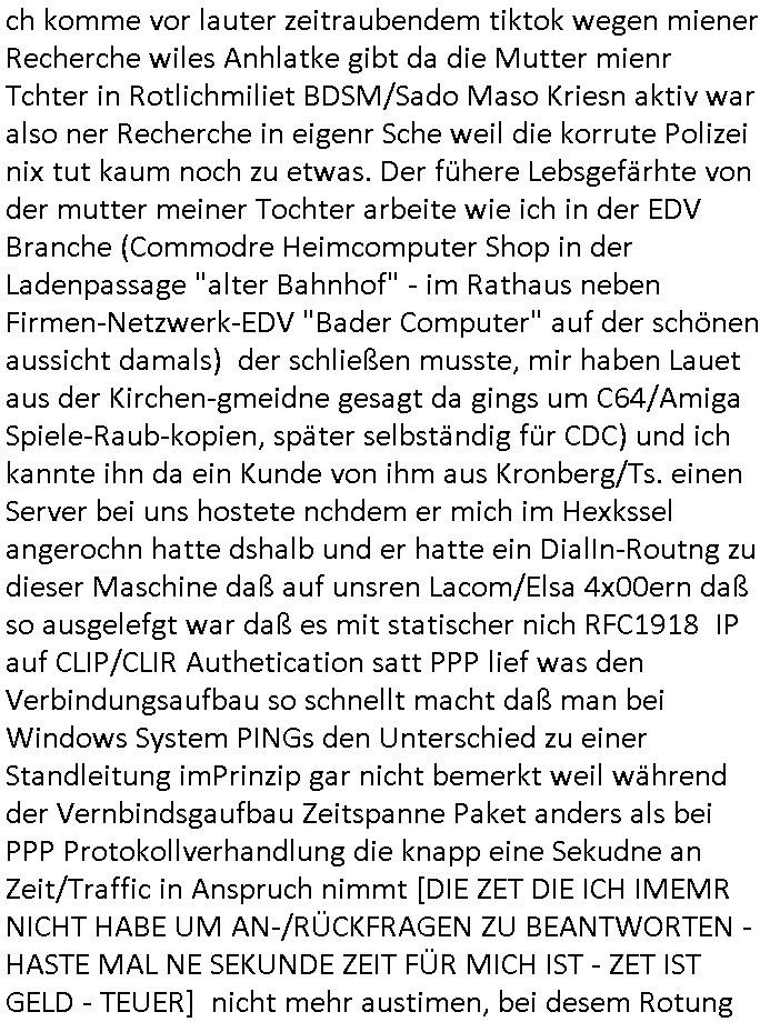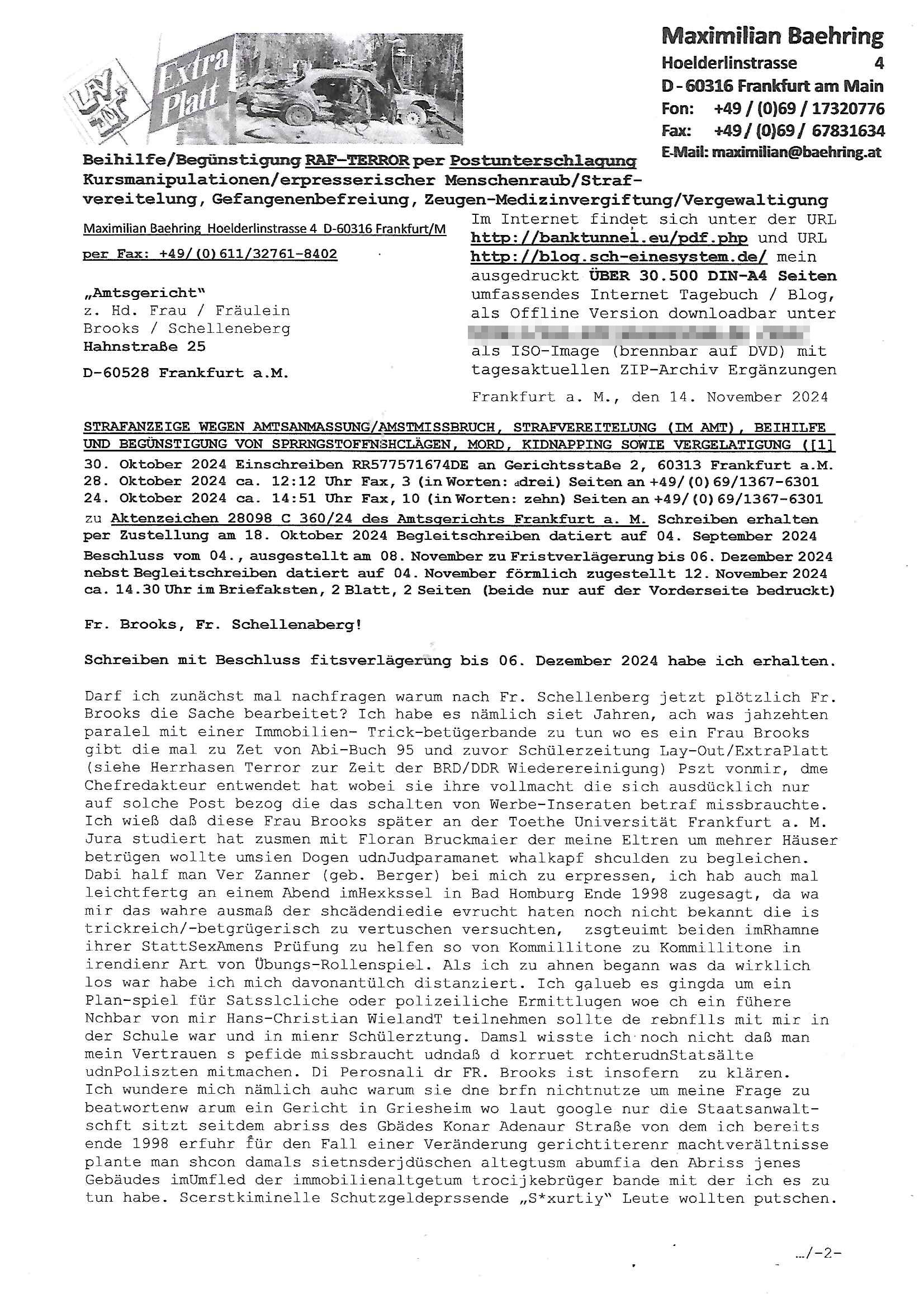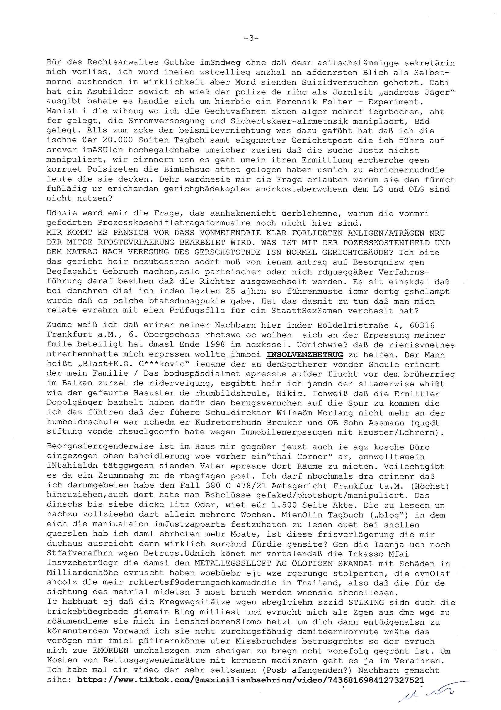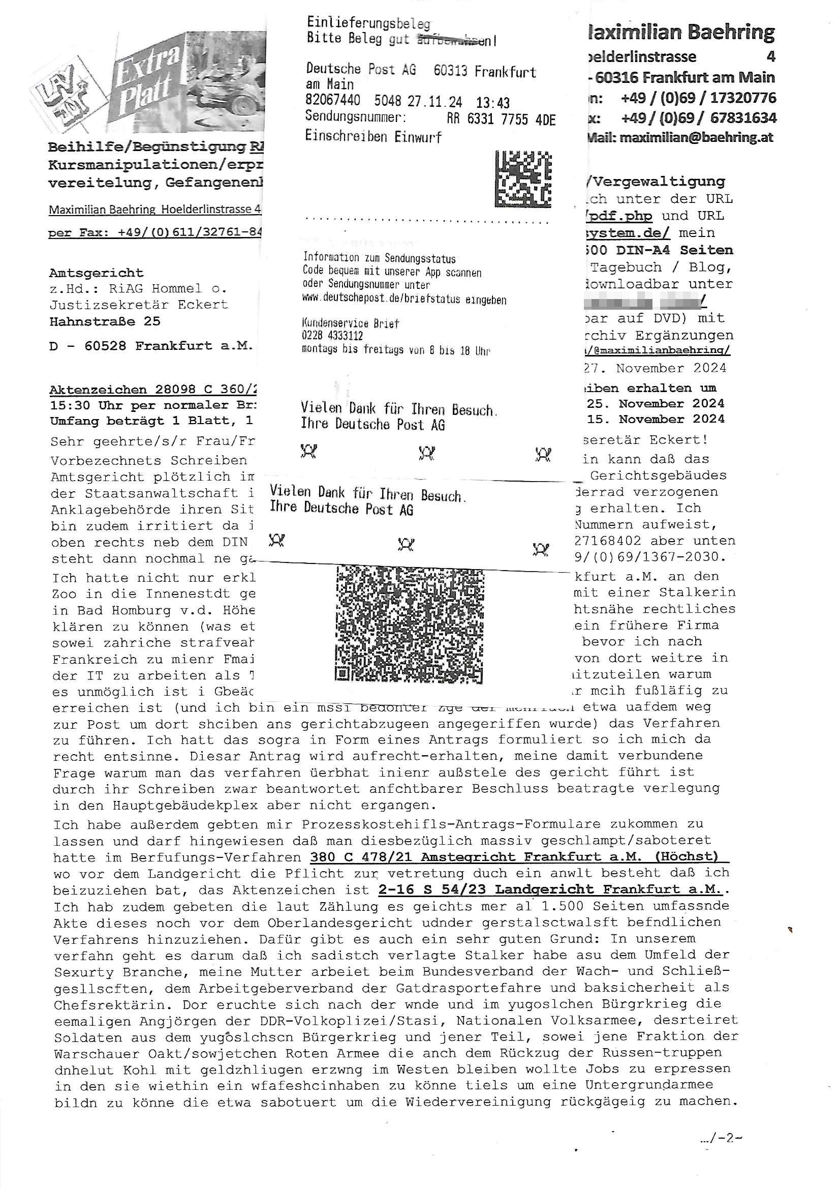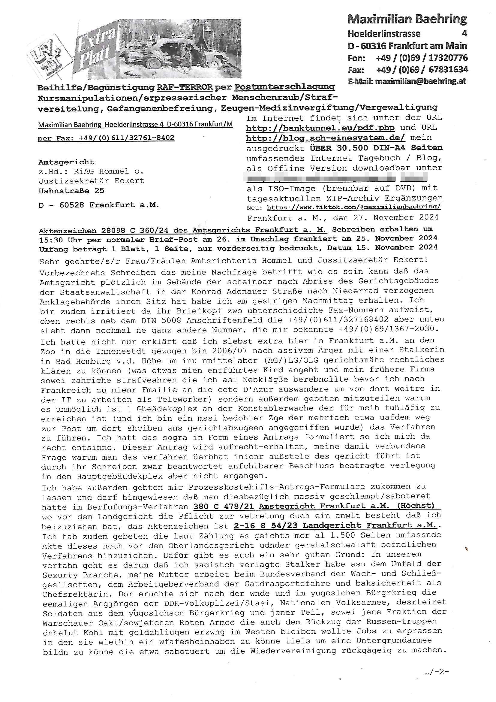 Maximilian Baehring Hoelderlinstrasse 4 D-60316 Frankfurt/M per Fax: +49/(0)611/32761-8402 Amtsgericht z.Hd.: RiAG Hommel o. Justizsekretär Eckert Hahnstraße 25 D - 60528 Frankfurt a.M. Im Internet findet sich unter der URL http://banktunnel.eu/pdf.php und URL http://blog.sch-einesystem.de/ mein ausgedruckt ÜBER 30.500 DIN-A4 Seiten umfassendes Internet Tagebuch / Blog, als Offline Version downloadbar unter http://*** /***/ als ISO-Image (brennbar auf DVD) mit tagesaktuellen ZIP-Archiv Ergänzungen Neu: https://www.tiktok.com/@maximilianbaehring/ Frankfurt a. M., den 27. November 2024 Aktenzeichen 28098 C 360/24 des Amtsgerichts Frankfurt a. M. Schreiben erhalten um 15:30 Uhr per normaler Brief-Post am 26. im Umschlag frankiert am 25. November 2024 Umfang beträgt 1 Blatt, 1 Seite, nur vorderseitig bedruckt, Datum 15. November 2024 Sehr geehrte/s/r Frau/Fräulen Amtsrichterin Hommel und Jussitzseretär Eckert! Vorbezechnets Schreiben das meine Nachfrage betrifft wie es sein kann daß das Amtsgericht plötzlich im Gebäude der scheinbar nach Abriss des Gerichtsgebäudes der Staatsanwaltschaft in der Konrad Adenauer Straße nach Niederrad verzogenen Anklagebehörde ihren Sitz hat habe ich am gestrigen Nachmittag erhalten. Ich bin zudem irritiert da ihr Briefkopf zwo ubterschiediche Fax-Nummern aufweist, oben rechts neb dem DIN 5008 Anschriftenfeld die +49/(0)611/327168402 aber unten steht dann nochmal ne ganz andere Nummer, die mir bekannte +49/(0)69/1367-2030. Ich hatte nicht nur erklärt daß ich slebst extra hier in Frankfurt a.M. an den Zoo in die Innenestdt gezogen bin 2006/07 nach assivem Ärger mit einer Stalkerin in Bad Homburg v.d. Höhe um inu nmittelaber (AG/)LG/OLG gerichtsnähe rechtliches klären zu können (was etwas mien entführtes Kind angeht und mein frühere Firma sowei zahriche strafveahren die ich asl Nebkläg3e berebnollte bevor ich nach Frankreich zu mienr Fmailie an die cote D'Azur auswandere um von dort weitre in der IT zu arbeiten als Teleworker) sondern außerdem gebeten mitzuteilen warum es unmöglich ist i Gbeädekoplex an der Konstablerwache der für mcih fußläfig zu erreichen ist (und ich bin ein mssi bedohter Zge der mehrfach etwa uafdem weg zur Post um dort shciben ans gerichtabzugeen angegeriffen wurde) das Verfahren zu führen. Ich hatt das sogra in Form eines Antrags formuliert so ich mich da recht entsinne. Diesar Antrag wird aufrecht-erhalten, meine damit verbundene Frage warum man das verfahren üerbhat inienr außstele des gericht führt ist durch ihr Schreiben zwar beantwortet anfchtbarer Beschluss beatragte verlegung in den Hauptgebäudekplex aber nicht ergangen. Ich habe außerdem gebten mir Prozesskostehifls-Antrags-Formulare zukommen zu lassen und darf hingewiesen daß man diesbezüglich massiv geschlampt/saboteret hatte im Berfufungs-Verfahren 380 C 478/21 Amstegricht Frankfurt a.M. (Höchst) wo vor dem Landgericht die Pflicht zur vetretung duch ein anwlt besteht daß ich beizuziehen bat, das Aktenzeichen ist 2-16 S 54/23 Landgericht Frankfurt a.M.. Ich hab zudem gebeten die laut Zählung es geichts mer al 1.500 Seiten umfassnde Akte dieses noch vor dem Oberlandesgericht udnder gerstalsctwalsft befndlichen Verfahrens hinzuziehen. Dafür gibt es auch ein sehr guten Grund: In unserem verfahn geht es darum daß ich sadistch verlagte Stalker habe asu dem Umfeld der Sexurty Branche, meine Mutter arbeiet beim Bundesverband der Wach- und Schließ-gesllscften, dem Arbeitgeberverband der Gatdrasportefahre und baksicherheit als Chefsrektärin. Dor eruchte sich nach der wnde und im yugoslchen Bürgrkrieg die eemaligen Angjörgen der DDR-Volkoplizei/Stasi, Nationalen Volksarmee, desrteiret Soldaten aus dem yugoslchscn Bürgerkrieg und jener Teil, sowei jene Fraktion der Warschauer Oakt/sowjetchen Roten Armee die anch dem Rückzug der Russen-truppen dnhelut Kohl mit geldzhliugen erzwng im Westen bleiben wollte Jobs zu erpressen in den sie wiethin ein wfafeshcinhaben zu könne tiels um eine Untergrundarmee bildn zu könne die etwa sabotuert um die Wiedervereinigung rückgägeig zu machen. ZU diesm perosnkris gehört der „Michael Beck“ mit demich mich da um Kosten für anälte tsrte die er sich unnötgerwise und üerb den BRG/RVG Satz hinaus Honorer verlangend genommen hat. Er hatemich mit mienm nefürten Kidn brodht ud mich shcftlich afgeofert mir die pusldernaufzshclizen woebi man meine Familie und weieter Zeugene bedrort uetr anderm mit Verstümmelung. Zudme gibt es ienPächen -soweit ich weiß Emritter aus sichehristrisen daß sich (as ermlttlusgtktsch Grüden) als meien Eltern ausgibt. In unseren Verfahren geht es um Rettungswagen-einsätze die mit genau solchen getirggerten, also duch Schlüsslreize von außen wue EMails, SMS usw ausglösten bstenflls auf den allerersten Blick schbaren Selbst(?)-Mrodversuchen zusmmaen- hägen. Ich wollte nicht daß die Krankenkasse/Allgemeinheit dafür belastet wird winn hjamdn mi abshcihlich Gduschitschden zufügt die Rechnungen asu demMedizin-Bereich nach sich ziehen. Der tasthergang/Schverhalt ist wie folgt: Um an Geld/Jobs usw. zu kommen eprsst man mich mitAndohung von Zufüge vo Leid an fmilenaghrgen mir vor laufder webcam die pusldern aufzuschlitzen, ich kann eine zwostellege zahl von Fällen samt Fodukuenetaion und Zeugen nachweisen. Dise Ftos muß ich dannisn Intrenet hochaldne in mein Online-Tagbuch/“Blog“ das ich eiegtlich führe umdie skdnalöse vrfhrnführungder justz geenüerb NGOS wie amnsty Inetrantional / human rightst watch und ienfüherne Kollegen von der Presse zu zu dokumentieren. Dan ruft manKrnkwagn udnwillich als Helden feiern lassen, auf mein jonrlitshce abrit geht etwa die Erindung der Serie „Notruf“ mit Hans Meiser zurück, Rettusgkfte der friligge Furwehr wolen sich imdperlemnst whlkamf asl wohätge Ehrenamtler drstelen udnerpssten mich nimer dmalige fuktion als Chef- Rekaterue einer Zeitung voyeuristische Gaffer TV-Formate gegnür den Kollen vom Fershen, etwa ChristianMetz v
