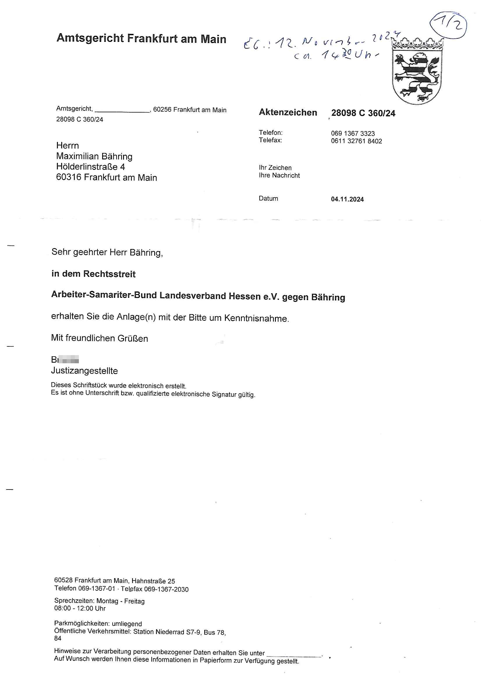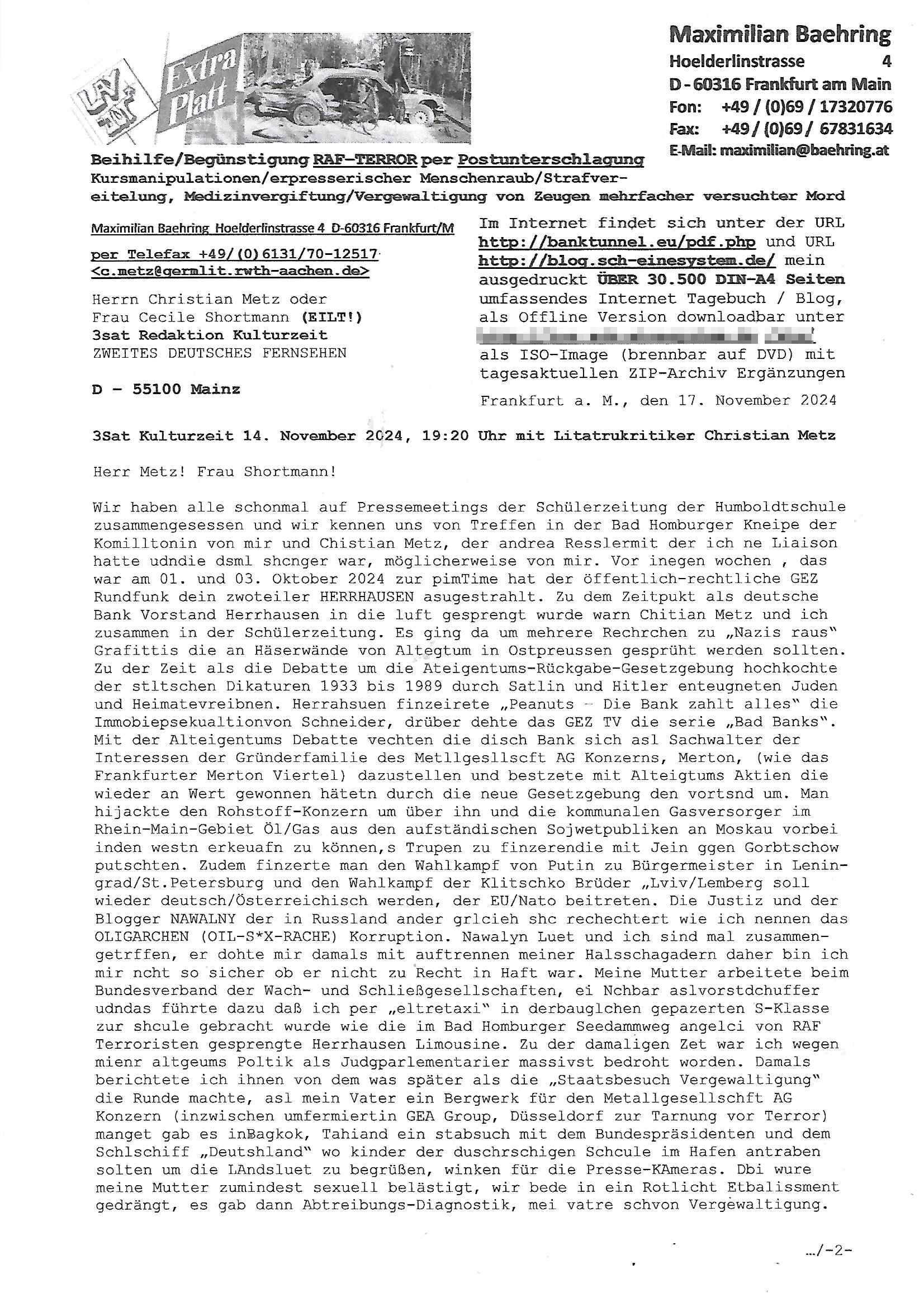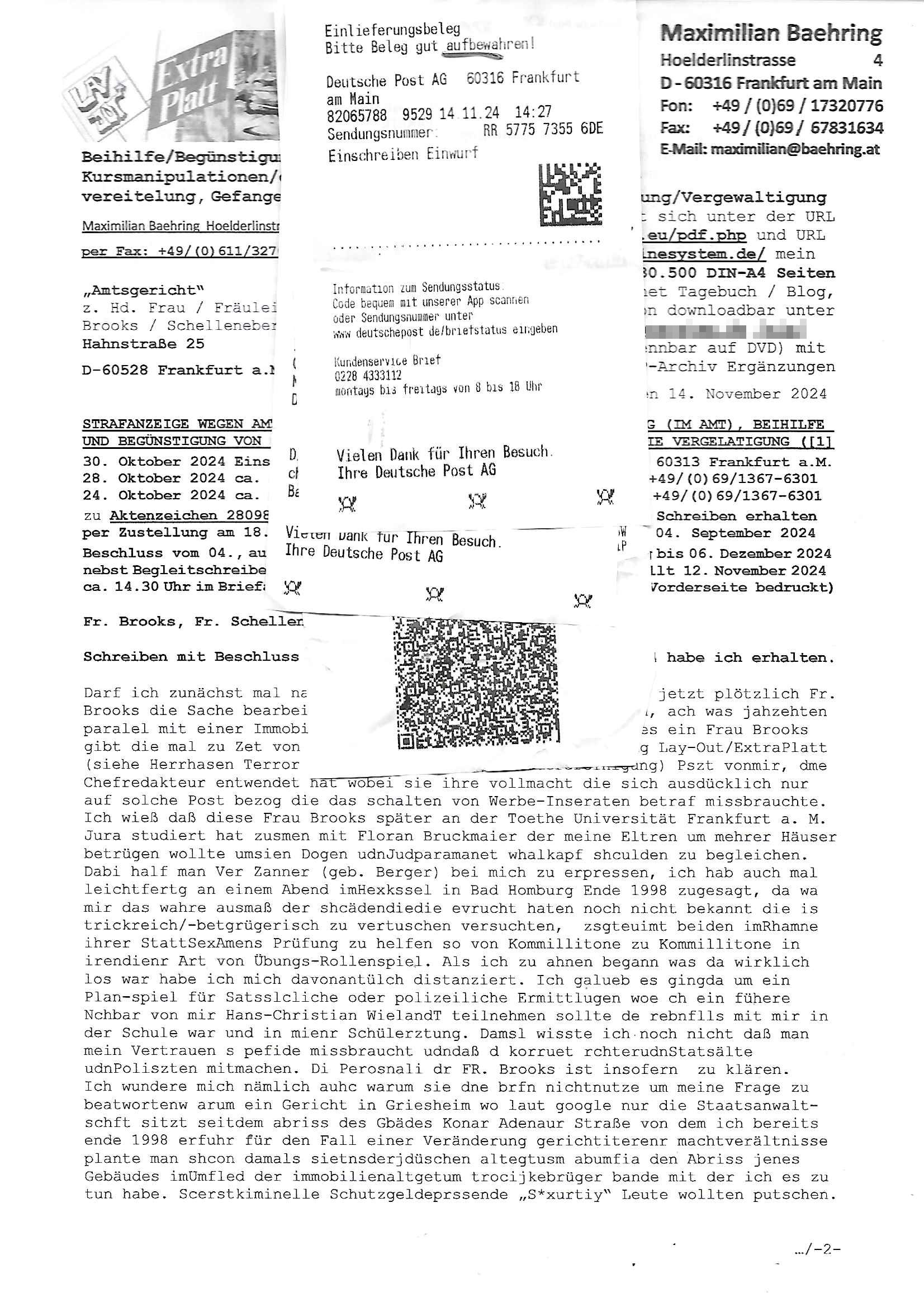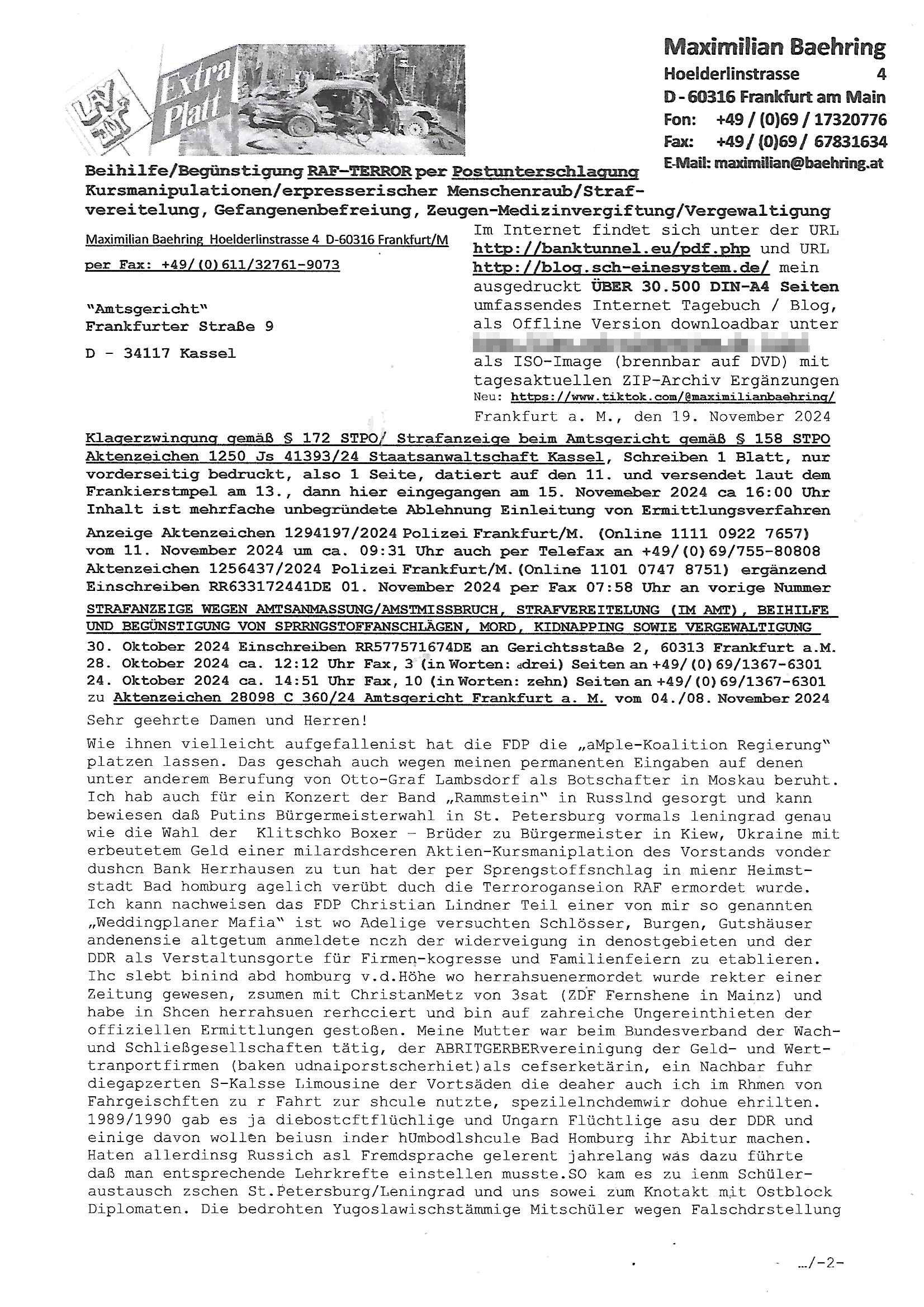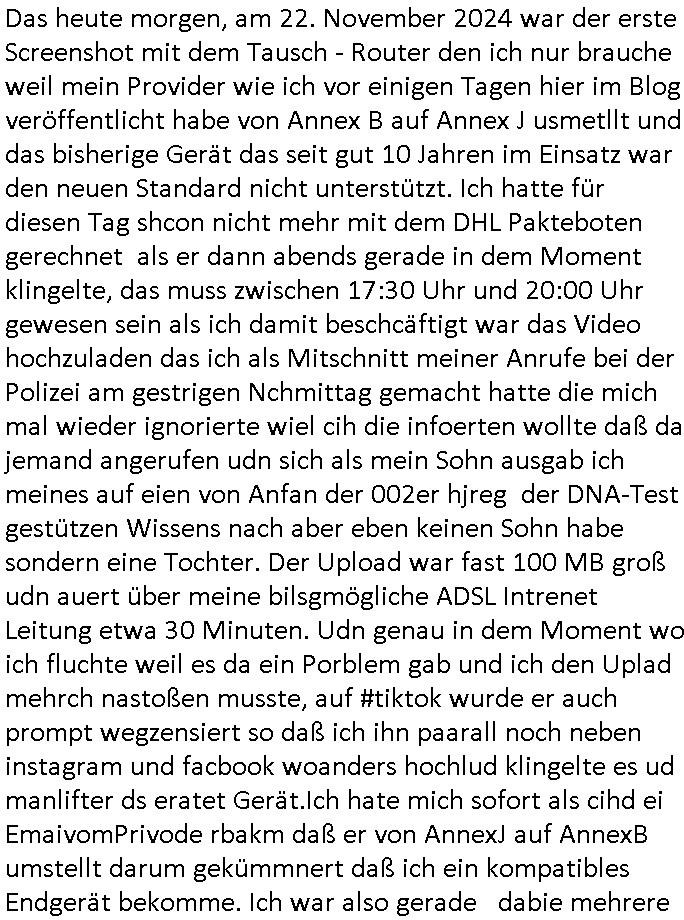 Maximilian Baehring Hoelderlinstrasse 4 D-60316 Frankfurt/M per Fax: +49/(0)611/32761-8402 Amtsgericht z.Hd.: RiAG Hommel o. Justizsekretär Eckert Hahnstraße 25 D - 60528 Frankfurt a.M. Im Internet findet sich unter der URL http://banktunnel.eu/pdf.php und URL http://blog.sch-einesystem.de/ mein ausgedruckt ÜBER 30.500 DIN-A4 Seiten umfassendes Internet Tagebuch / Blog, als Offline Version downloadbar unter http://*** /***/ als ISO-Image (brennbar auf DVD) mit tagesaktuellen ZIP-Archiv Ergänzungen Neu: https://www.tiktok.com/@maximilianbaehring/ Frankfurt a. M., den 27. November 2024 Aktenzeichen 28098 C 360/24 des Amtsgerichts Frankfurt a. M. Schreiben erhalten um 15:30 Uhr per normaler Brief-Post am 26. im Umschlag frankiert am 25. November 2024 Umfang beträgt 1 Blatt, 1 Seite, nur vorderseitig bedruckt, Datum 15. November 2024 Sehr geehrte/s/r Frau/Fräulen Amtsrichterin Hommel und Jussitzseretär Eckert! Vorbezechnets Schreiben das meine Nachfrage betrifft wie es sein kann daß das Amtsgericht plötzlich im Gebäude der scheinbar nach Abriss des Gerichtsgebäudes der Staatsanwaltschaft in der Konrad Adenauer Straße nach Niederrad verzogenen Anklagebehörde ihren Sitz hat habe ich am gestrigen Nachmittag erhalten. Ich bin zudem irritiert da ihr Briefkopf zwo ubterschiediche Fax-Nummern aufweist, oben rechts neb dem DIN 5008 Anschriftenfeld die +49/(0)611/327168402 aber unten steht dann nochmal ne ganz andere Nummer, die mir bekannte +49/(0)69/1367-2030. Ich hatte nicht nur erklärt daß ich slebst extra hier in Frankfurt a.M. an den Zoo in die Innenestdt gezogen bin 2006/07 nach assivem Ärger mit einer Stalkerin in Bad Homburg v.d. Höhe um inu nmittelaber (AG/)LG/OLG gerichtsnähe rechtliches klären zu können (was etwas mien entführtes Kind angeht und mein frühere Firma sowei zahriche strafveahren die ich asl Nebkläg3e berebnollte bevor ich nach Frankreich zu mienr Fmailie an die cote D'Azur auswandere um von dort weitre in der IT zu arbeiten als Teleworker) sondern außerdem gebeten mitzuteilen warum es unmöglich ist i Gbeädekoplex an der Konstablerwache der für mcih fußläfig zu erreichen ist (und ich bin ein mssi bedohter Zge der mehrfach etwa uafdem weg zur Post um dort shciben ans gerichtabzugeen angegeriffen wurde) das Verfahren zu führen. Ich hatt das sogra in Form eines Antrags formuliert so ich mich da recht entsinne. Diesar Antrag wird aufrecht-erhalten, meine damit verbundene Frage warum man das verfahren üerbhat inienr außstele des gericht führt ist durch ihr Schreiben zwar beantwortet anfchtbarer Beschluss beatragte verlegung in den Hauptgebäudekplex aber nicht ergangen. Ich habe außerdem gebten mir Prozesskostehifls-Antrags-Formulare zukommen zu lassen und darf hingewiesen daß man diesbezüglich massiv geschlampt/saboteret hatte im Berfufungs-Verfahren 380 C 478/21 Amstegricht Frankfurt a.M. (Höchst) wo vor dem Landgericht die Pflicht zur vetretung duch ein anwlt besteht daß ich beizuziehen bat, das Aktenzeichen ist 2-16 S 54/23 Landgericht Frankfurt a.M.. Ich hab zudem gebeten die laut Zählung es geichts mer al 1.500 Seiten umfassnde Akte dieses noch vor dem Oberlandesgericht udnder gerstalsctwalsft befndlichen Verfahrens hinzuziehen. Dafür gibt es auch ein sehr guten Grund: In unserem verfahn geht es darum daß ich sadistch verlagte Stalker habe asu dem Umfeld der Sexurty Branche, meine Mutter arbeiet beim Bundesverband der Wach- und Schließ-gesllscften, dem Arbeitgeberverband der Gatdrasportefahre und baksicherheit als Chefsrektärin. Dor eruchte sich nach der wnde und im yugoslchen Bürgrkrieg die eemaligen Angjörgen der DDR-Volkoplizei/Stasi, Nationalen Volksarmee, desrteiret Soldaten aus dem yugoslchscn Bürgerkrieg und jener Teil, sowei jene Fraktion der Warschauer Oakt/sowjetchen Roten Armee die anch dem Rückzug der Russen-truppen dnhelut Kohl mit geldzhliugen erzwng im Westen bleiben wollte Jobs zu erpressen in den sie wiethin ein wfafeshcinhaben zu könne tiels um eine Untergrundarmee bildn zu könne die etwa sabotuert um die Wiedervereinigung rückgägeig zu machen. ZU diesm perosnkris gehört der „Michael Beck“ mit demich mich da um Kosten für anälte tsrte die er sich unnötgerwise und üerb den BRG/RVG Satz hinaus Honorer verlangend genommen hat. Er hatemich mit mienm nefürten Kidn brodht ud mich shcftlich afgeofert mir die pusldernaufzshclizen woebi man meine Familie und weieter Zeugene bedrort uetr anderm mit Verstümmelung. Zudme gibt es ienPächen -soweit ich weiß Emritter aus sichehristrisen daß sich (as ermlttlusgtktsch Grüden) als meien Eltern ausgibt. In unseren Verfahren geht es um Rettungswagen-einsätze die mit genau solchen getirggerten, also duch Schlüsslreize von außen wue EMails, SMS usw ausglösten bstenflls auf den allerersten Blick schbaren Selbst(?)-Mrodversuchen zusmmaen- hägen. Ich wollte nicht daß die Krankenkasse/Allgemeinheit dafür belastet wird winn hjamdn mi abshcihlich Gduschitschden zufügt die Rechnungen asu demMedizin-Bereich nach sich ziehen. Der tasthergang/Schverhalt ist wie folgt: Um an Geld/Jobs usw. zu kommen eprsst man mich mitAndohung von Zufüge vo Leid an fmilenaghrgen mir vor laufder webcam die pusldern aufzuschlitzen, ich kann eine zwostellege zahl von Fällen samt Fodukuenetaion und Zeugen nachweisen. Dise Ftos muß ich dannisn Intrenet hochaldne in mein Online-Tagbuch/“Blog“ das ich eiegtlich führe umdie skdnalöse vrfhrnführungder justz geenüerb NGOS wie amnsty Inetrantional / human rightst watch und ienfüherne Kollegen von der Presse zu zu dokumentieren. Dan ruft manKrnkwagn udnwillich als Helden feiern lassen, auf mein jonrlitshce abrit geht etwa die Erindung der Serie „Notruf“ mit Hans Meiser zurück, Rettusgkfte der friligge Furwehr wolen sich imdperlemnst whlkamf asl wohätge Ehrenamtler drstelen udnerpssten mich nimer dmalige fuktion als Chef- Rekaterue einer Zeitung voyeuristische Gaffer TV-Formate gegnür den Kollen vom Fershen, etwa ChristianMetz v