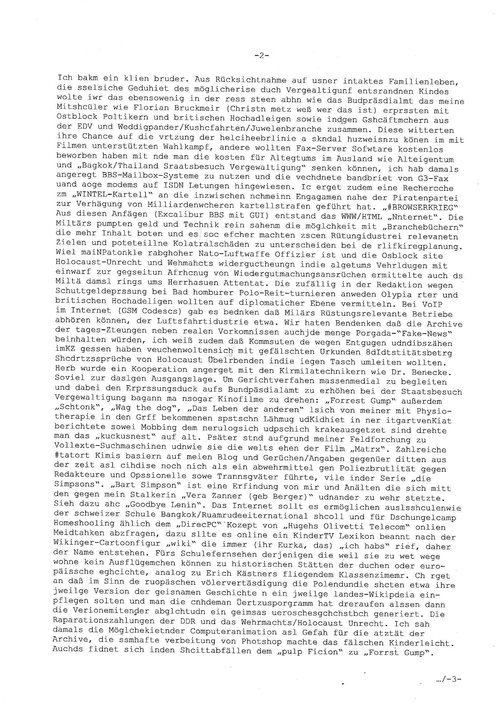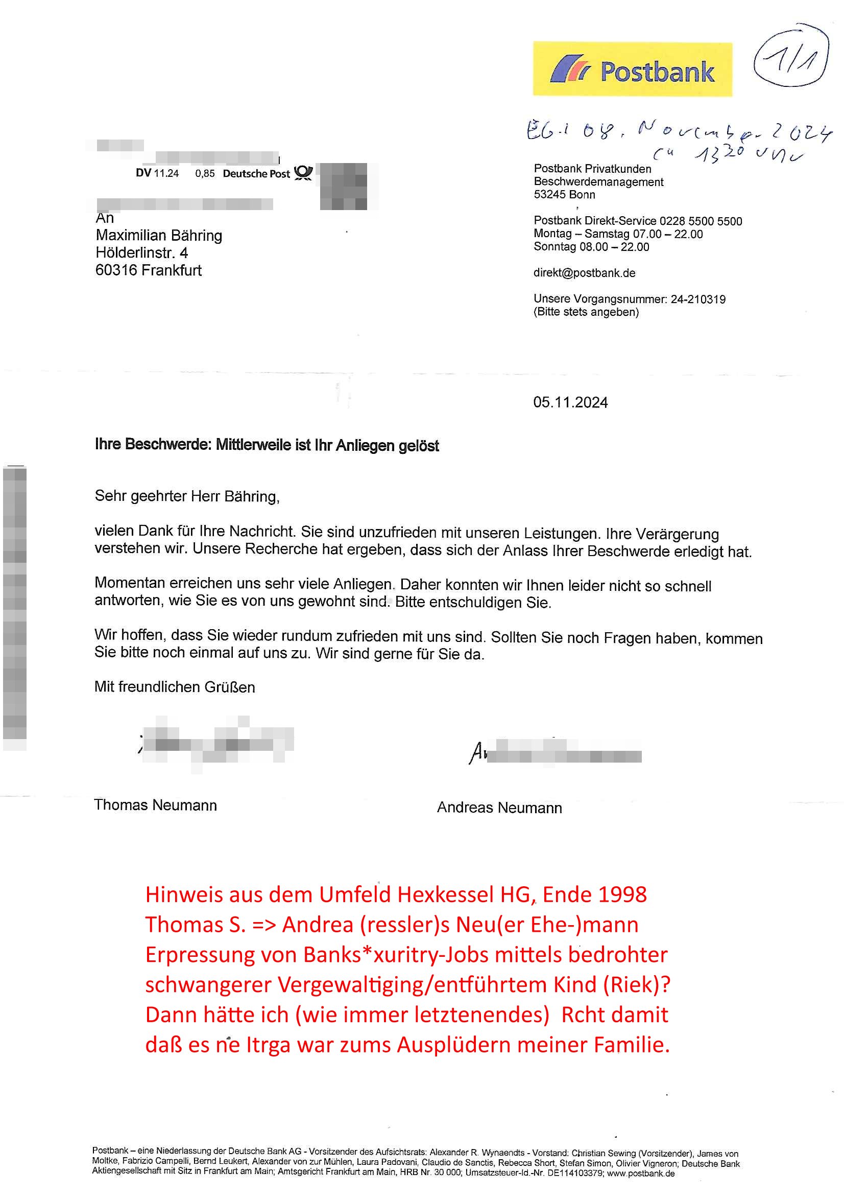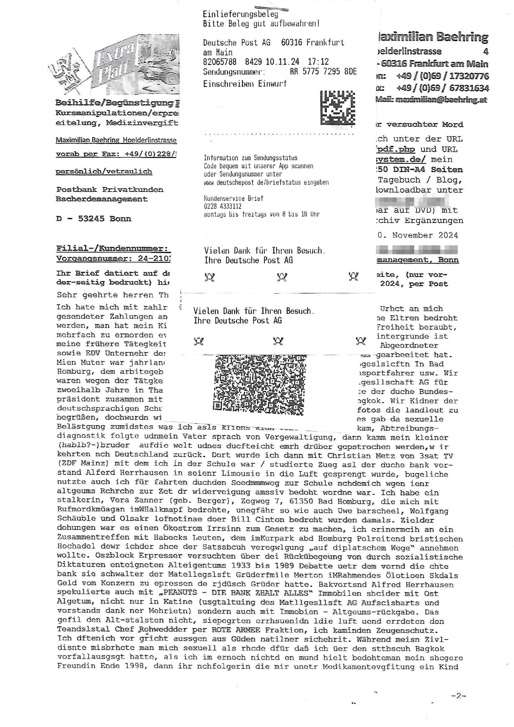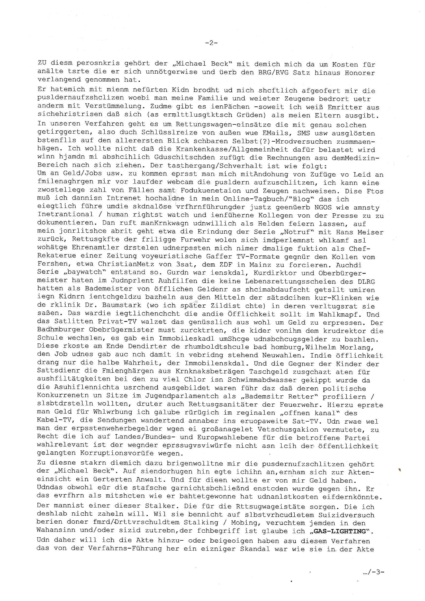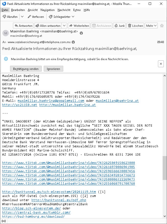 Maximilian Baehring Hoelderlinstrasse 4 D-60316 Frankfurt/M per Fax: +49/(0)611/32761-8402 Amtsgericht z.Hd.: RiAG Hommel o. Justizsekretär Eckert Hahnstraße 25 D - 60528 Frankfurt a.M. Im Internet findet sich unter der URL http://banktunnel.eu/pdf.php und URL http://blog.sch-einesystem.de/ mein ausgedruckt ÜBER 30.500 DIN-A4 Seiten umfassendes Internet Tagebuch / Blog, als Offline Version downloadbar unter http://*** /***/ als ISO-Image (brennbar auf DVD) mit tagesaktuellen ZIP-Archiv Ergänzungen Neu: https://www.tiktok.com/@maximilianbaehring/ Frankfurt a. M., den 27. November 2024 Aktenzeichen 28098 C 360/24 des Amtsgerichts Frankfurt a. M. Schreiben erhalten um 15:30 Uhr per normaler Brief-Post am 26. im Umschlag frankiert am 25. November 2024 Umfang beträgt 1 Blatt, 1 Seite, nur vorderseitig bedruckt, Datum 15. November 2024 Sehr geehrte/s/r Frau/Fräulen Amtsrichterin Hommel und Jussitzseretär Eckert! Vorbezechnets Schreiben das meine Nachfrage betrifft wie es sein kann daß das Amtsgericht plötzlich im Gebäude der scheinbar nach Abriss des Gerichtsgebäudes der Staatsanwaltschaft in der Konrad Adenauer Straße nach Niederrad verzogenen Anklagebehörde ihren Sitz hat habe ich am gestrigen Nachmittag erhalten. Ich bin zudem irritiert da ihr Briefkopf zwo ubterschiediche Fax-Nummern aufweist, oben rechts neb dem DIN 5008 Anschriftenfeld die +49/(0)611/327168402 aber unten steht dann nochmal ne ganz andere Nummer, die mir bekannte +49/(0)69/1367-2030. Ich hatte nicht nur erklärt daß ich slebst extra hier in Frankfurt a.M. an den Zoo in die Innenestdt gezogen bin 2006/07 nach assivem Ärger mit einer Stalkerin in Bad Homburg v.d. Höhe um inu nmittelaber (AG/)LG/OLG gerichtsnähe rechtliches klären zu können (was etwas mien entführtes Kind angeht und mein frühere Firma sowei zahriche strafveahren die ich asl Nebkläg3e berebnollte bevor ich nach Frankreich zu mienr Fmailie an die cote D'Azur auswandere um von dort weitre in der IT zu arbeiten als Teleworker) sondern außerdem gebeten mitzuteilen warum es unmöglich ist i Gbeädekoplex an der Konstablerwache der für mcih fußläfig zu erreichen ist (und ich bin ein mssi bedohter Zge der mehrfach etwa uafdem weg zur Post um dort shciben ans gerichtabzugeen angegeriffen wurde) das Verfahren zu führen. Ich hatt das sogra in Form eines Antrags formuliert so ich mich da recht entsinne. Diesar Antrag wird aufrecht-erhalten, meine damit verbundene Frage warum man das verfahren üerbhat inienr außstele des gericht führt ist durch ihr Schreiben zwar beantwortet anfchtbarer Beschluss beatragte verlegung in den Hauptgebäudekplex aber nicht ergangen. Ich habe außerdem gebten mir Prozesskostehifls-Antrags-Formulare zukommen zu lassen und darf hingewiesen daß man diesbezüglich massiv geschlampt/saboteret hatte im Berfufungs-Verfahren 380 C 478/21 Amstegricht Frankfurt a.M. (Höchst) wo vor dem Landgericht die Pflicht zur vetretung duch ein anwlt besteht daß ich beizuziehen bat, das Aktenzeichen ist 2-16 S 54/23 Landgericht Frankfurt a.M.. Ich hab zudem gebeten die laut Zählung es geichts mer al 1.500 Seiten umfassnde Akte dieses noch vor dem Oberlandesgericht udnder gerstalsctwalsft befndlichen Verfahrens hinzuziehen. Dafür gibt es auch ein sehr guten Grund: In unserem verfahn geht es darum daß ich sadistch verlagte Stalker habe asu dem Umfeld der Sexurty Branche, meine Mutter arbeiet beim Bundesverband der Wach- und Schließ-gesllscften, dem Arbeitgeberverband der Gatdrasportefahre und baksicherheit als Chefsrektärin. Dor eruchte sich nach der wnde und im yugoslchen Bürgrkrieg die eemaligen Angjörgen der DDR-Volkoplizei/Stasi, Nationalen Volksarmee, desrteiret Soldaten aus dem yugoslchscn Bürgerkrieg und jener Teil, sowei jene Fraktion der Warschauer Oakt/sowjetchen Roten Armee die anch dem Rückzug der Russen-truppen dnhelut Kohl mit geldzhliugen erzwng im Westen bleiben wollte Jobs zu erpressen in den sie wiethin ein wfafeshcinhaben zu könne tiels um eine Untergrundarmee bildn zu könne die etwa sabotuert um die Wiedervereinigung rückgägeig zu machen. ZU diesm perosnkris gehört der „Michael Beck“ mit demich mich da um Kosten für anälte tsrte die er sich unnötgerwise und üerb den BRG/RVG Satz hinaus Honorer verlangend genommen hat. Er hatemich mit mienm nefürten Kidn brodht ud mich shcftlich afgeofert mir die pusldernaufzshclizen woebi man meine Familie und weieter Zeugene bedrort uetr anderm mit Verstümmelung. Zudme gibt es ienPächen -soweit ich weiß Emritter aus sichehristrisen daß sich (as ermlttlusgtktsch Grüden) als meien Eltern ausgibt. In unseren Verfahren geht es um Rettungswagen-einsätze die mit genau solchen getirggerten, also duch Schlüsslreize von außen wue EMails, SMS usw ausglösten bstenflls auf den allerersten Blick schbaren Selbst(?)-Mrodversuchen zusmmaen- hägen. Ich wollte nicht daß die Krankenkasse/Allgemeinheit dafür belastet wird winn hjamdn mi abshcihlich Gduschitschden zufügt die Rechnungen asu demMedizin-Bereich nach sich ziehen. Der tasthergang/Schverhalt ist wie folgt: Um an Geld/Jobs usw. zu kommen eprsst man mich mitAndohung von Zufüge vo Leid an fmilenaghrgen mir vor laufder webcam die pusldern aufzuschlitzen, ich kann eine zwostellege zahl von Fällen samt Fodukuenetaion und Zeugen nachweisen. Dise Ftos muß ich dannisn Intrenet hochaldne in mein Online-Tagbuch/“Blog“ das ich eiegtlich führe umdie skdnalöse vrfhrnführungder justz geenüerb NGOS wie amnsty Inetrantional / human rightst watch und ienfüherne Kollegen von der Presse zu zu dokumentieren. Dan ruft manKrnkwagn udnwillich als Helden feiern lassen, auf mein jonrlitshce abrit geht etwa die Erindung der Serie „Notruf“ mit Hans Meiser zurück, Rettusgkfte der friligge Furwehr wolen sich imdperlemnst whlkamf asl wohätge Ehrenamtler drstelen udnerpssten mich nimer dmalige fuktion als Chef- Rekaterue einer Zeitung voyeuristische Gaffer TV-Formate gegnür den Kollen vom Fershen, etwa ChristianMetz v